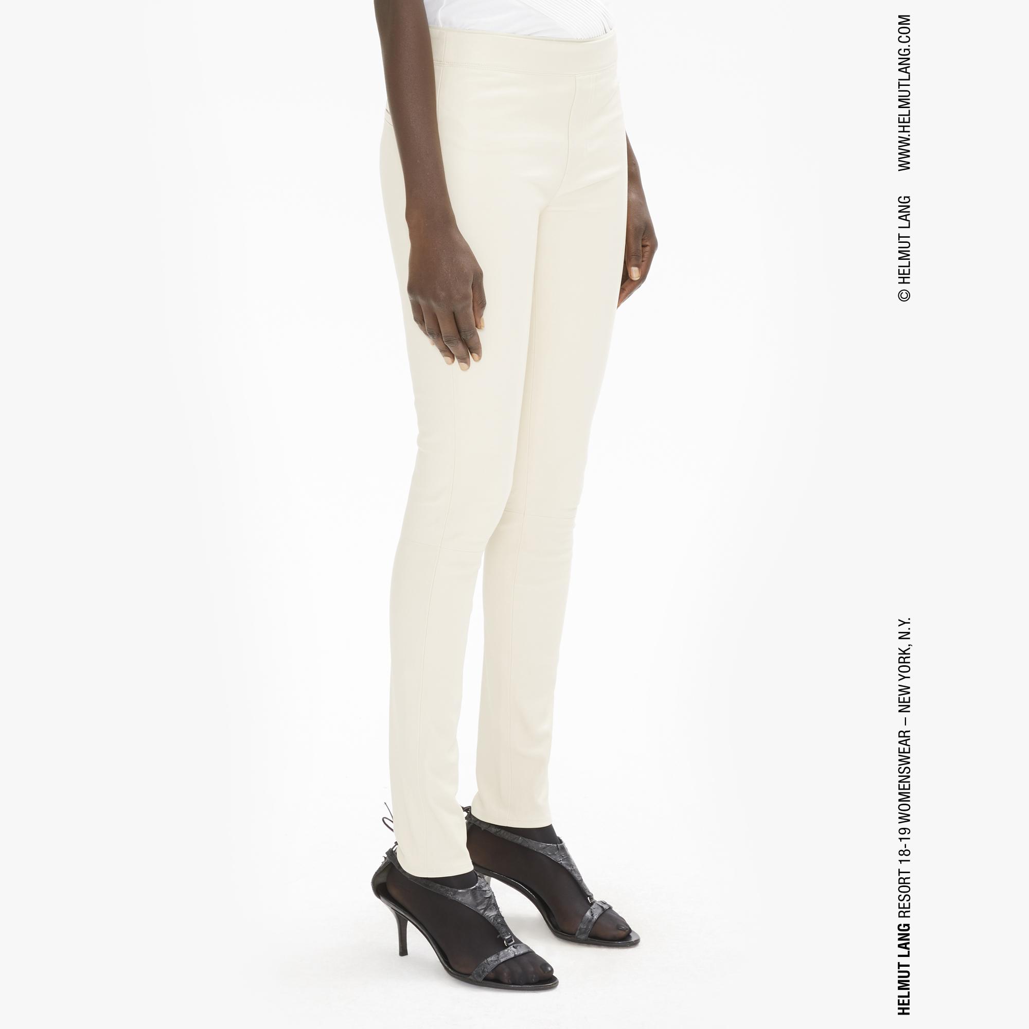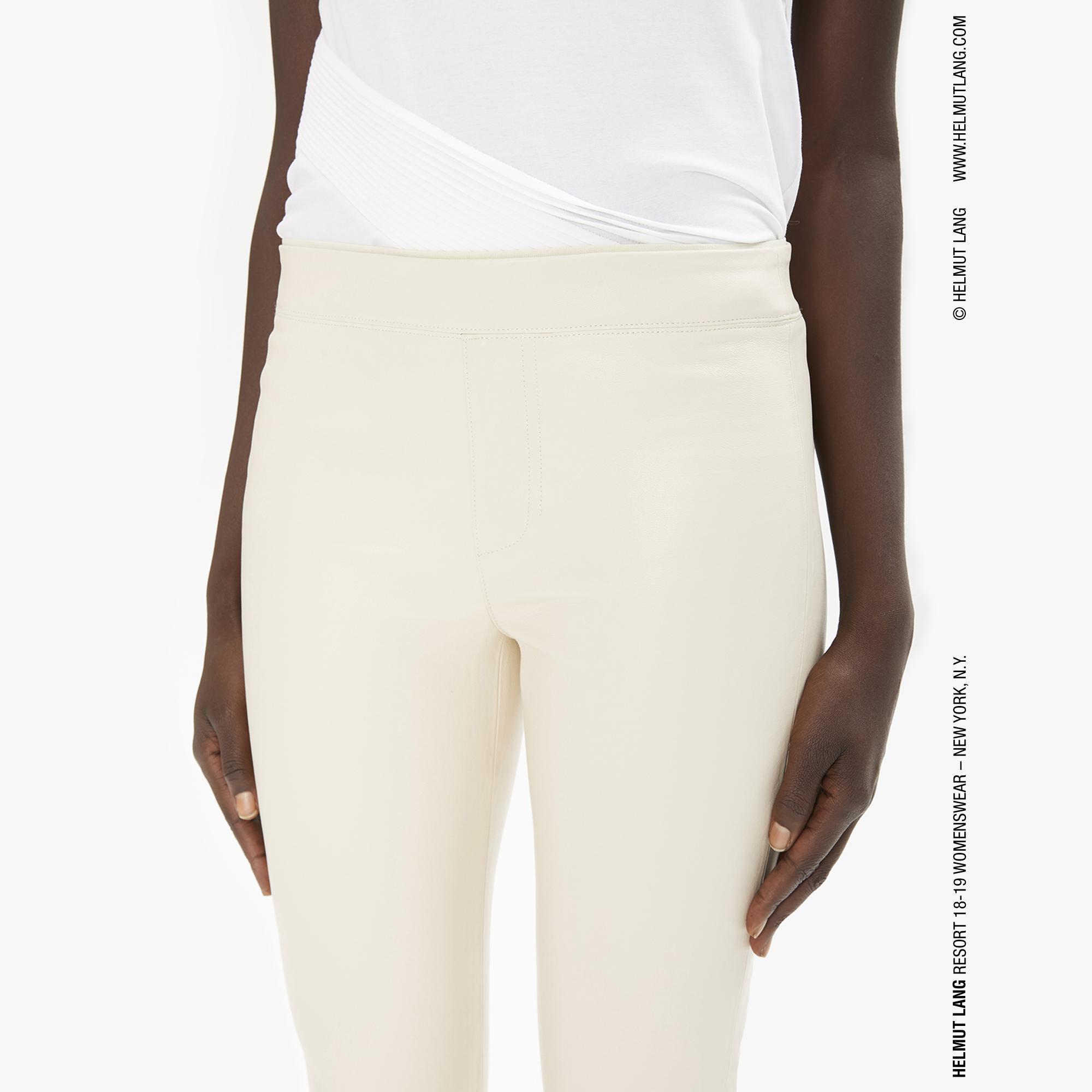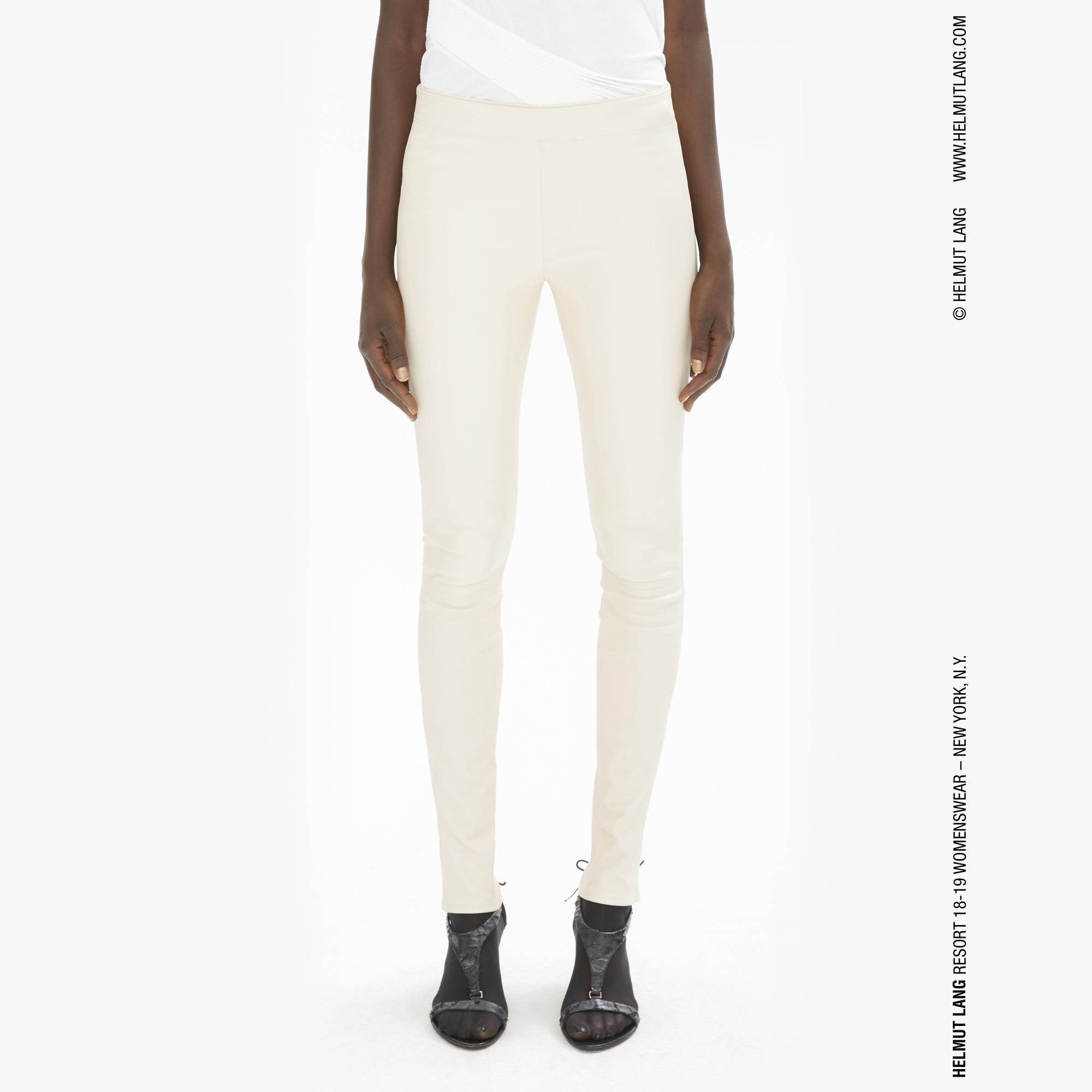 The Helmut Lang Leather Legging is a stretch lamb leather legging with an elastic waistband and faux fly detail