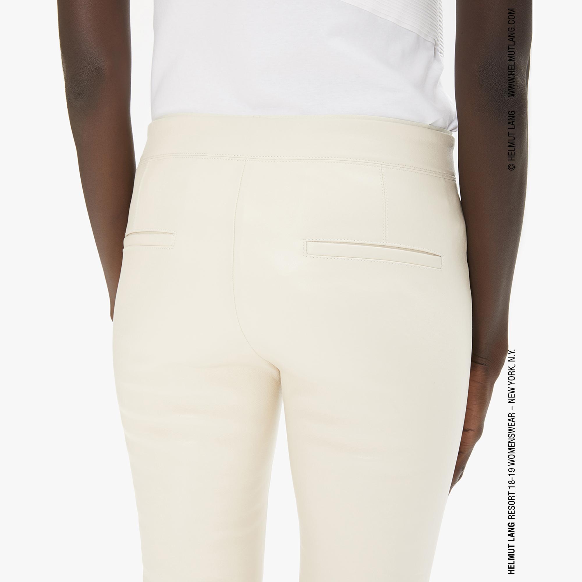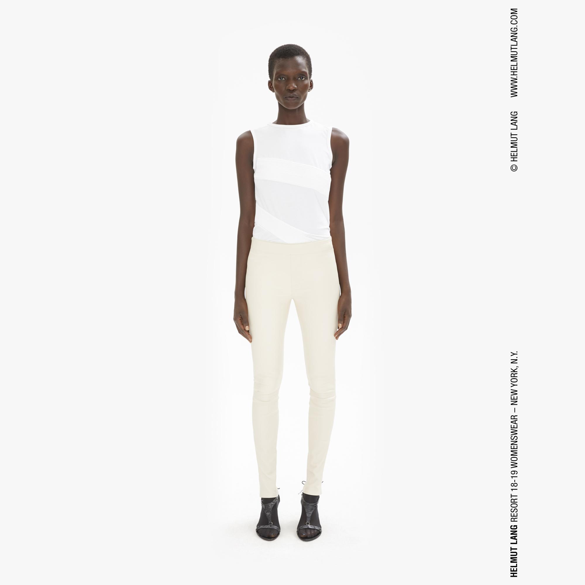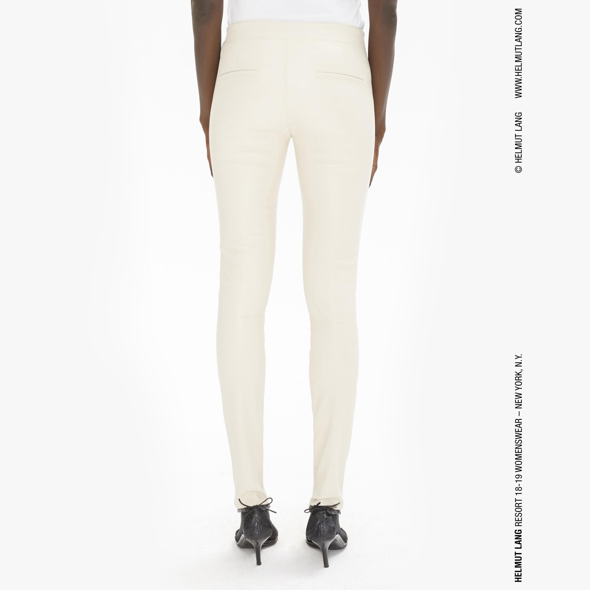 The Helmut Lang Leather Legging is a stretch lamb leather legging with an elastic waistband and faux fly detail