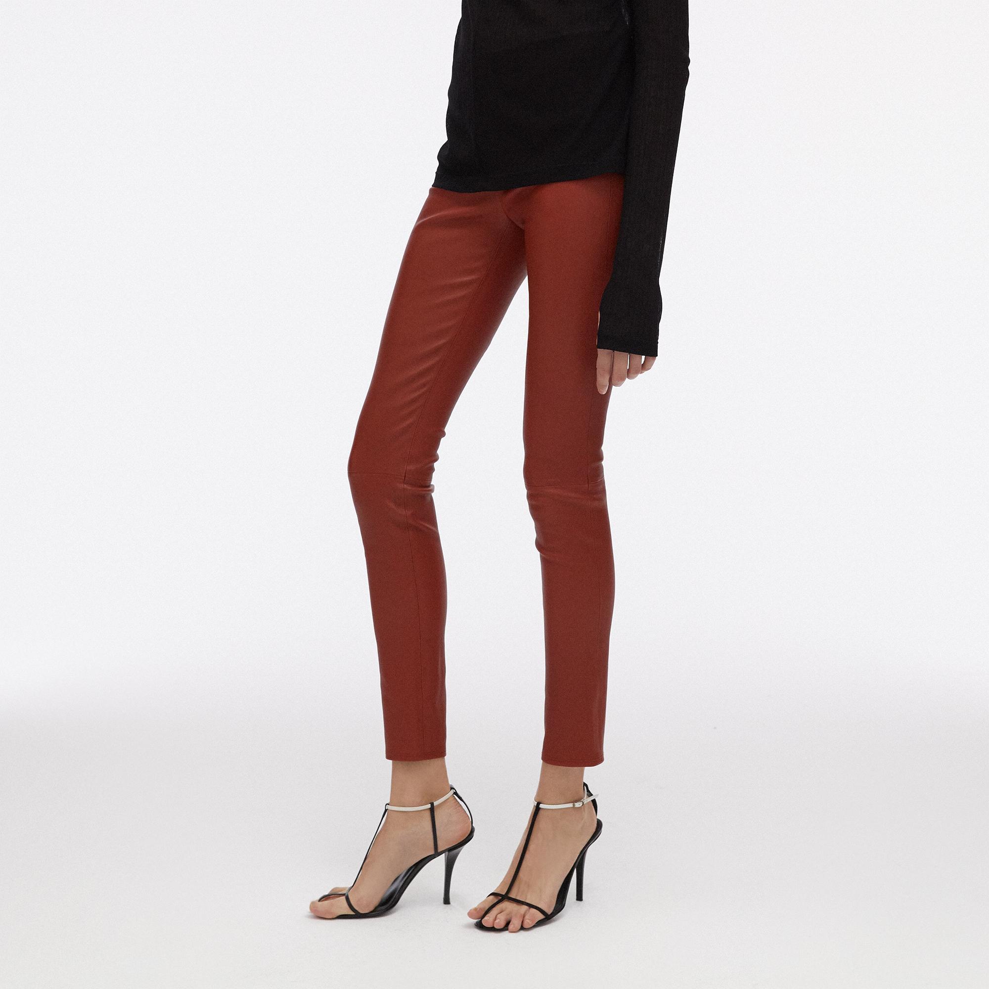 The Helmut Lang Leather Legging is a stretch lamb leather legging with an elastic waistband and faux fly detail