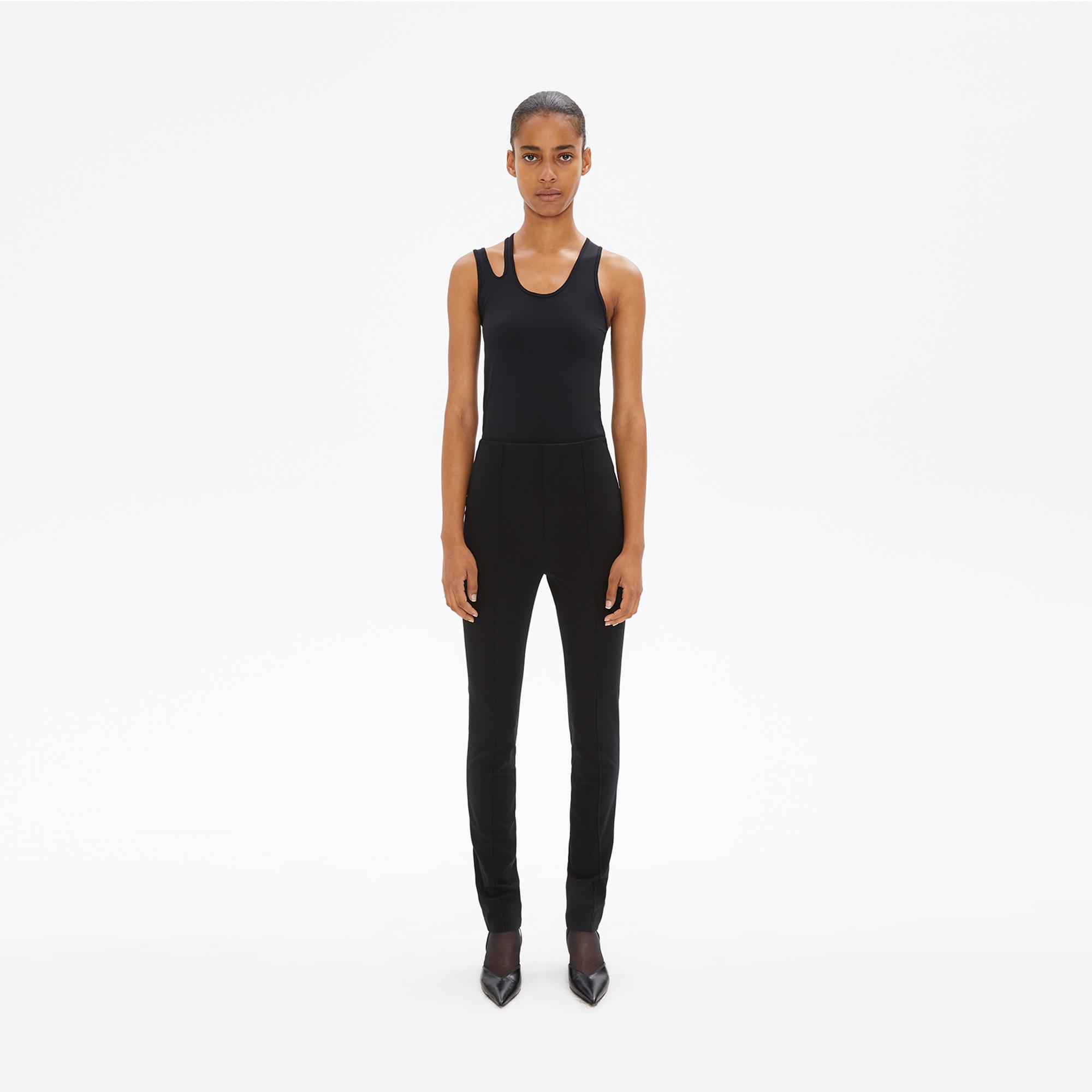 The Helmut Lang Rider Legging is a black cotton legging with mock tab closure detailing