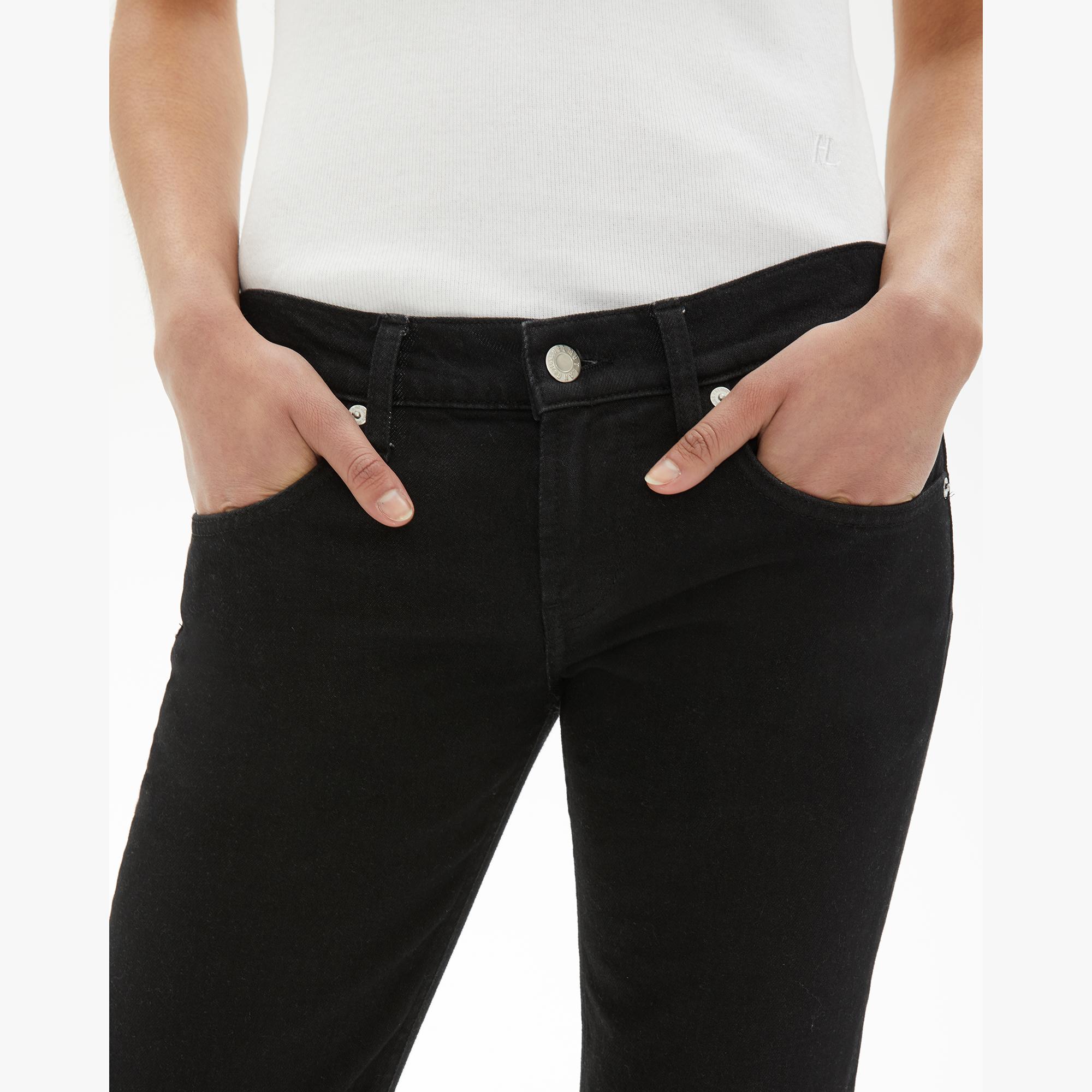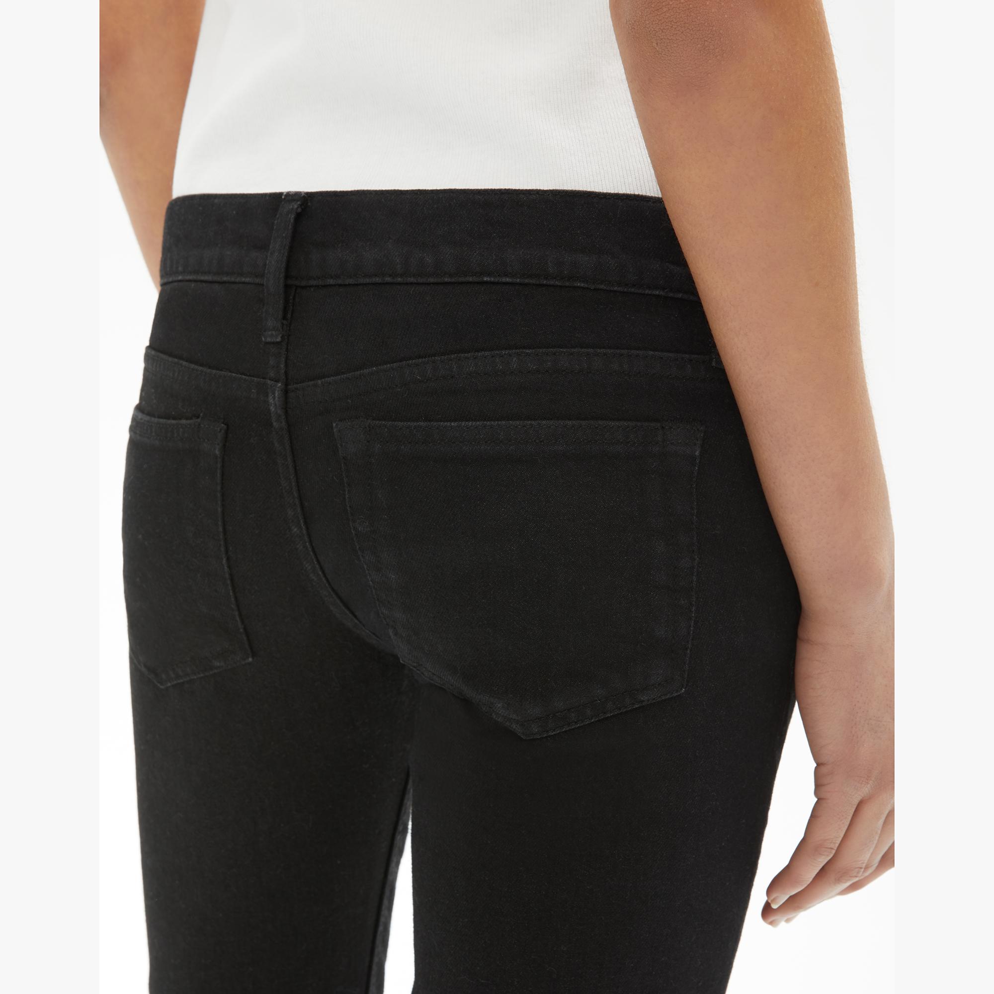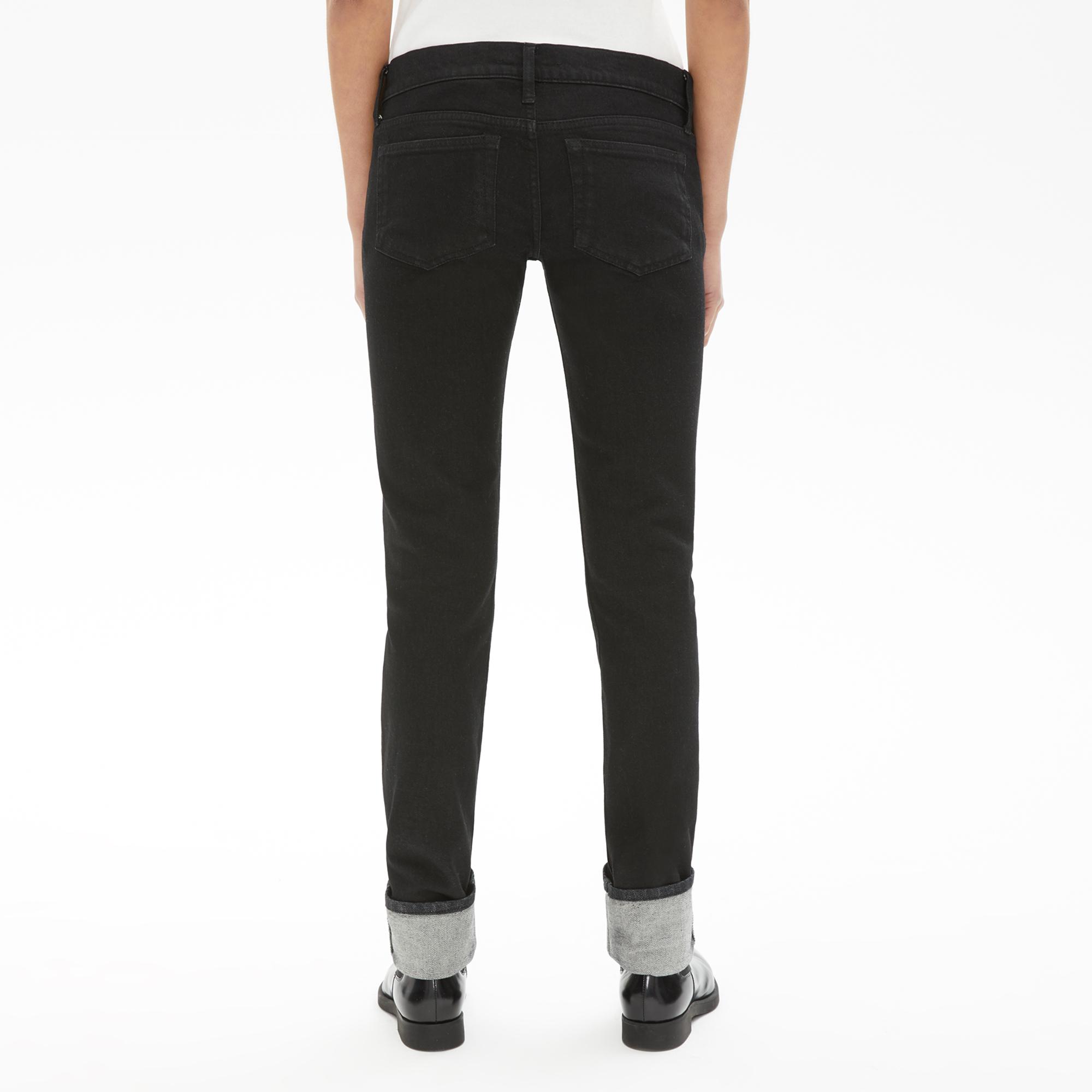 The Helmut Lang Femme Lo Cigarette Jeans in matte powder black are low-waisted cotton denim skinny jeans with with a slim and straight leg opening