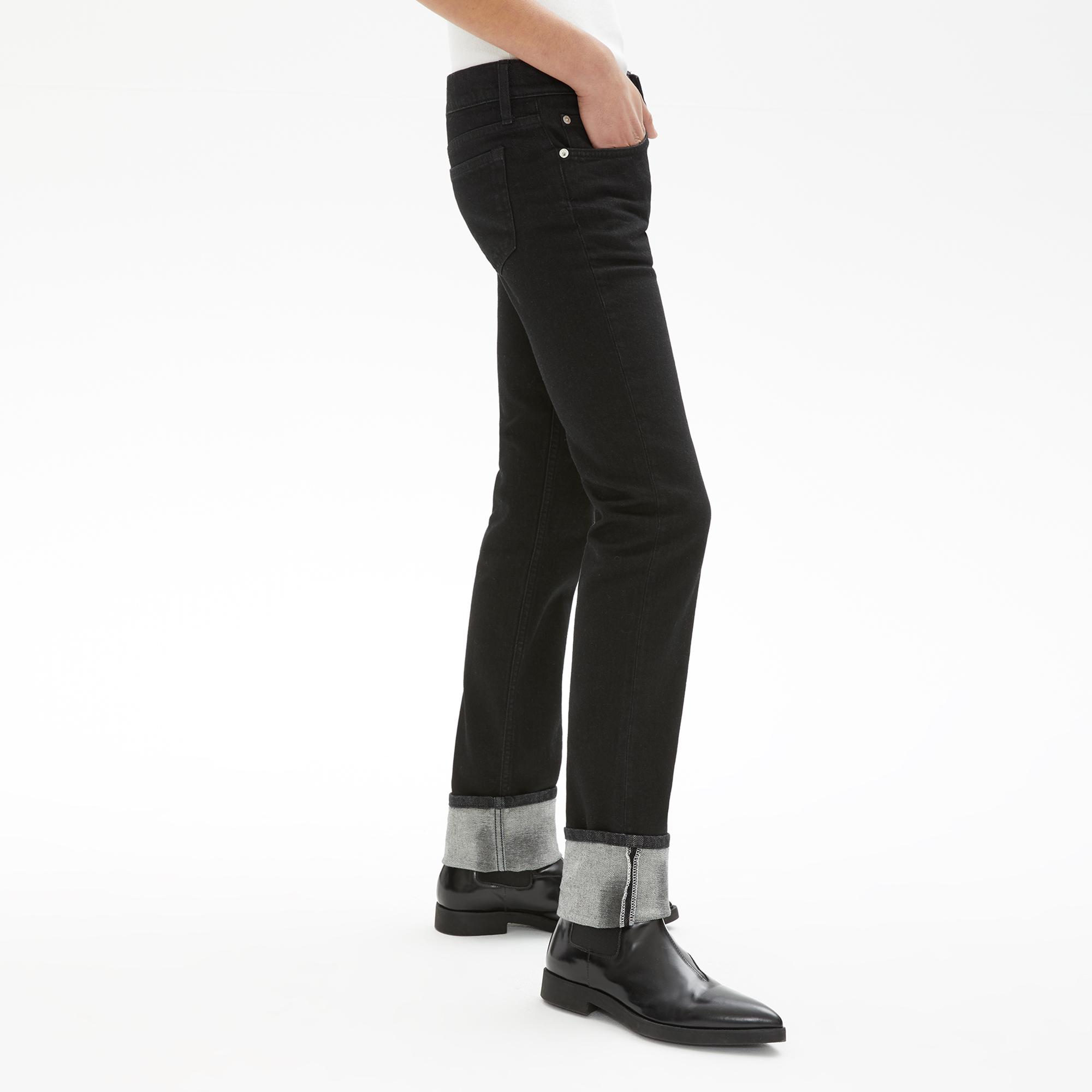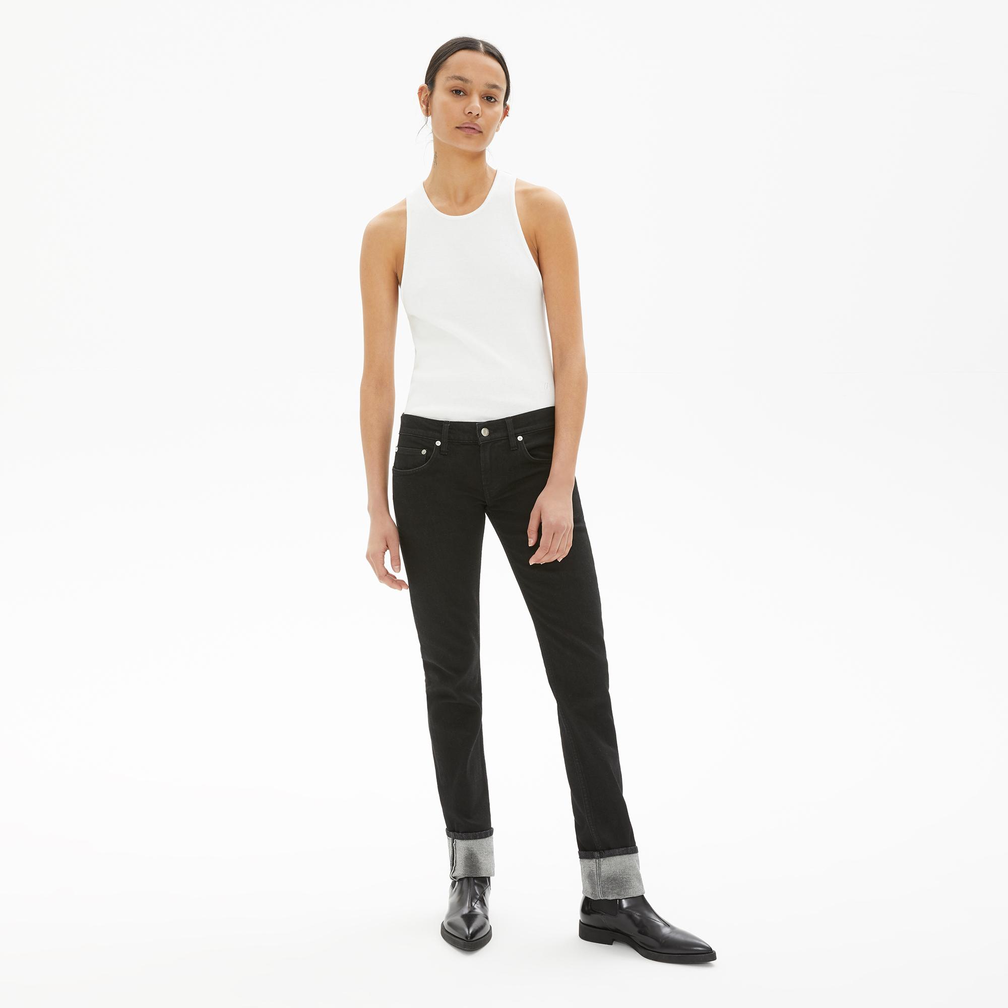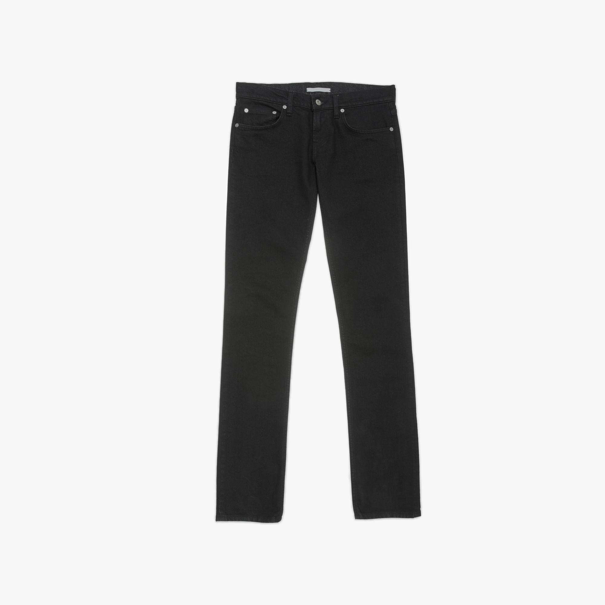 The Helmut Lang Femme Lo Cigarette Jeans in matte powder black are low-waisted cotton denim skinny jeans with with a slim and straight leg opening