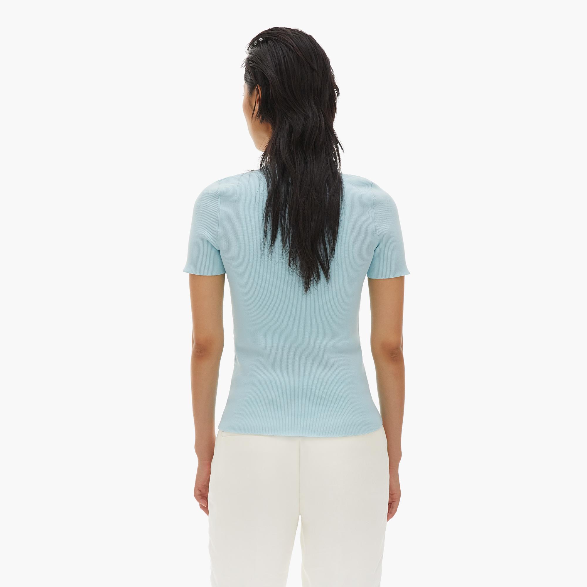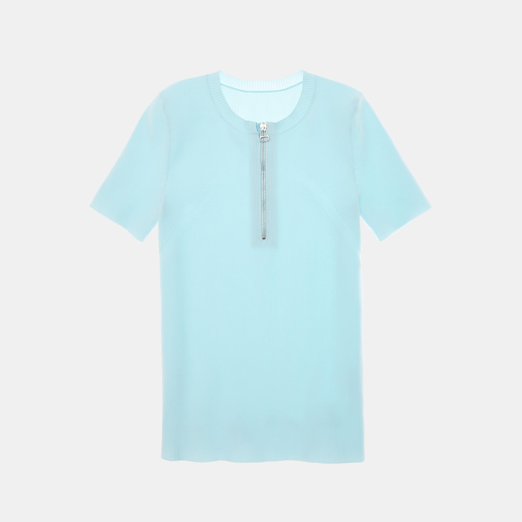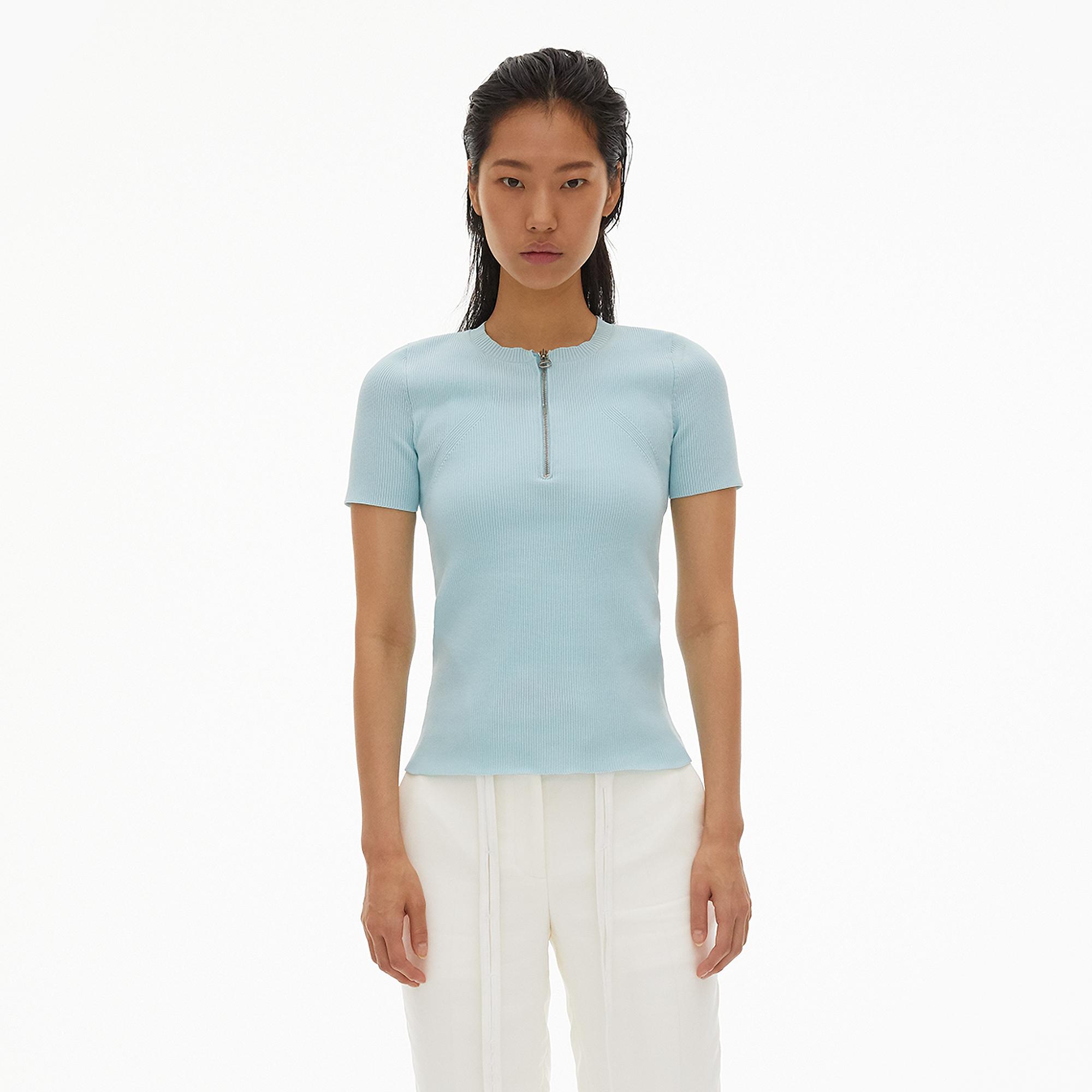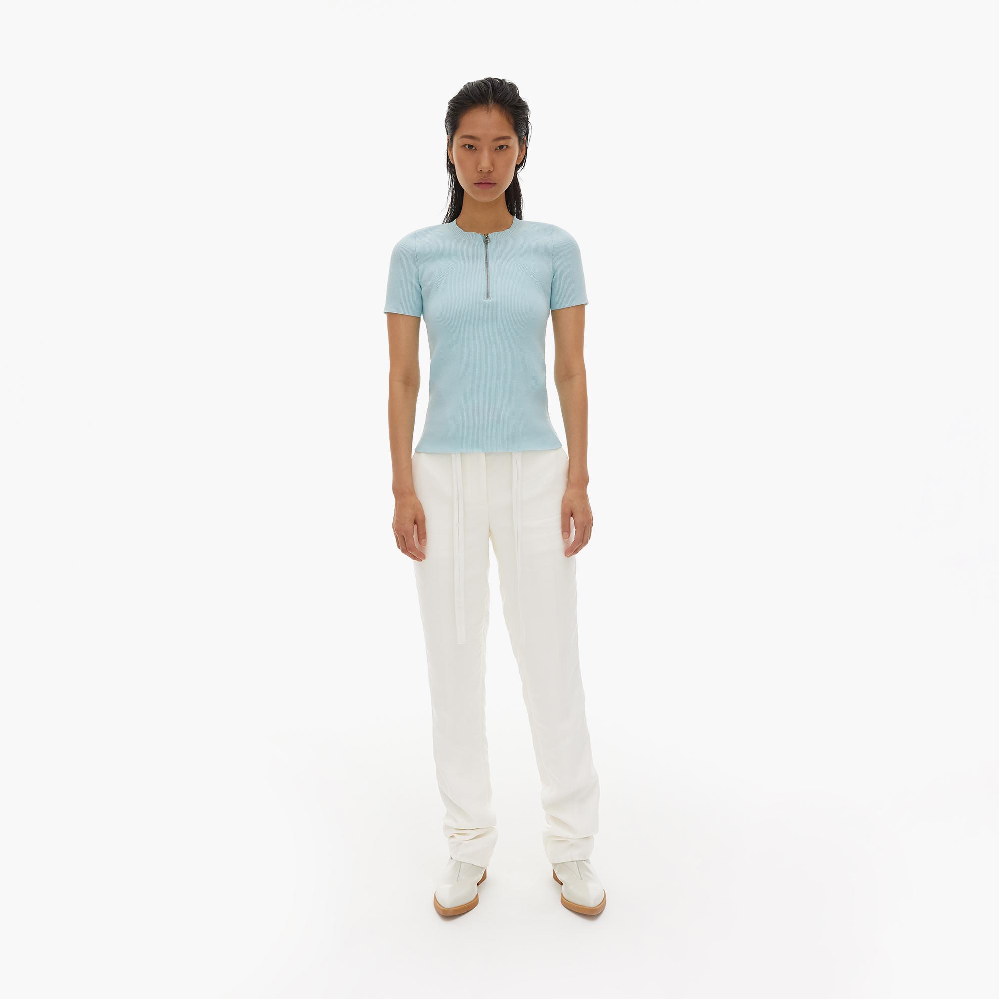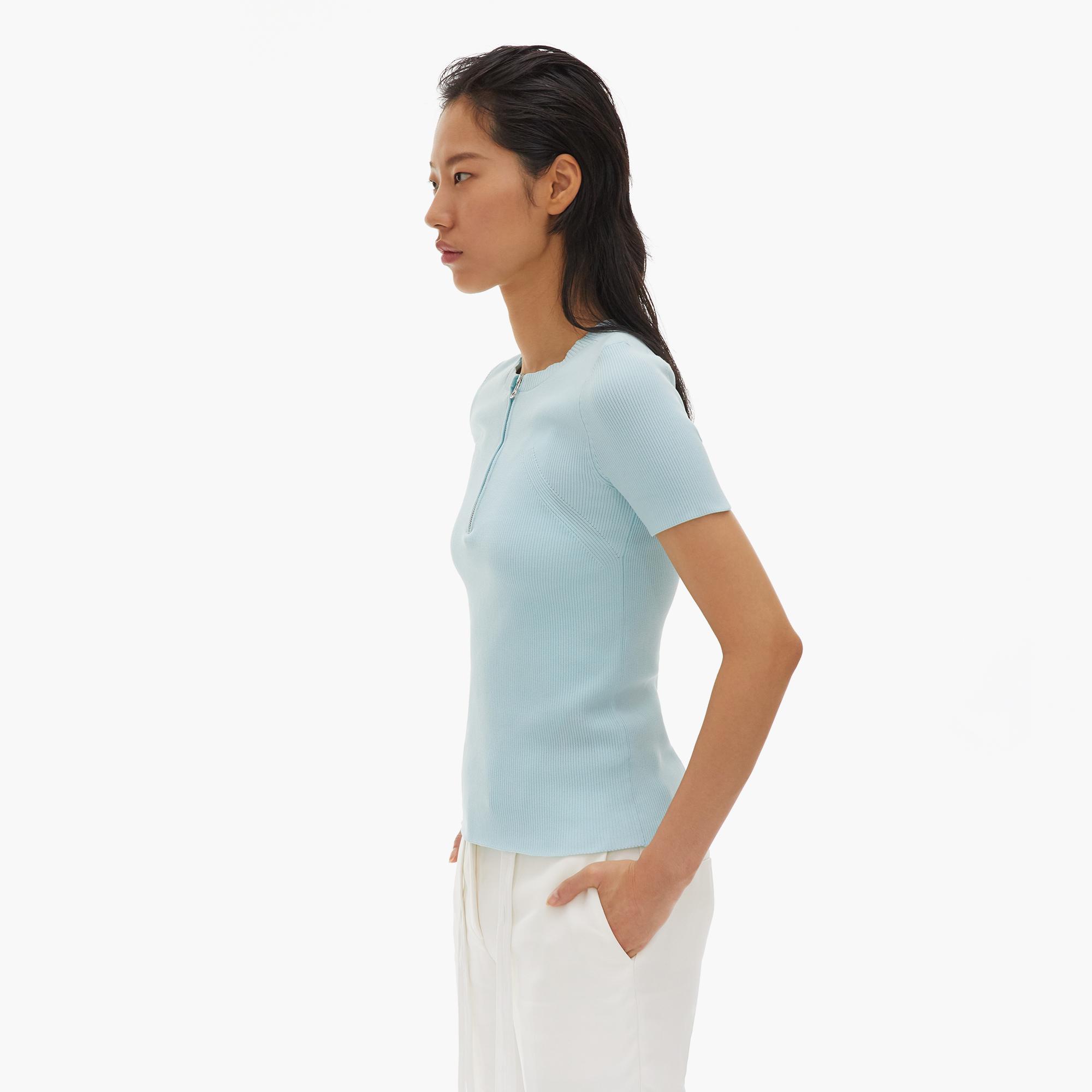The Helmut Lang Essential Zip Tee is a polyester knit t-shirt with front zipper and ribbing detail