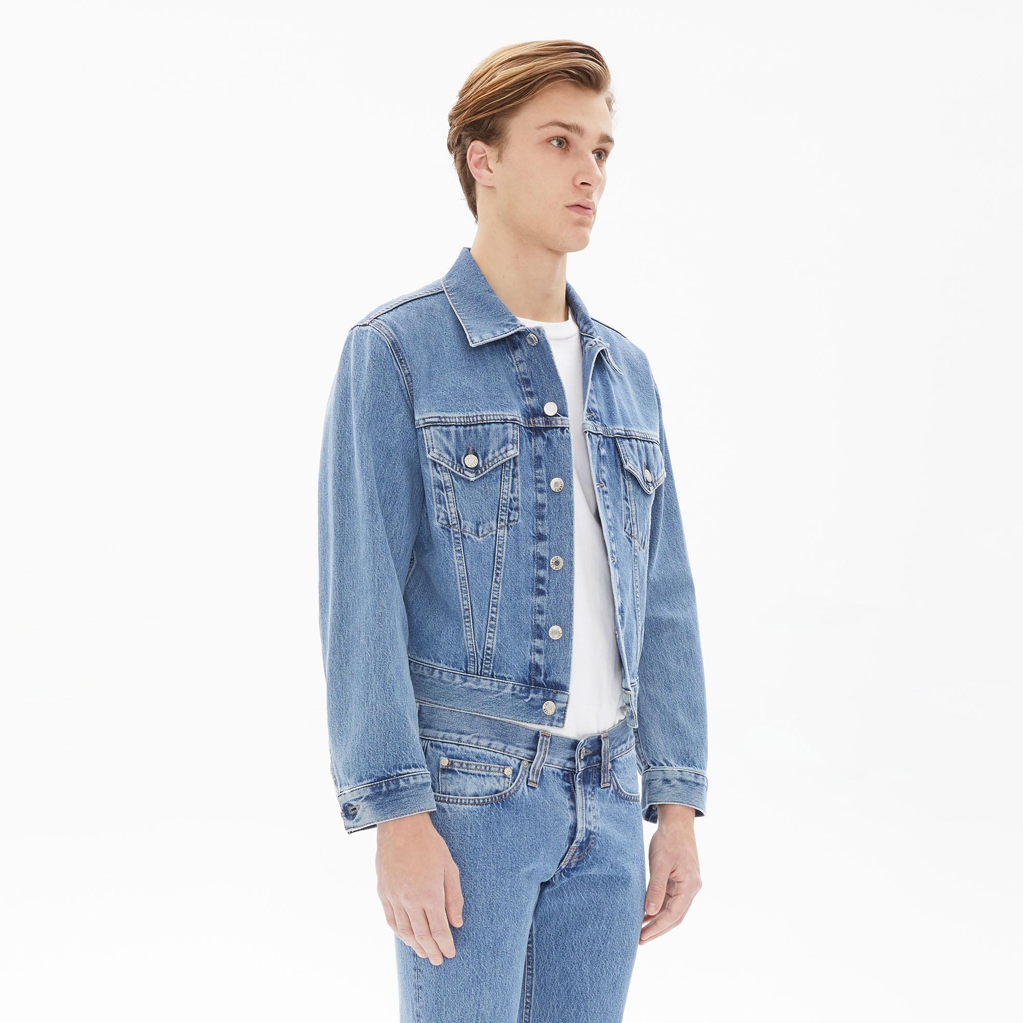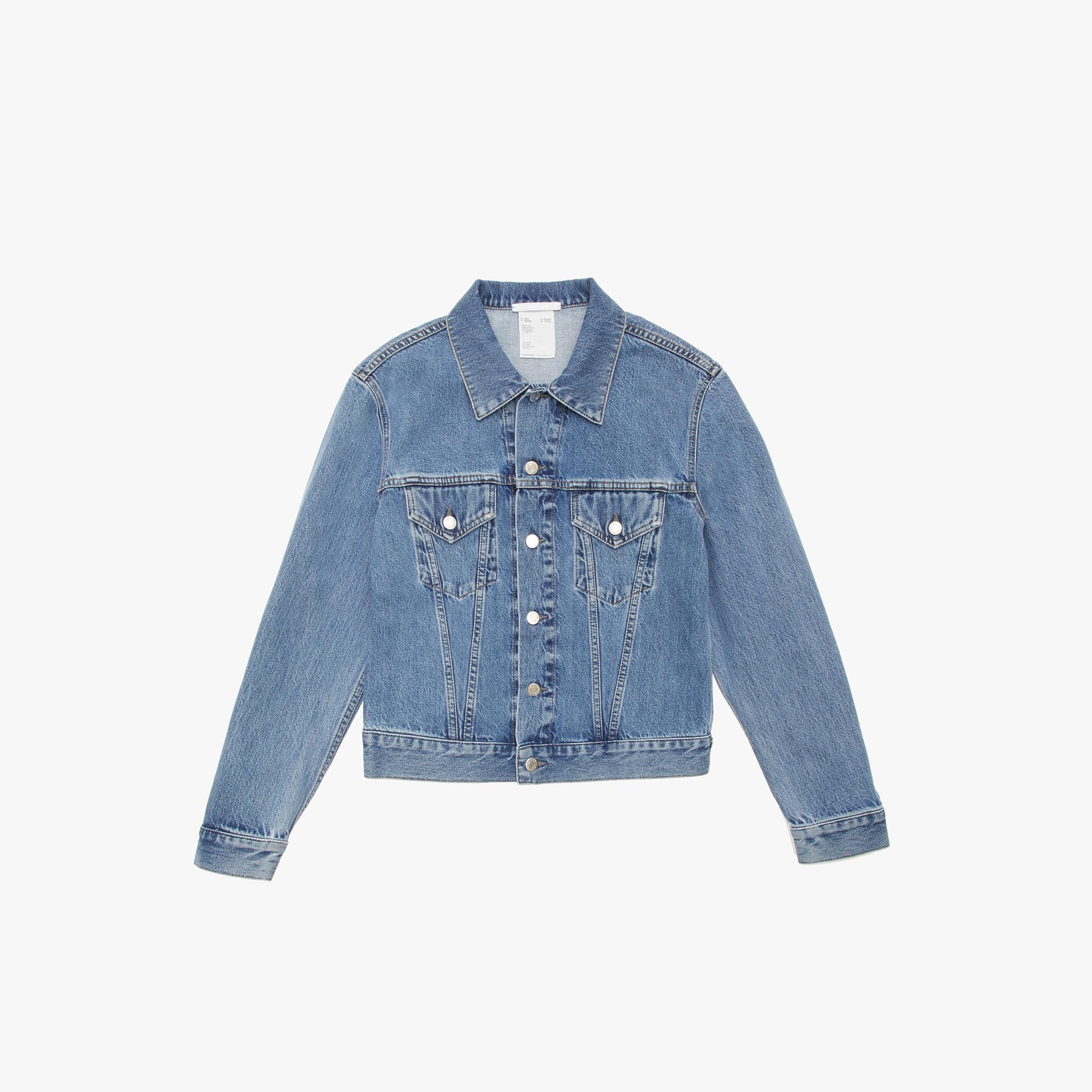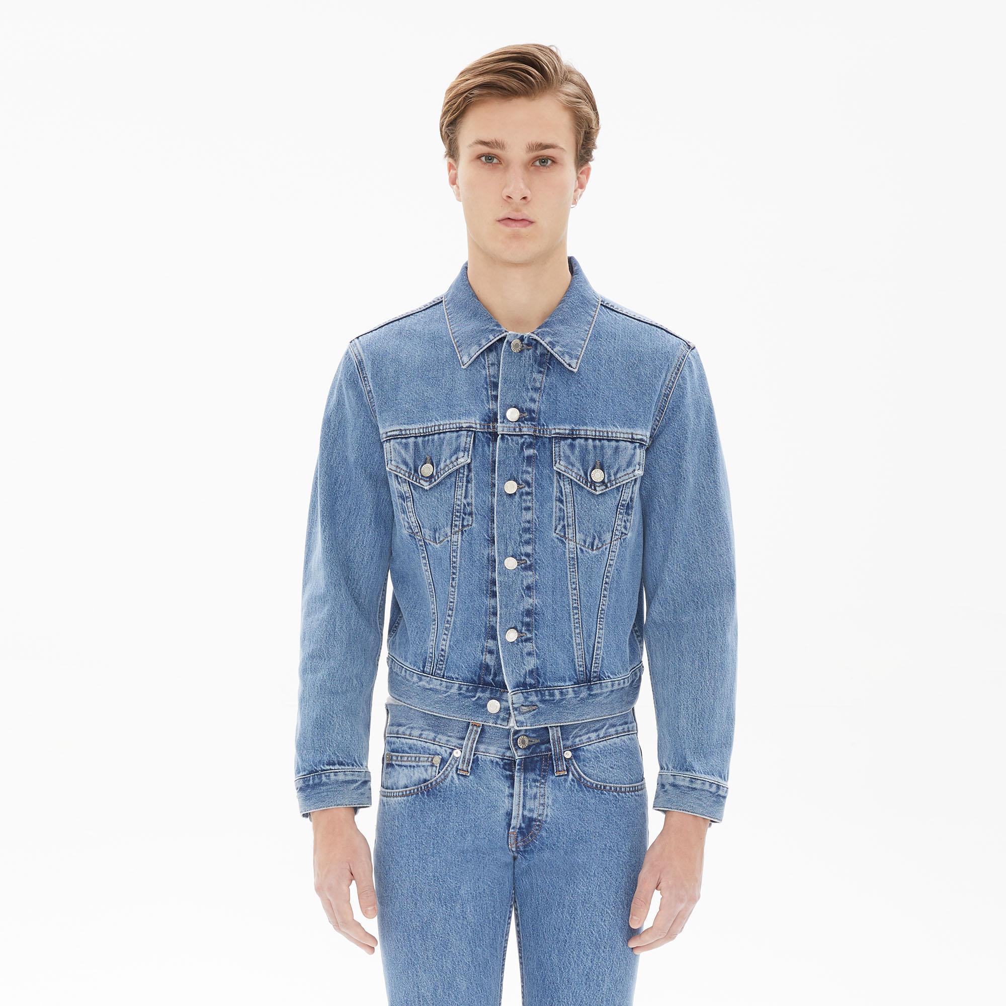 The Helmut Lang MASC TRUCKER JEAN JACKET in accelerated high contrast indigo is a washed denim boxy jean jacket