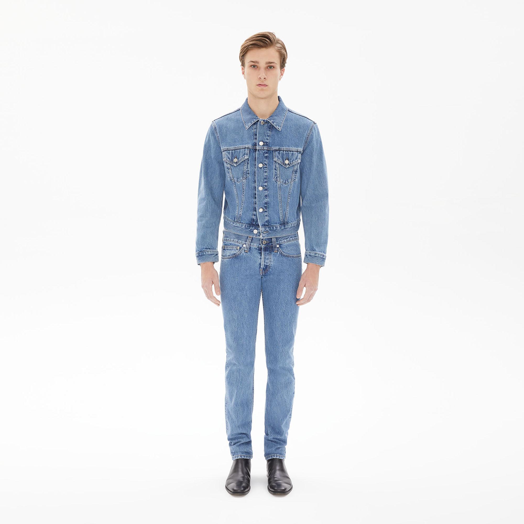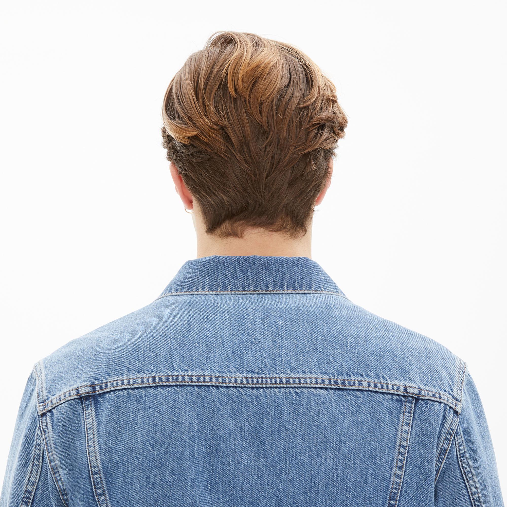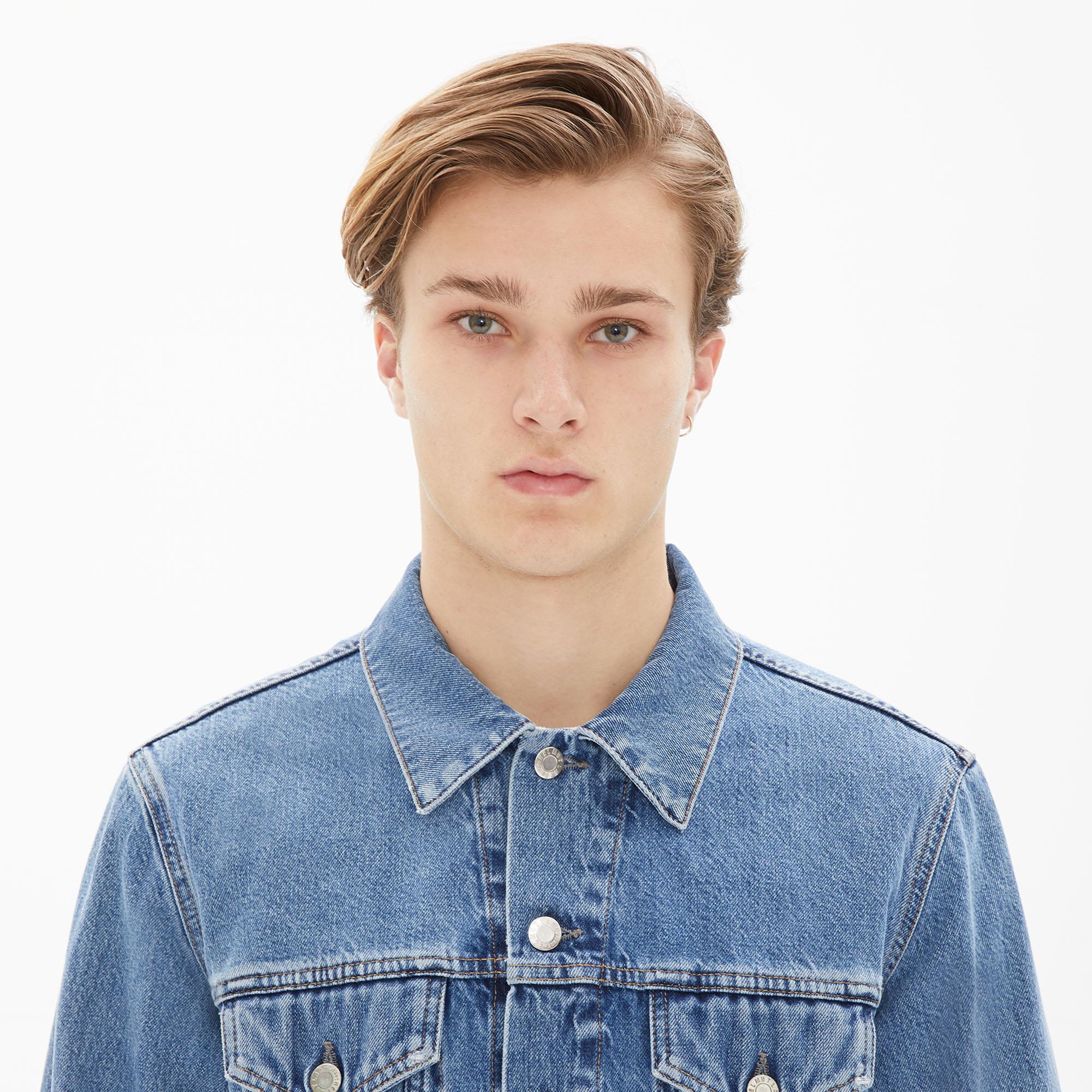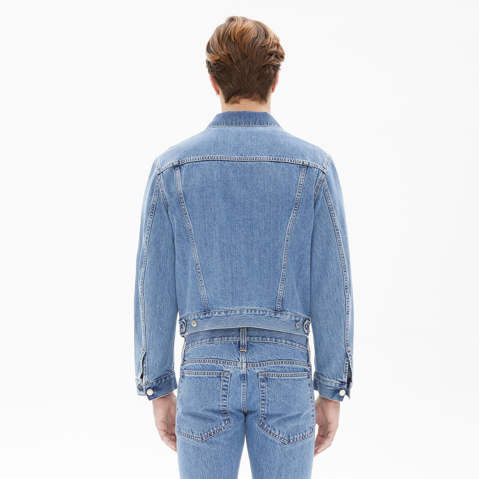 The Helmut Lang MASC TRUCKER JEAN JACKET in accelerated high contrast indigo is a washed denim boxy jean jacket