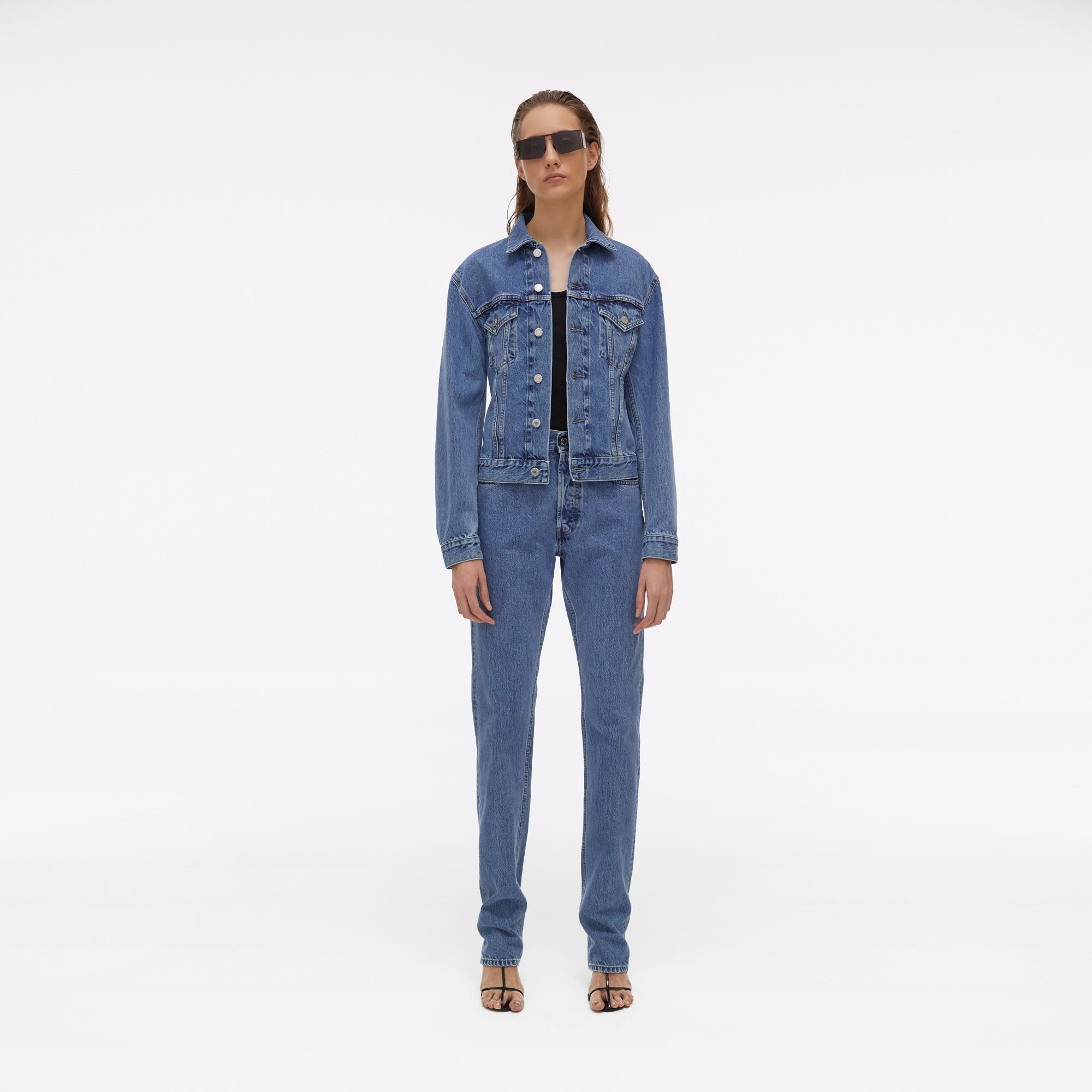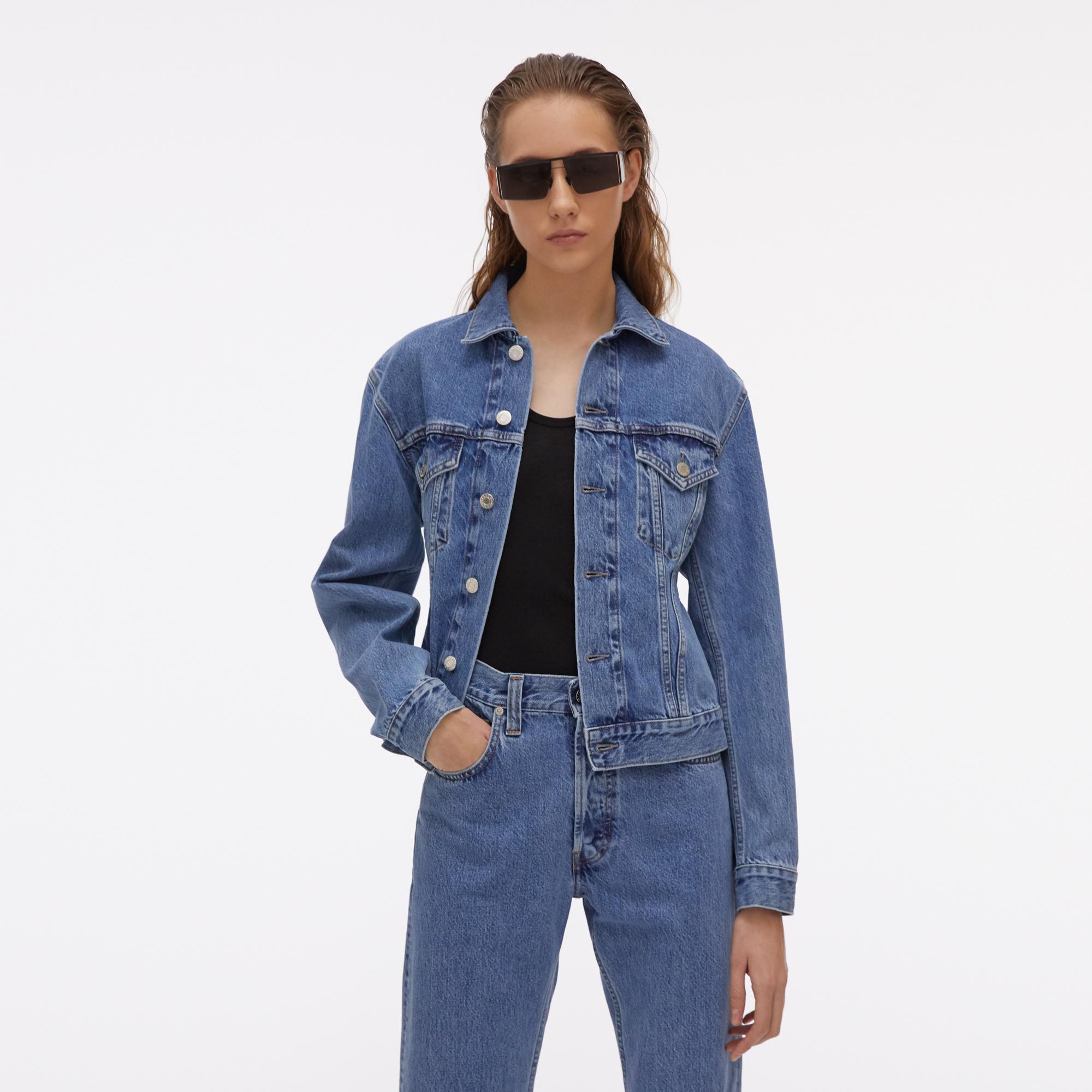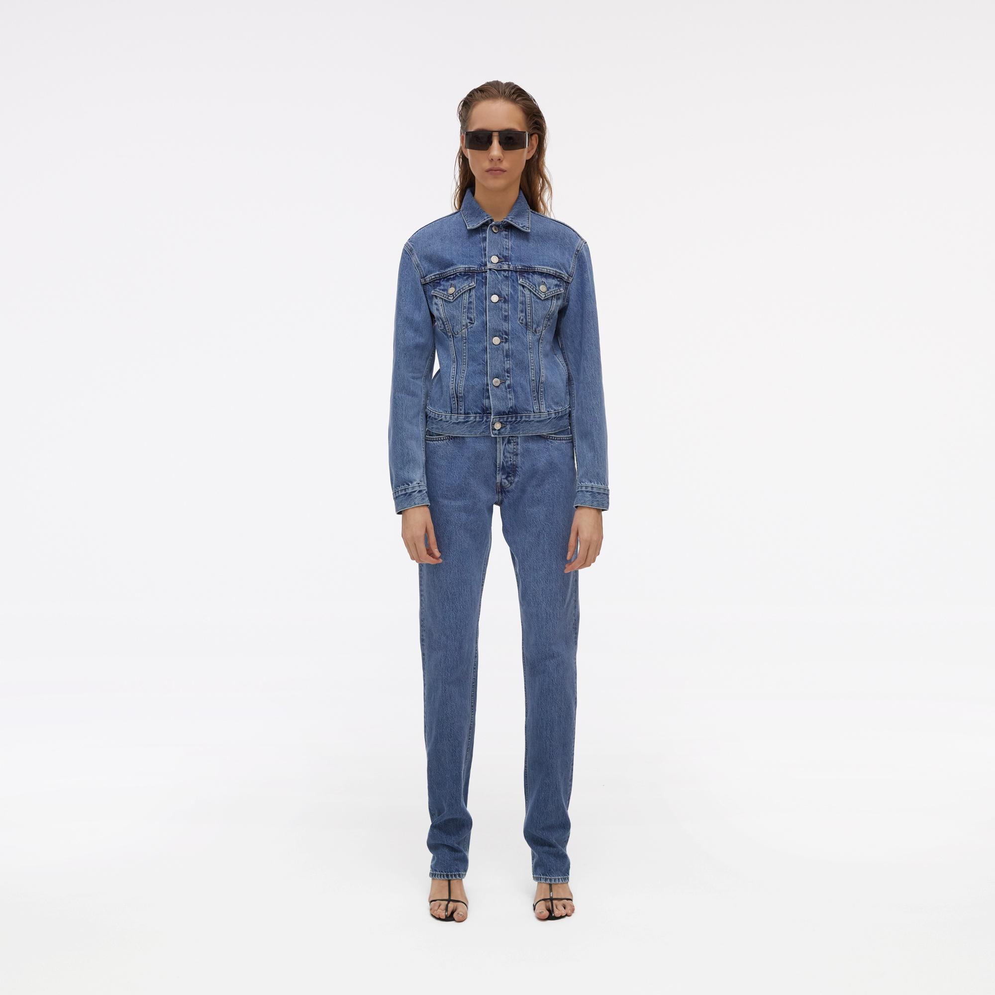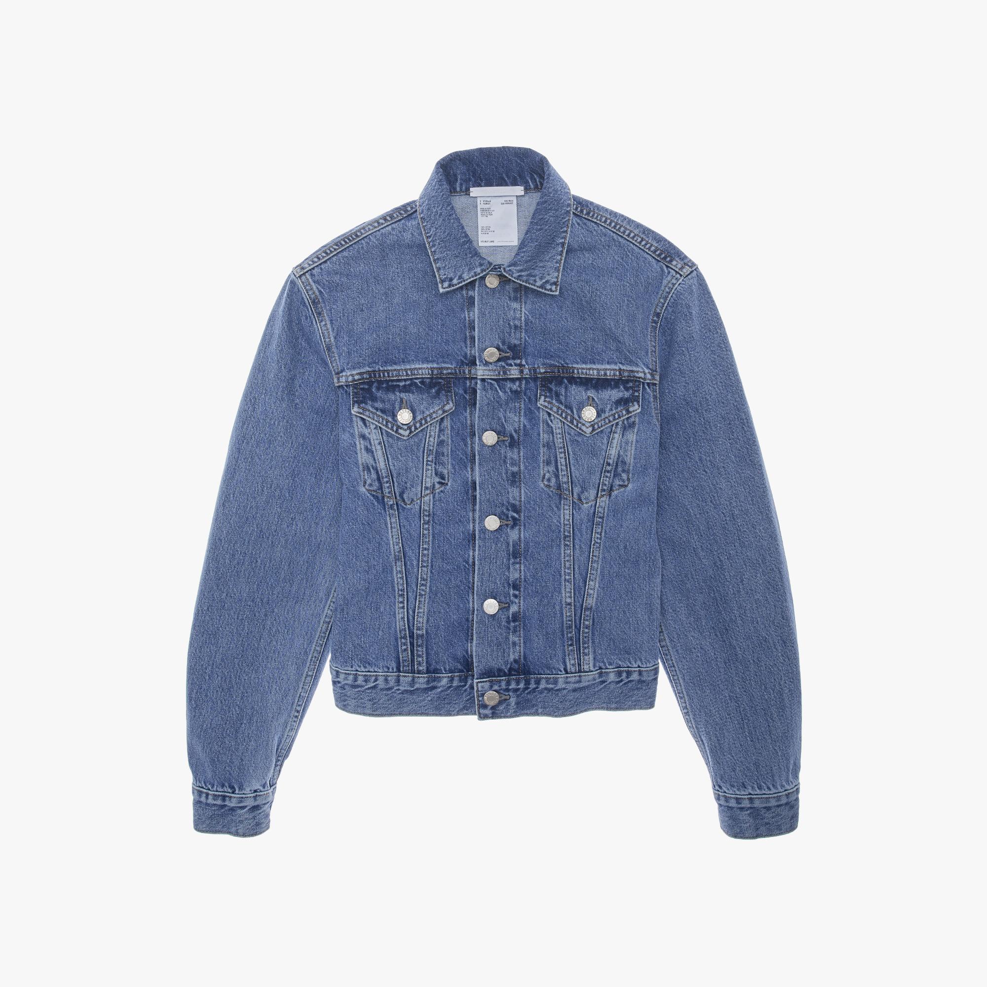 The Helmut Lang Femme Trucker Jacket is a cotton denim waisted jacket with contrast stitching