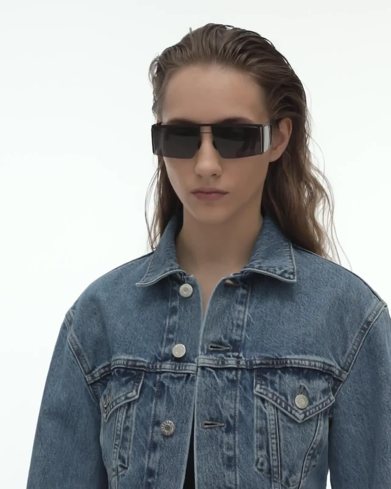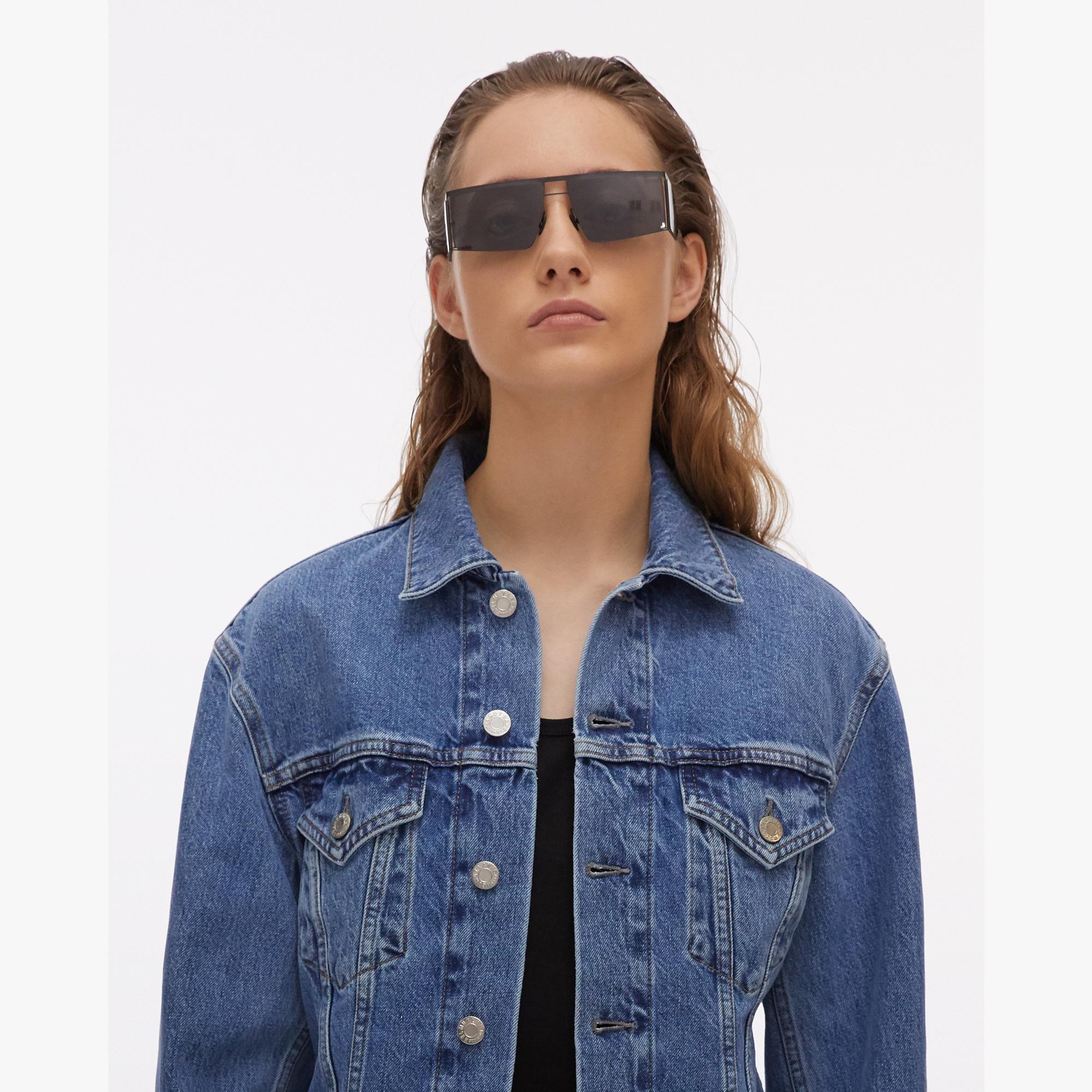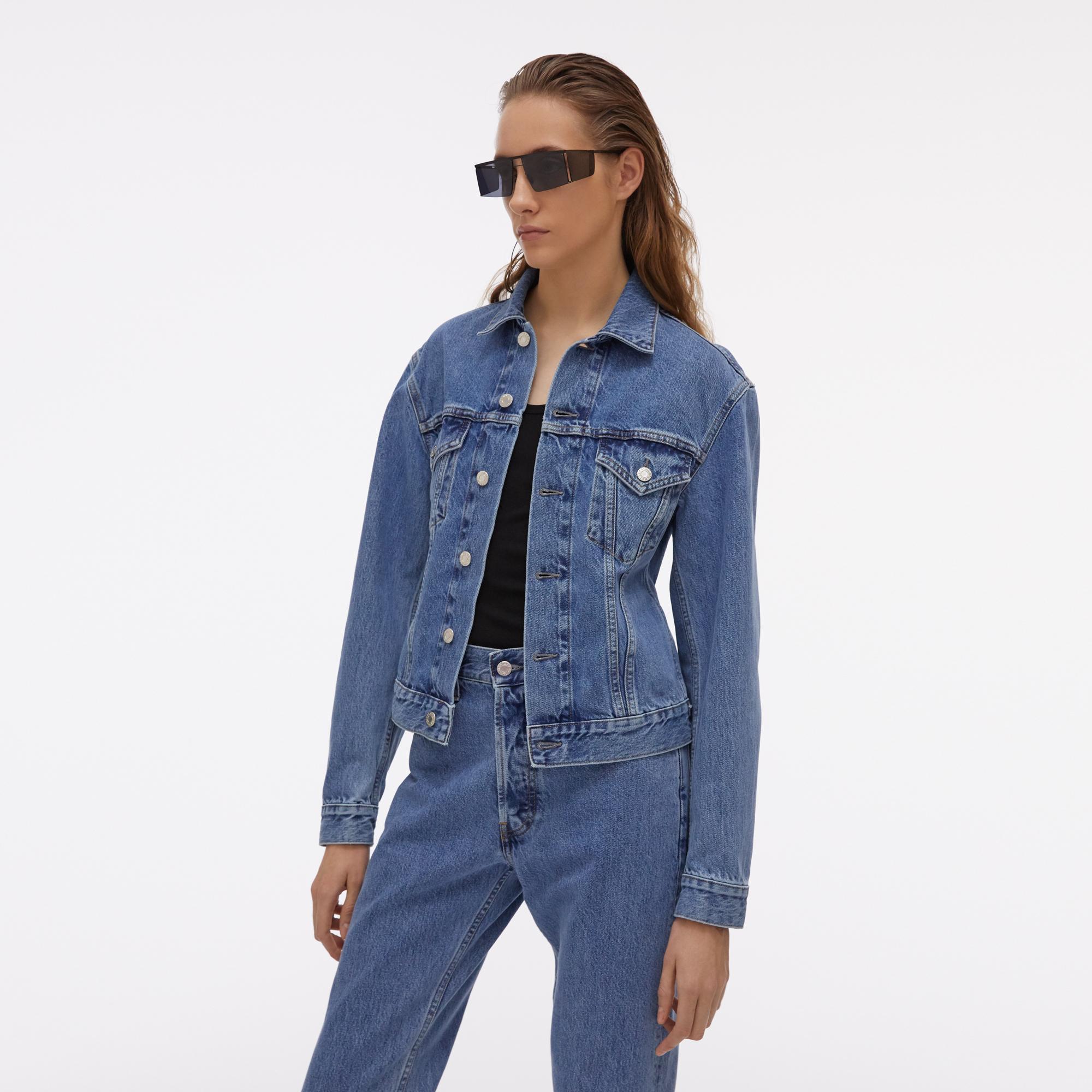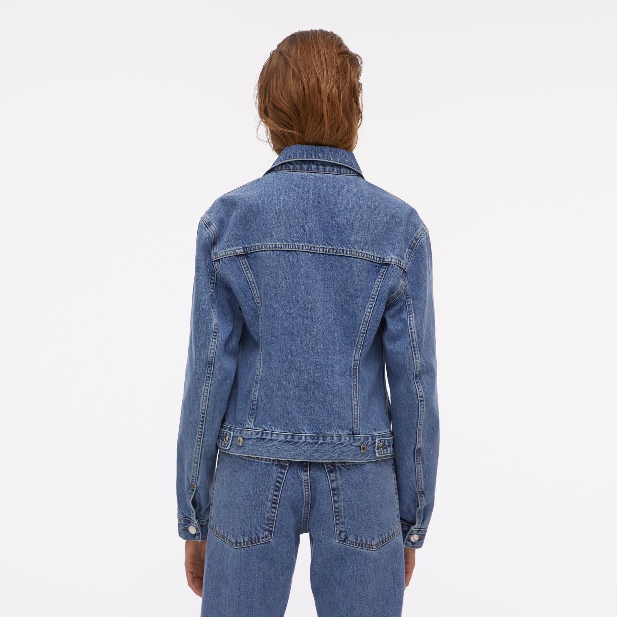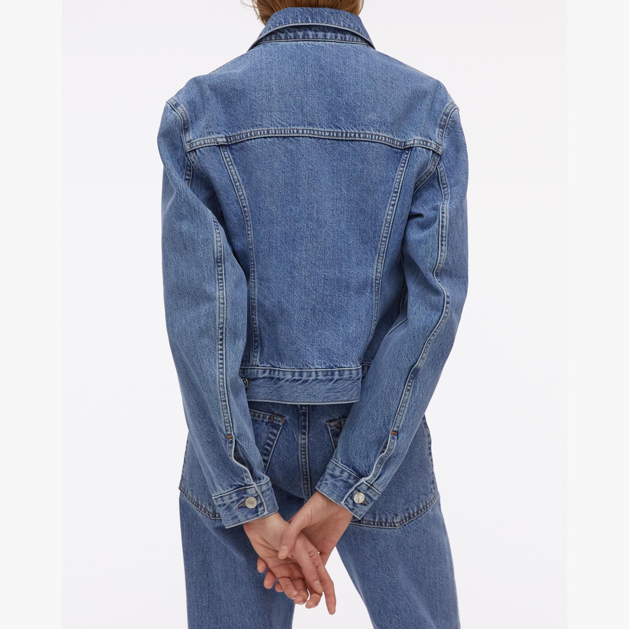 The Helmut Lang Femme Trucker Jacket is a cotton denim waisted jacket with contrast stitching
