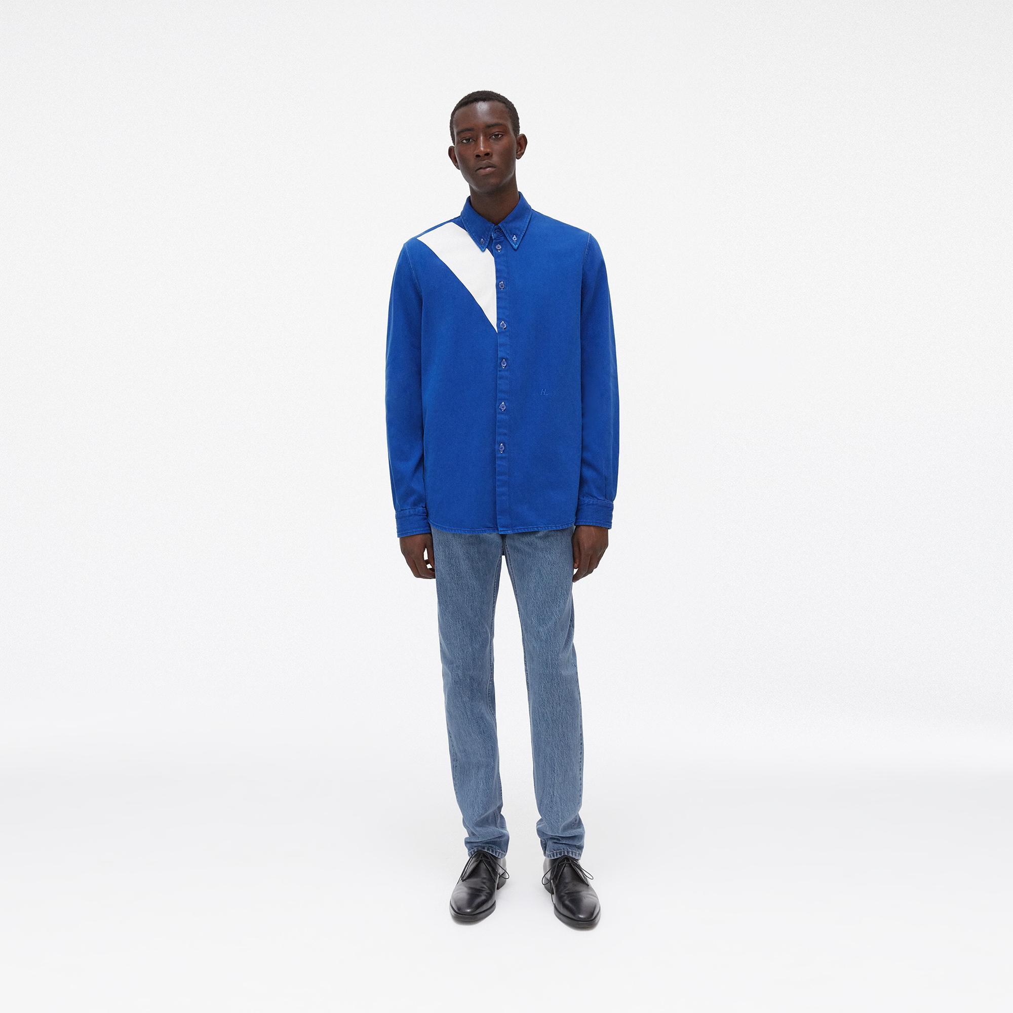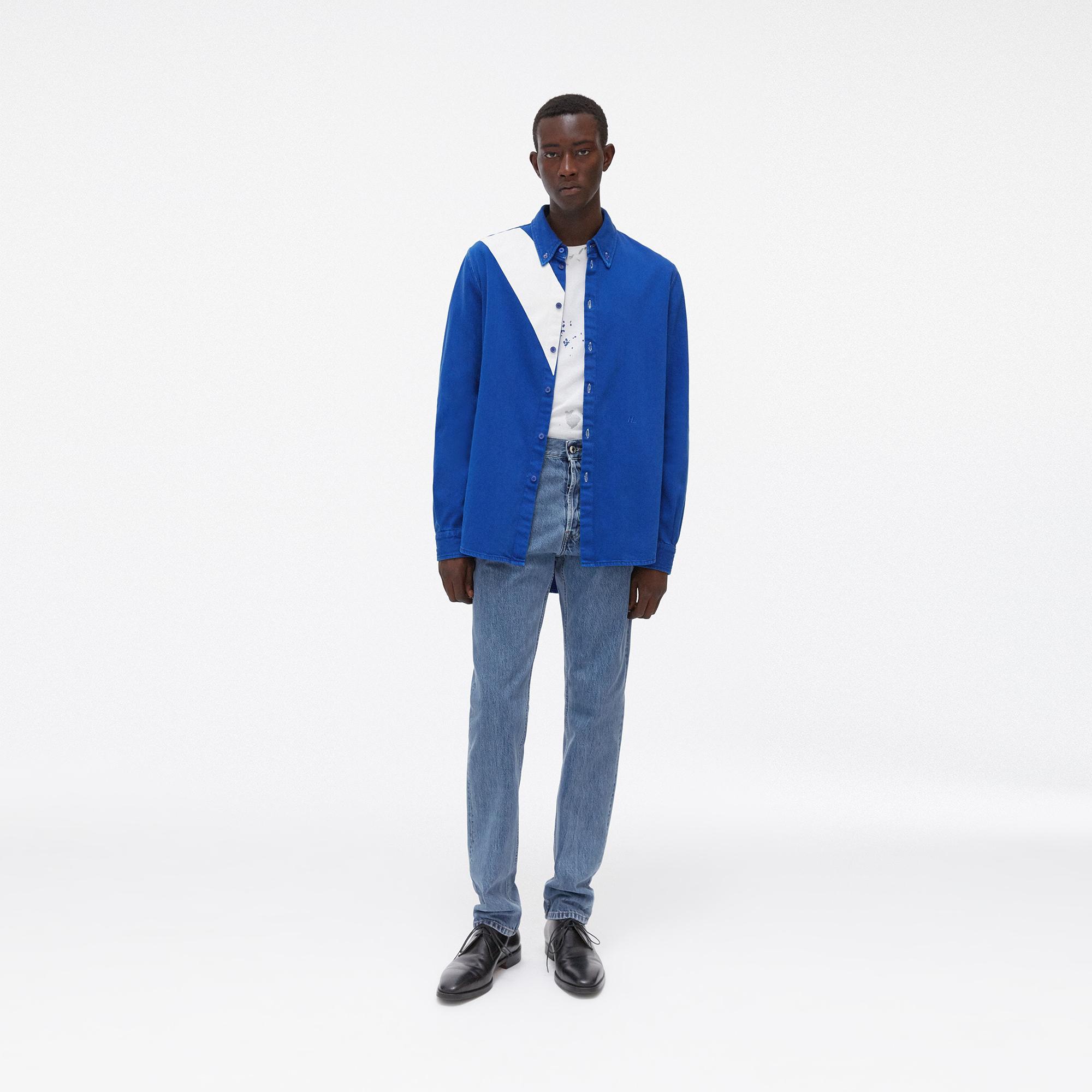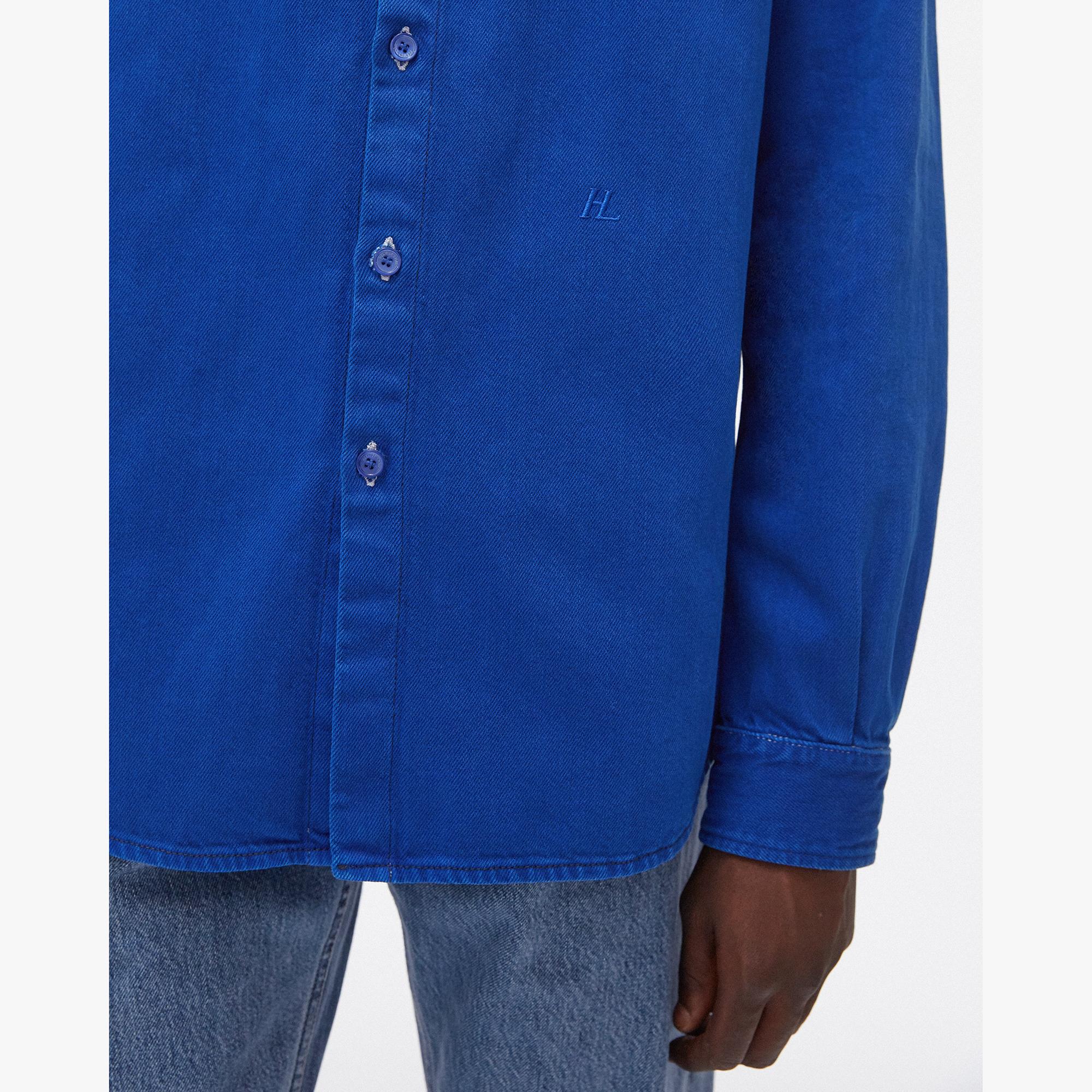 The Helmut Lang Sash Jean Overshirt is a denim overshirt with a printed sash pattern and rubberized buttons
