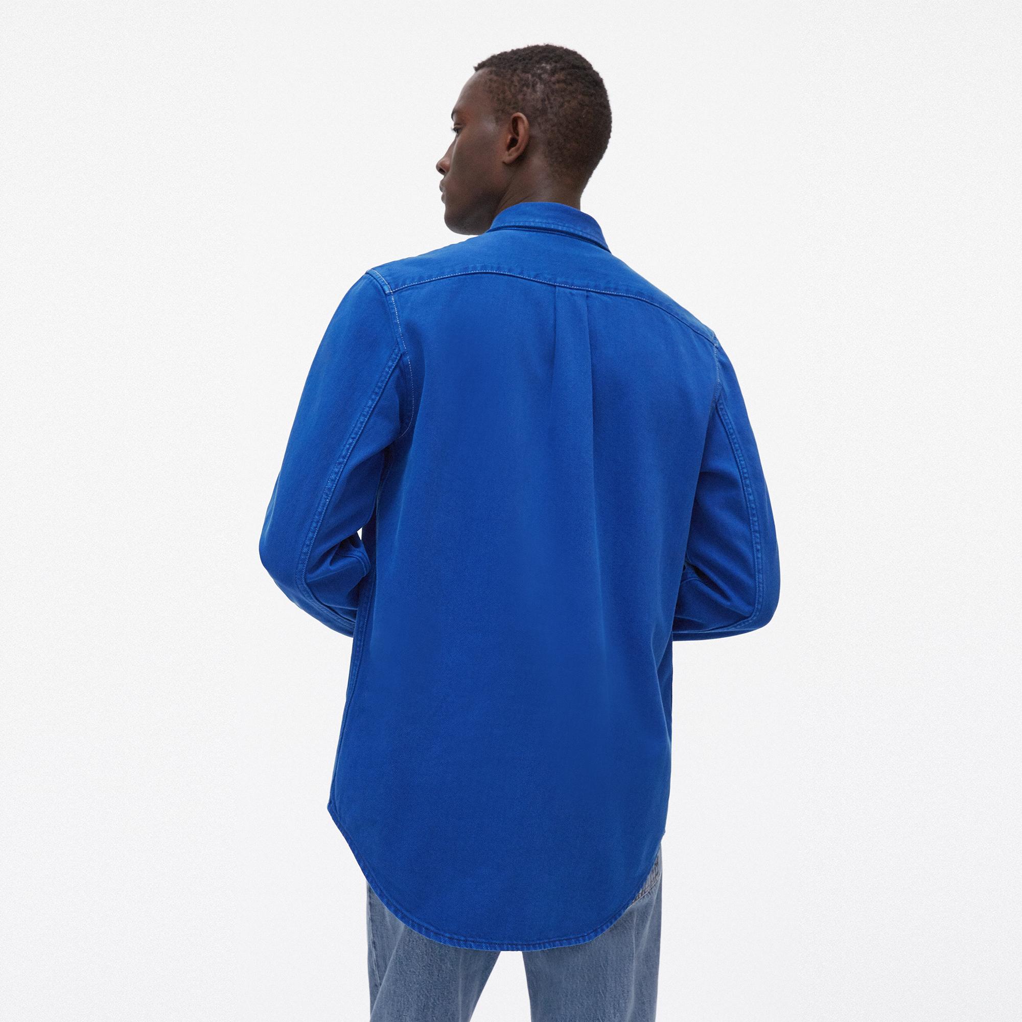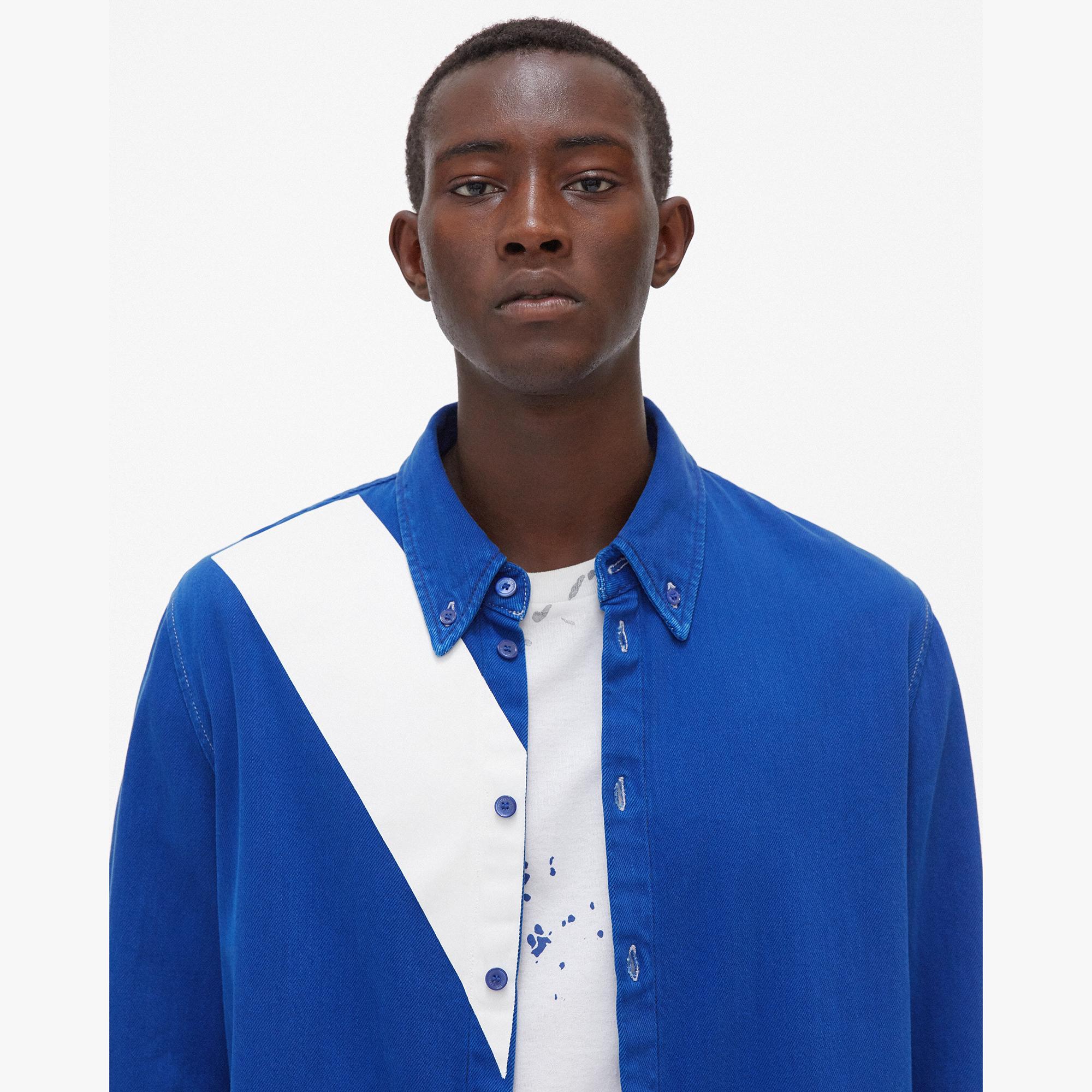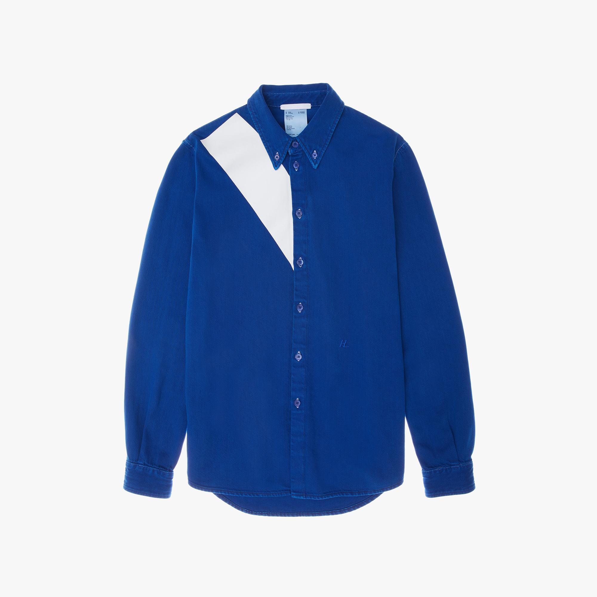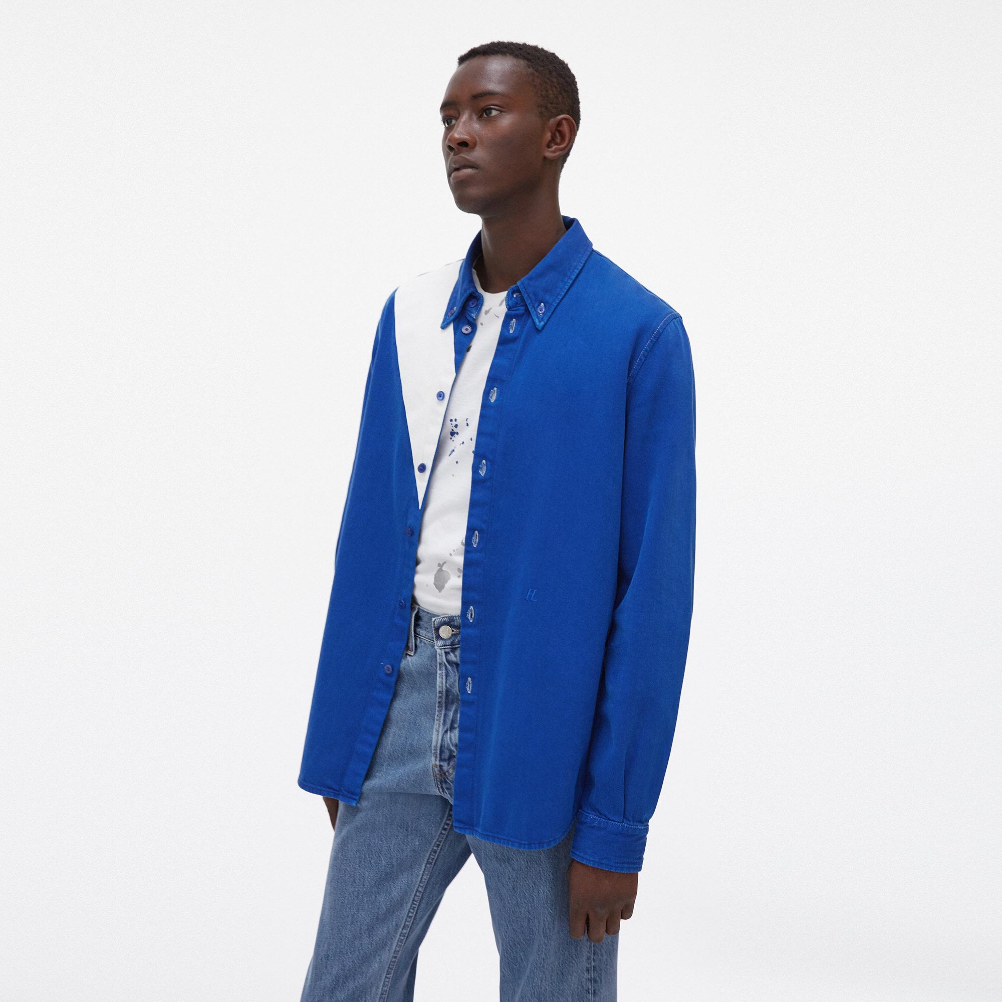The Helmut Lang Sash Jean Overshirt is a denim overshirt with a printed sash pattern and rubberized buttons