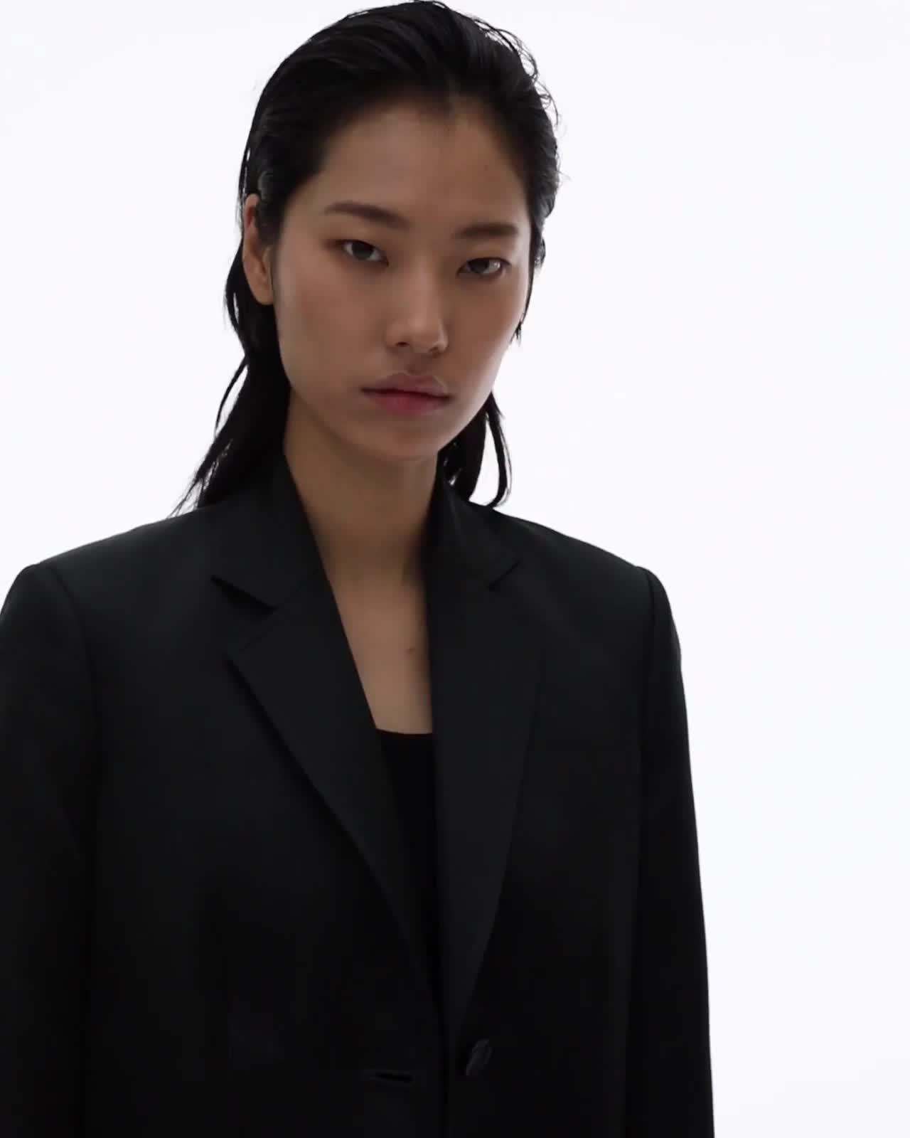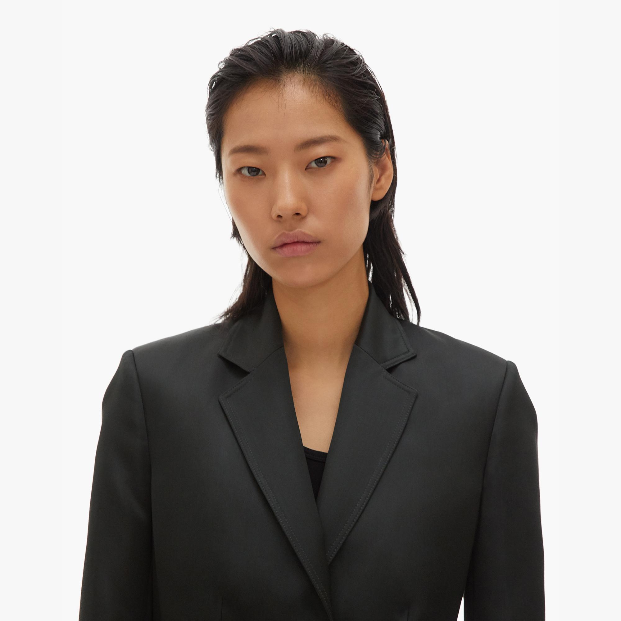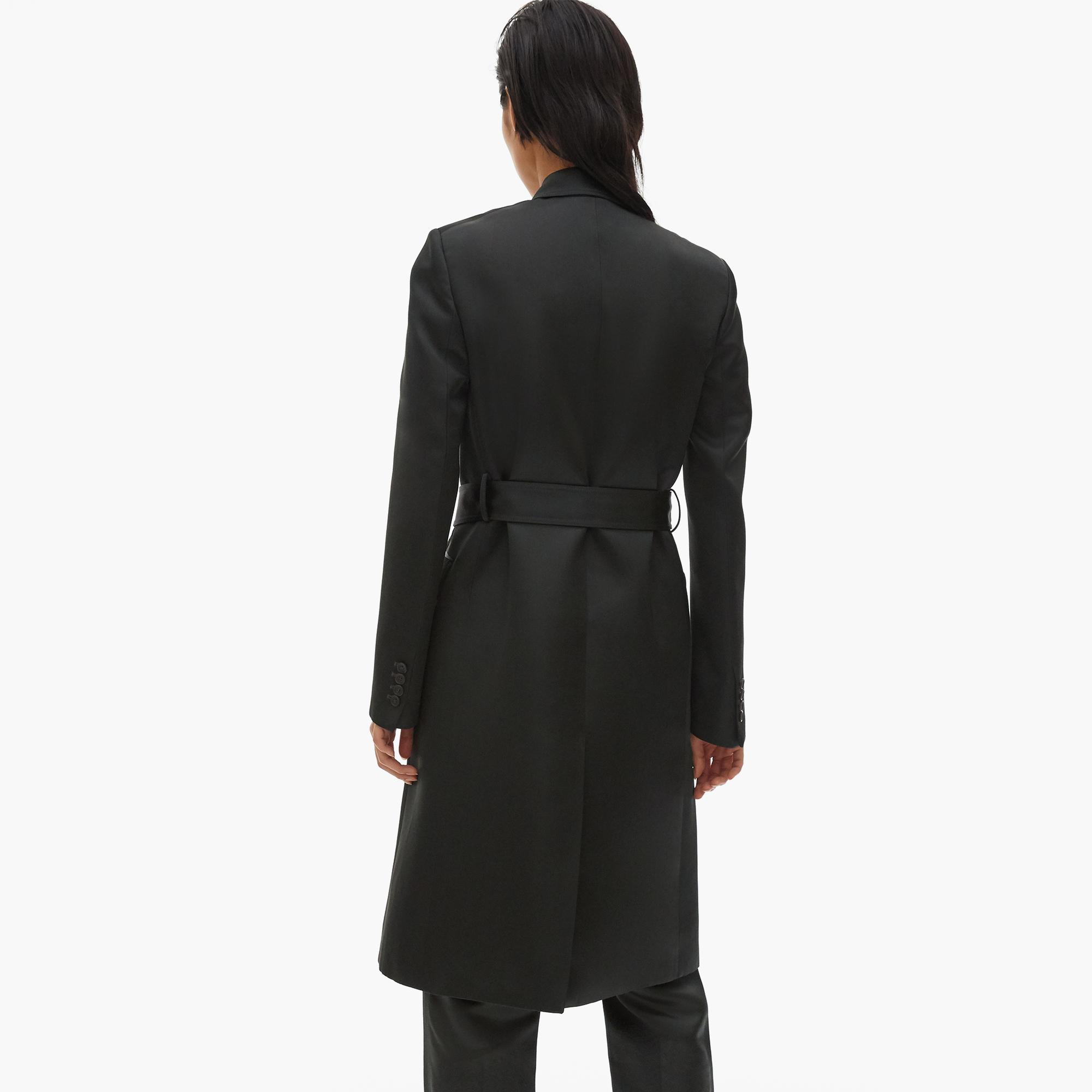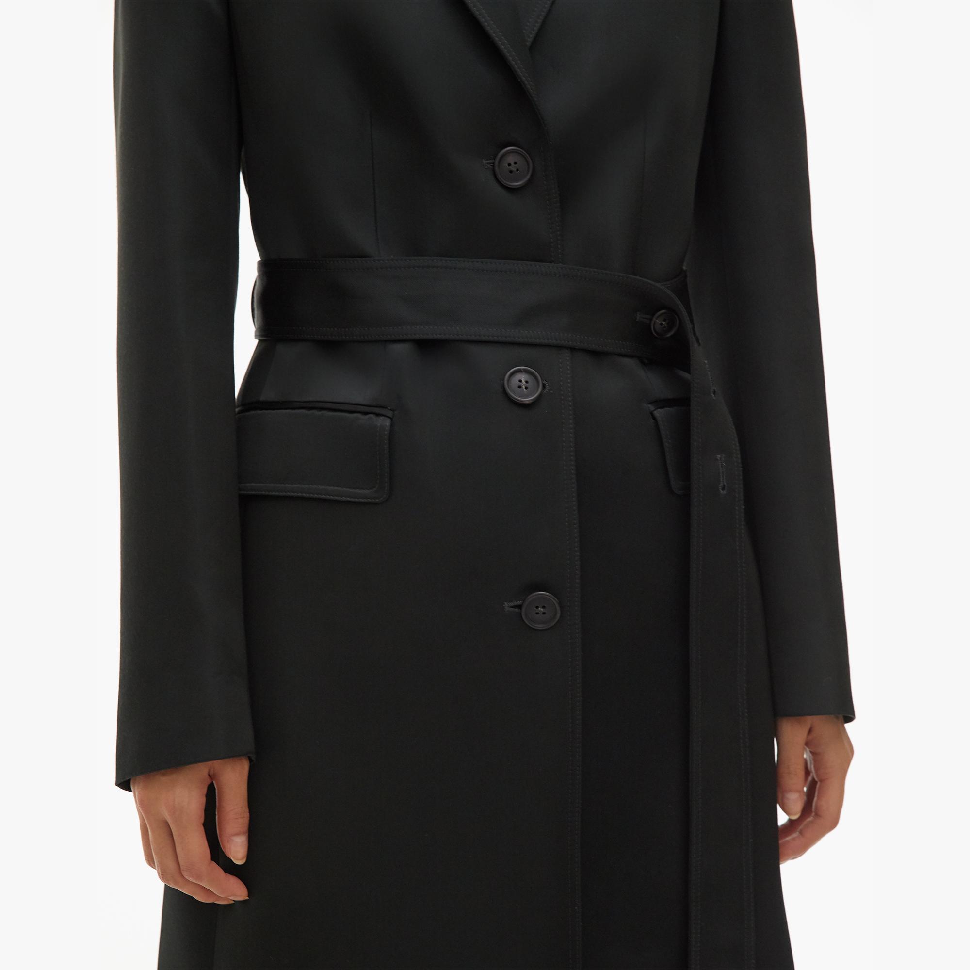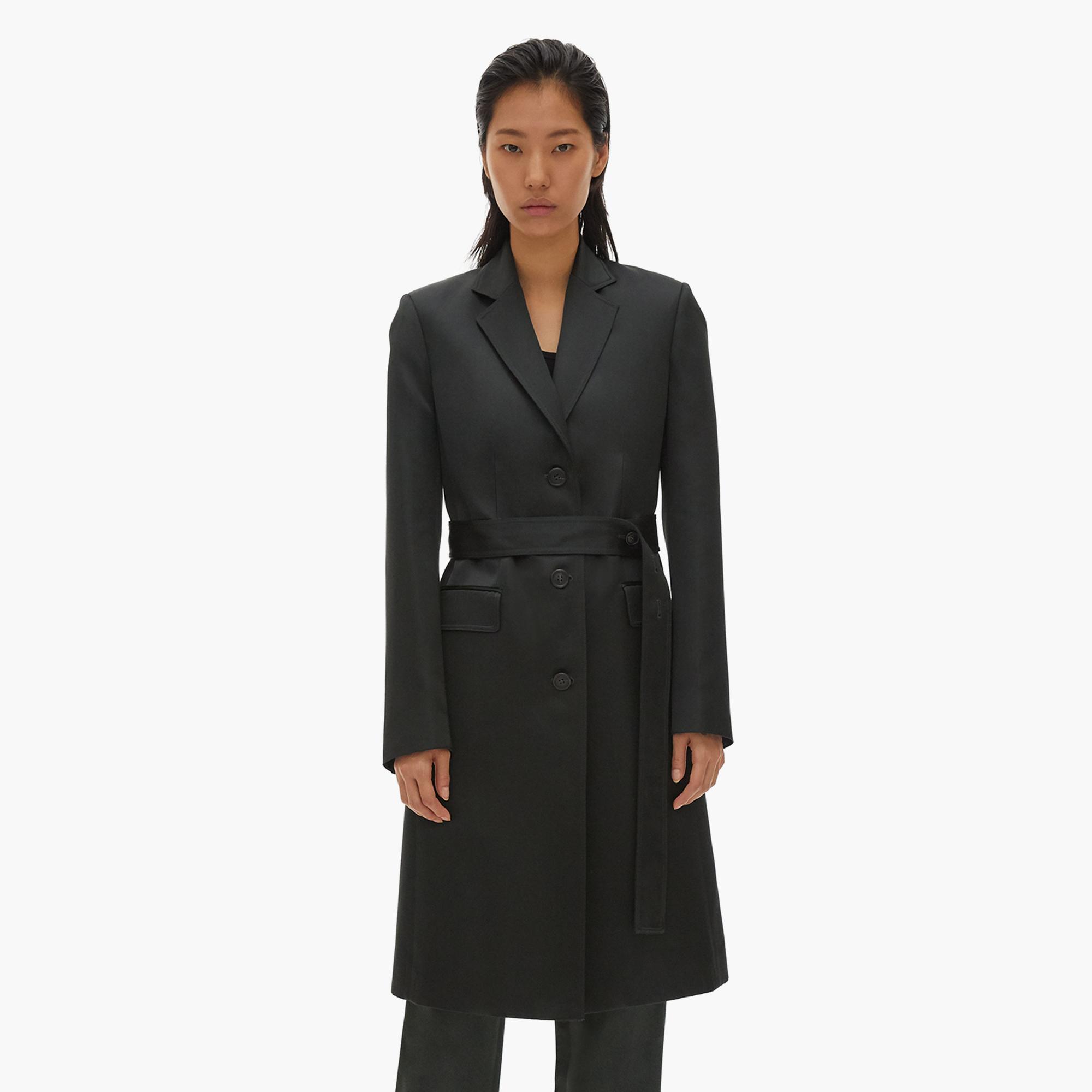The Helmut Lang Heavy Satin Coat is a viscose double-breasted coat with notched lapels and a belt