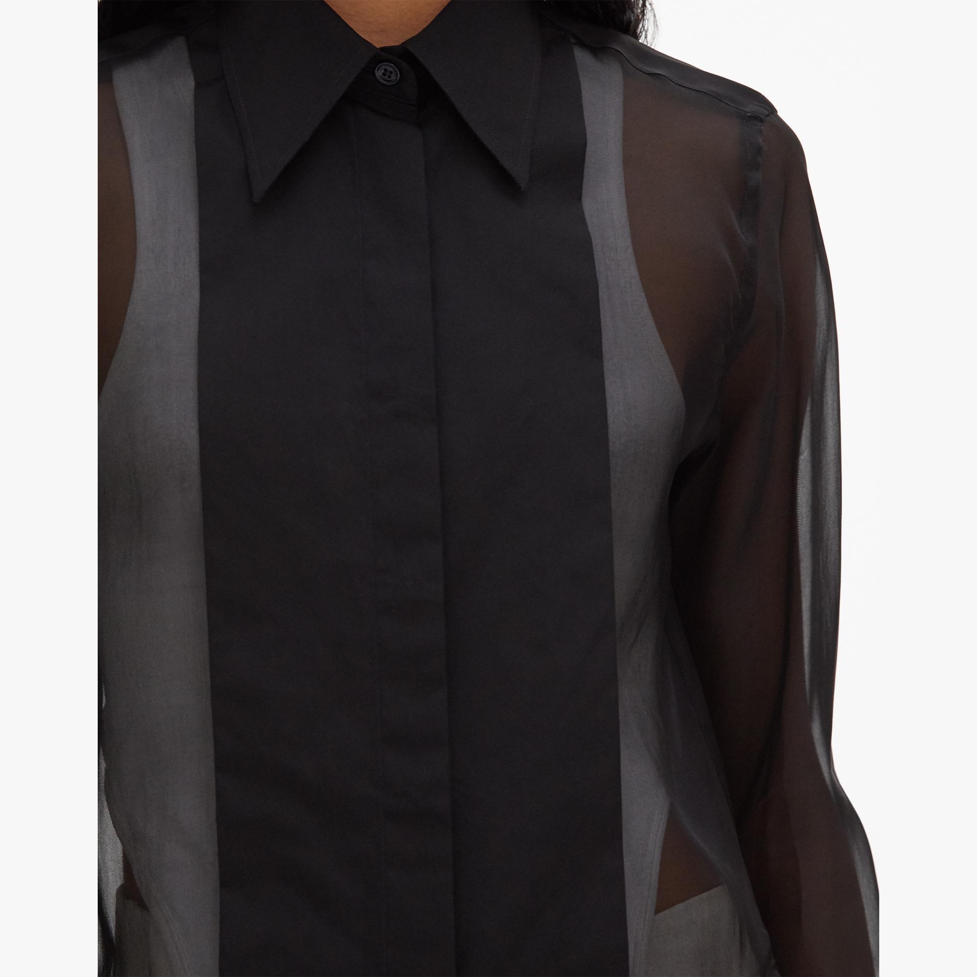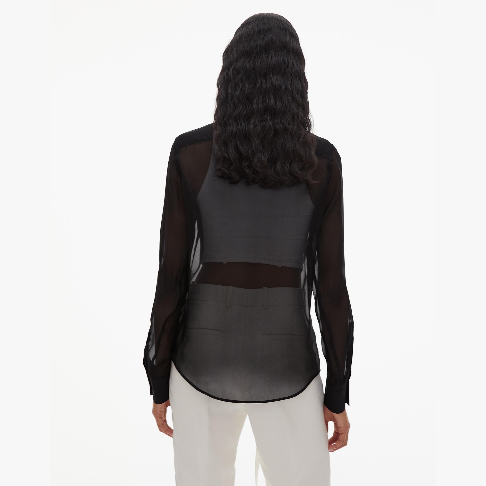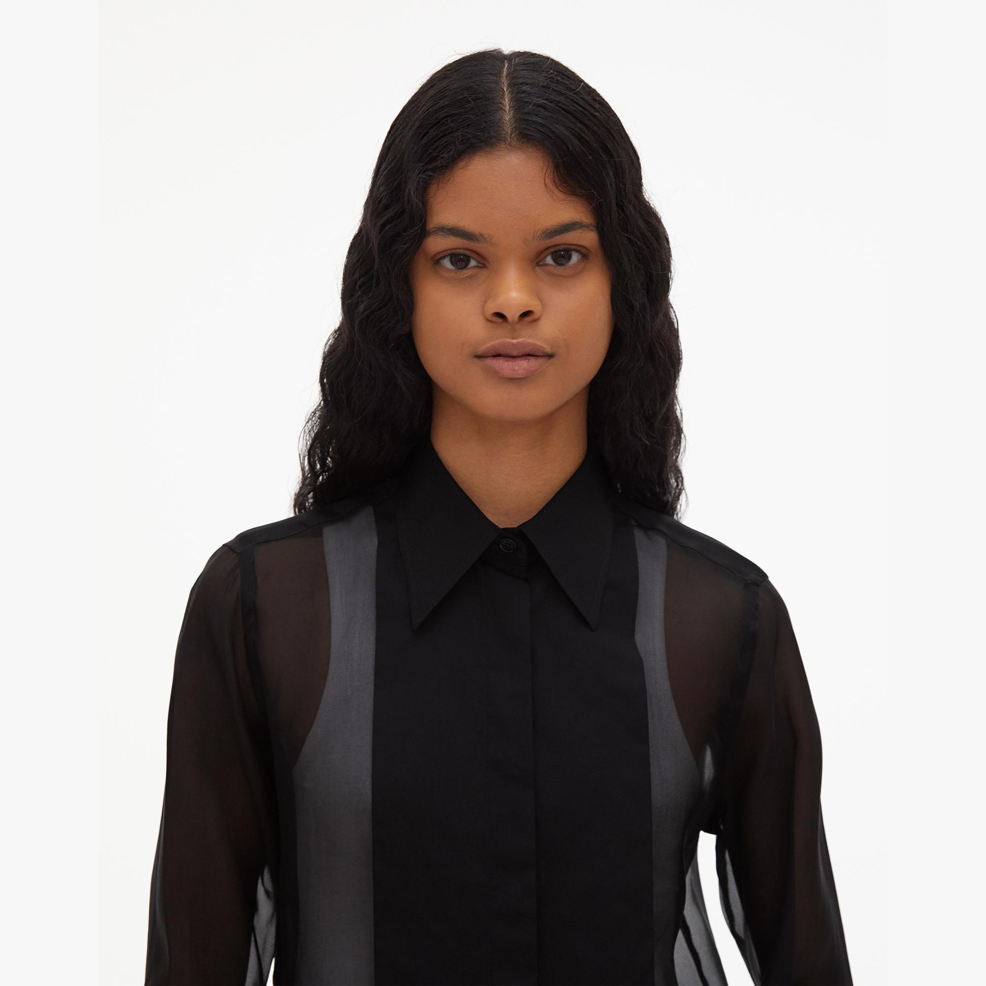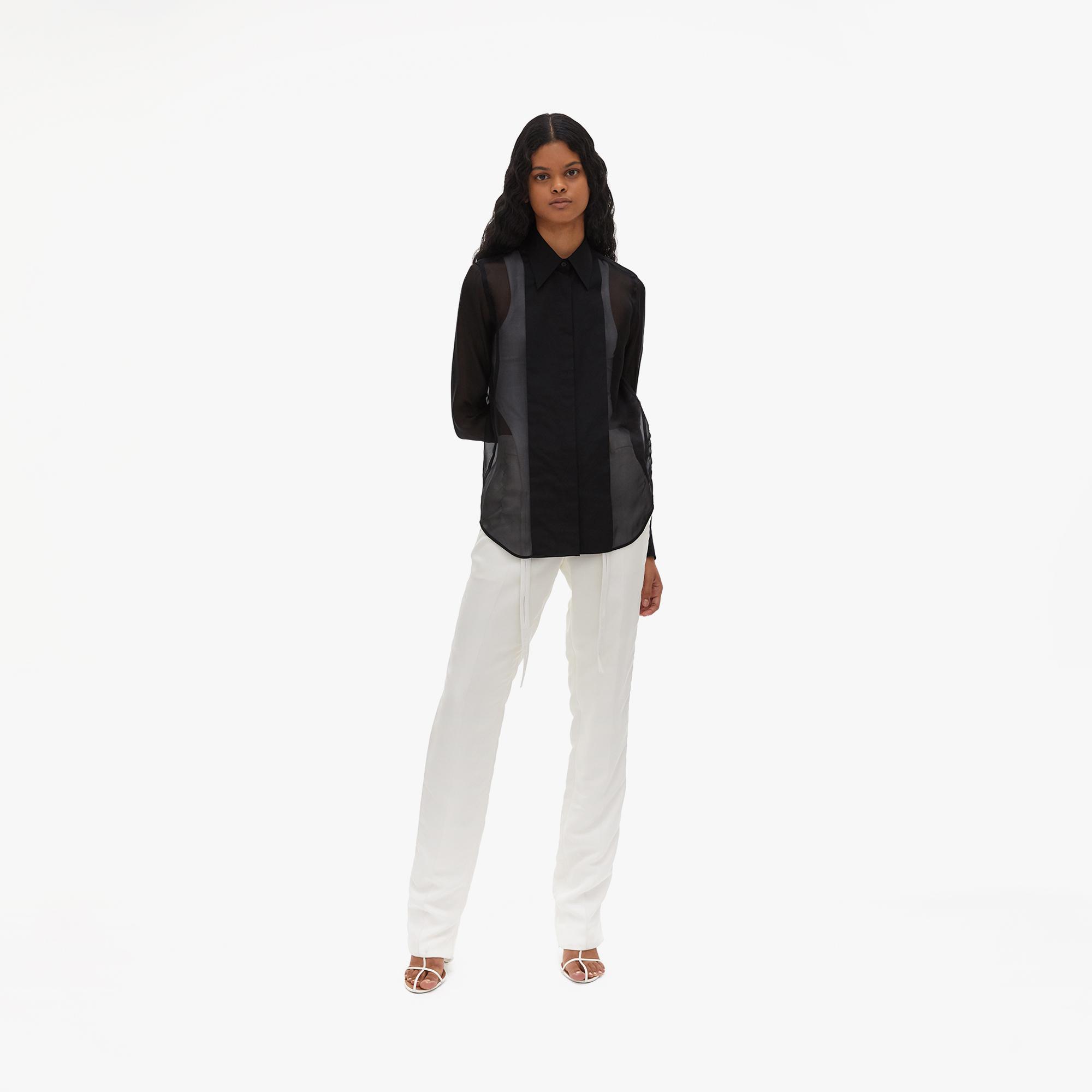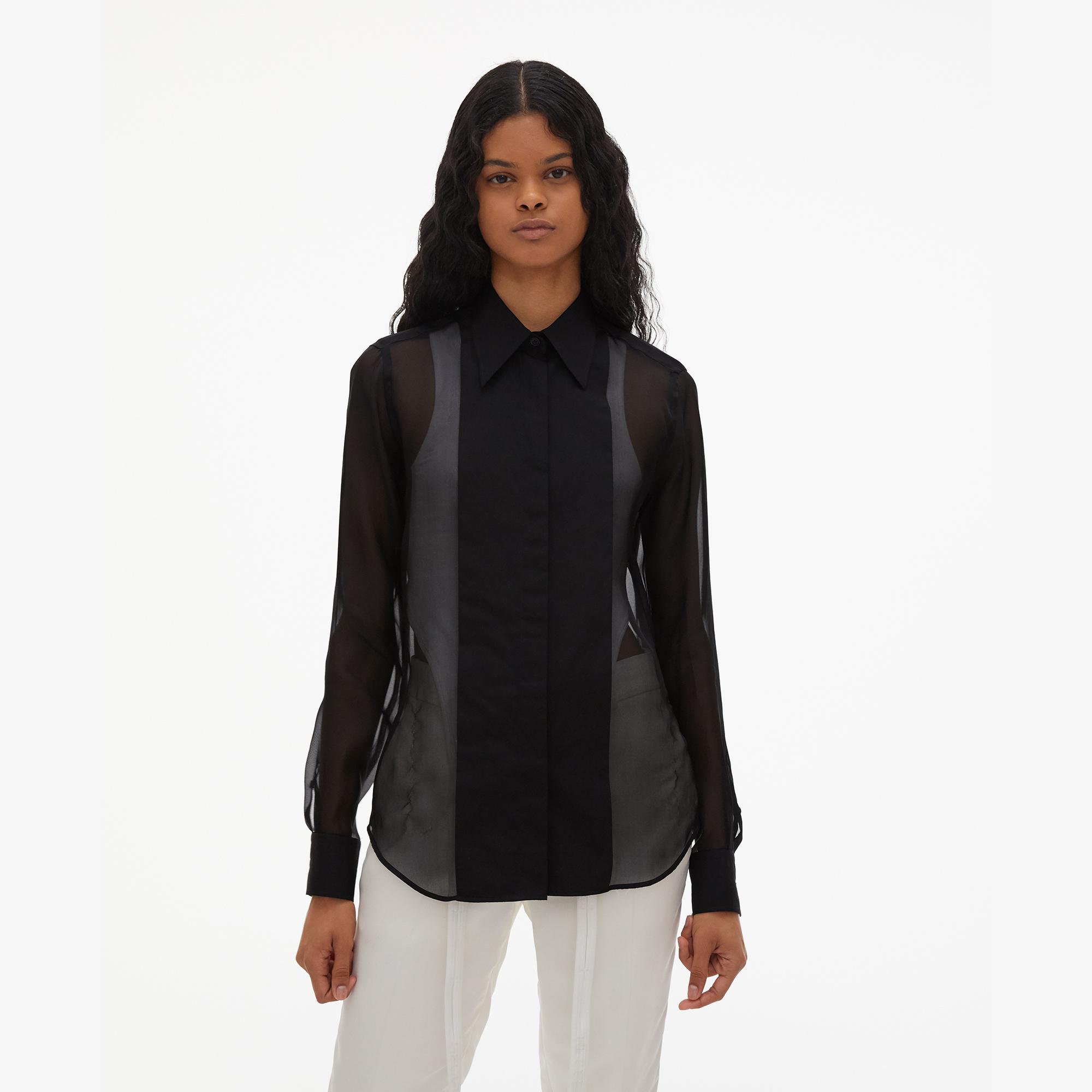 The Helmut Lang Sheer Tux Shirt is a sheer silk mesh button-down shirt with an opaque bib detail