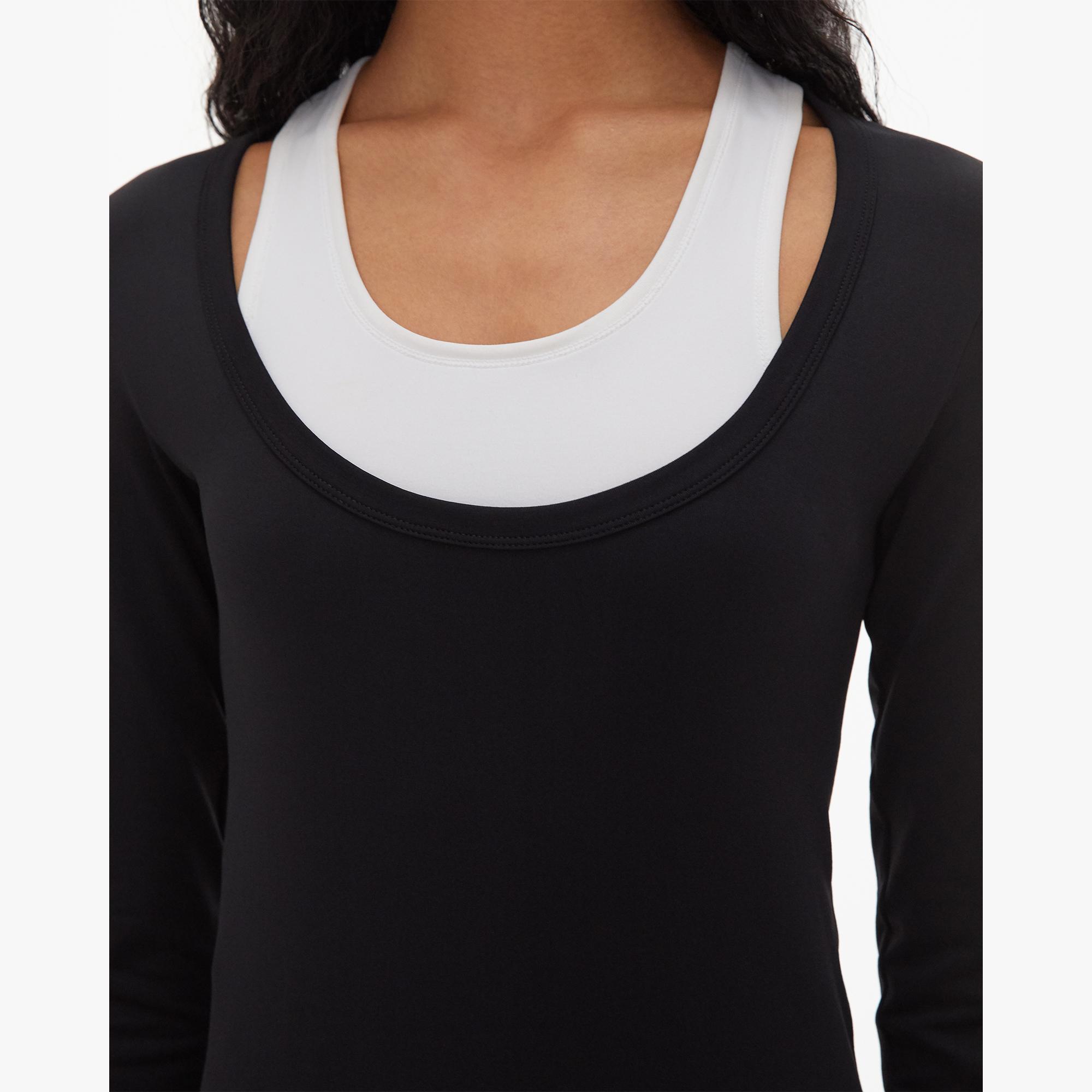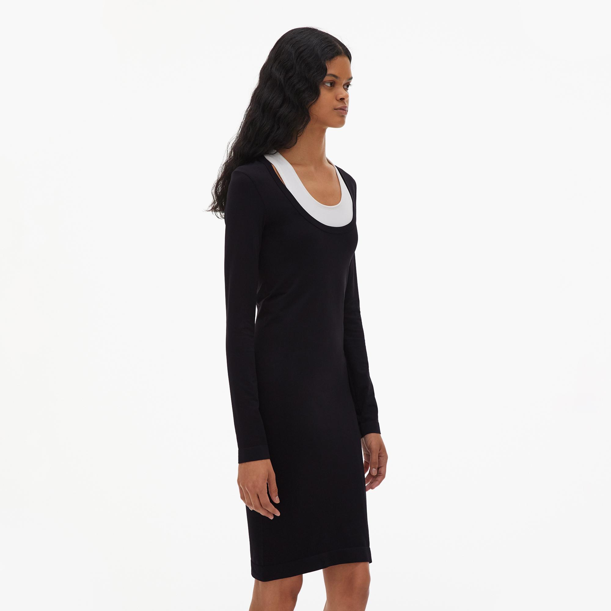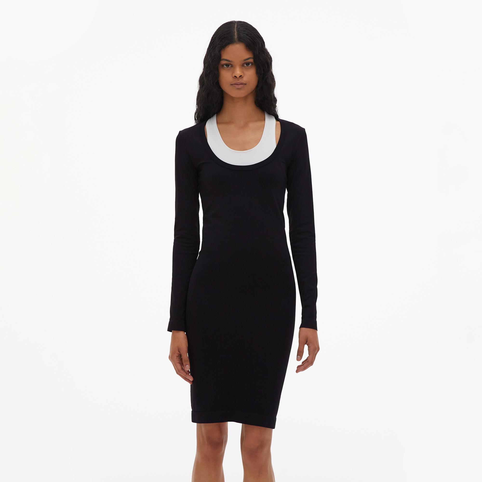 The Helmut Lang Seamless Jersey Scoop Neck Dress is an above-the-knee dress featuring a contemporary, fitted silhouette