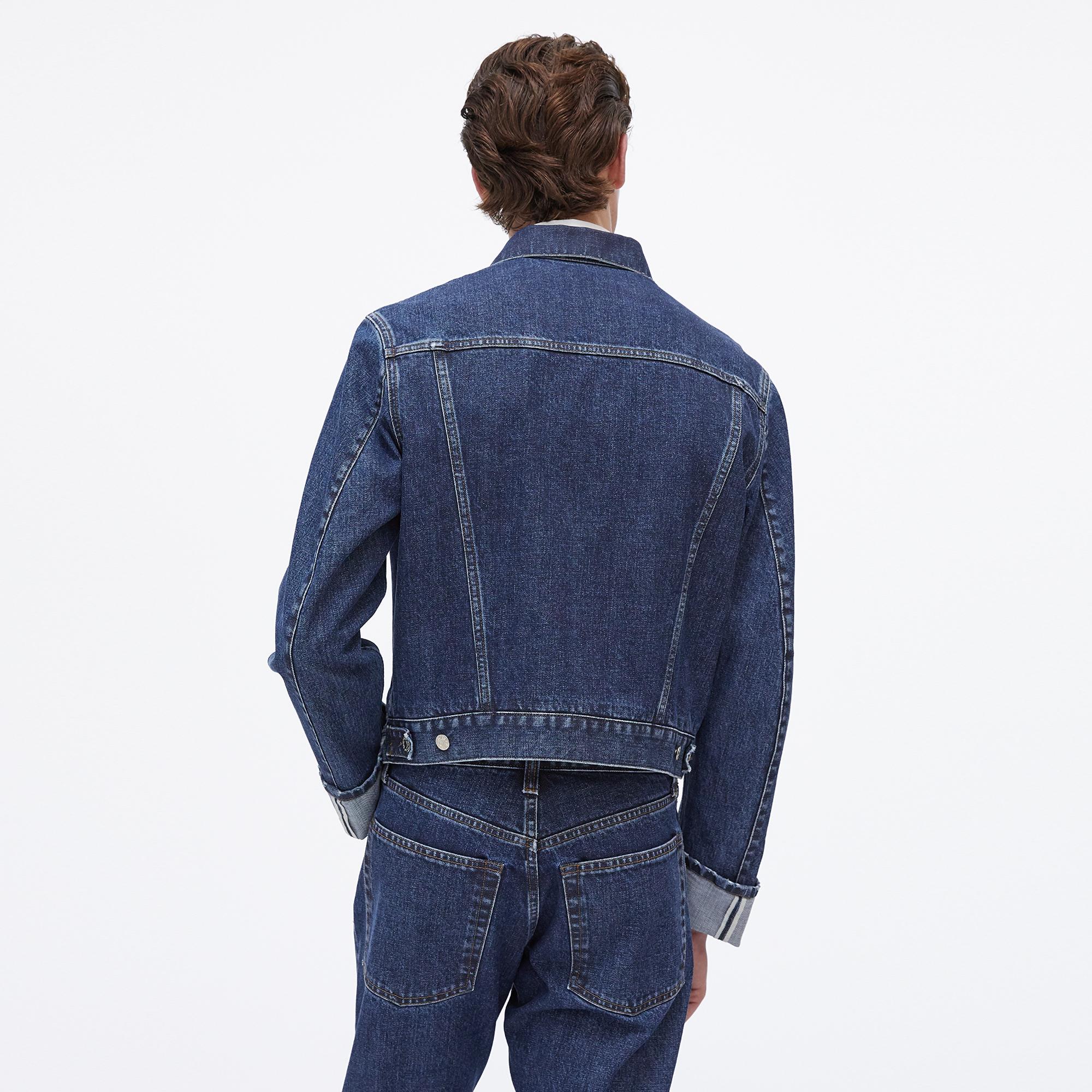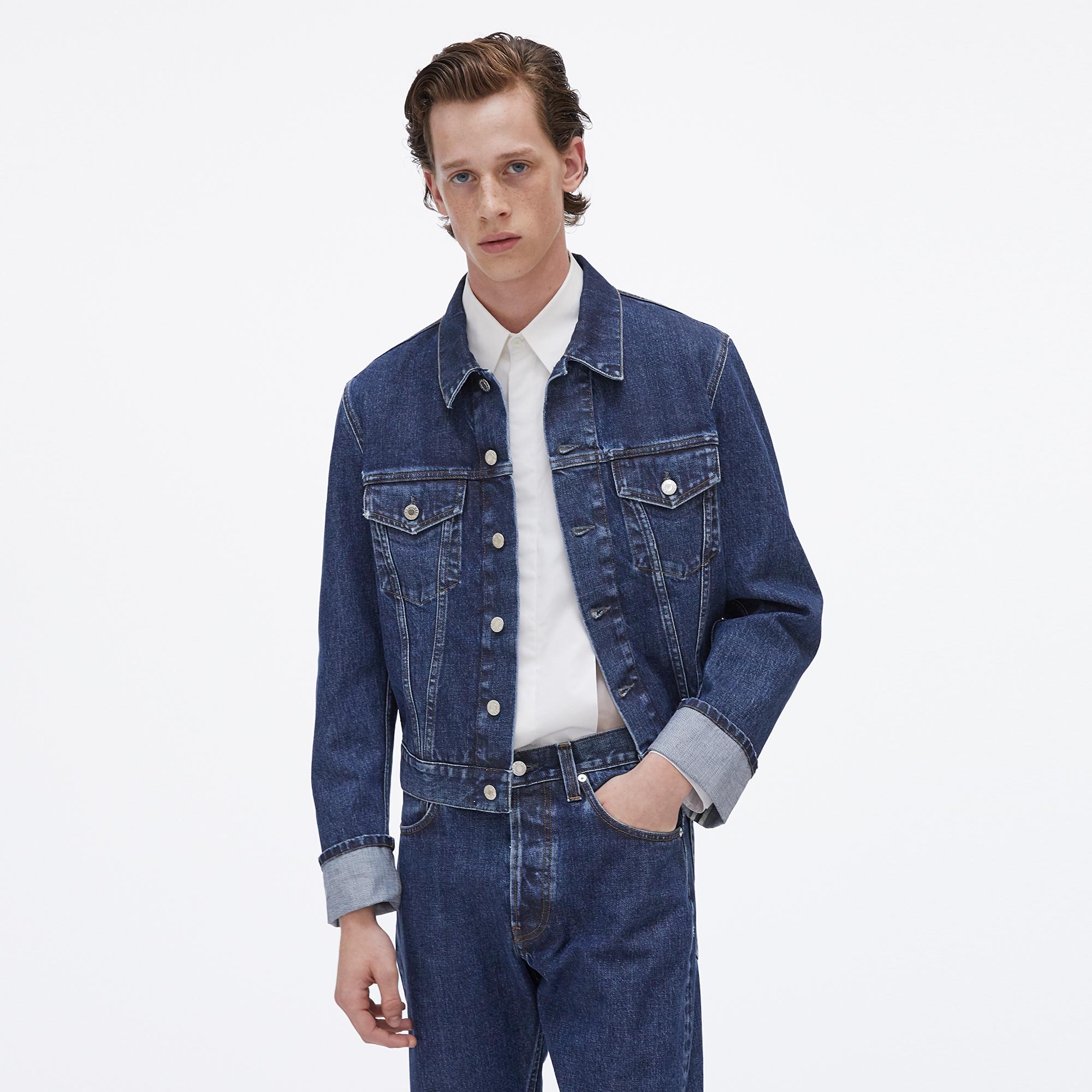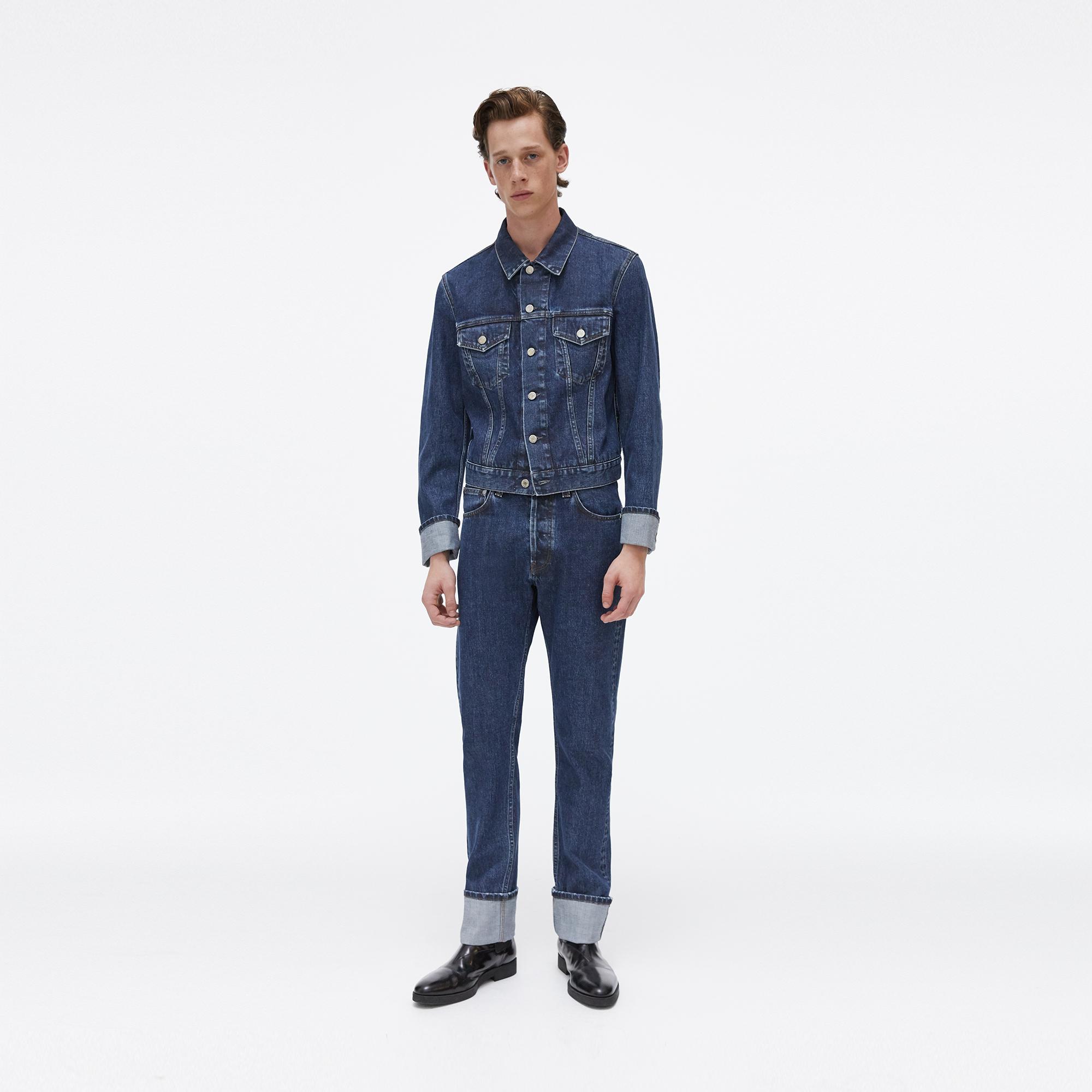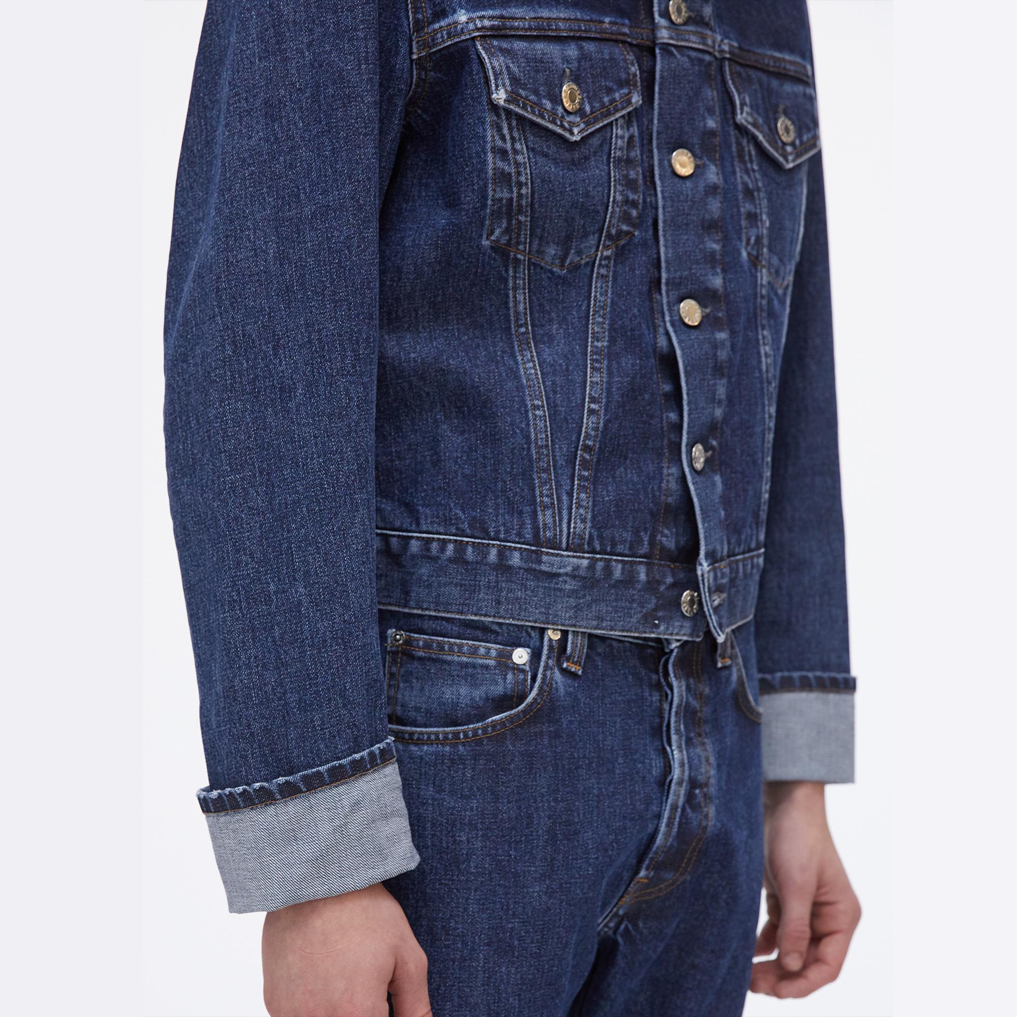 The Helmut Lang Cuffed Masc Trucker Jean Jacket in Japanese selvage denim is a rigid, boxy jean jacket meant to be worn with cuffed sleeves