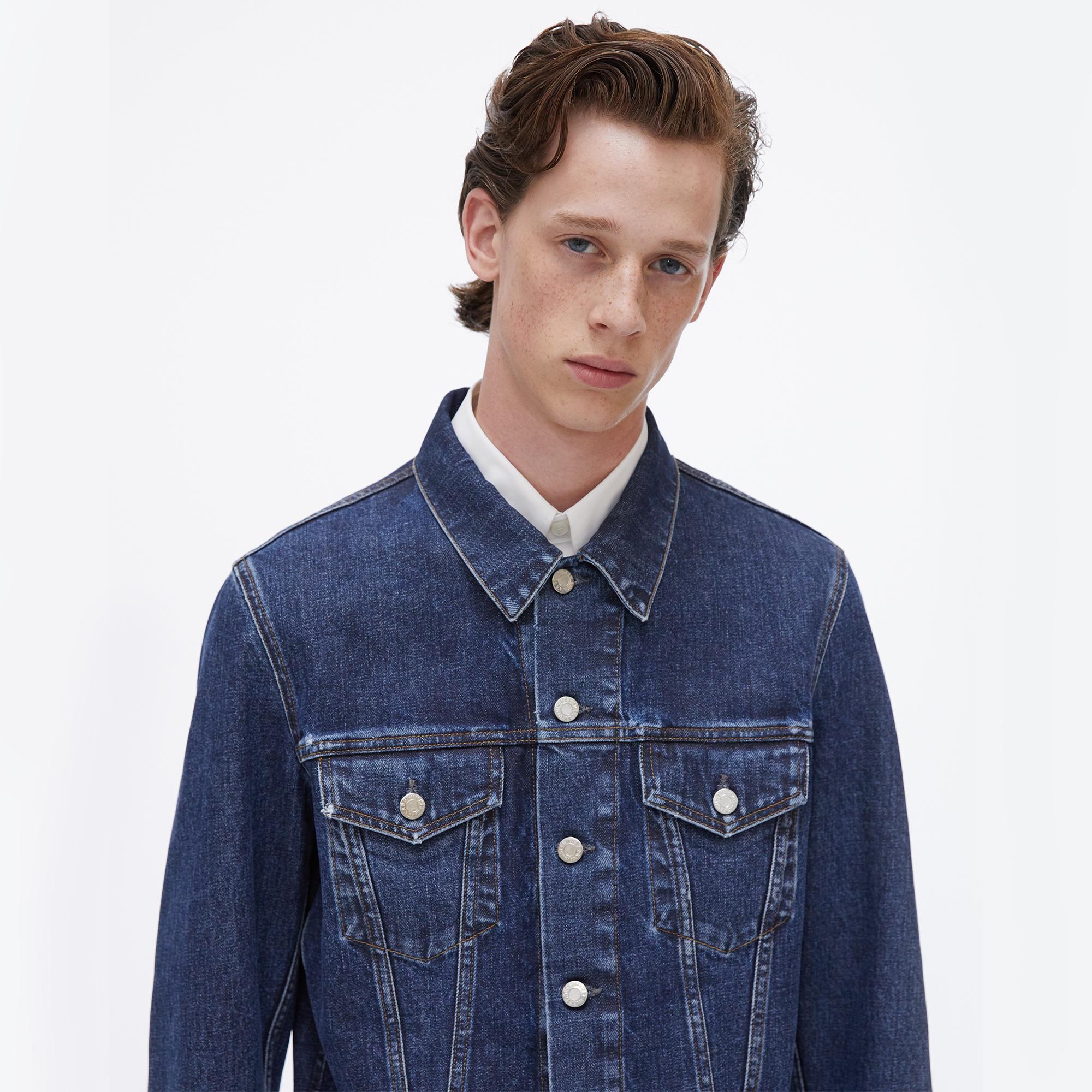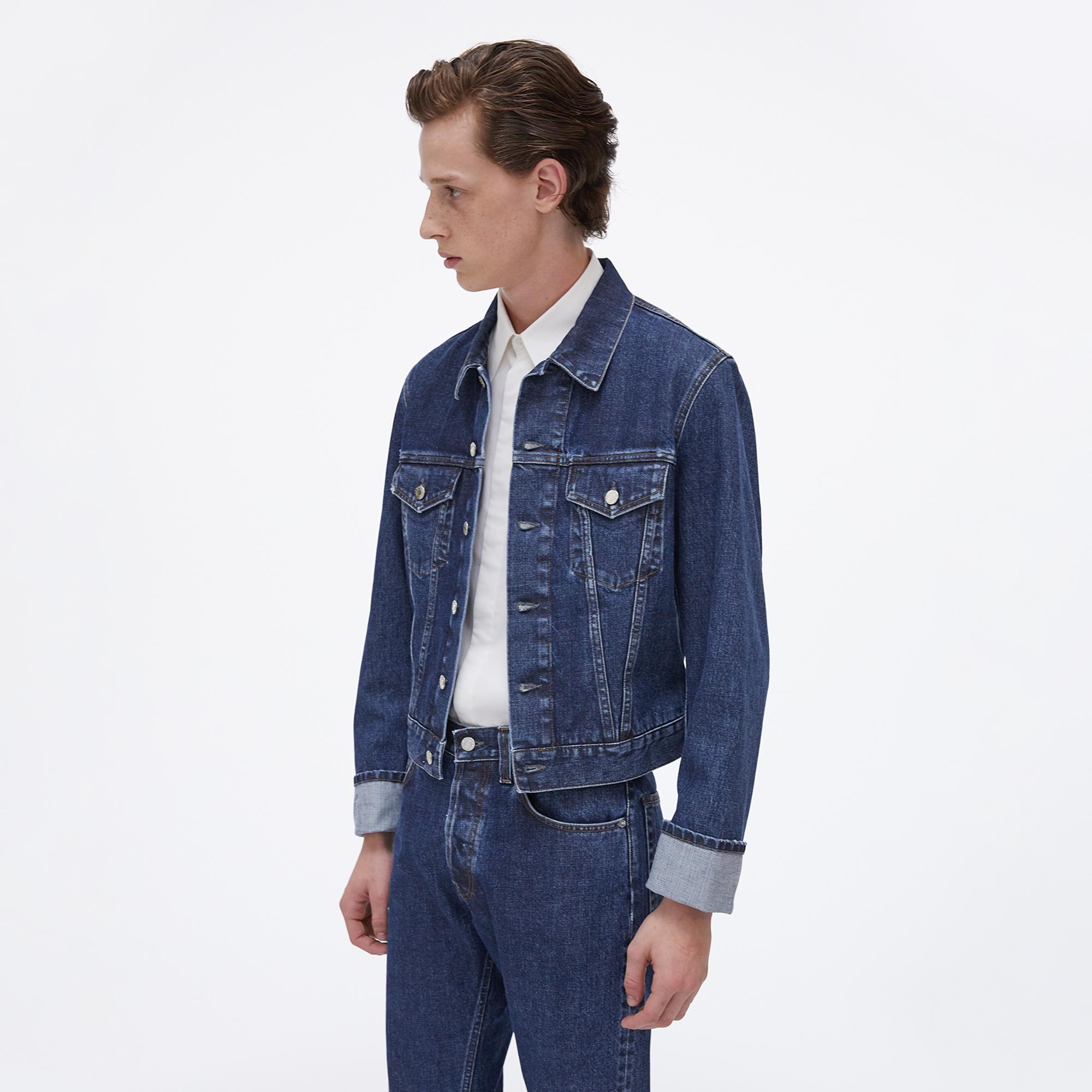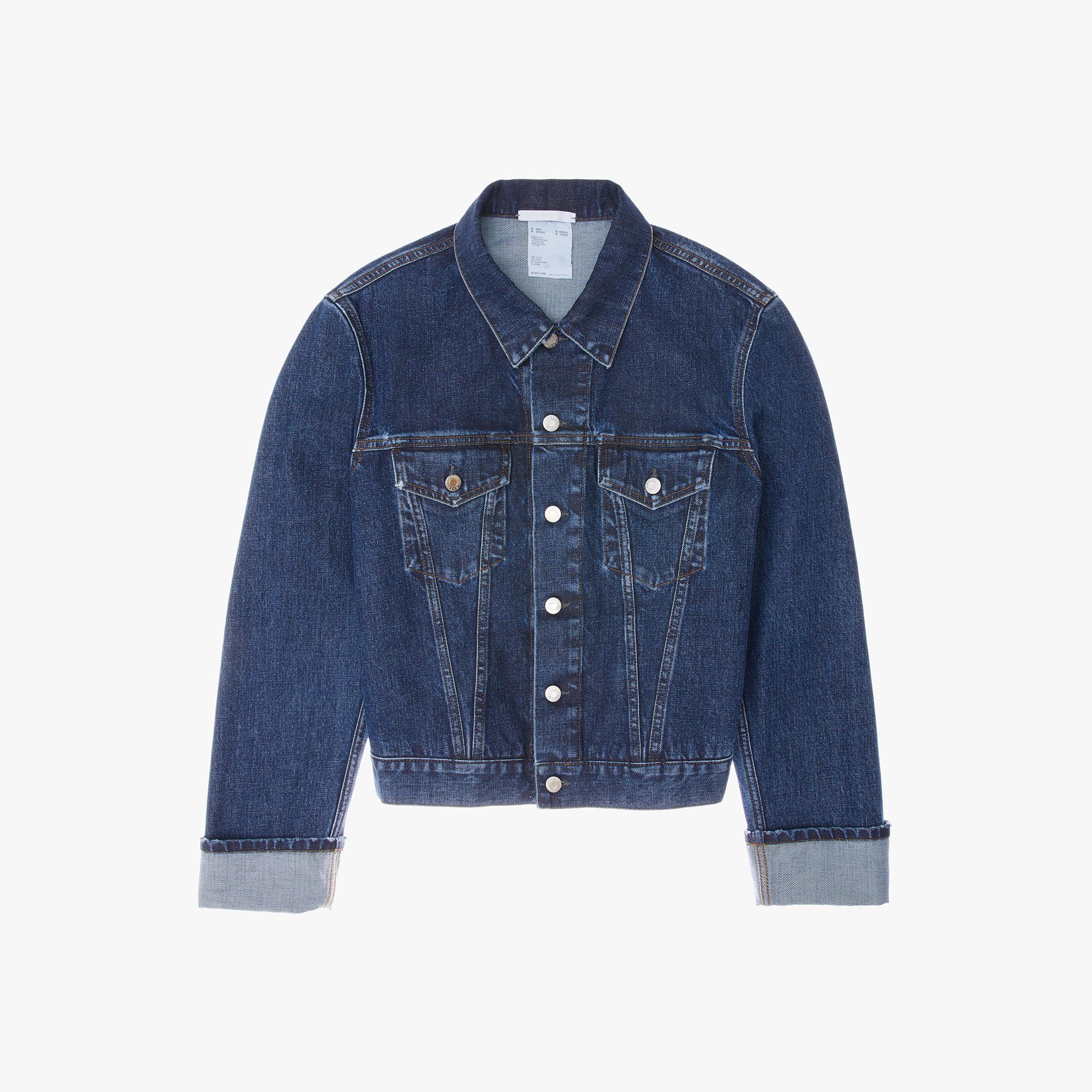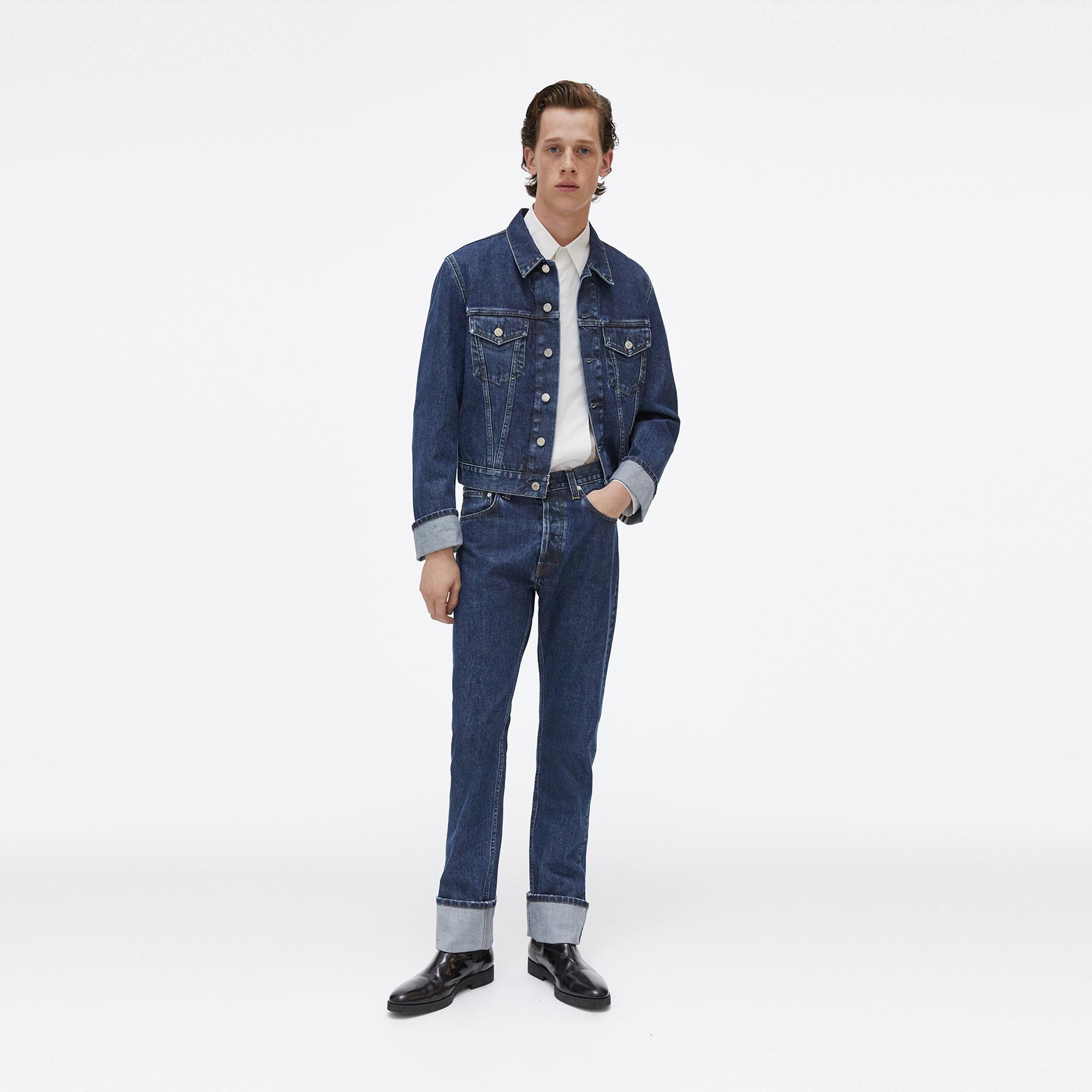 The Helmut Lang Cuffed Masc Trucker Jean Jacket in Japanese selvage denim is a rigid, boxy jean jacket meant to be worn with cuffed sleeves