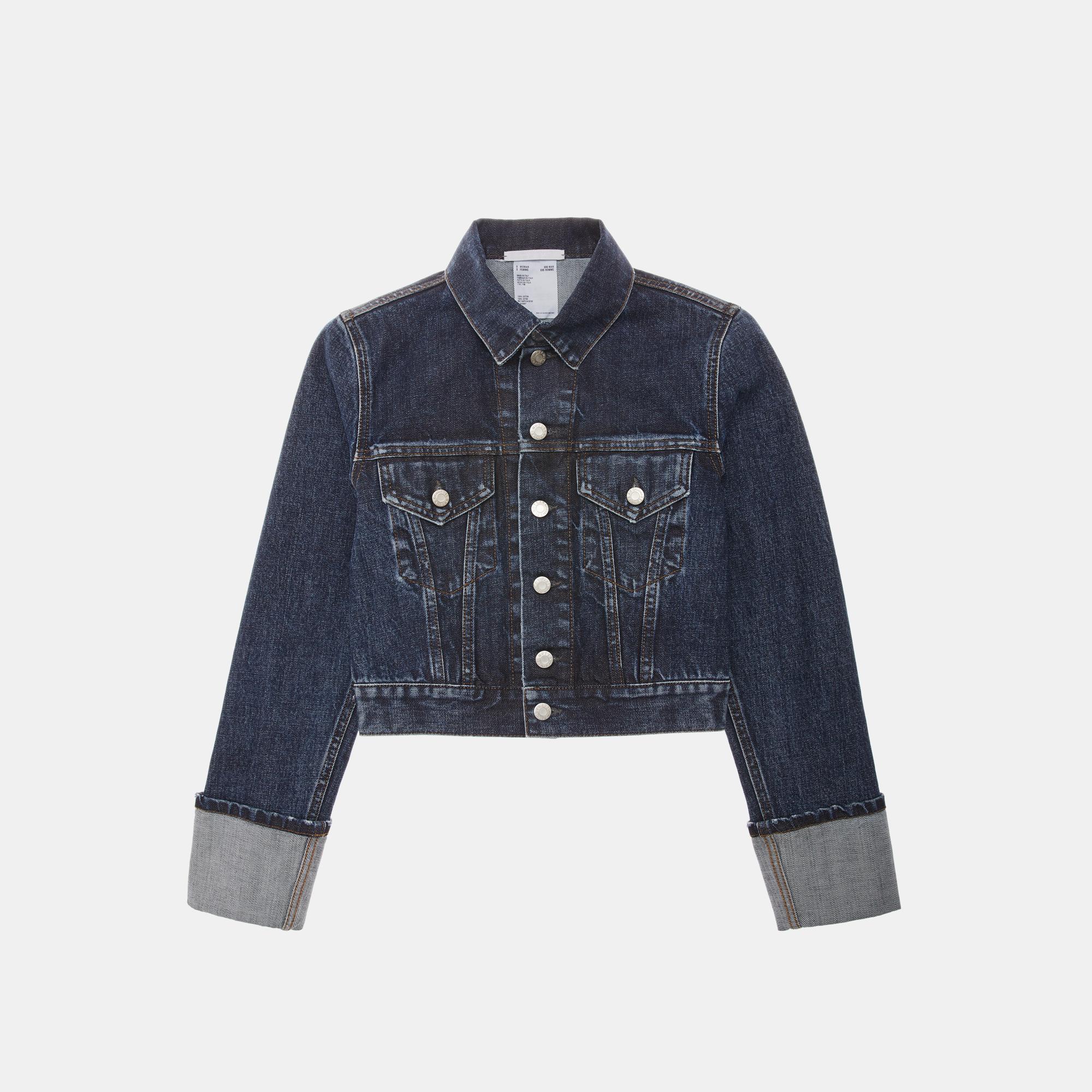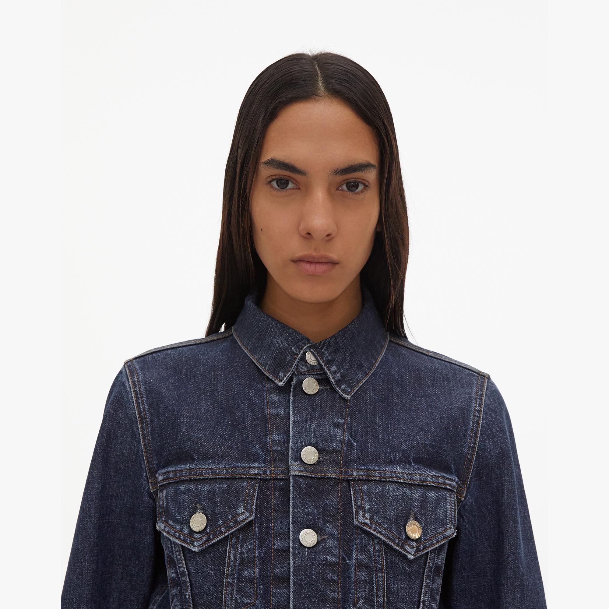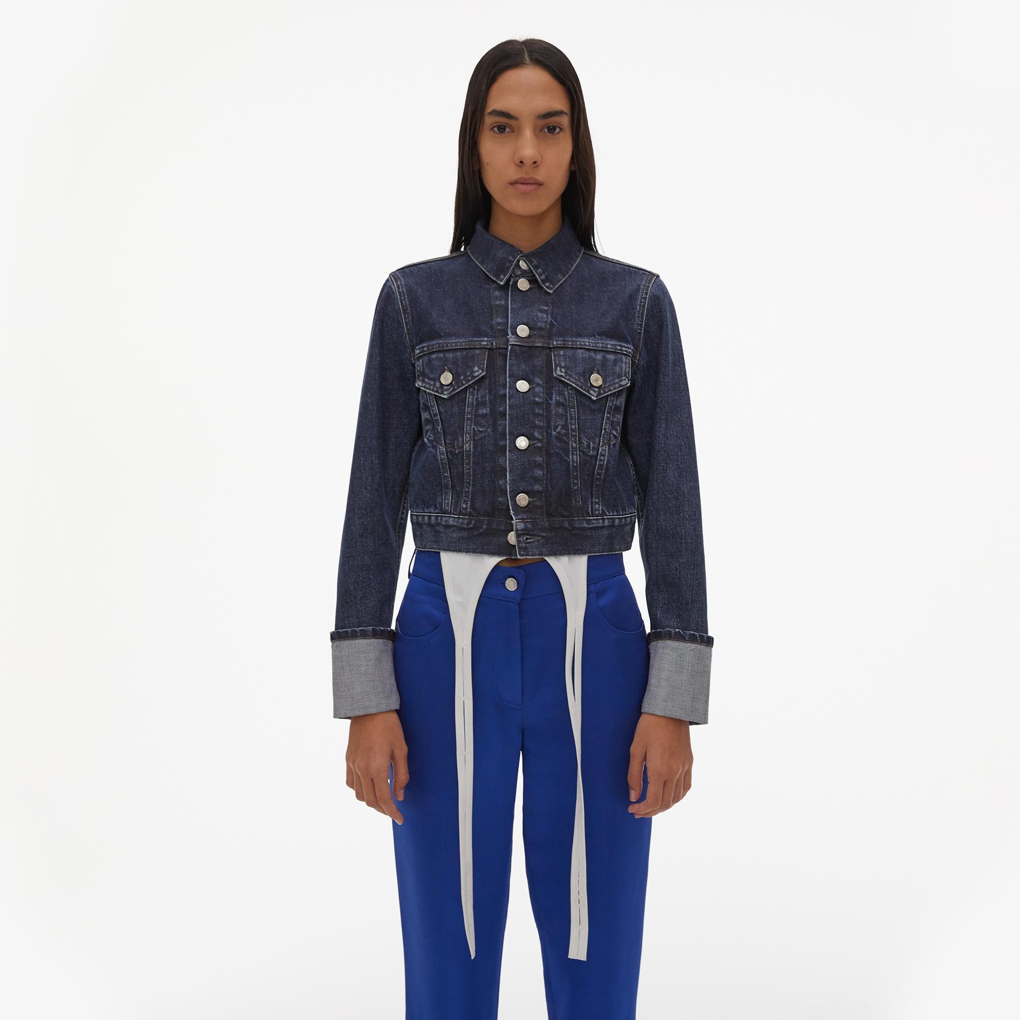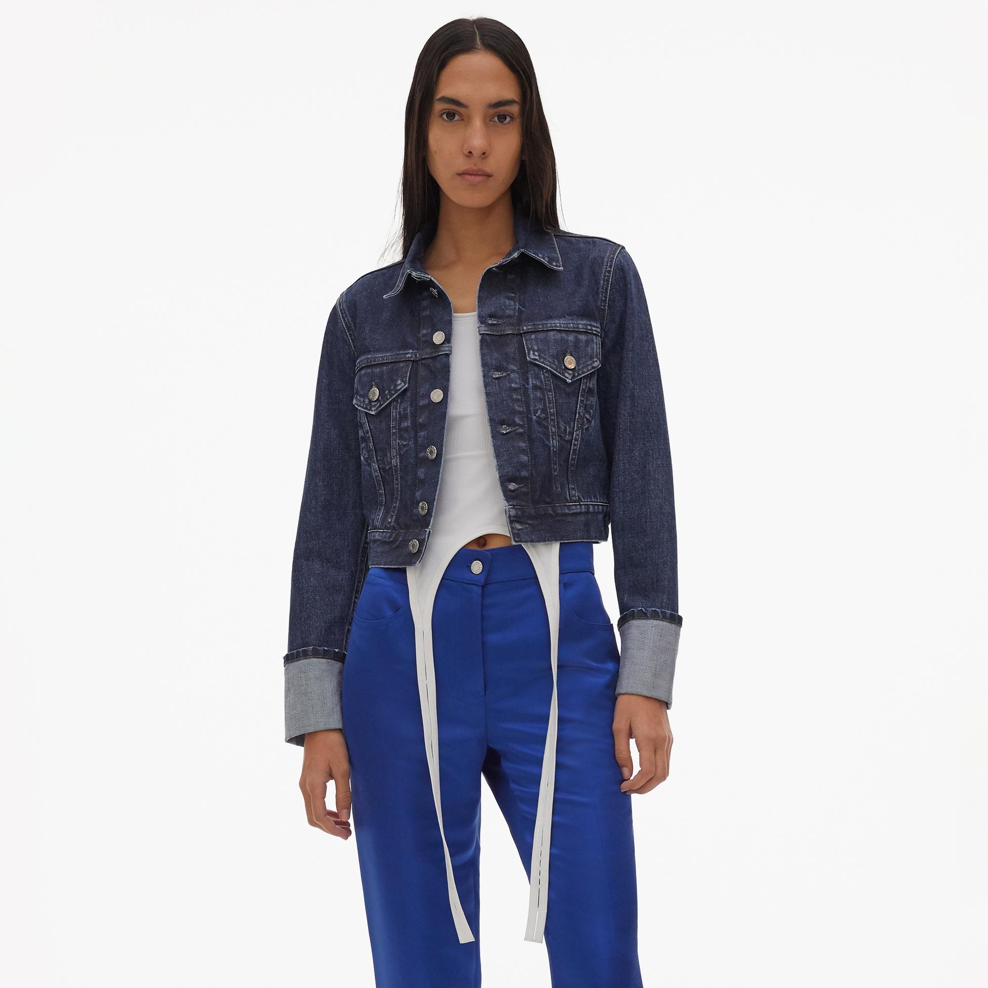 The Helmut Lang Fem Little Trucker Jacket in Dark Stone is a waisted cotton denim jacket