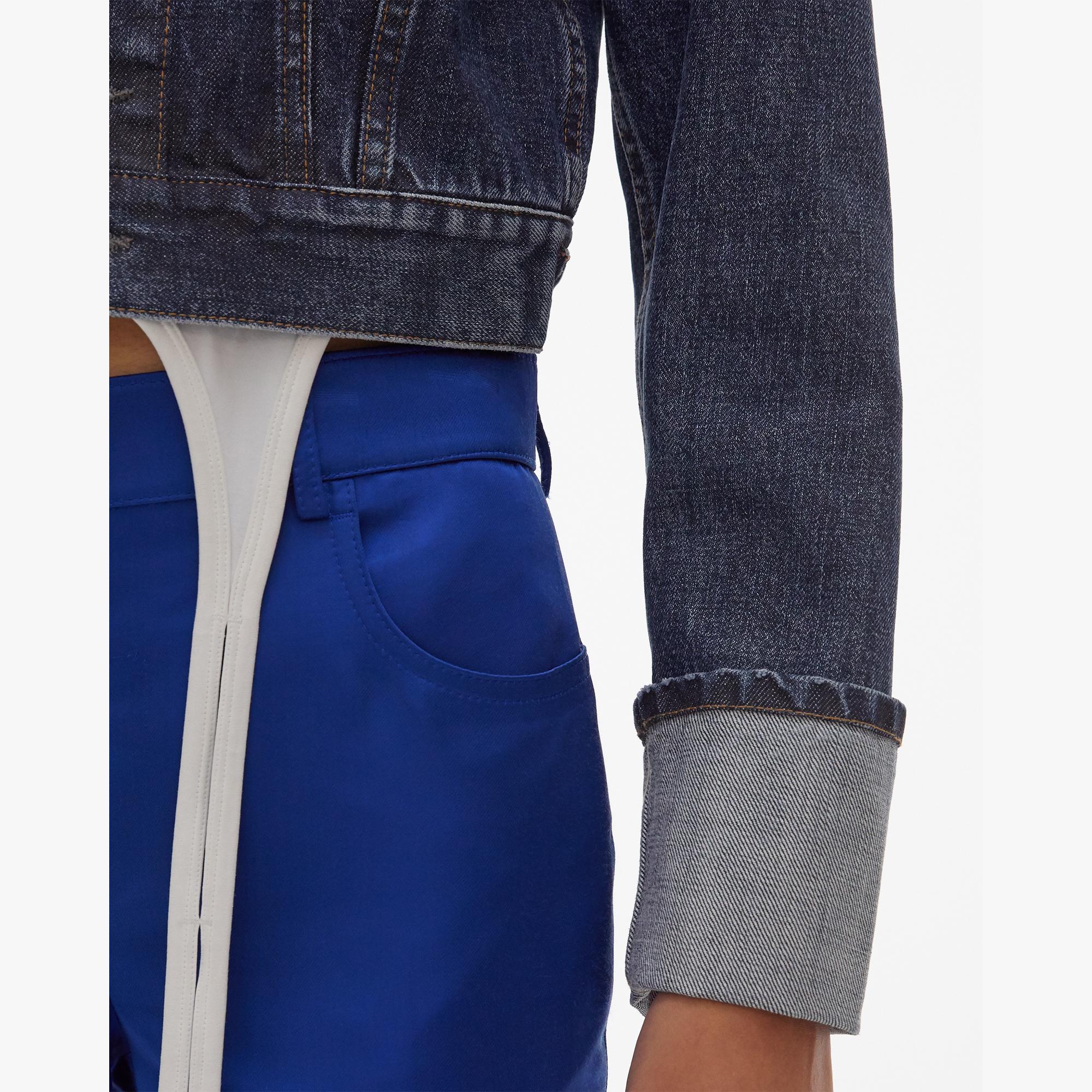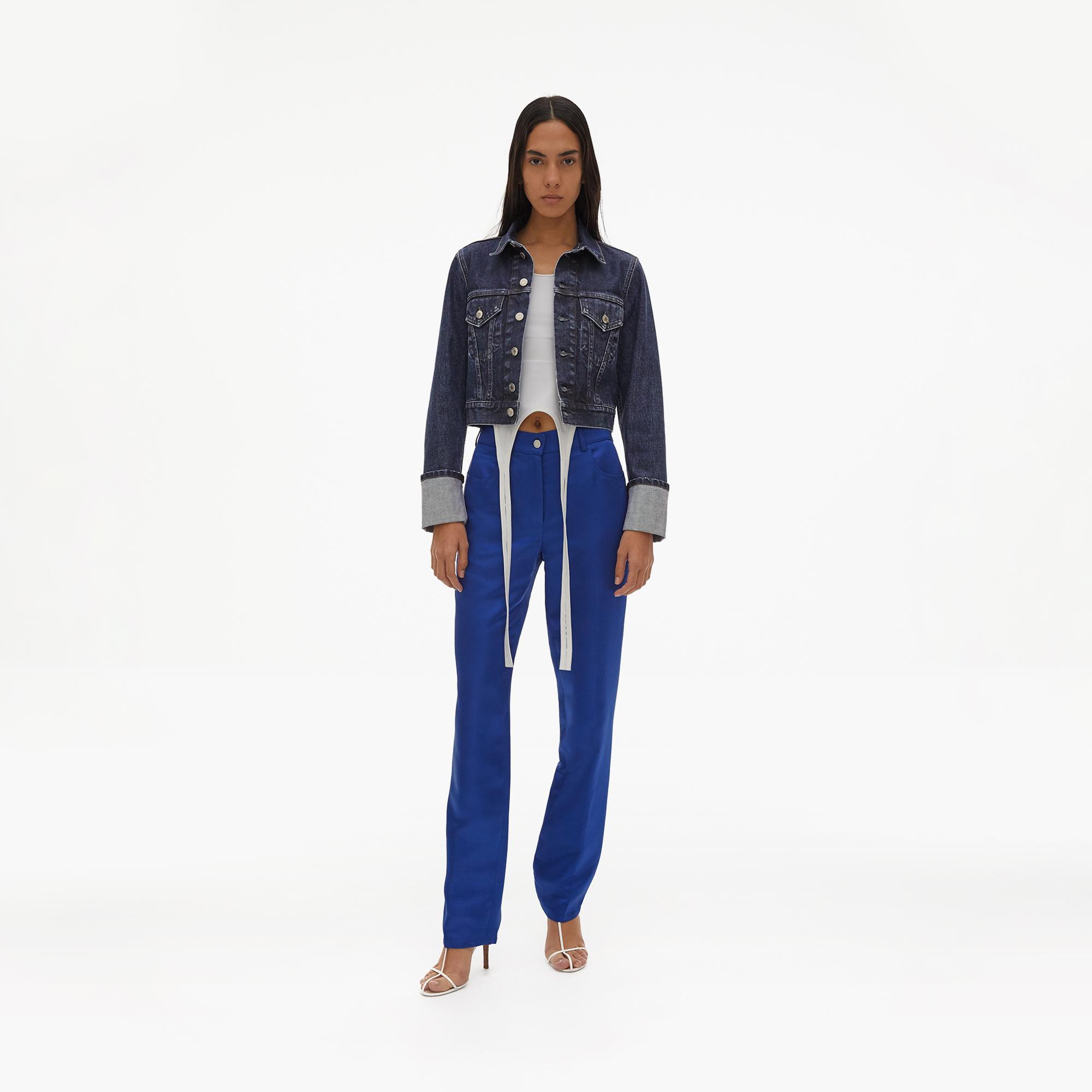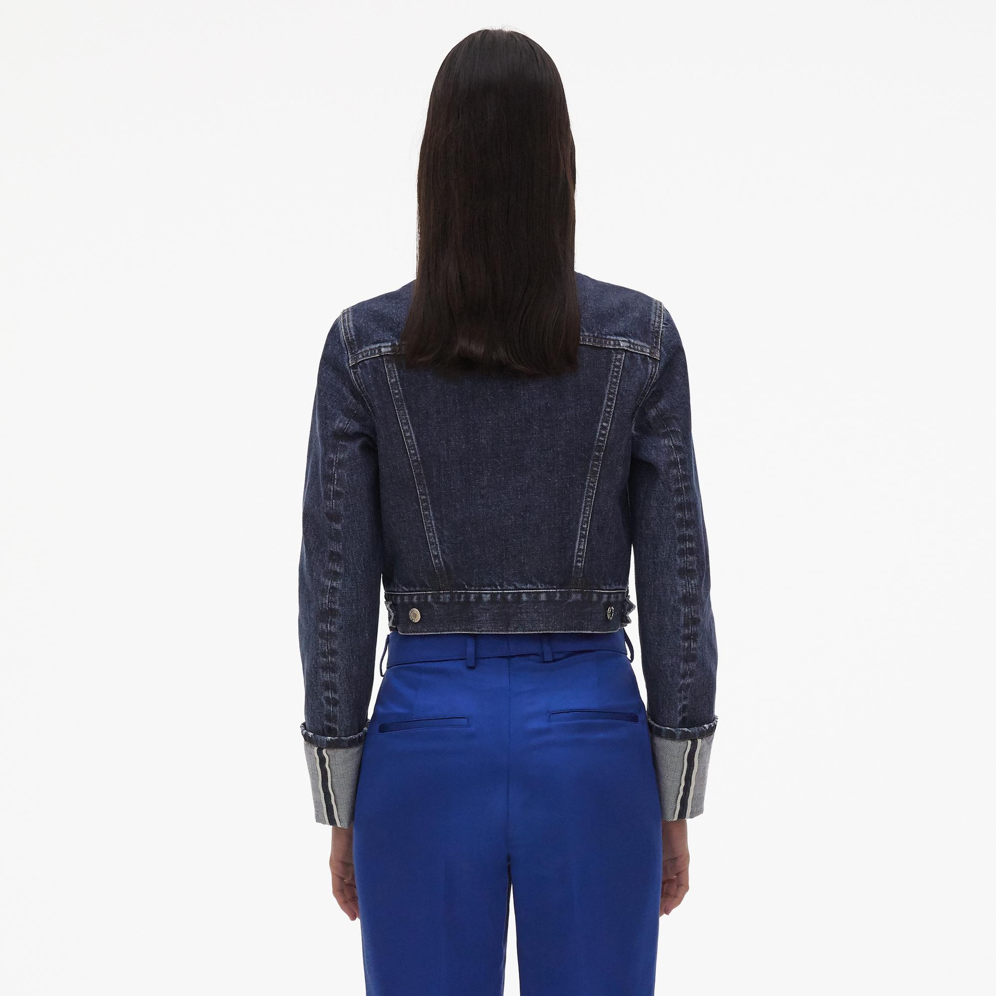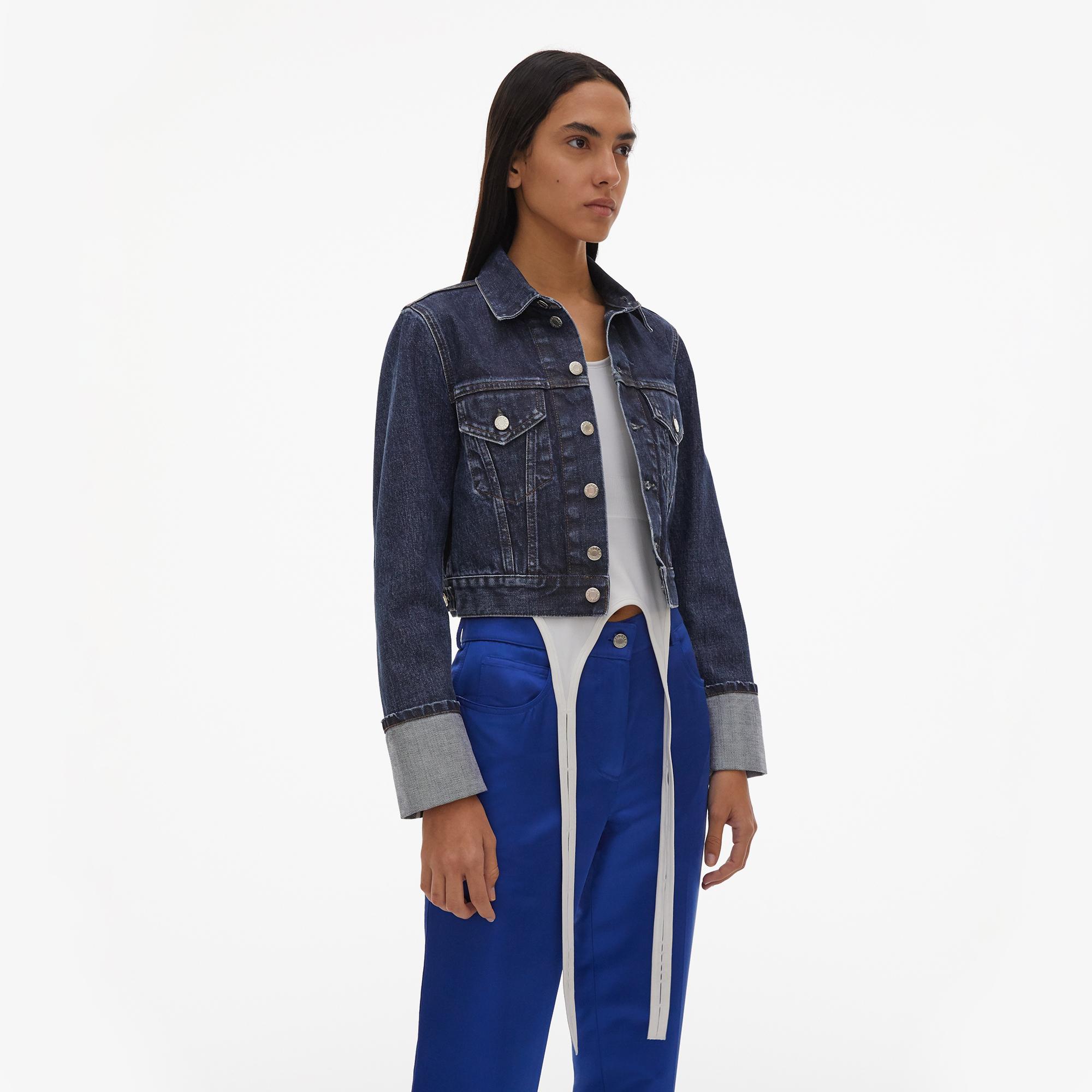 The Helmut Lang Fem Little Trucker Jacket in Dark Stone is a waisted cotton denim jacket
