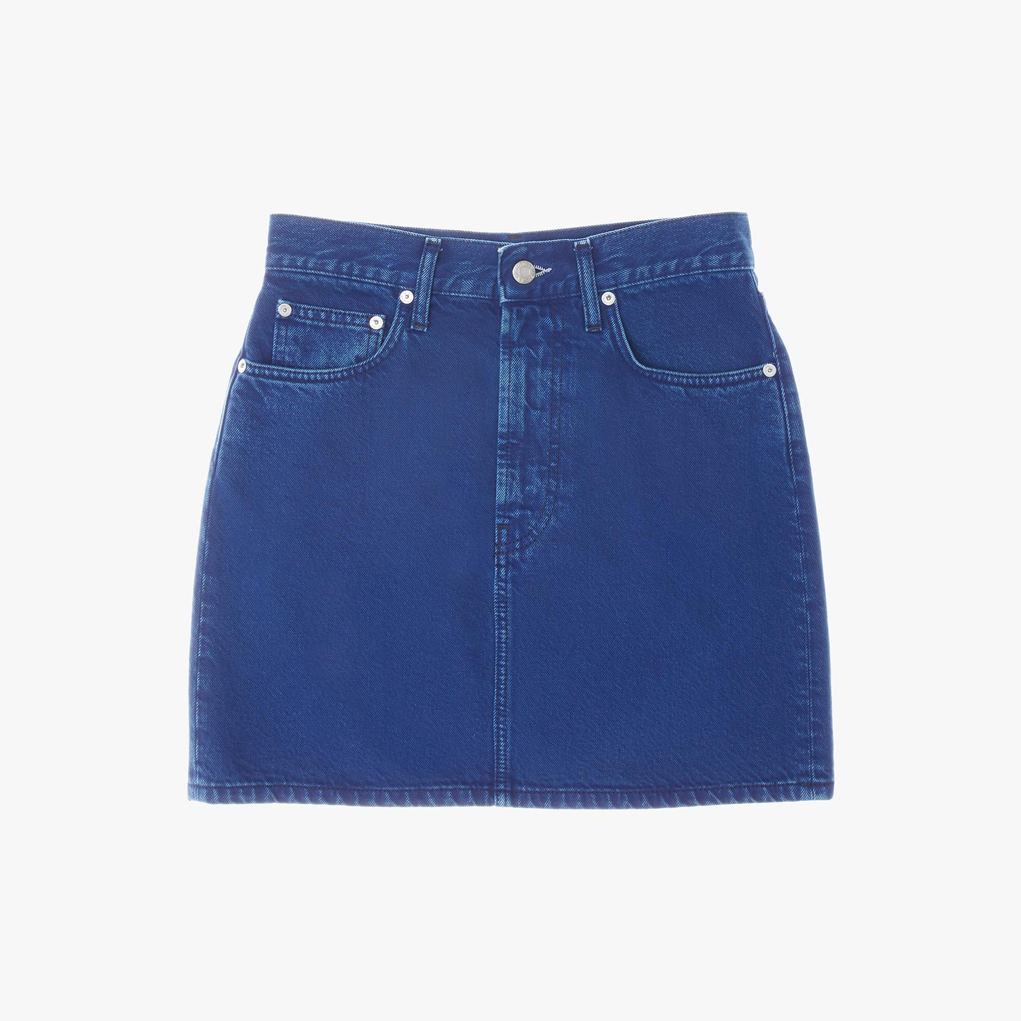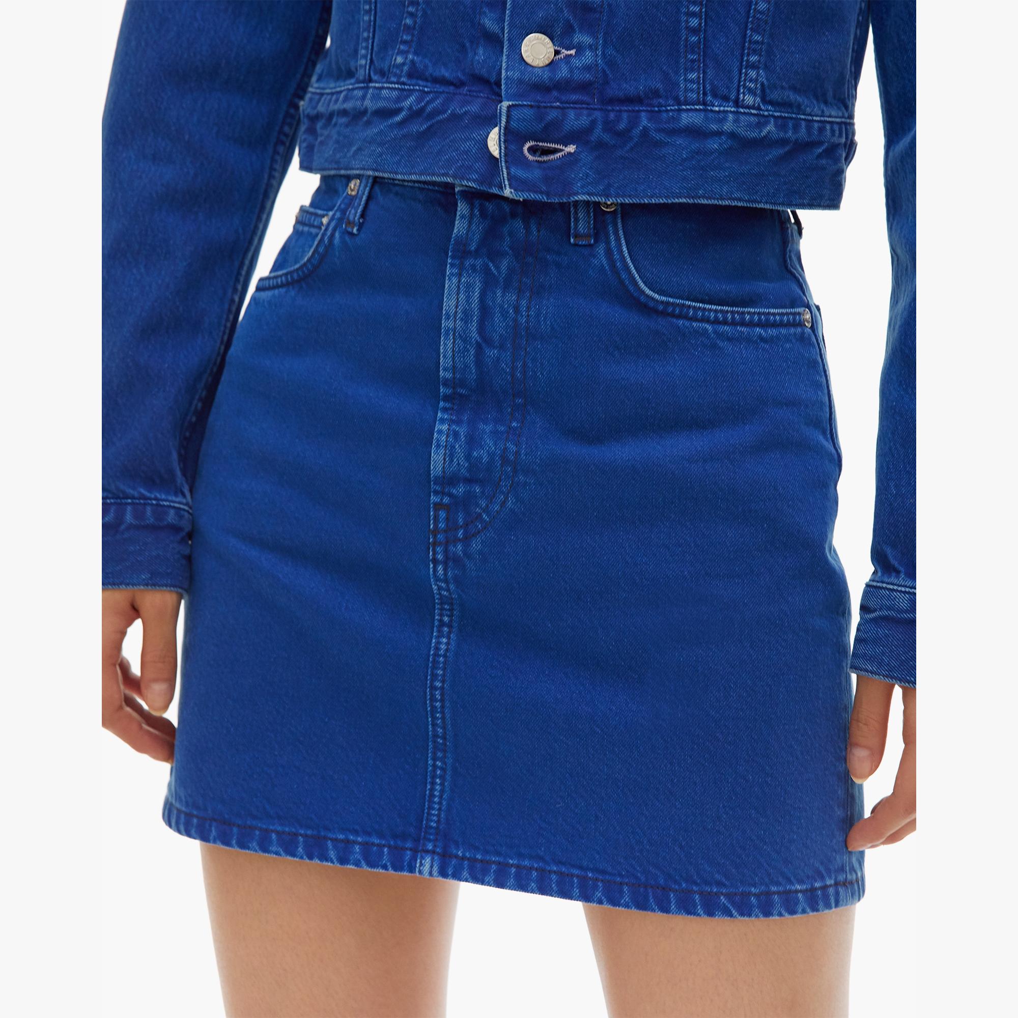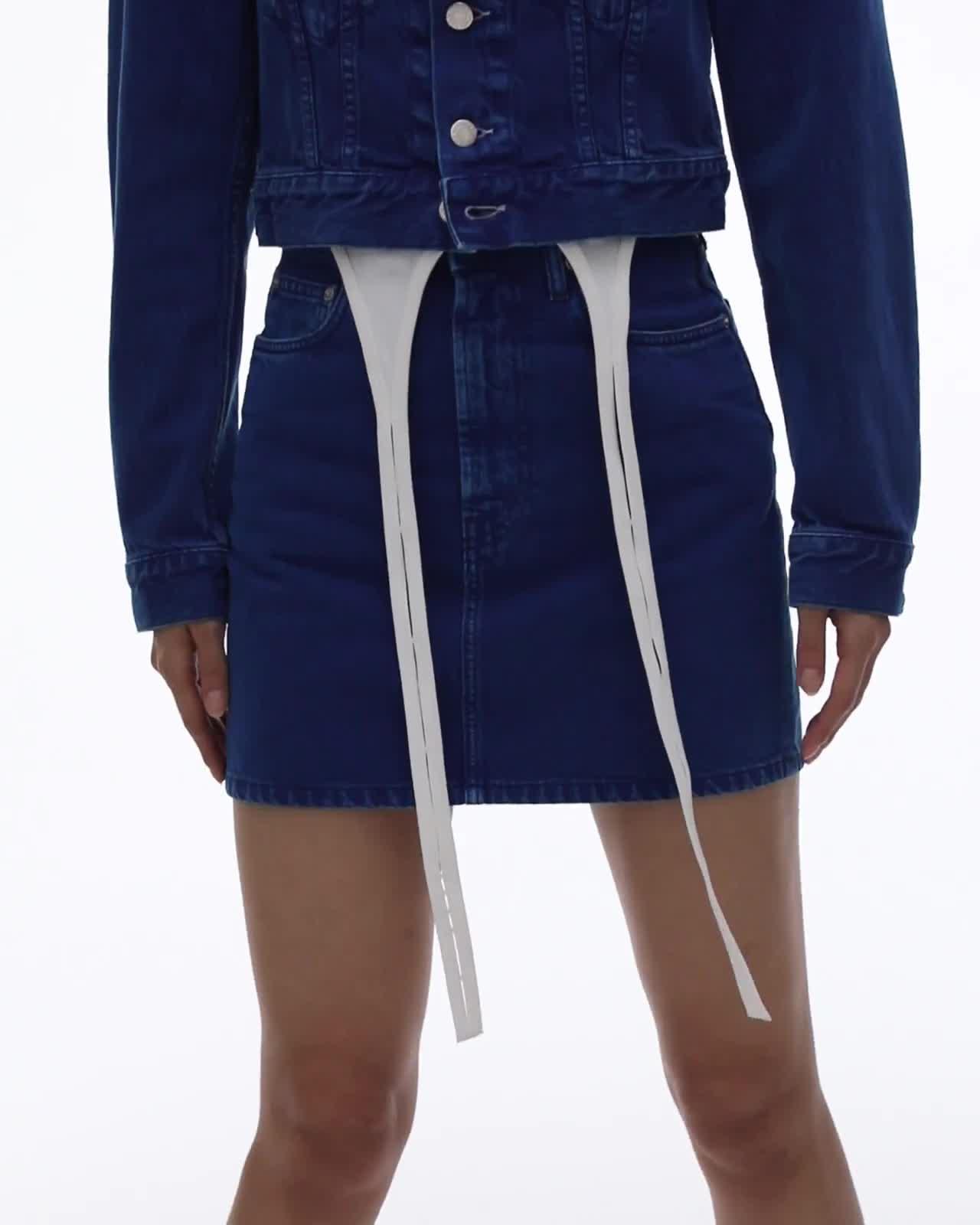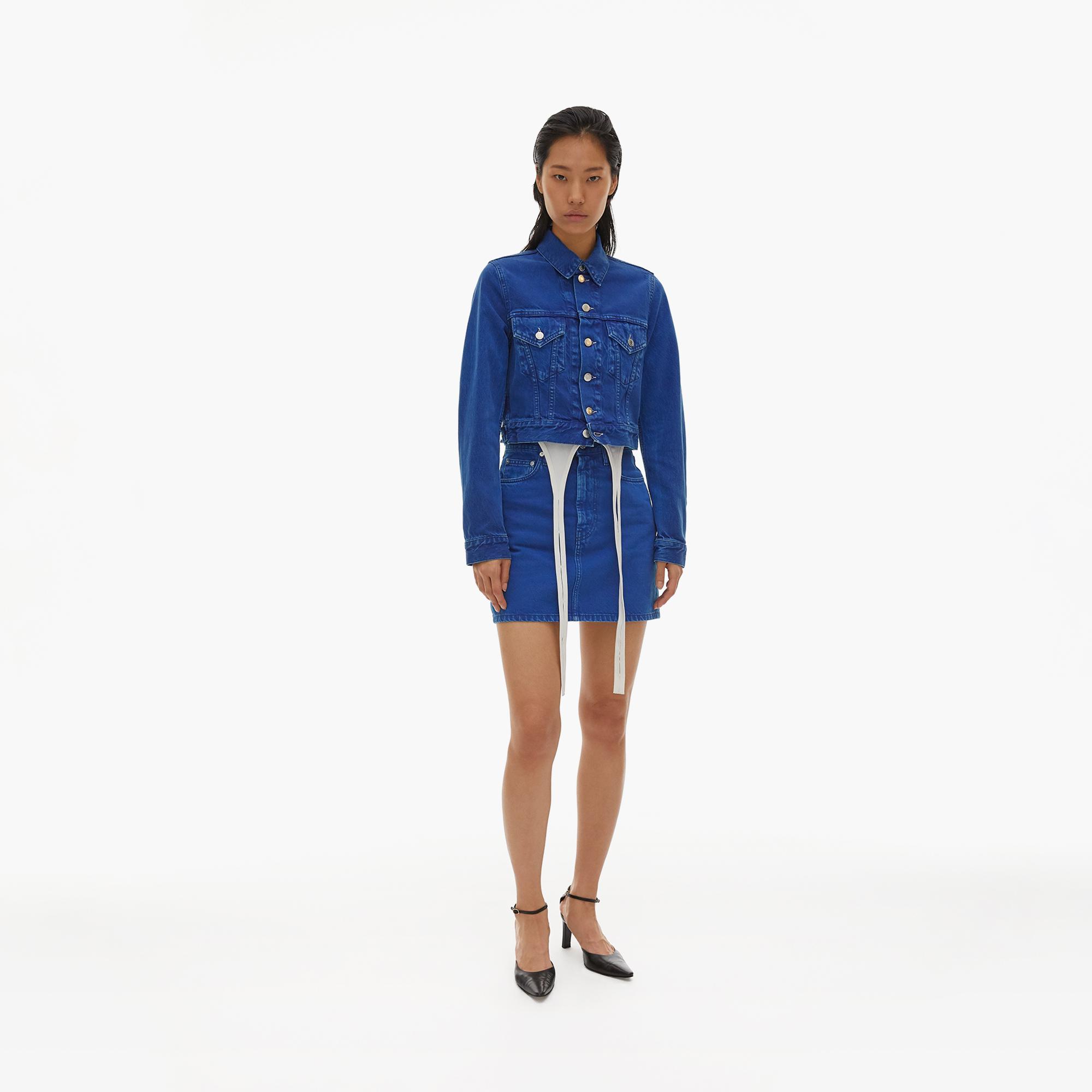 The Helmut Lang Femme Hi Mini in Azurite Stone is a high-waisted cotton denim miniskirt with denim-inspired details