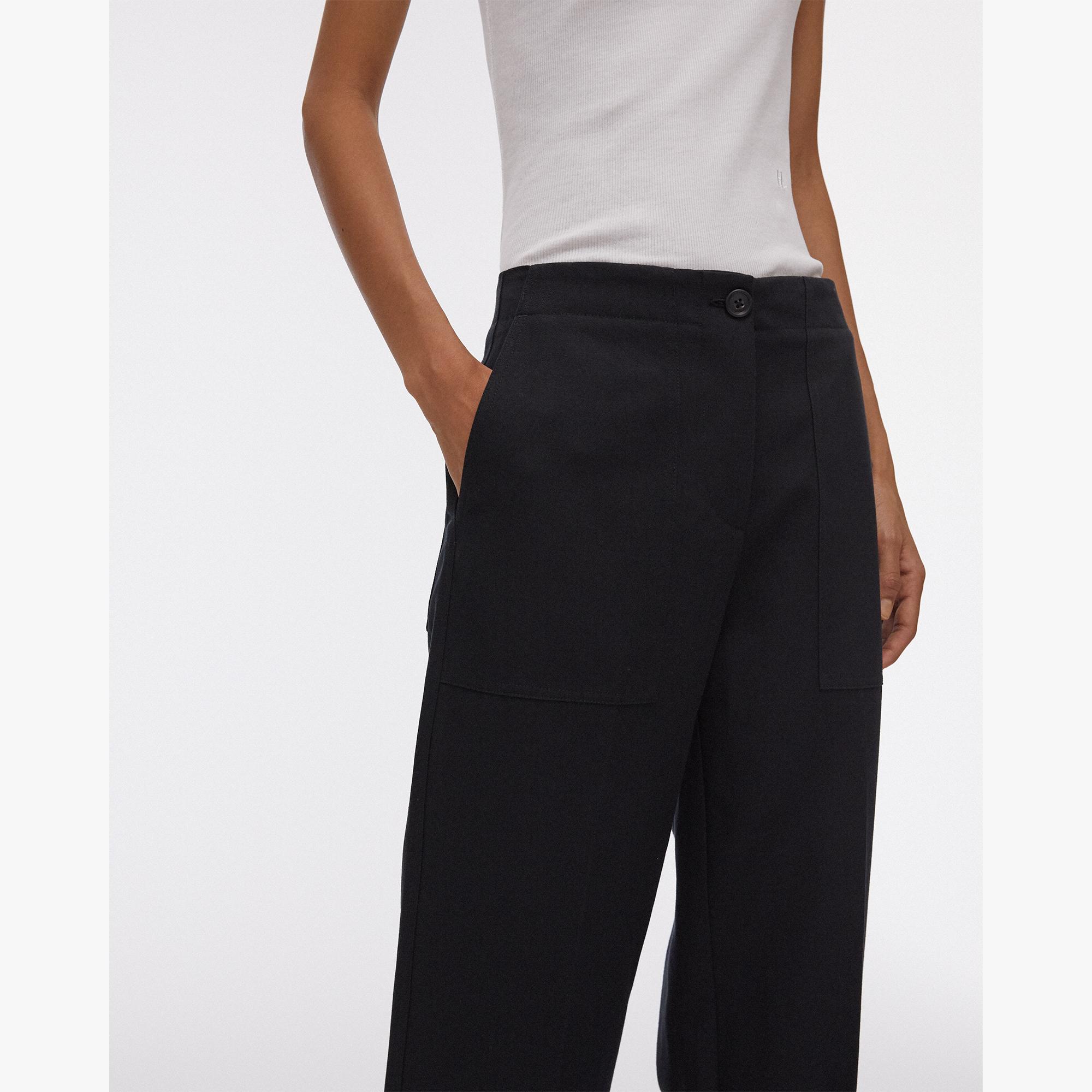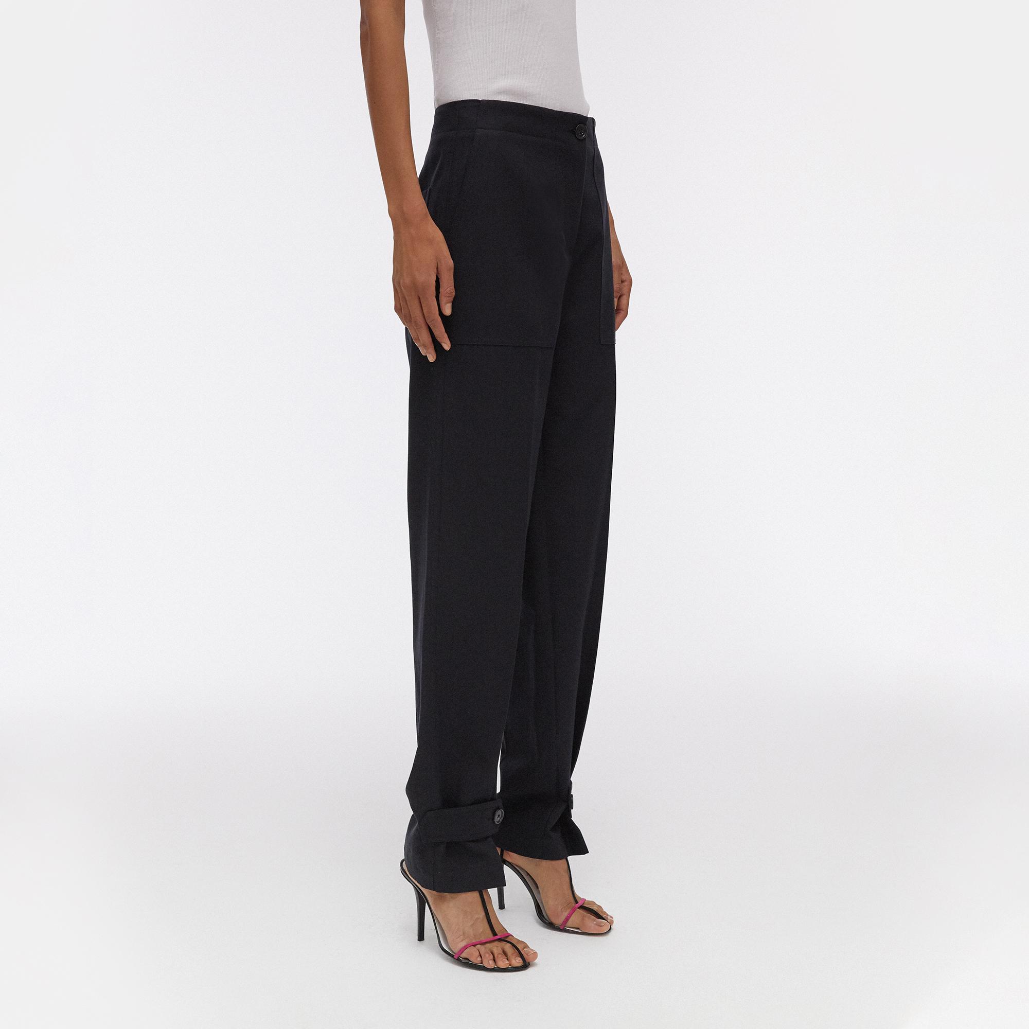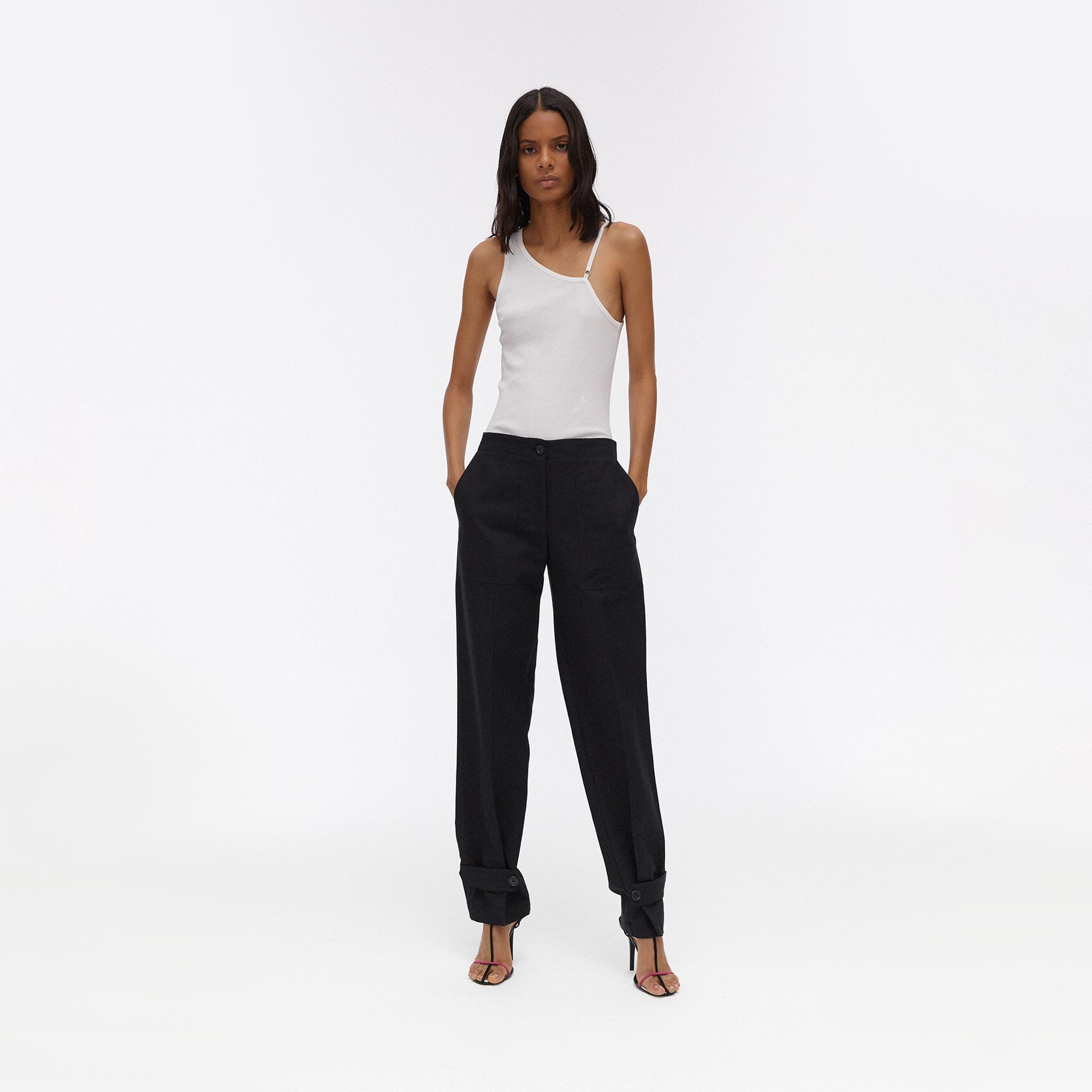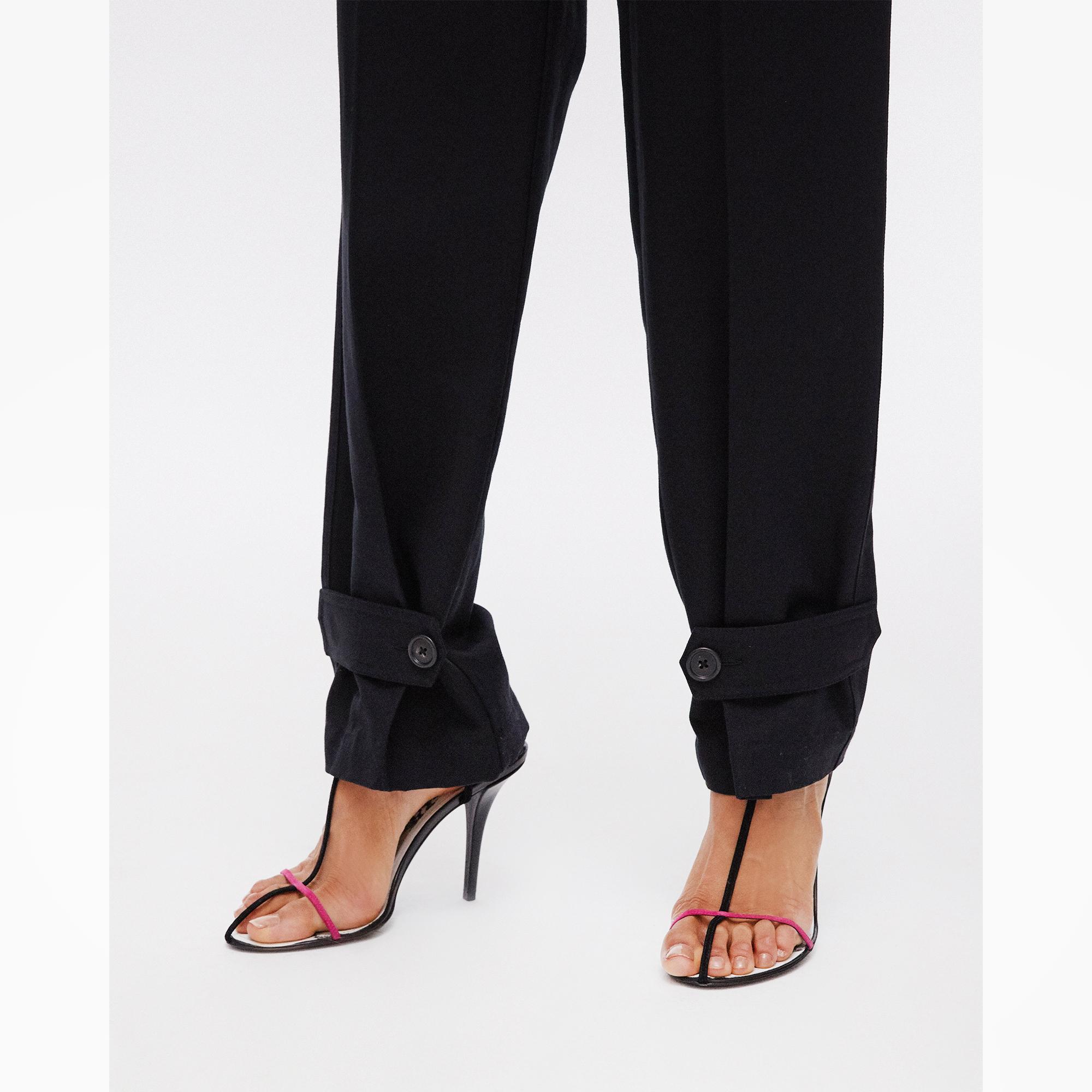 The Helmut Lang Linen Tabbed Leg Pant is a straight-leg pant with button closure straps at the hem