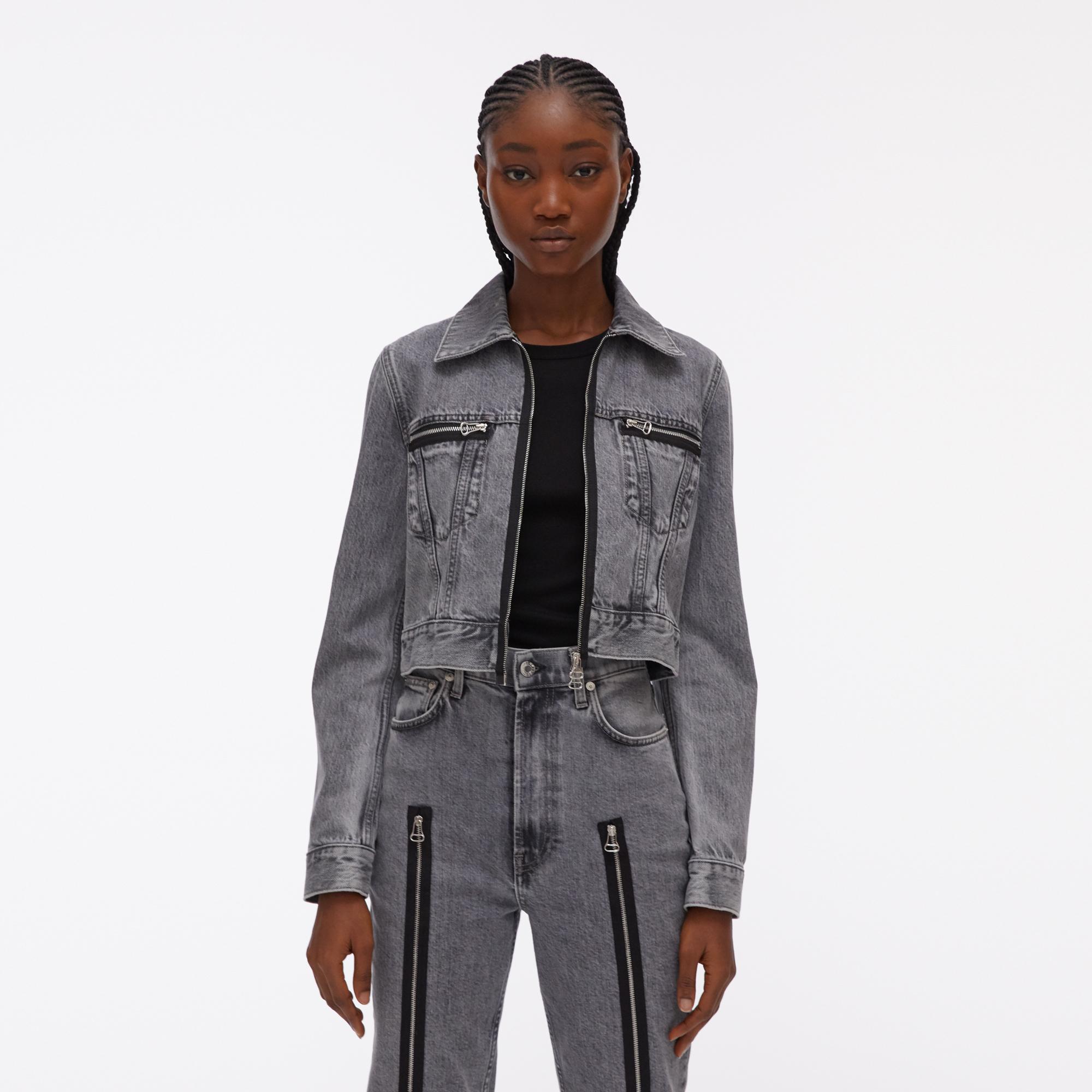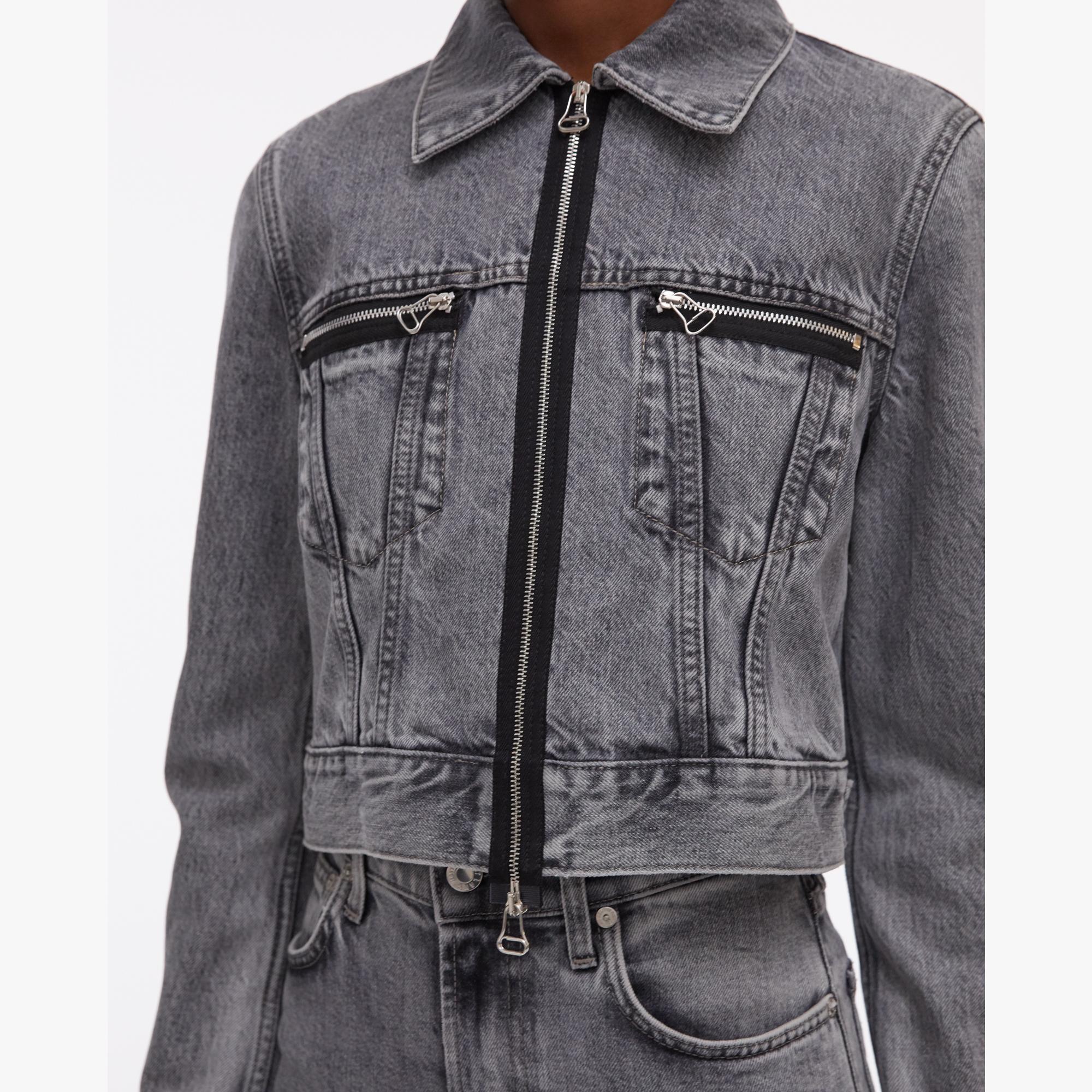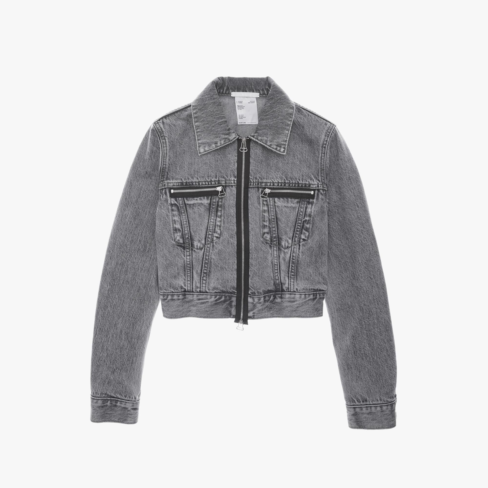 The Helmut Lang Cropped Femme Trucker Jean Jacket is a denim jacket with an exaggerated collar and zip front