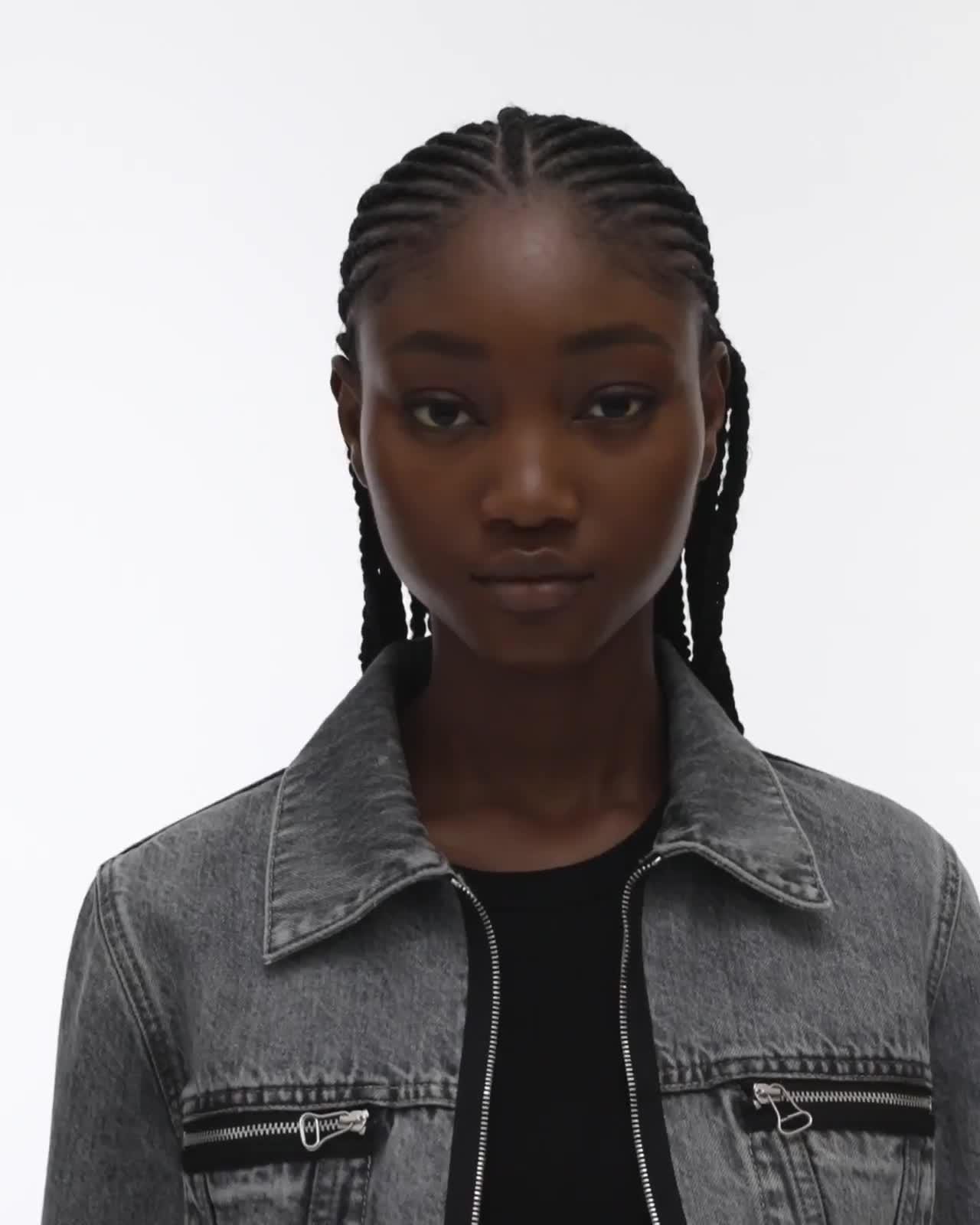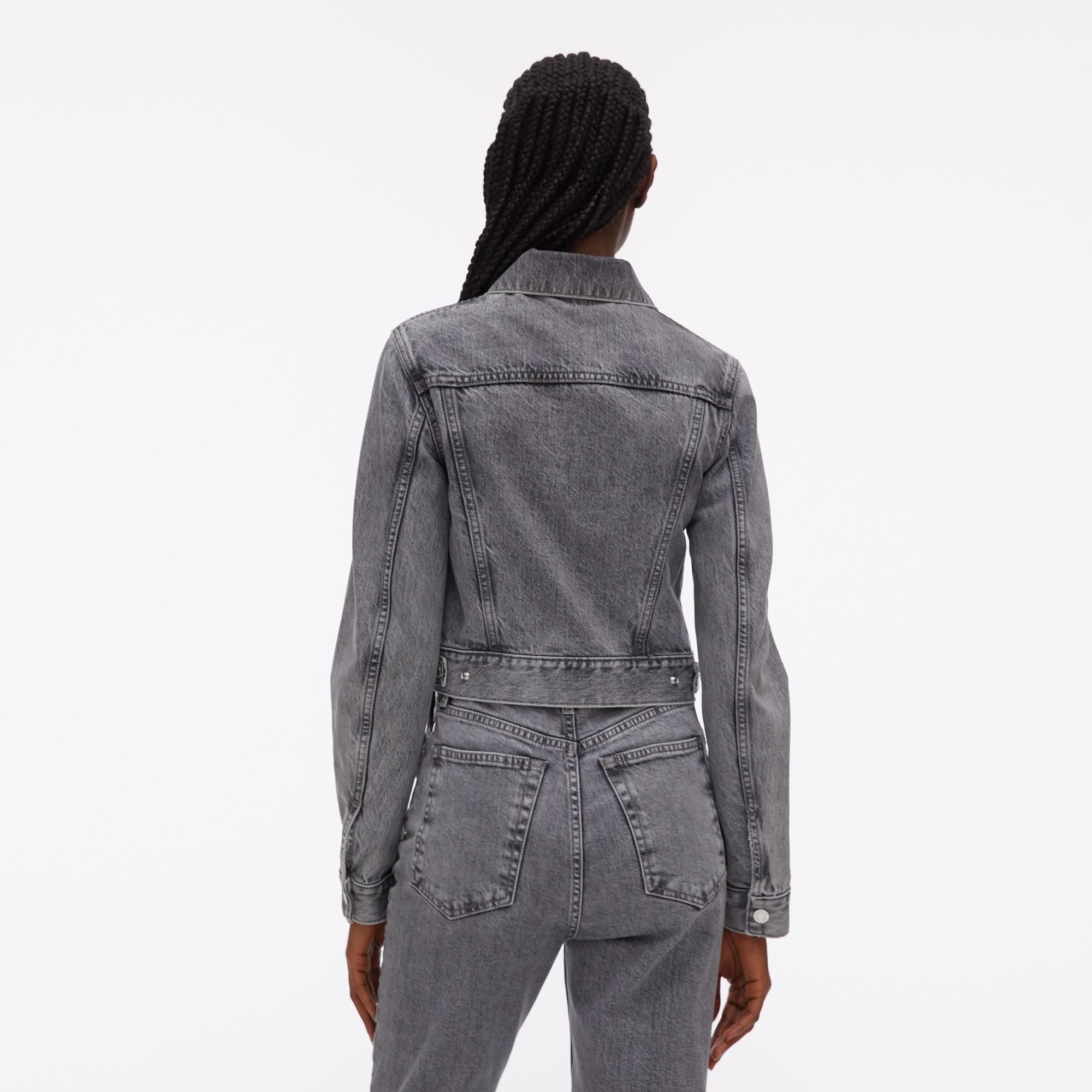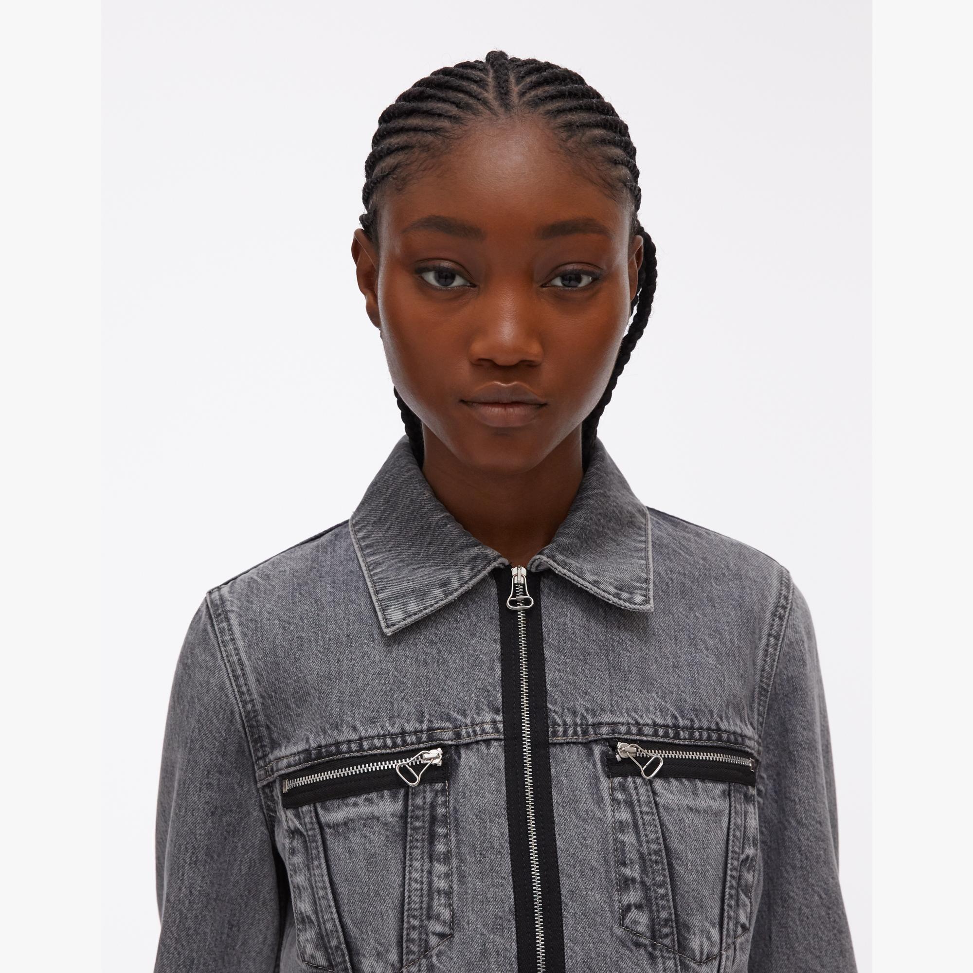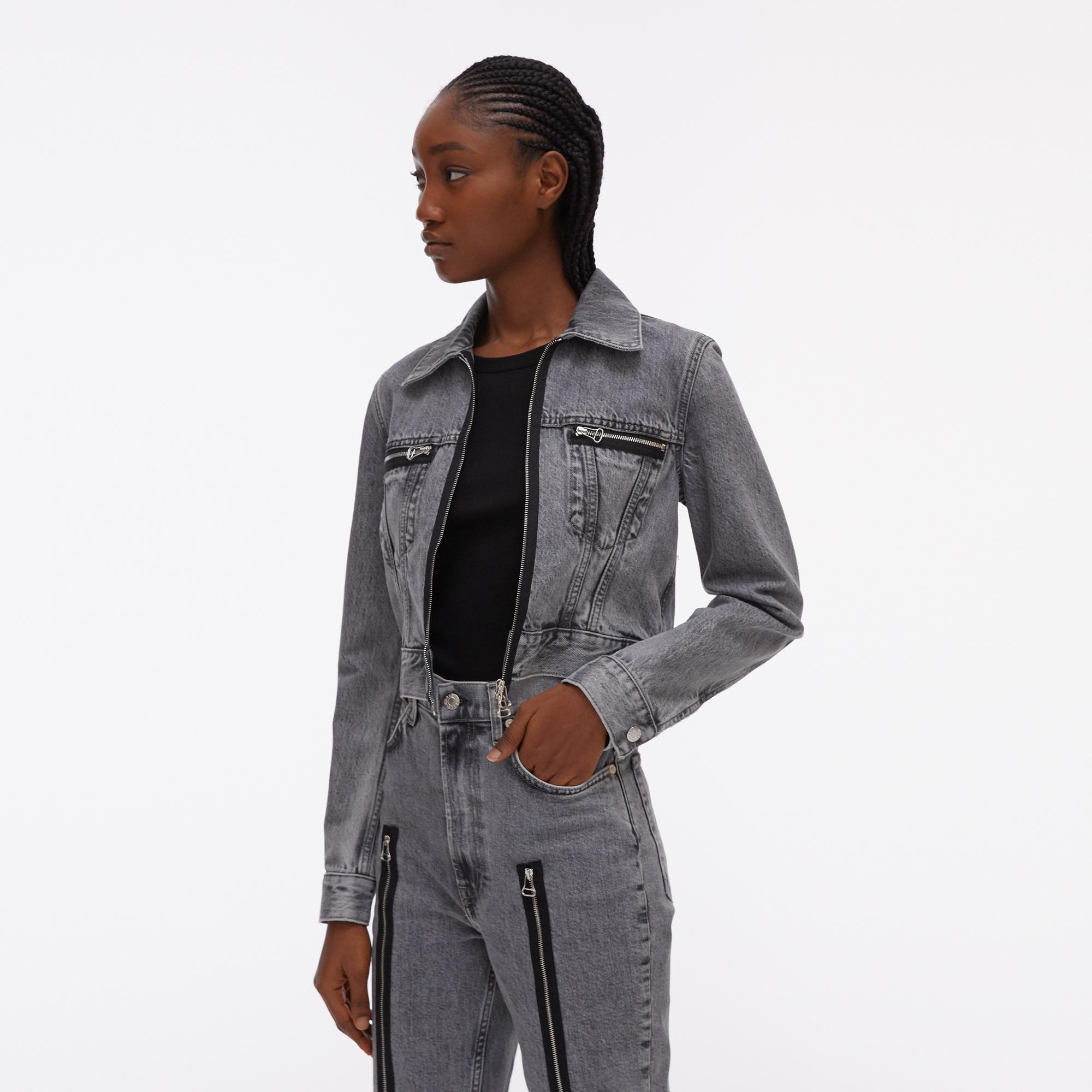 The Helmut Lang Cropped Femme Trucker Jean Jacket is a denim jacket with an exaggerated collar and zip front