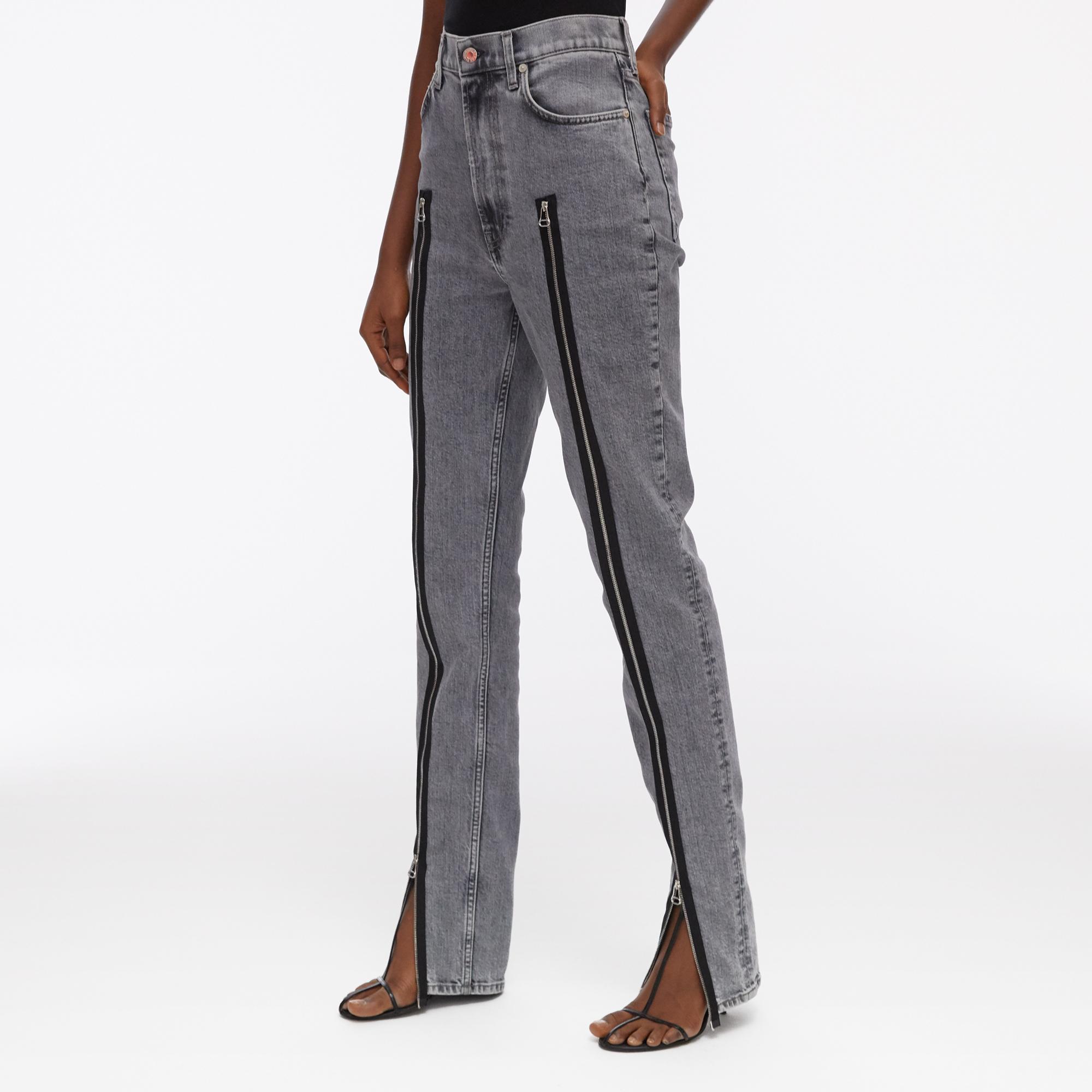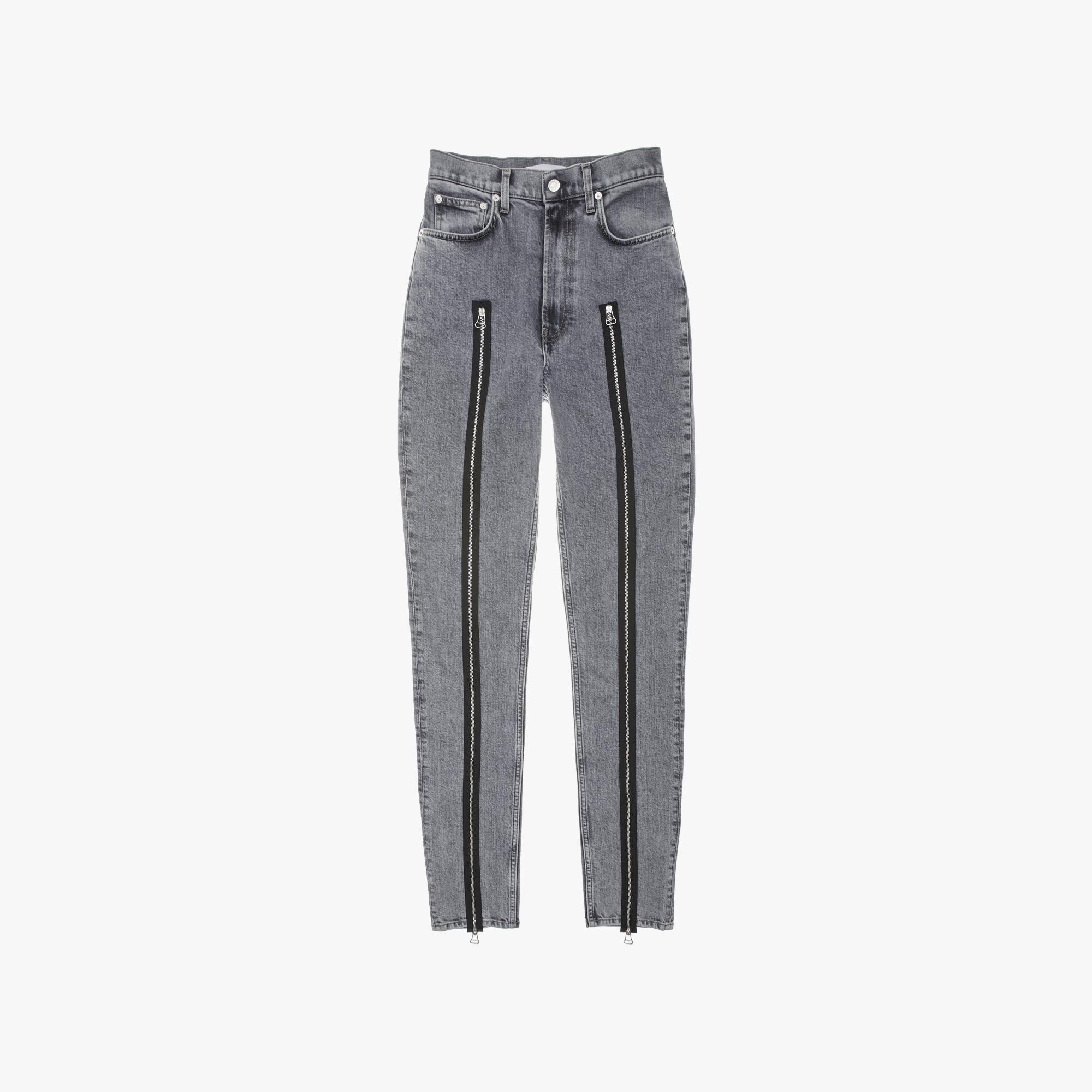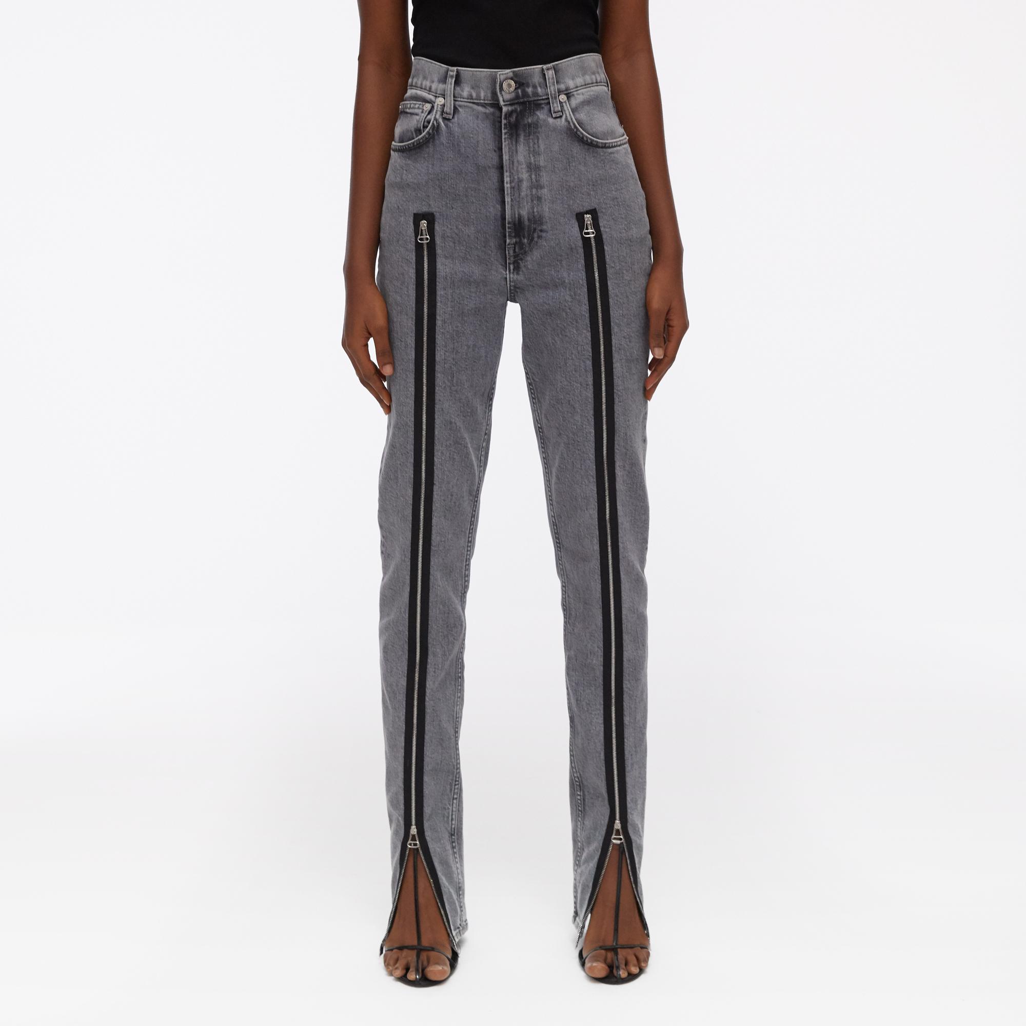 The Helmut Lang Zippered Femme Hi Spikes Jeans are cotton denim jeans with a high rise, slim-straight leg, and zippered front detailing