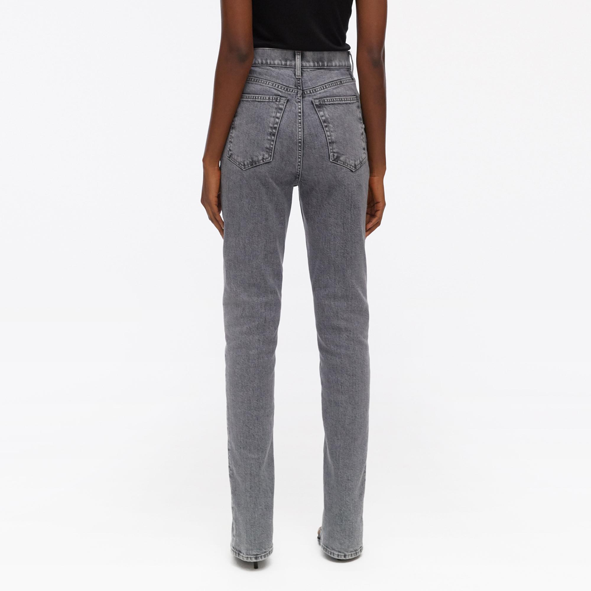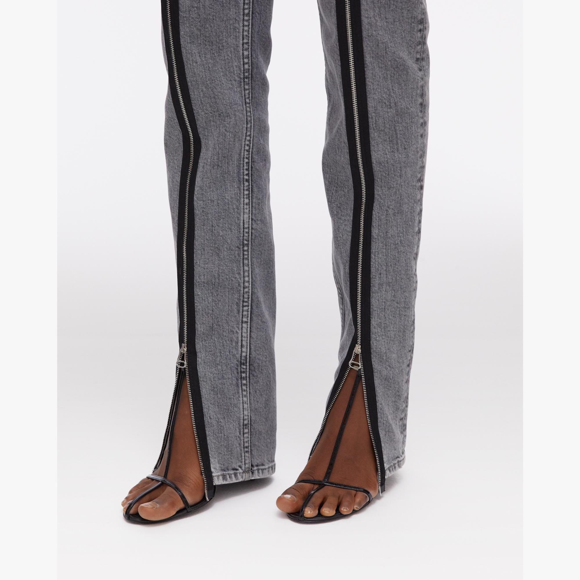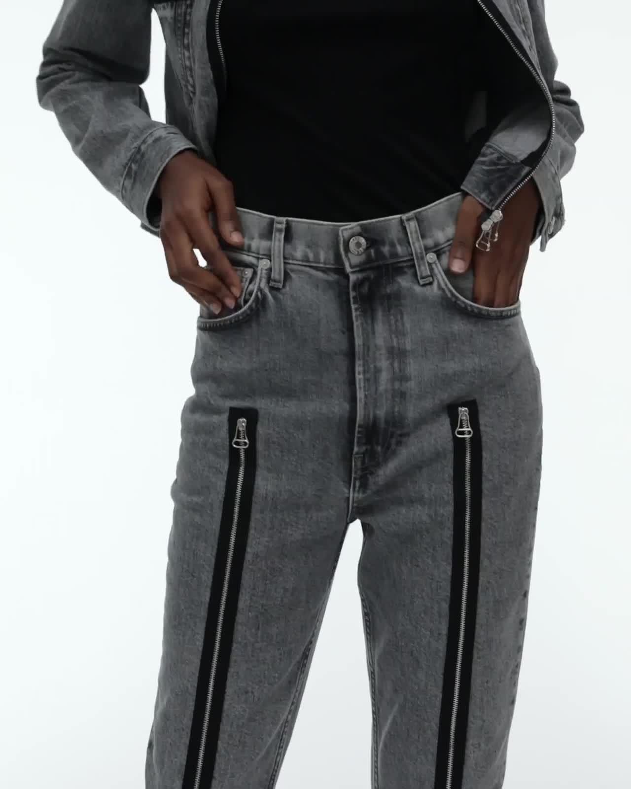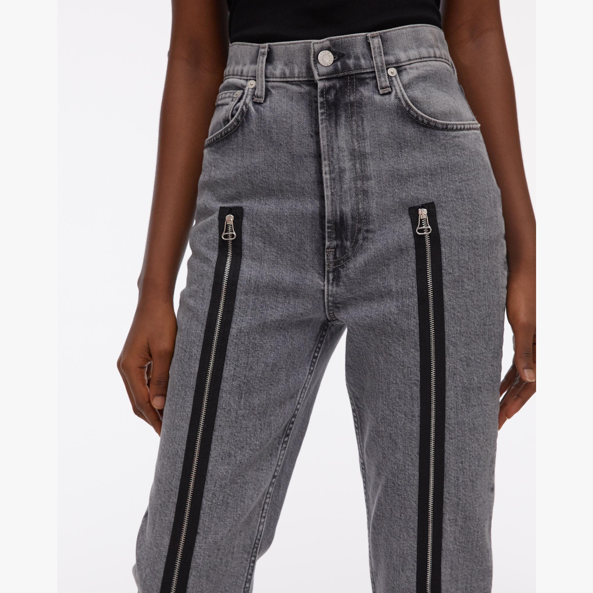 The Helmut Lang Zippered Femme Hi Spikes Jeans are cotton denim jeans with a high rise, slim-straight leg, and zippered front detailing