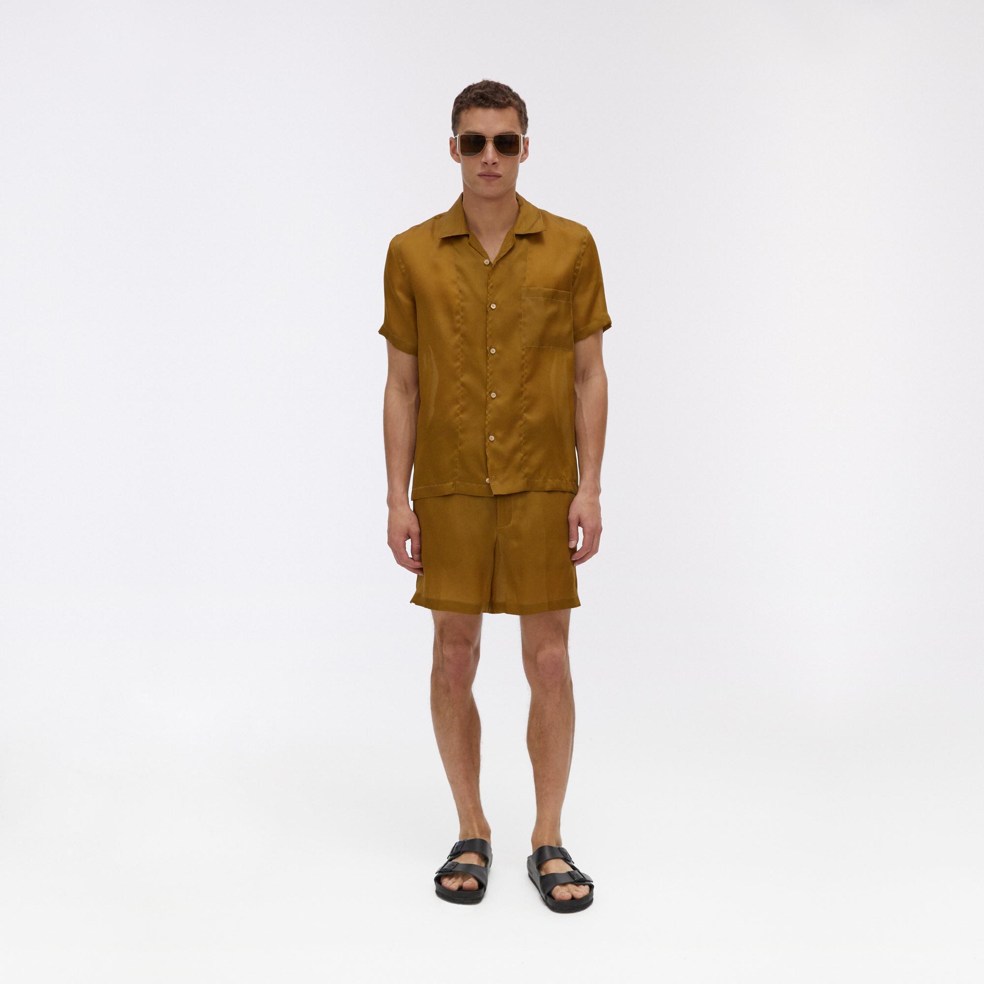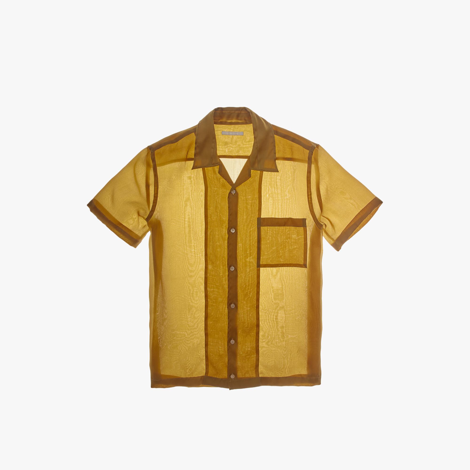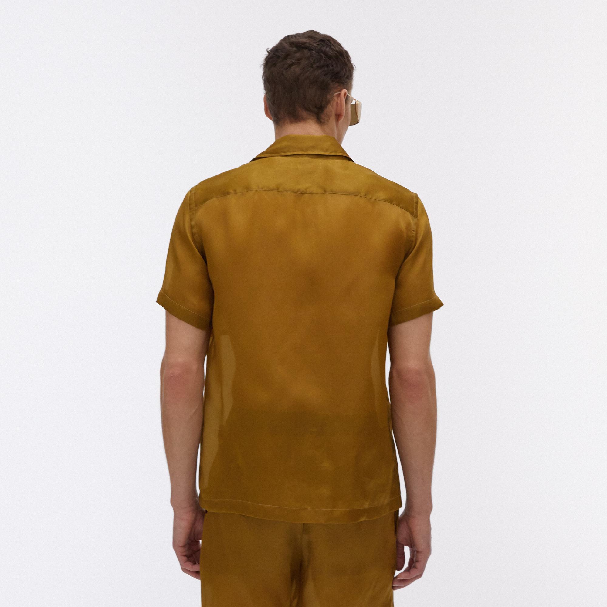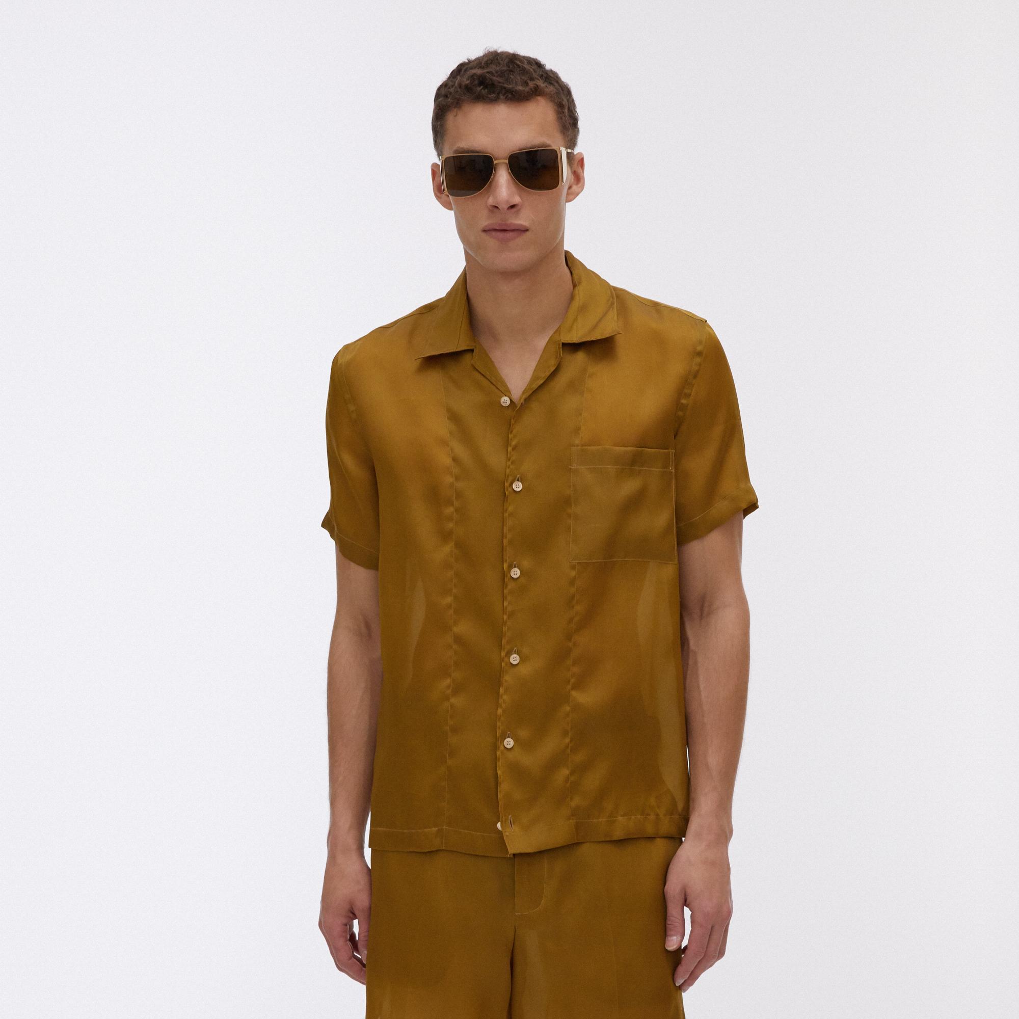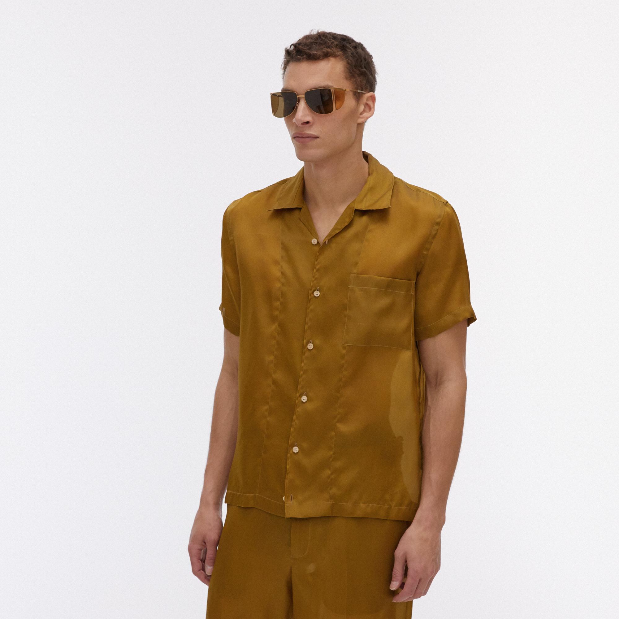 The Helmut Lang Satin Organza Shirt is a Silk Satin button-front short-sleeve shirt with a collar and front pocket