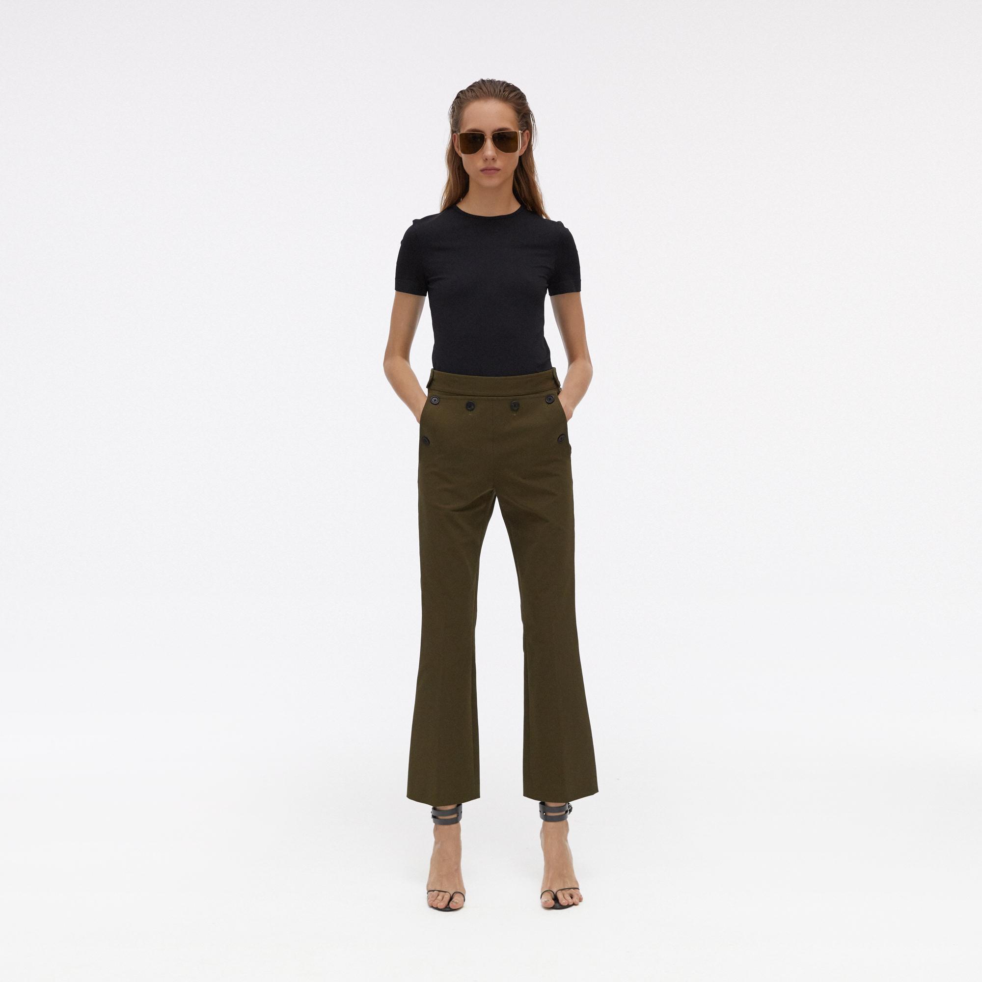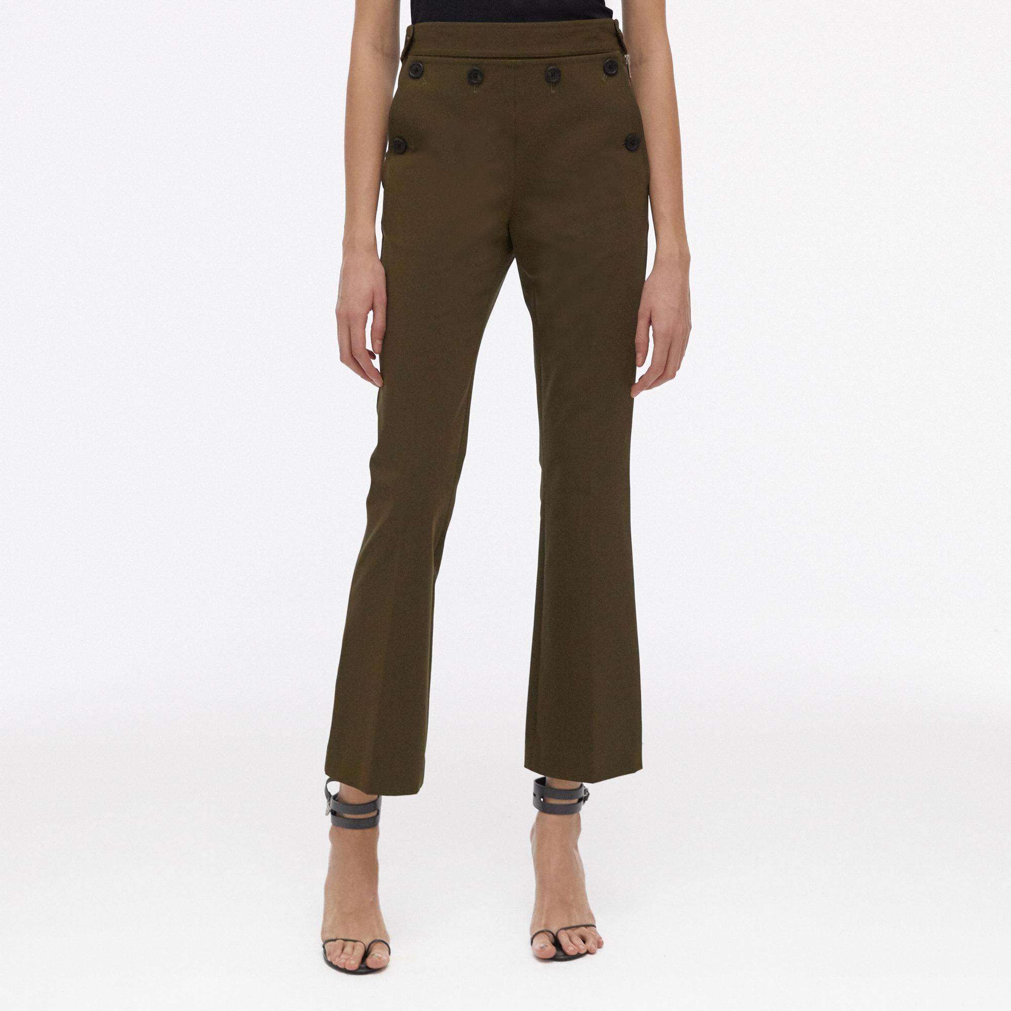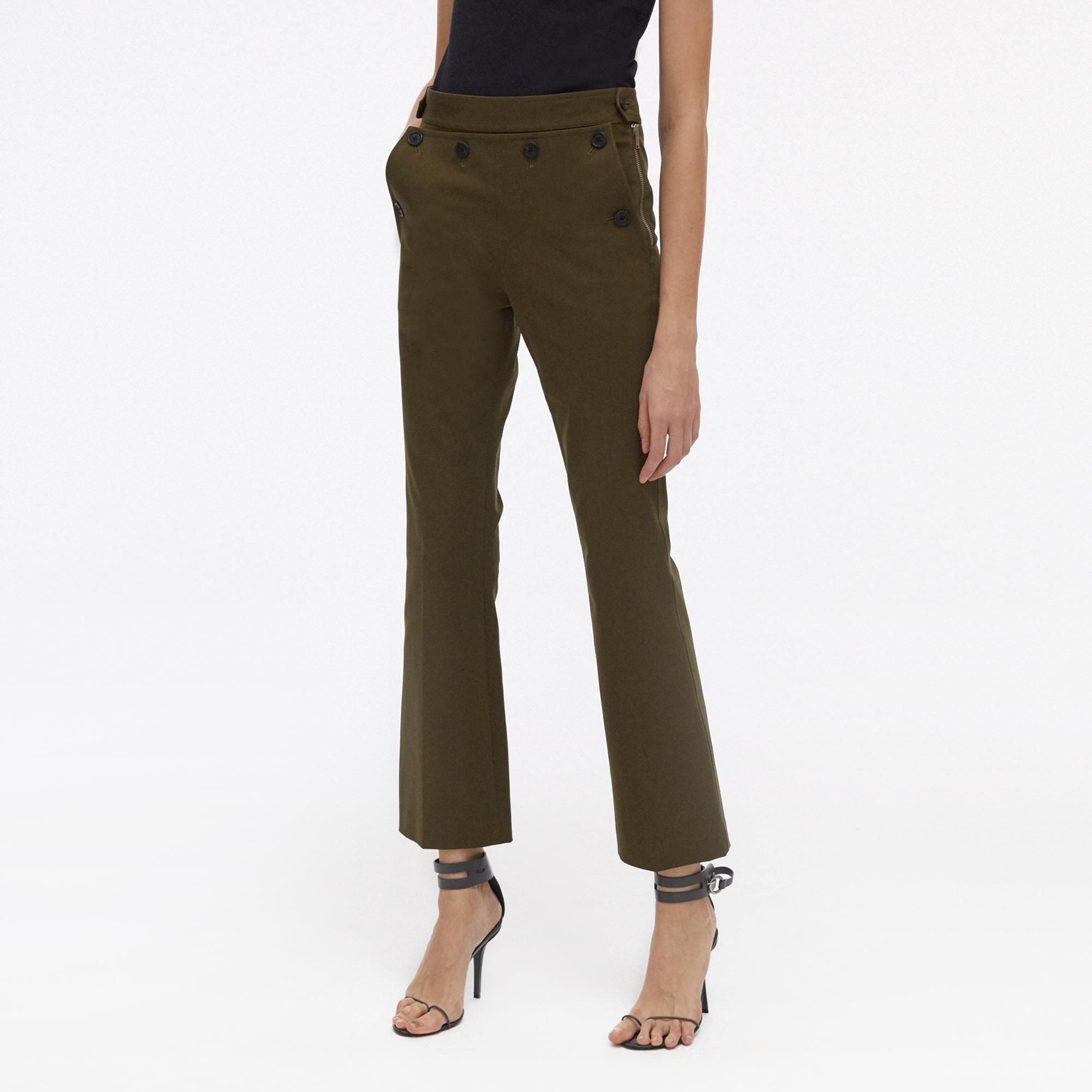 The Helmut Lang Rider Crop Pant is a cotton blend dress pant with button details and a subtle kick flare