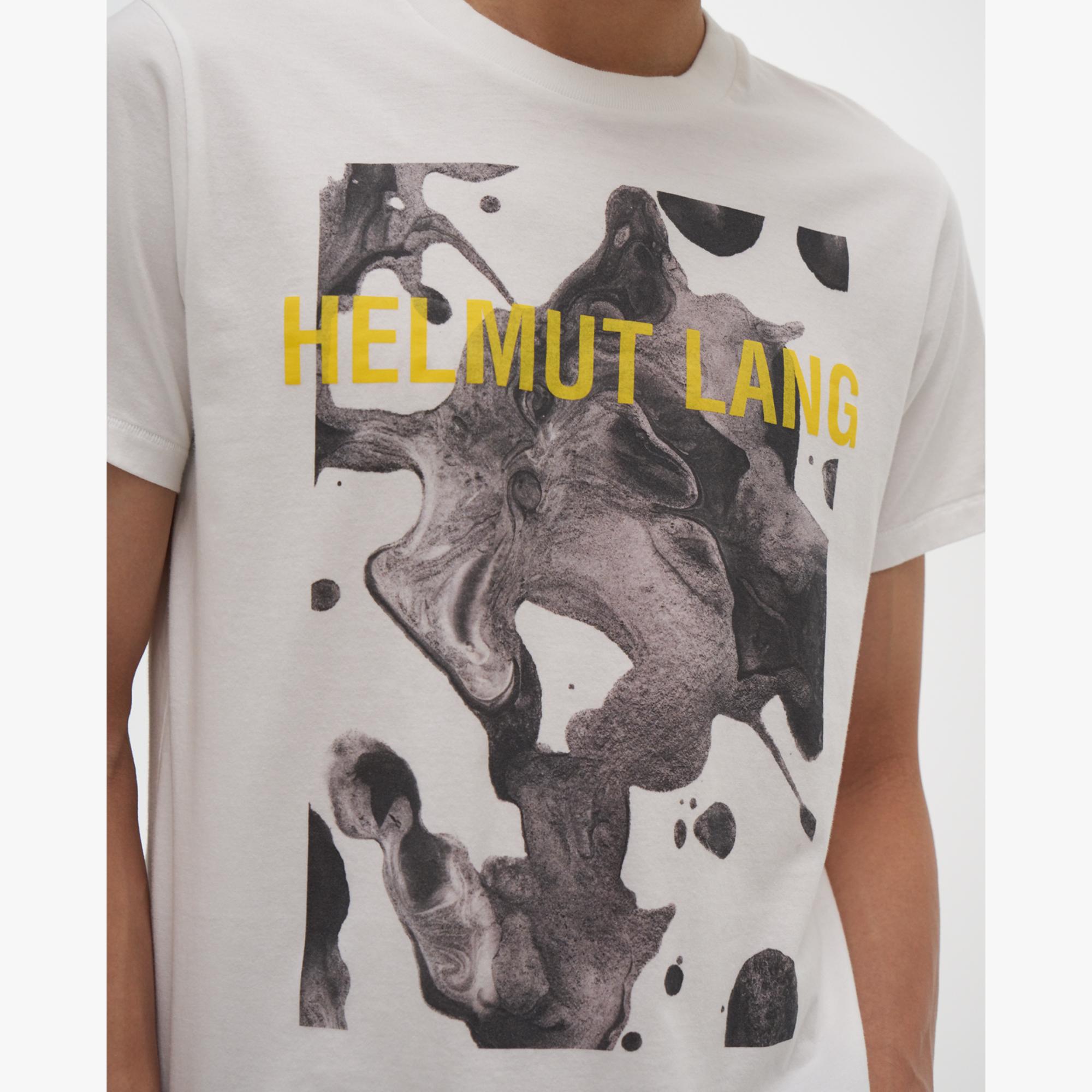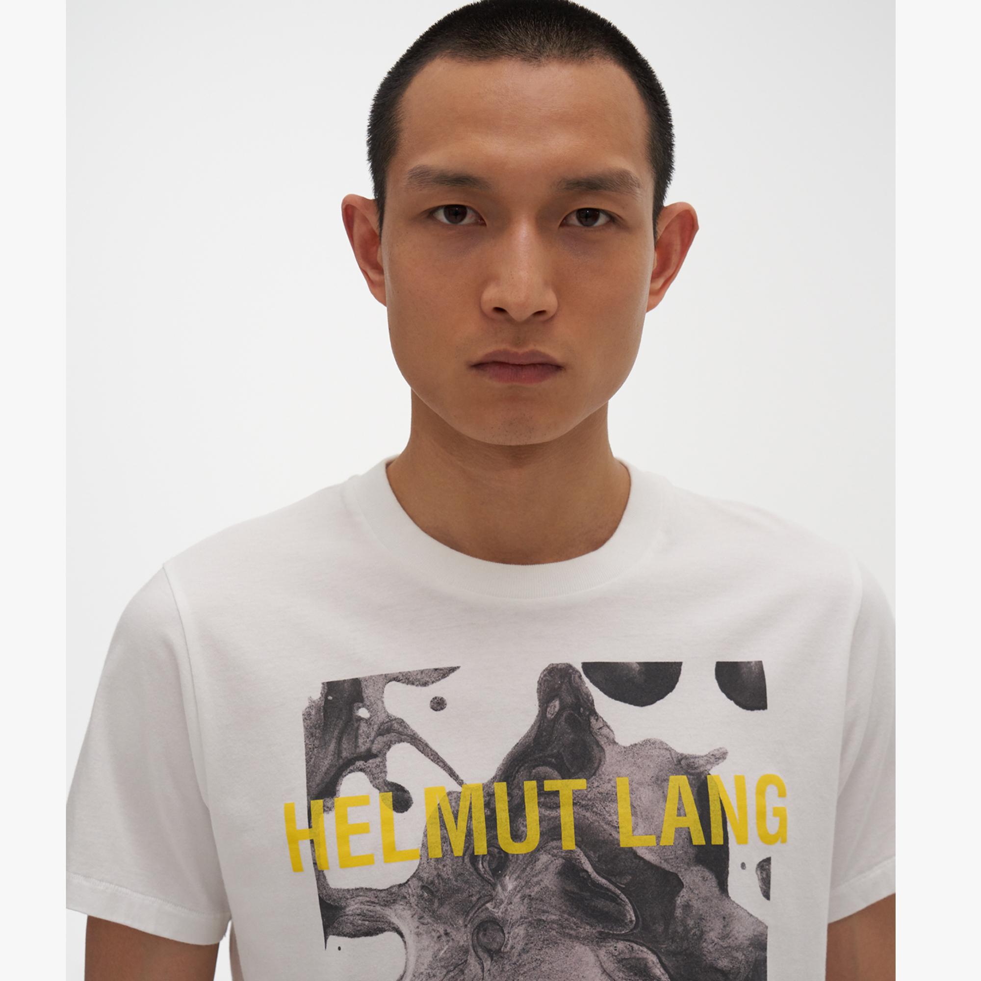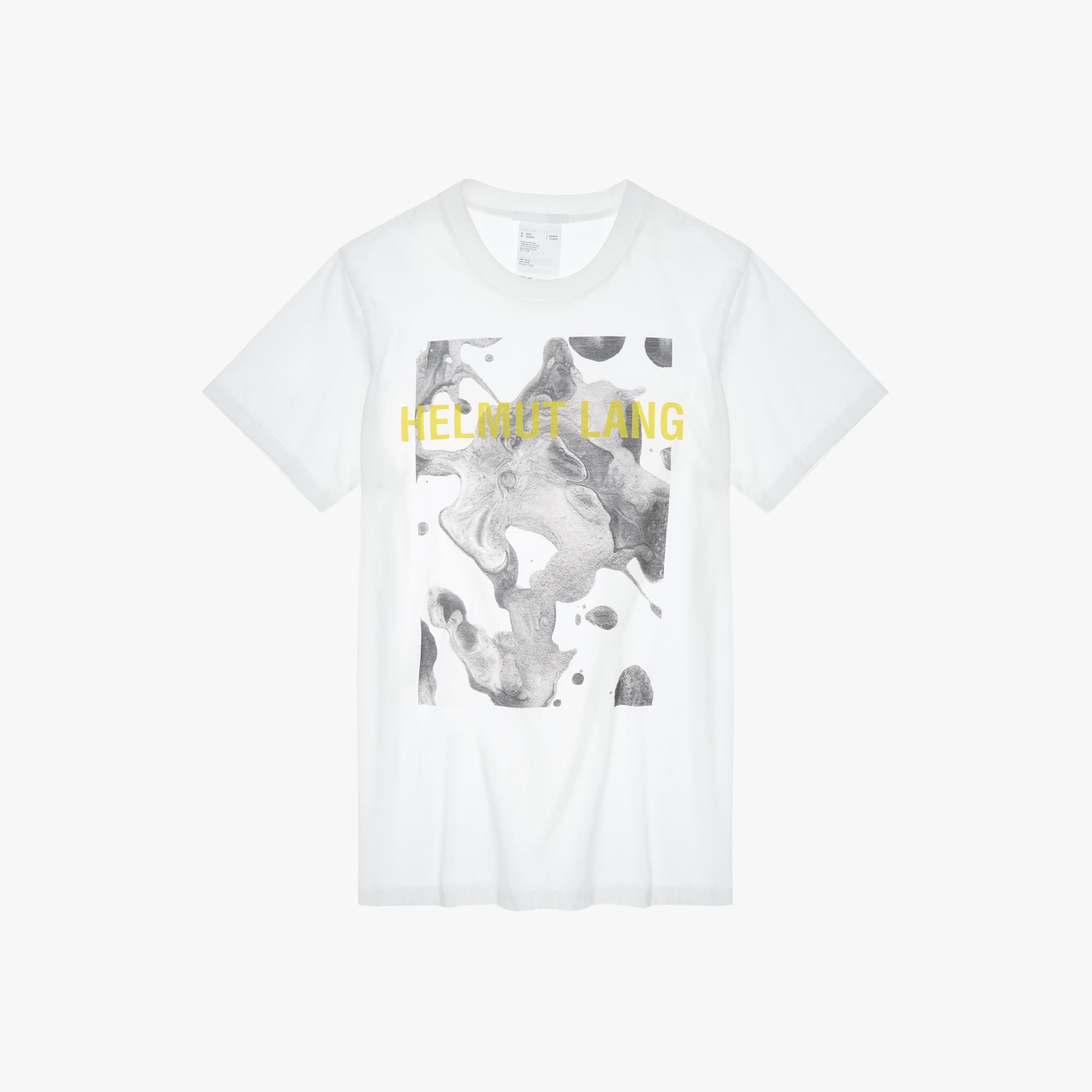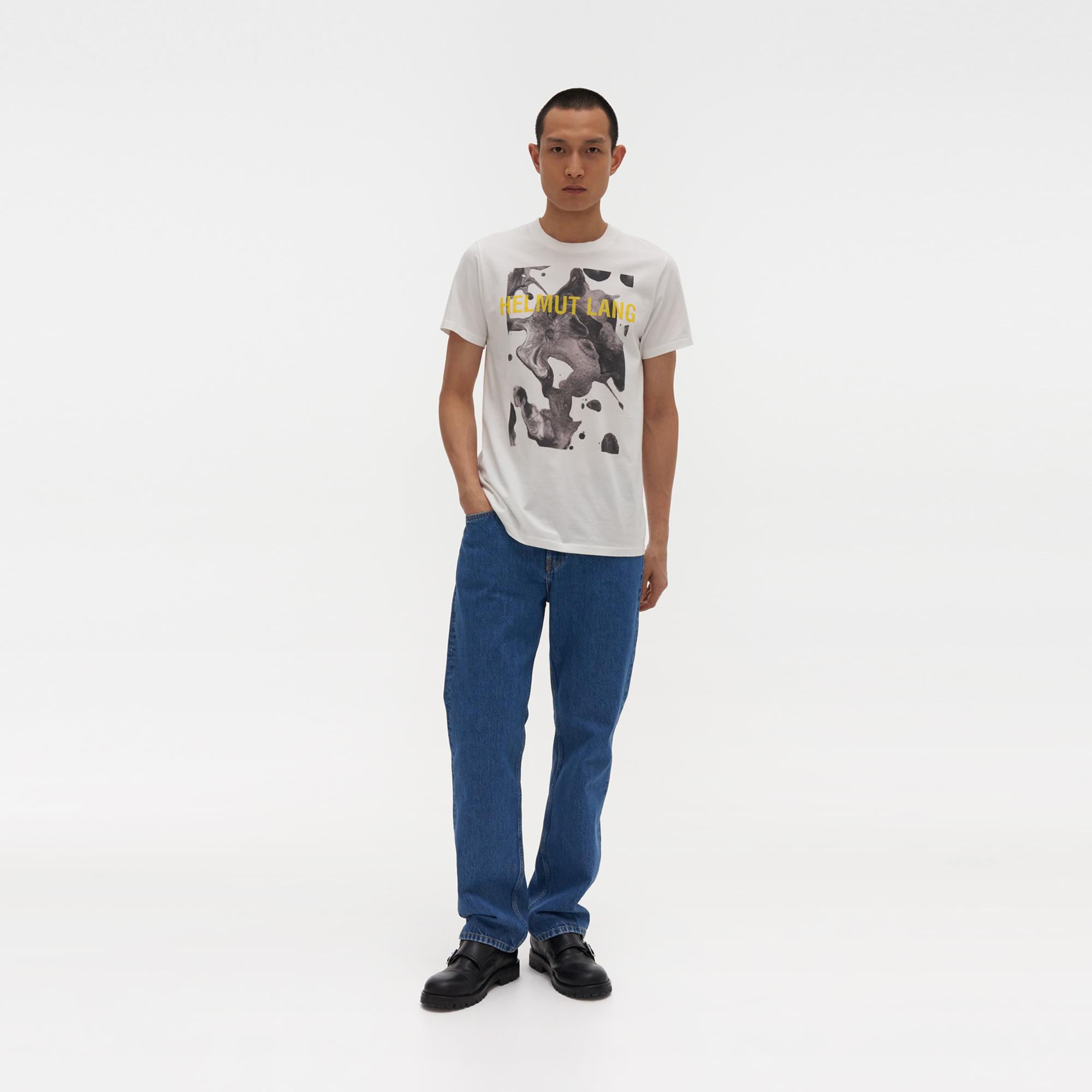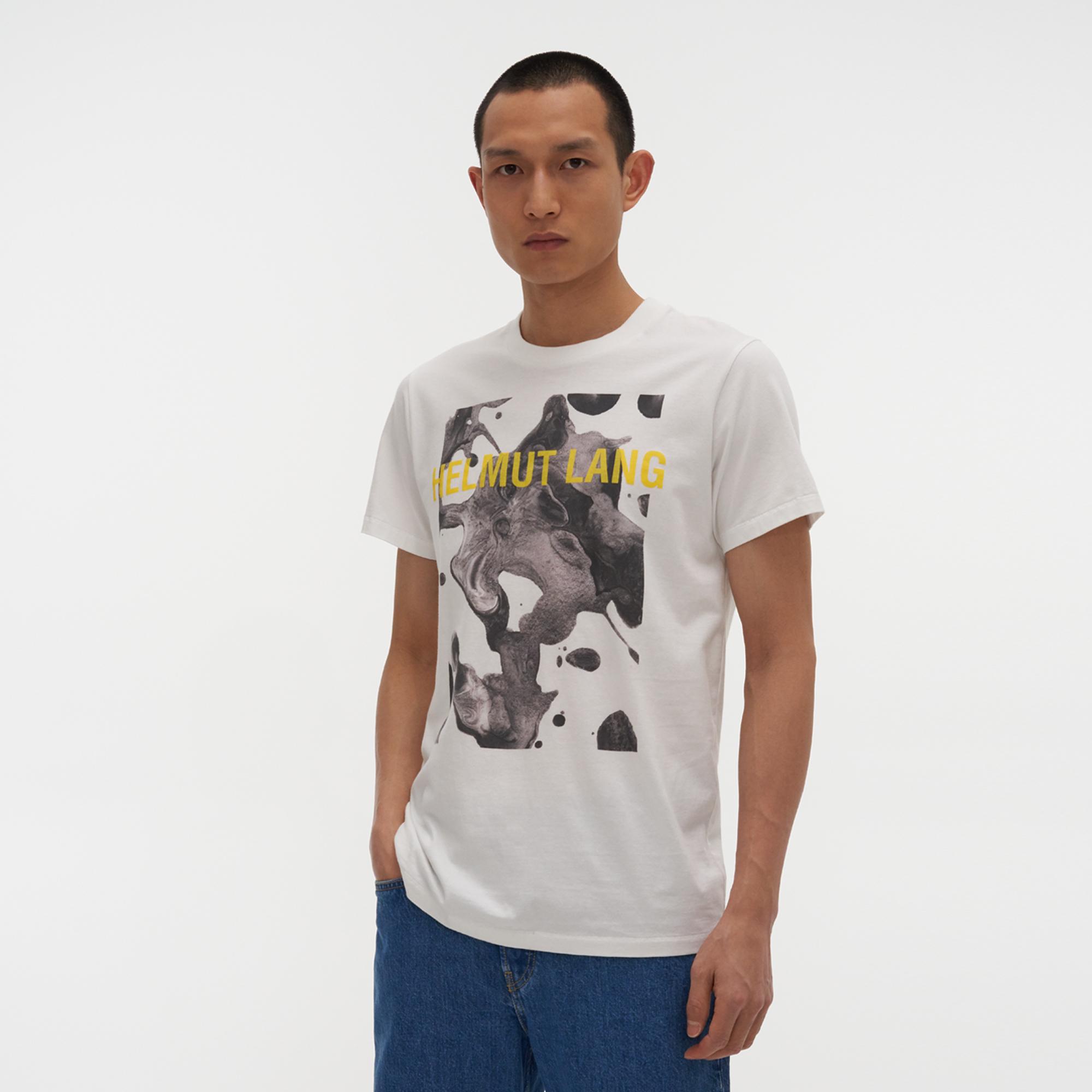 The Helmut Lang Mega Standard Tee is a classic cotton short-sleeve T-shirt with a splatter graphic and logo overlay
