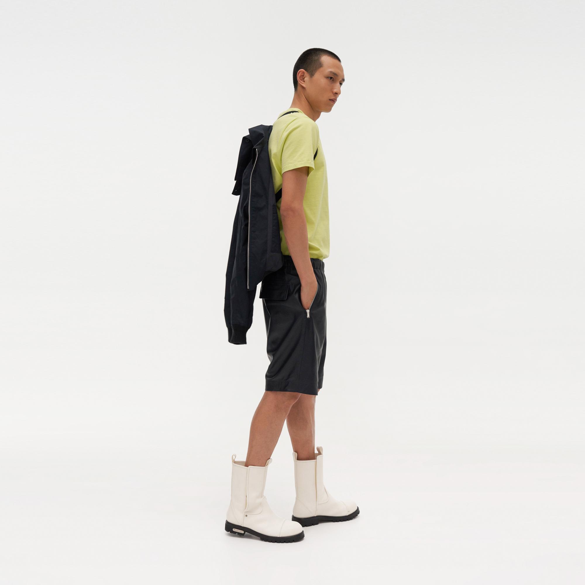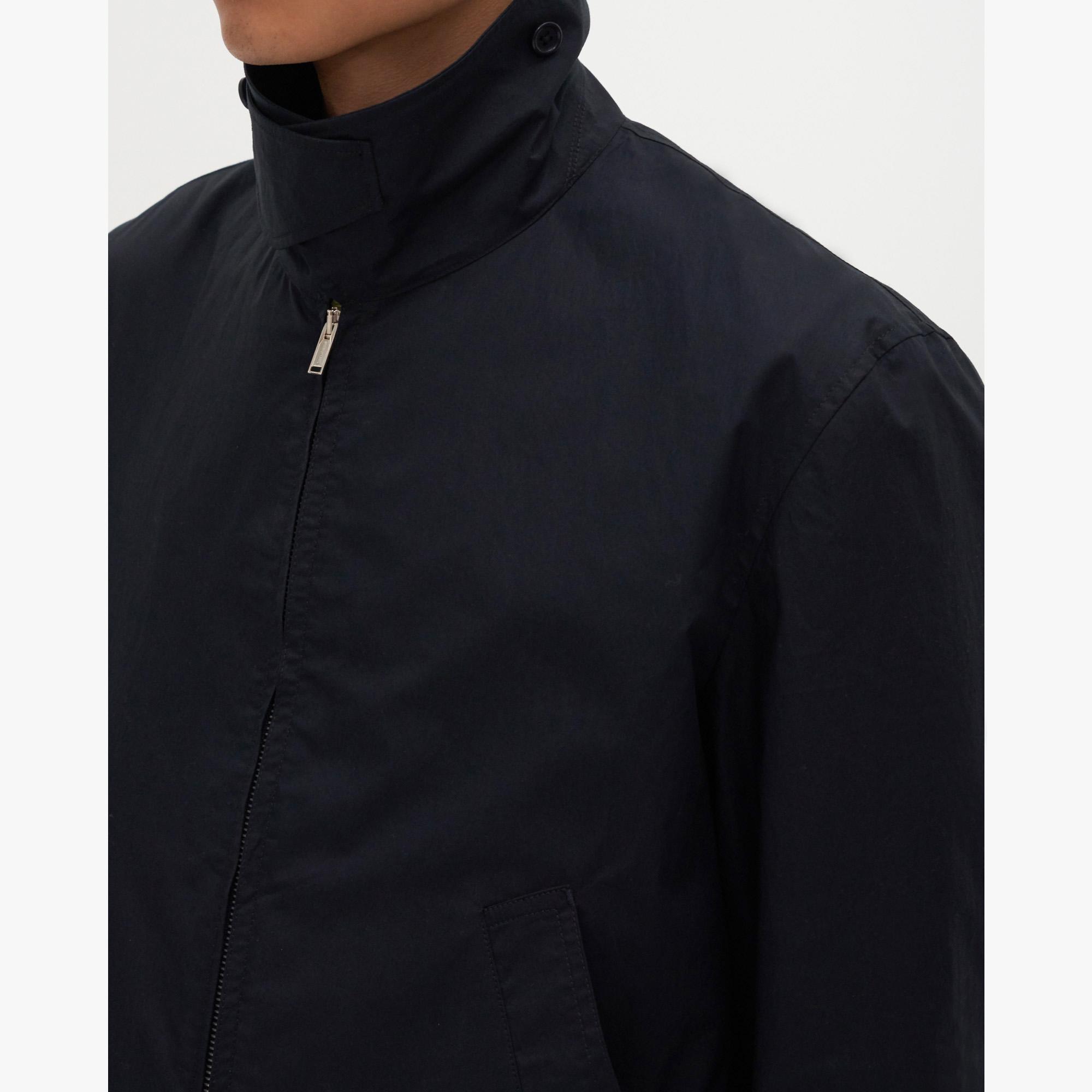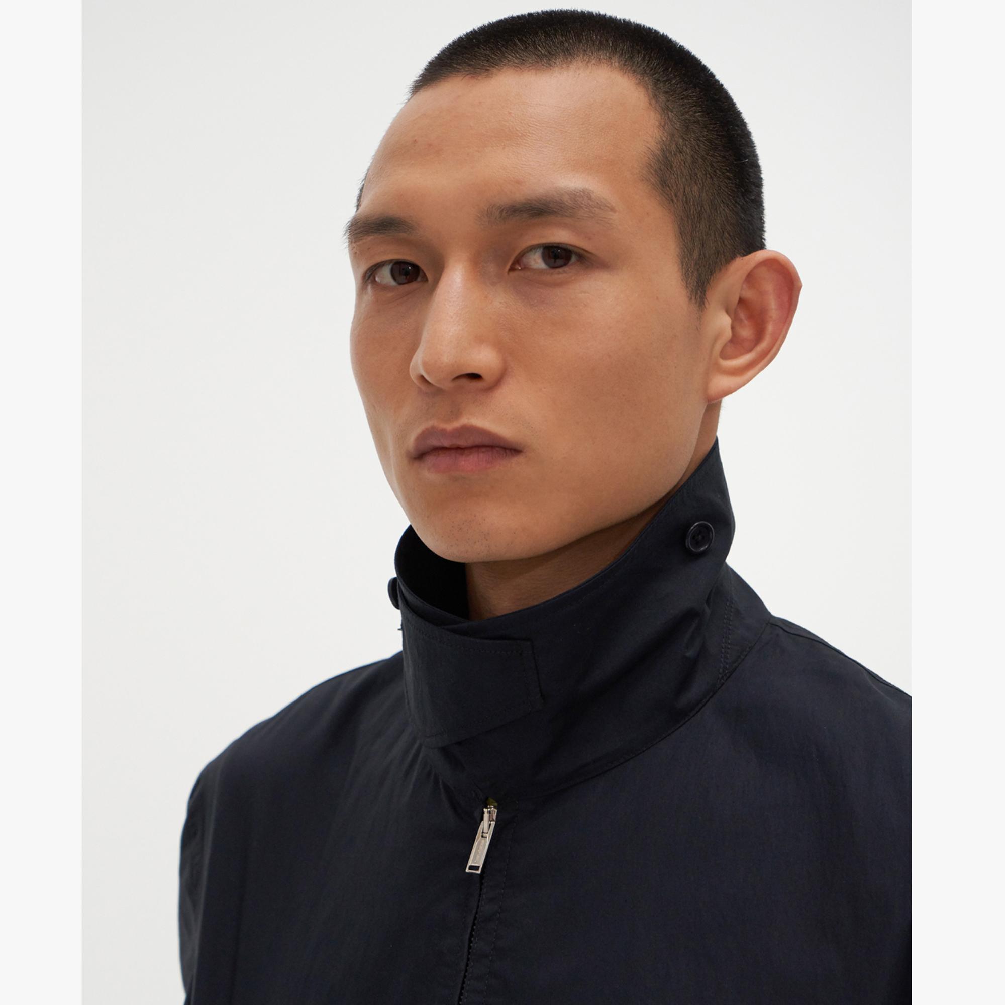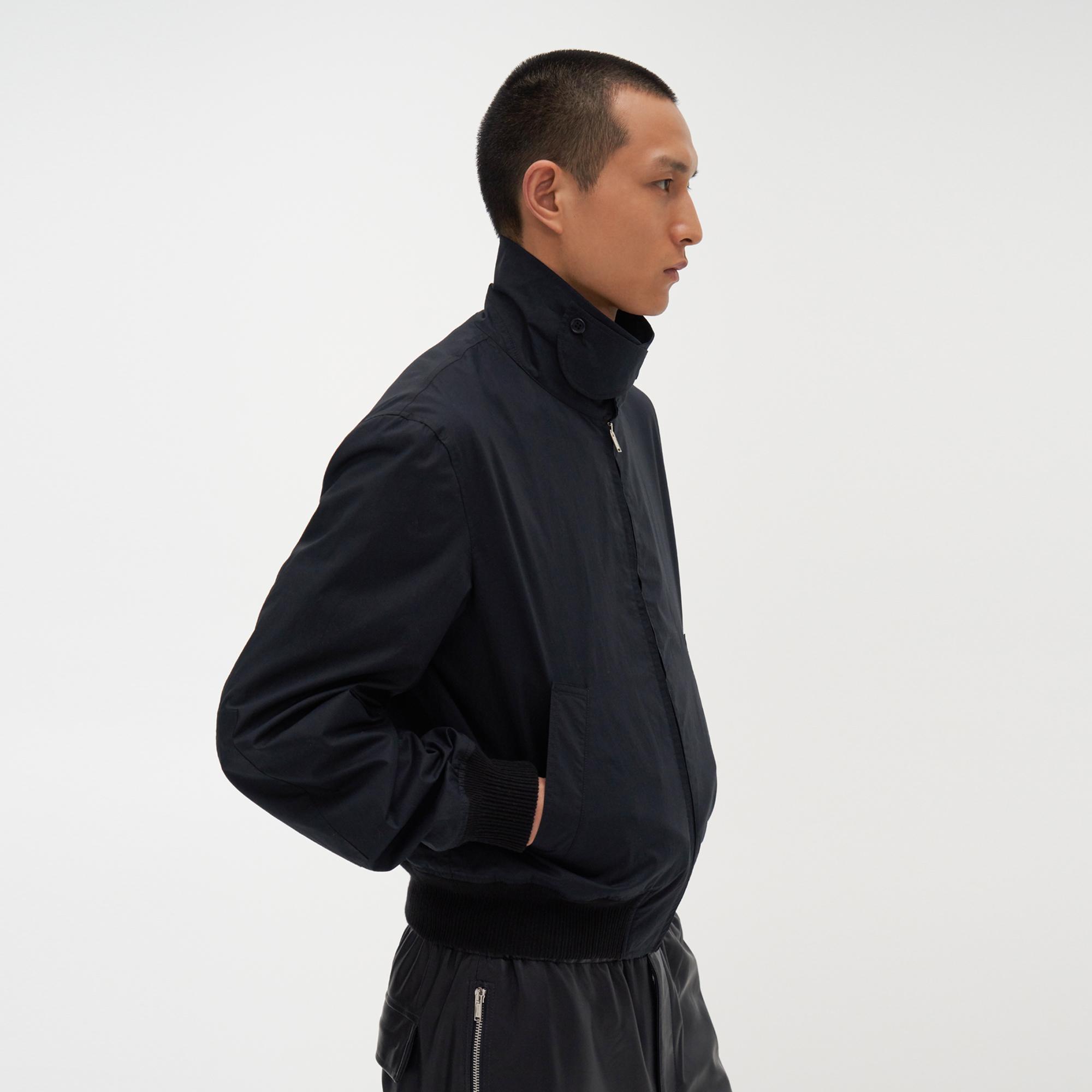 The Helmut Lang Trench Bomber Jacket is a lightweight cotton bomber jacket with a zip front, buttoned wrap collar, and interior shoulder straps