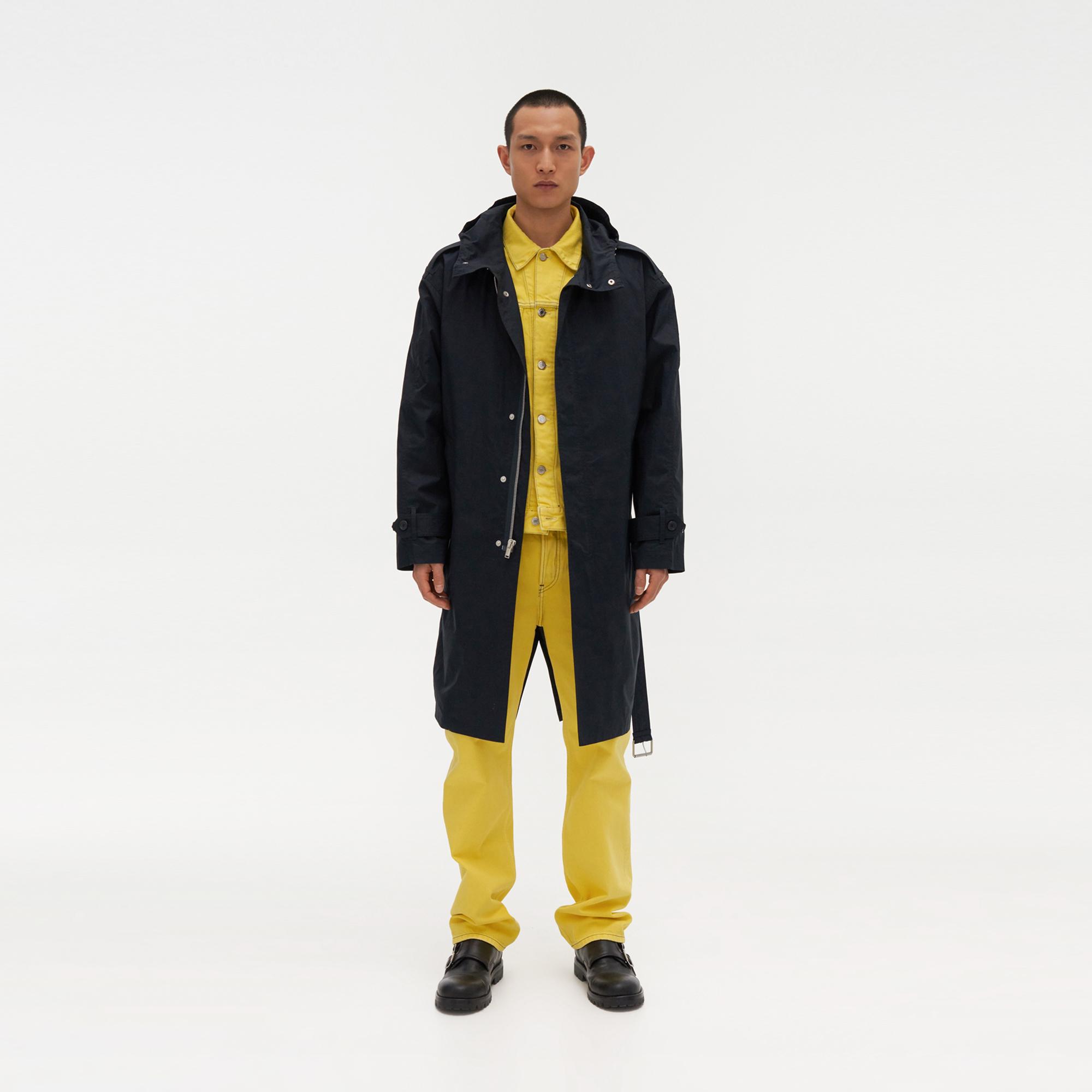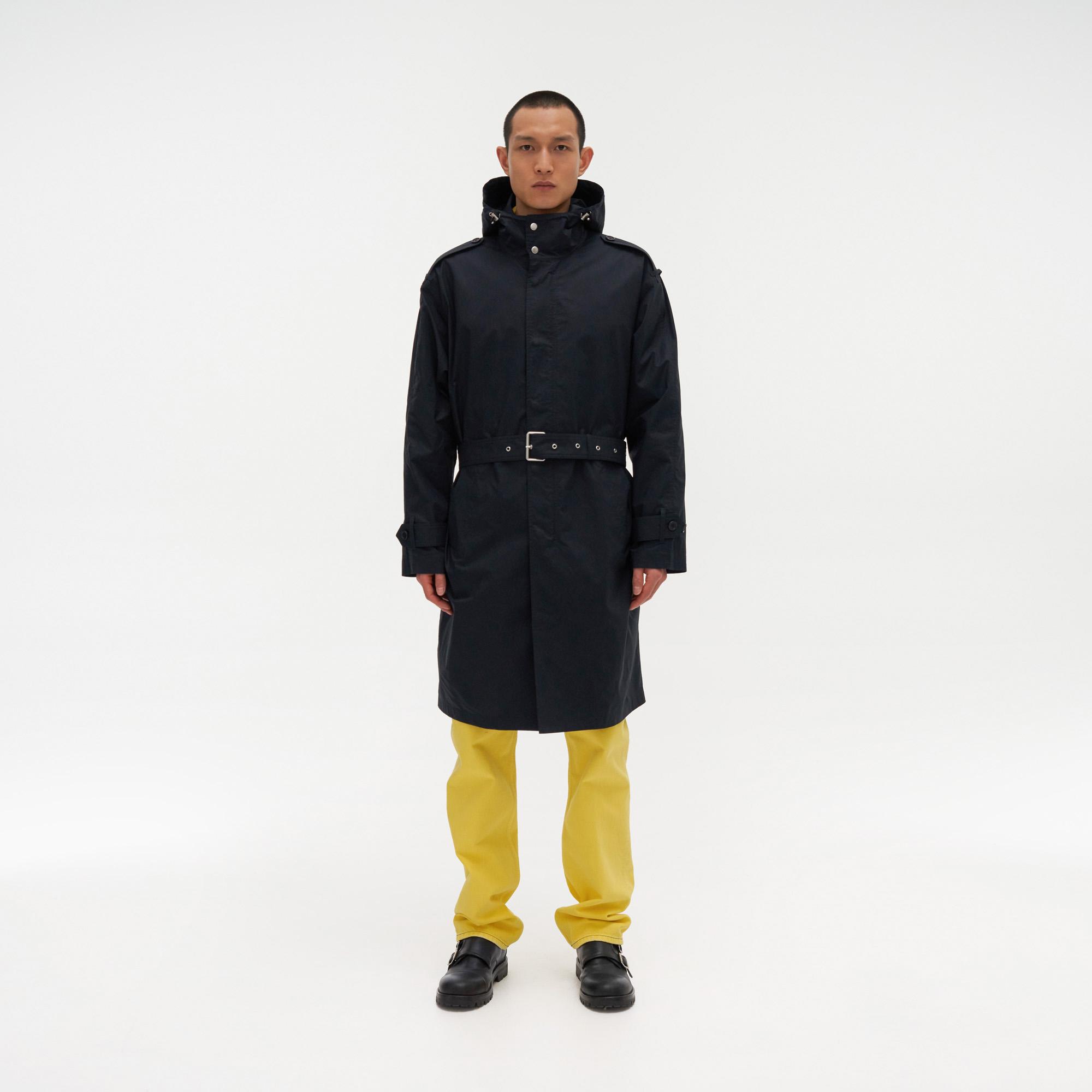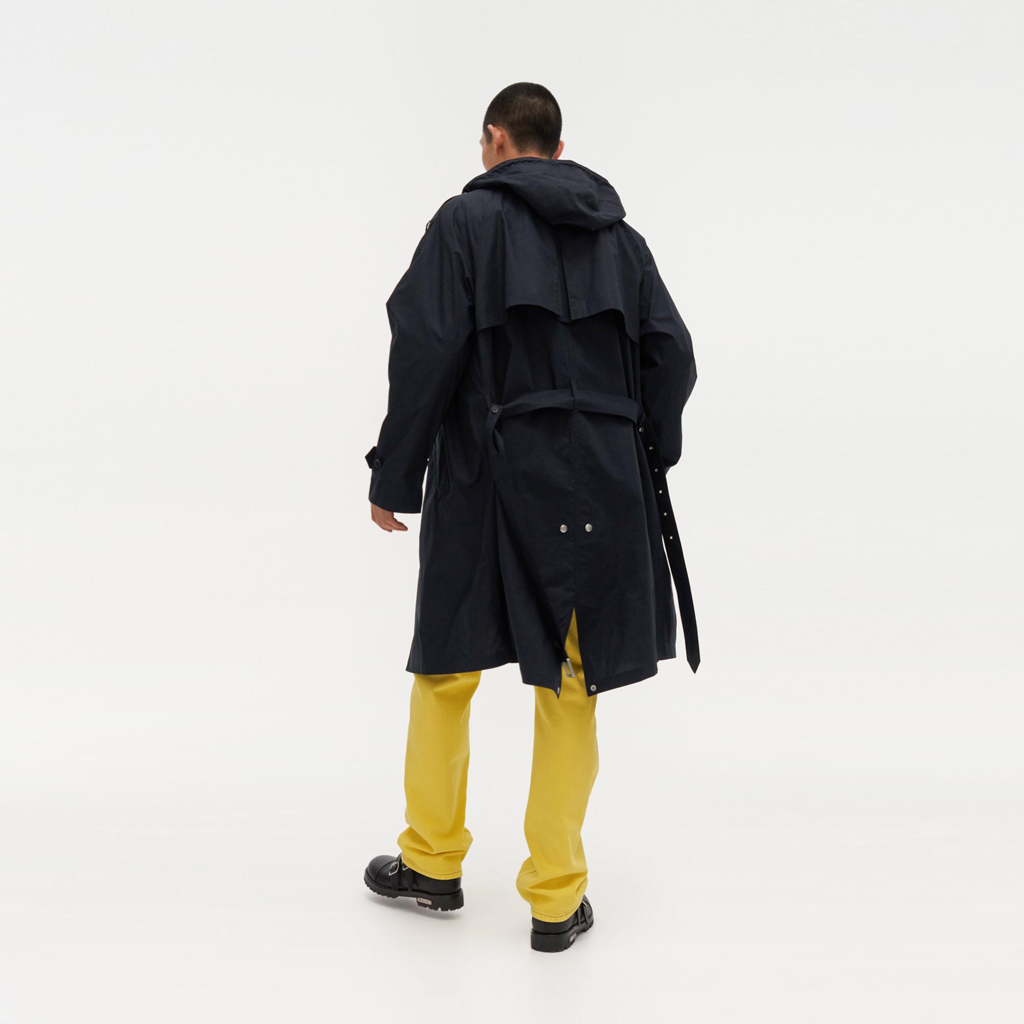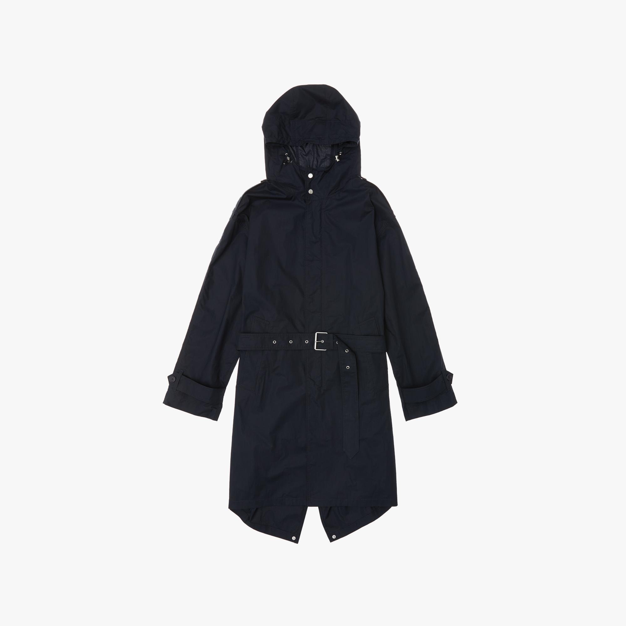 The Helmut Lang Trench Parka is a long hooded coat with a belted waist and button-and-zip front closure