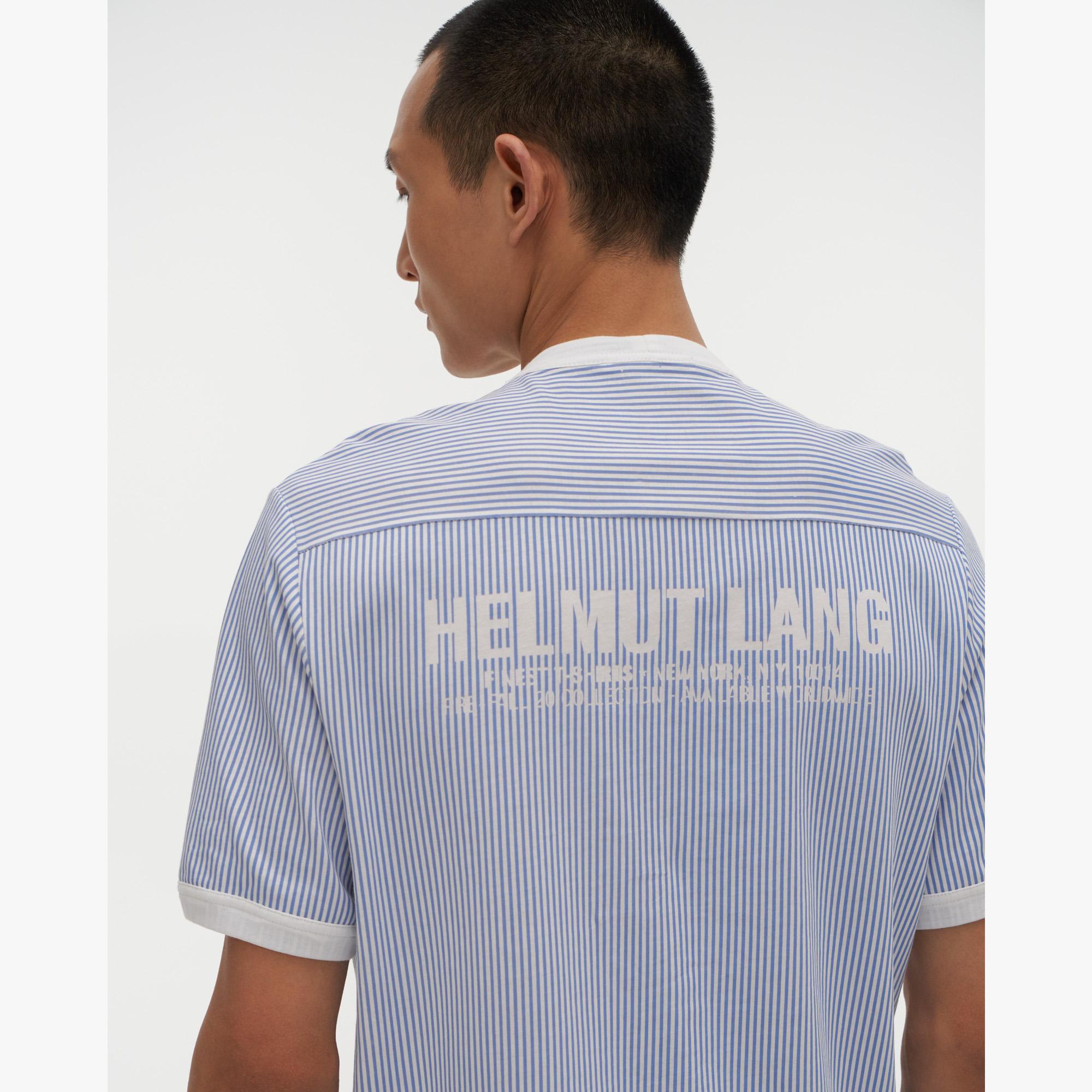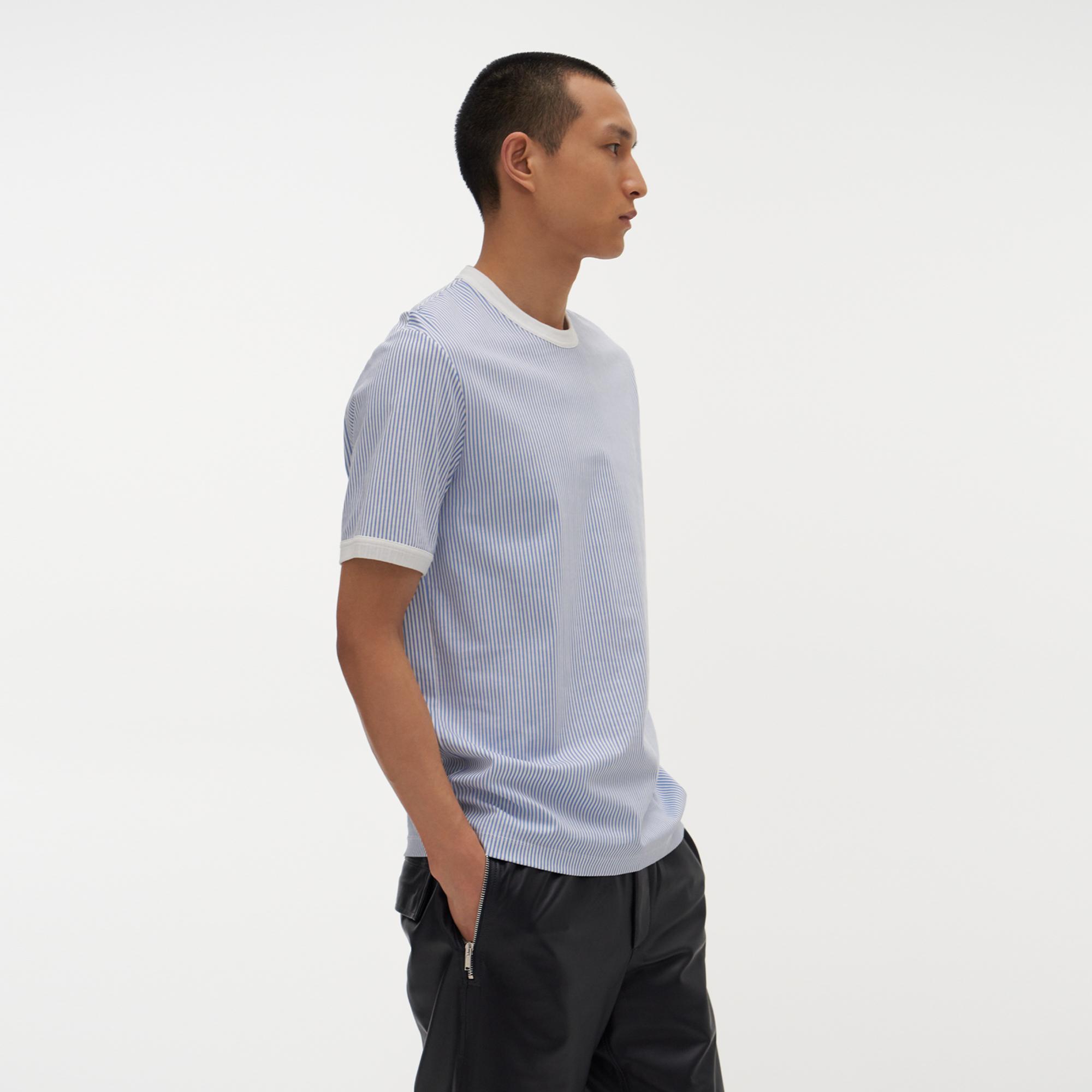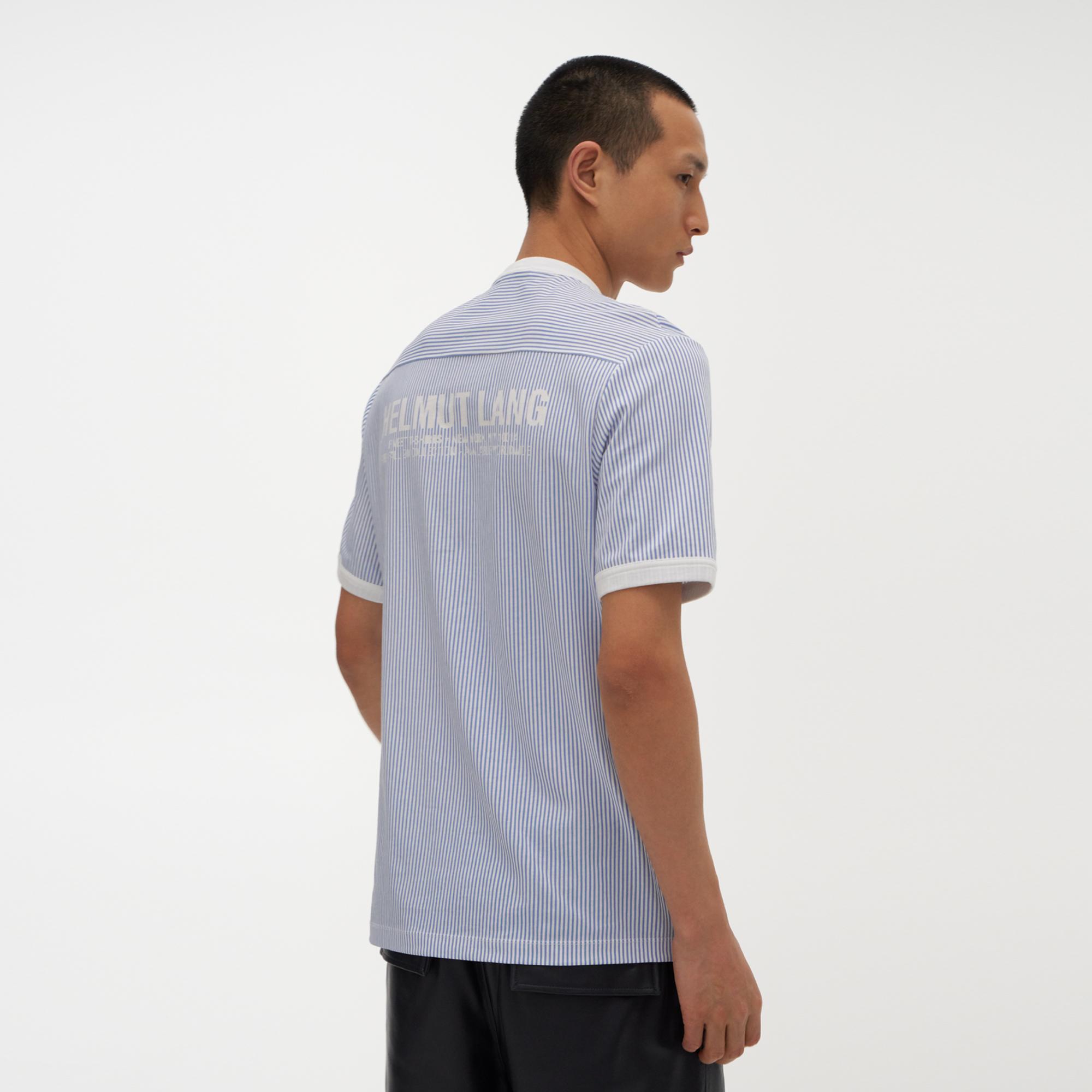 The Helmut Lang Striped Logo Print Tee is a crewneck T-shirt in striped cotton jersey with contrast trim and a logo print on back