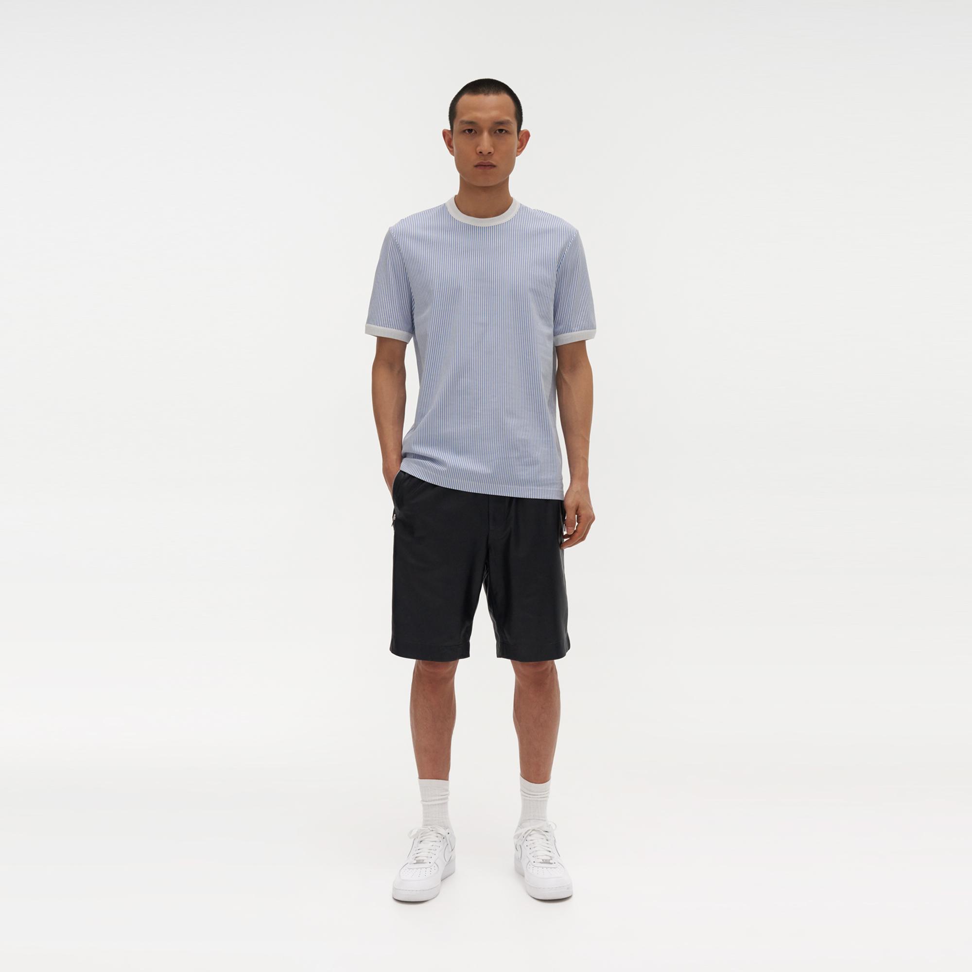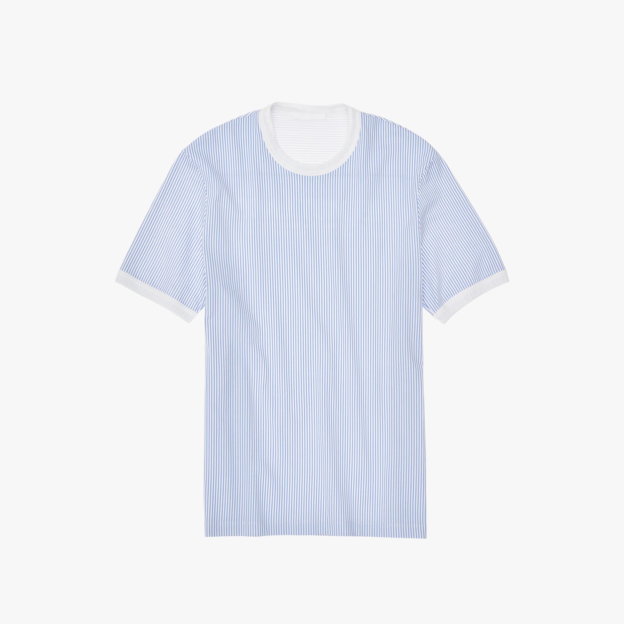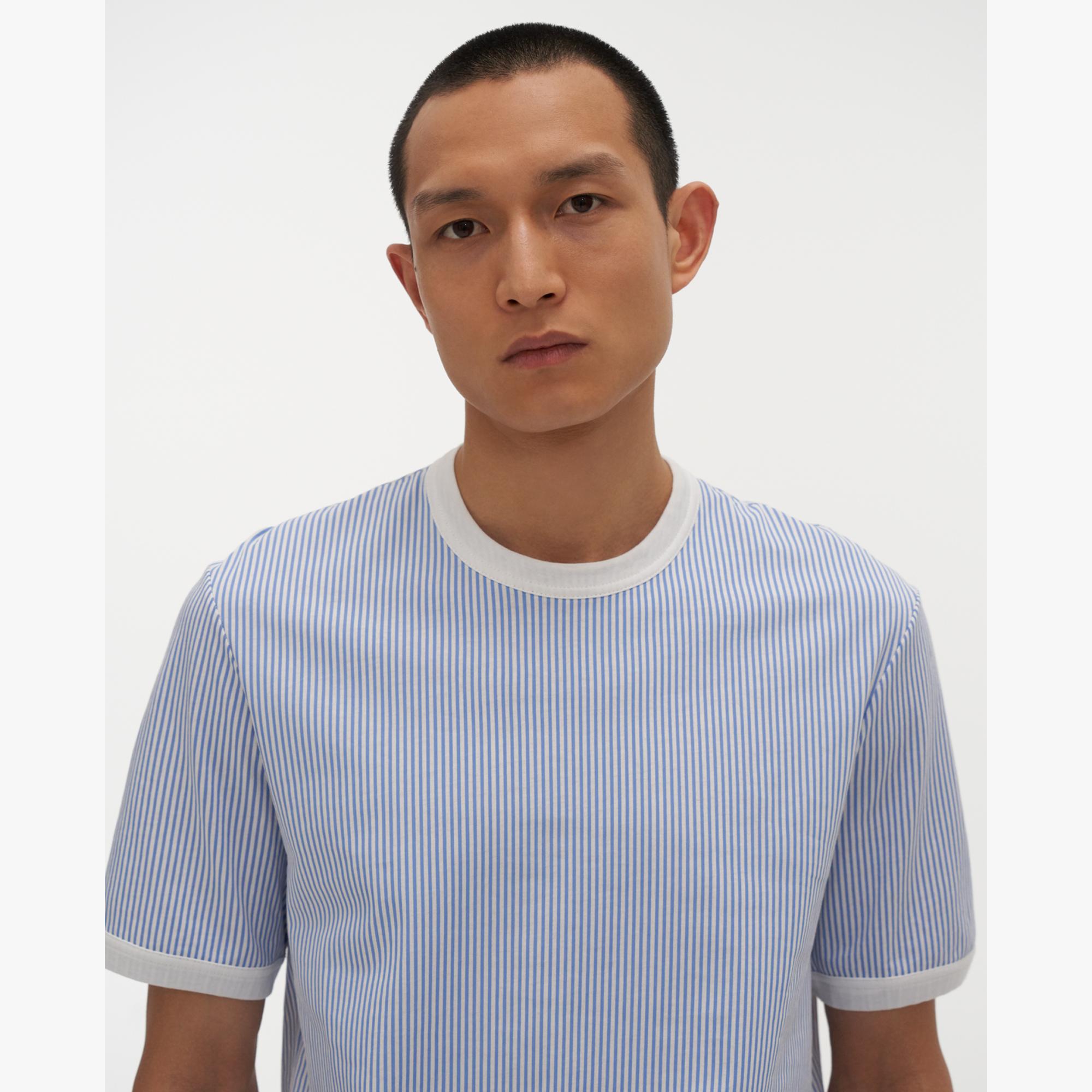 The Helmut Lang Striped Logo Print Tee is a crewneck T-shirt in striped cotton jersey with contrast trim and a logo print on back