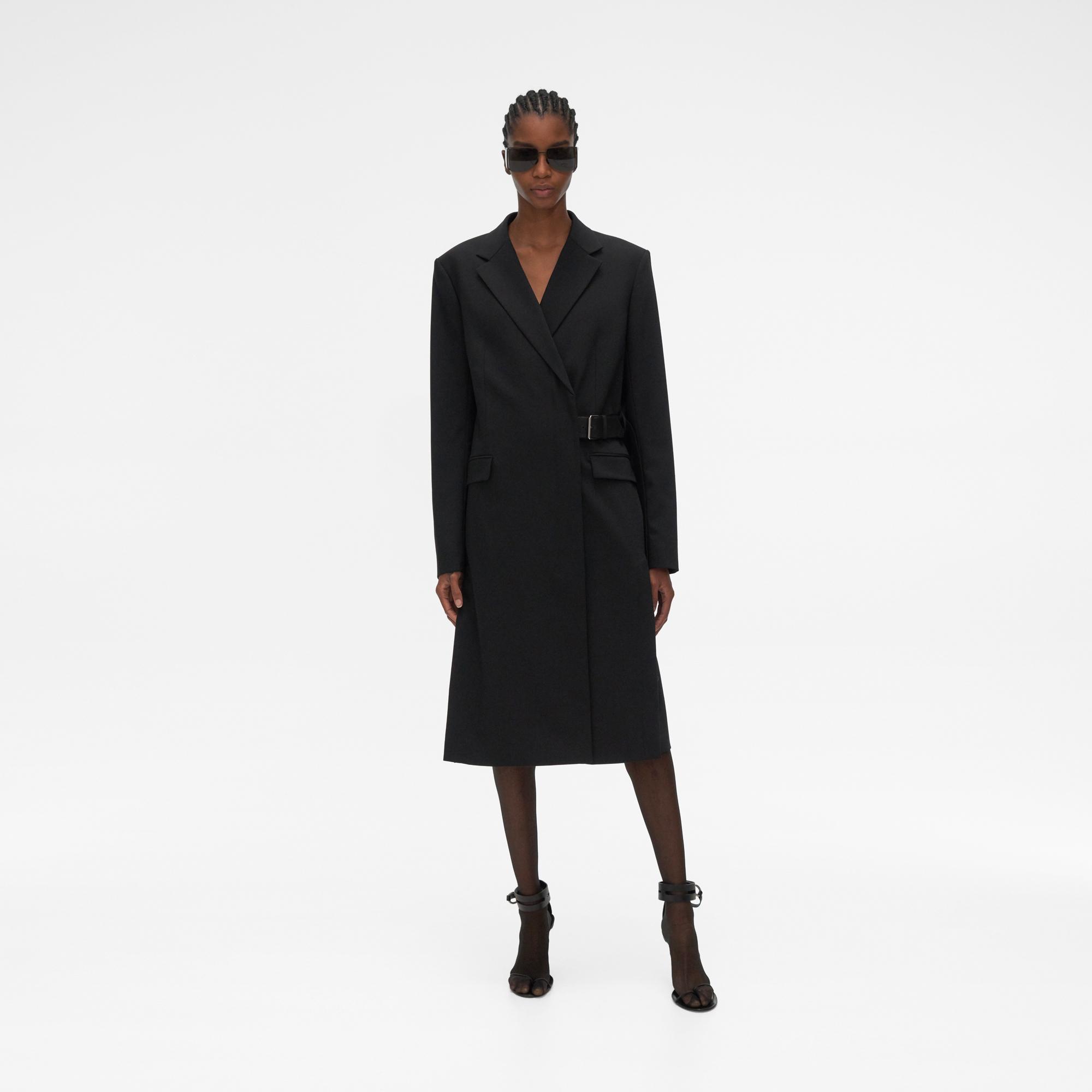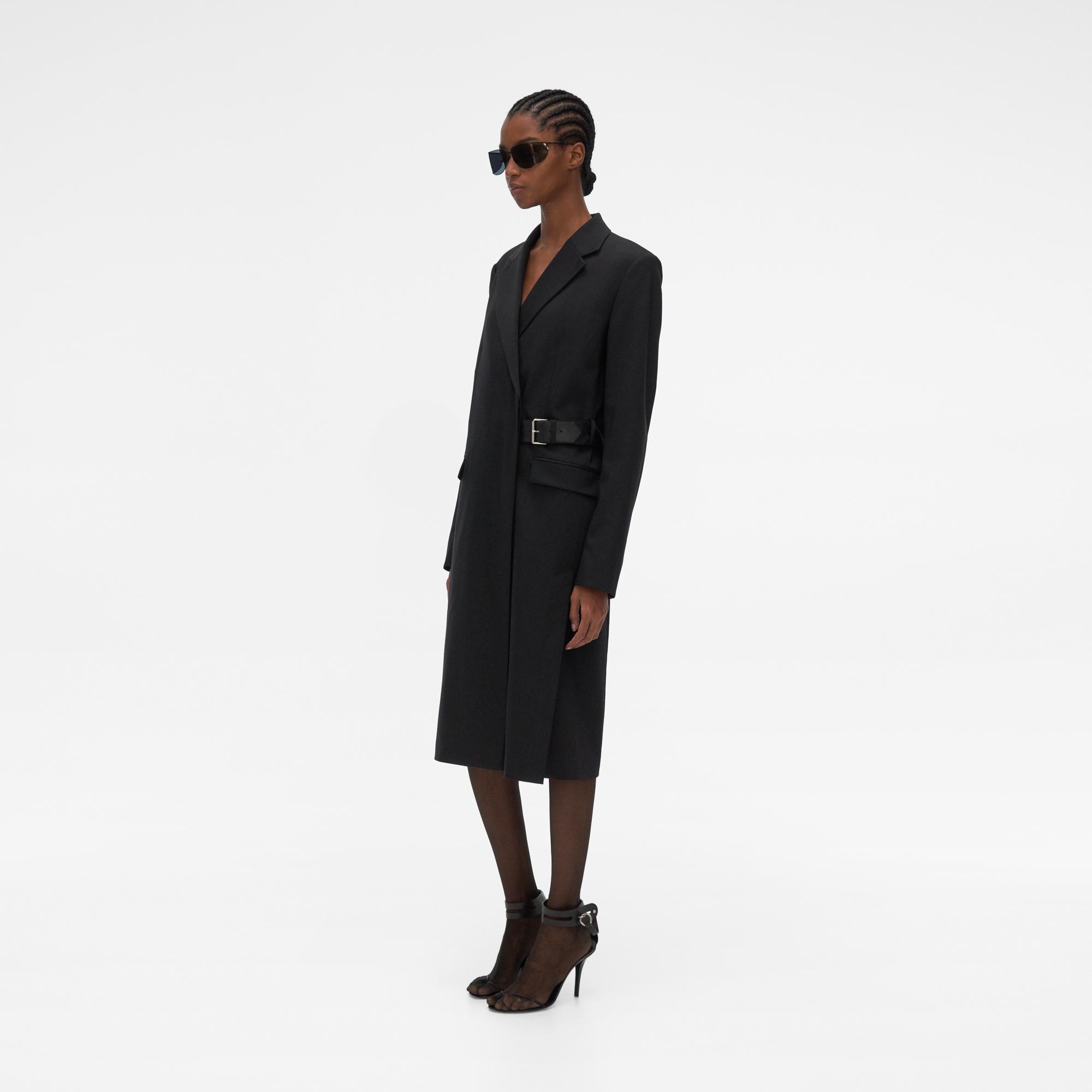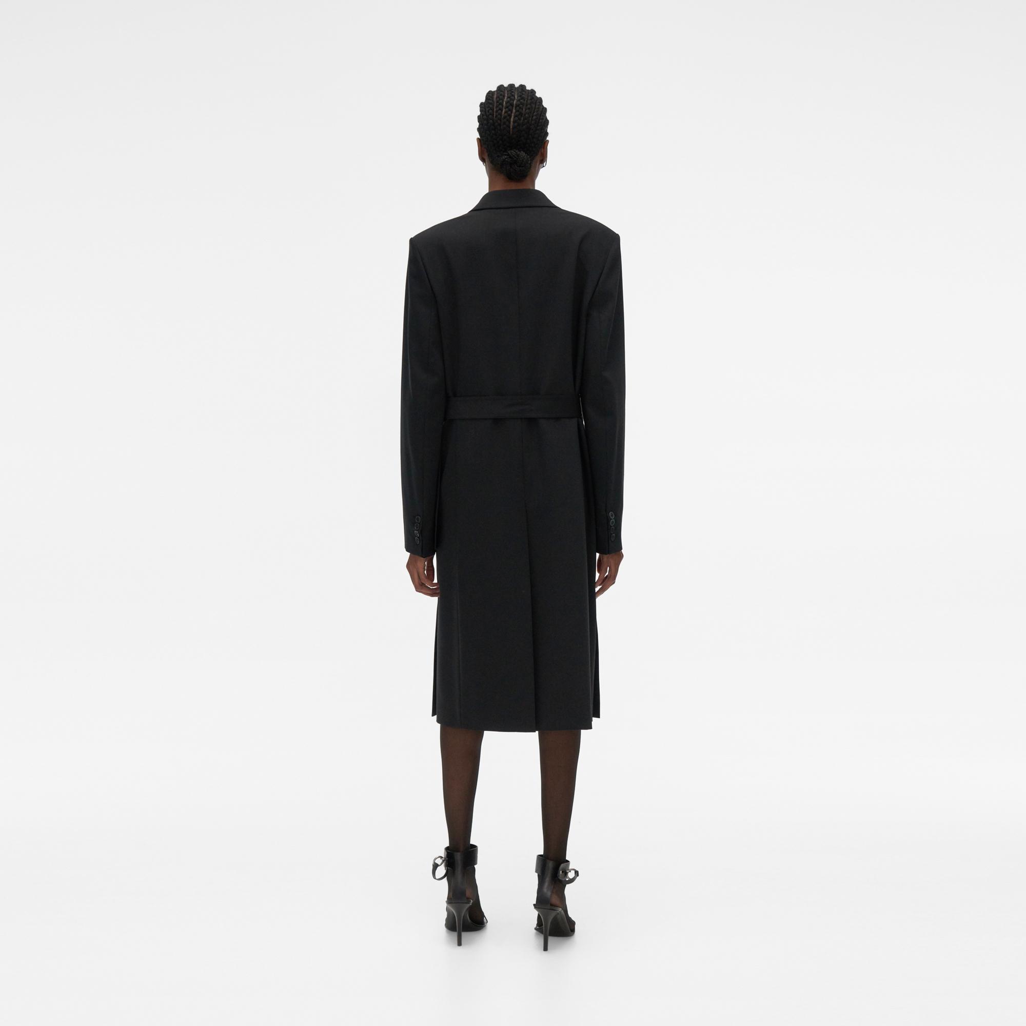 The Helmut Lang Belted Coat is a tailored double-breasted coat with structured shoulders and a self buckled belt