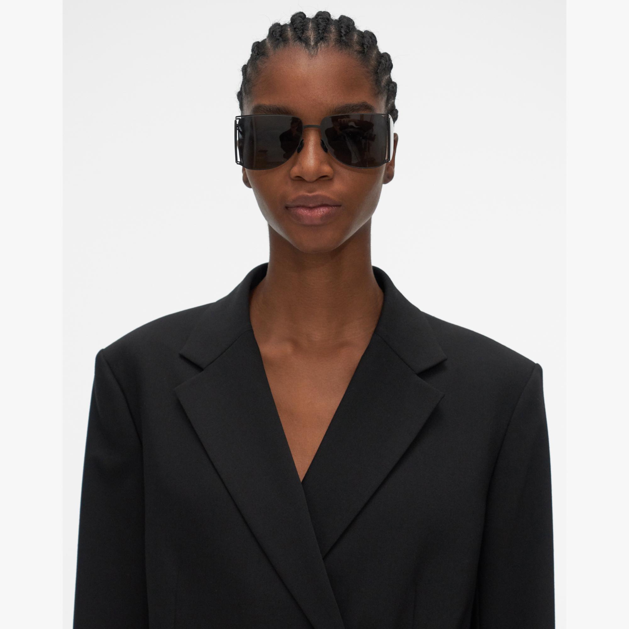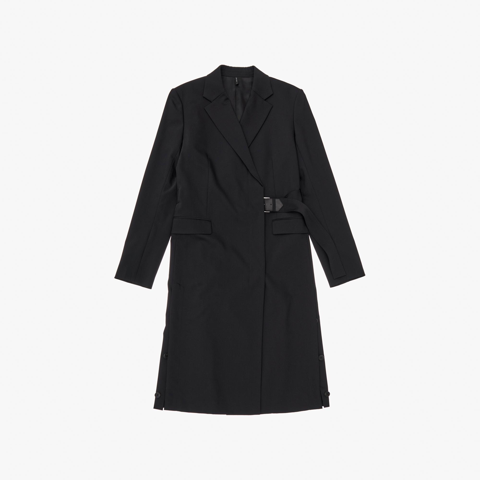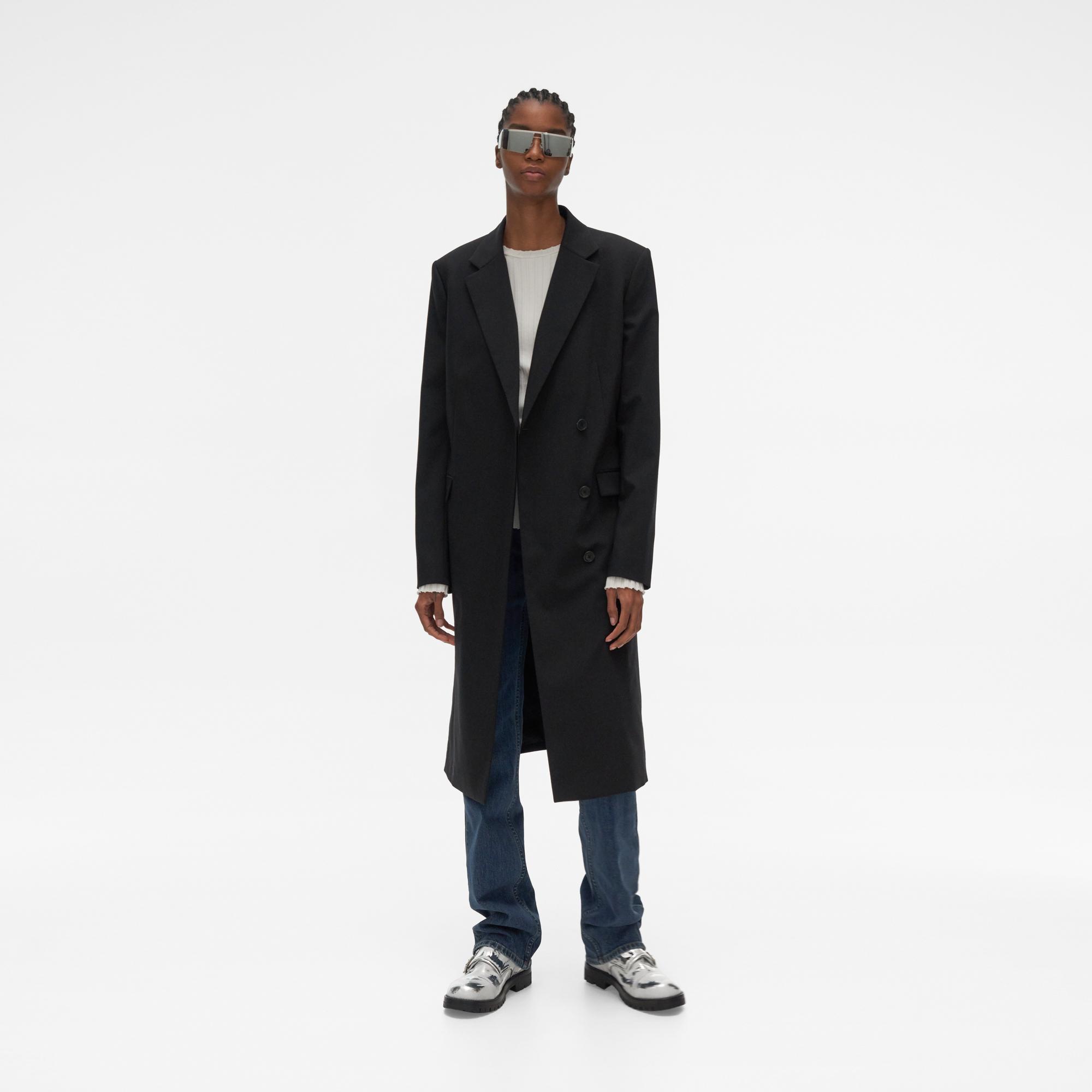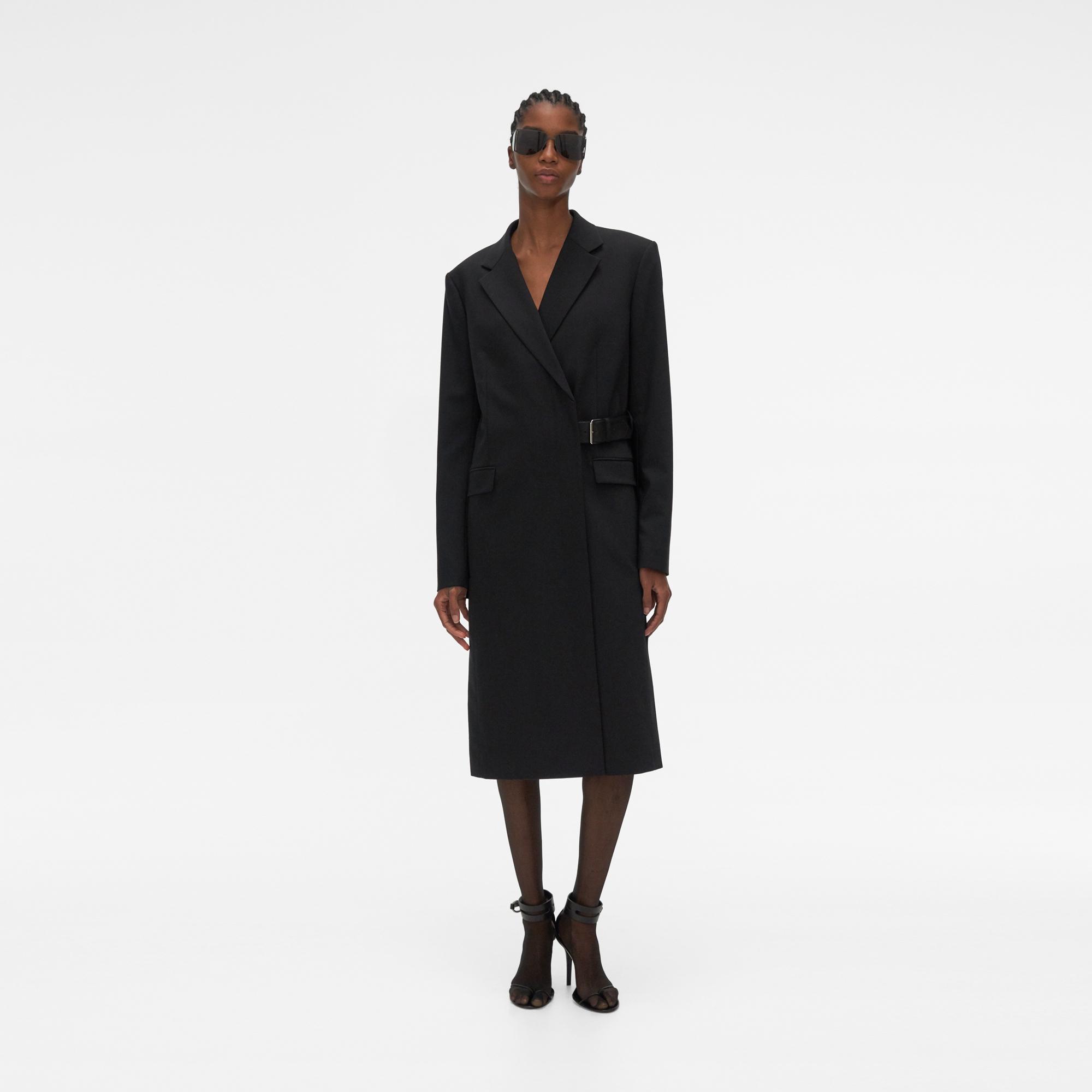 The Helmut Lang Belted Coat is a tailored double-breasted coat with structured shoulders and a self buckled belt