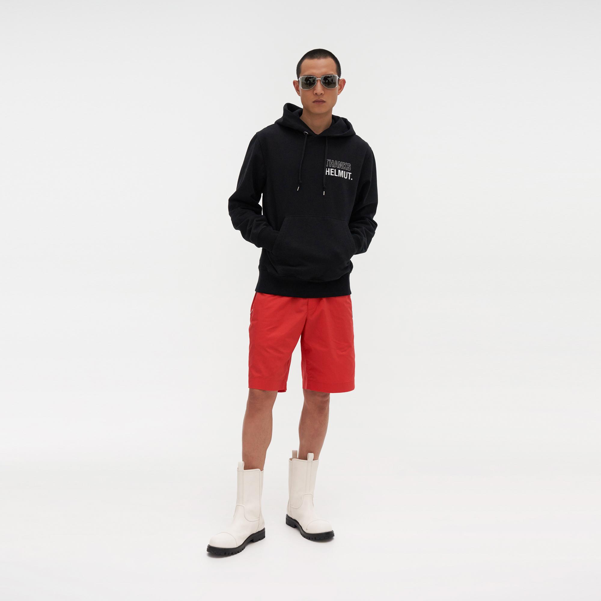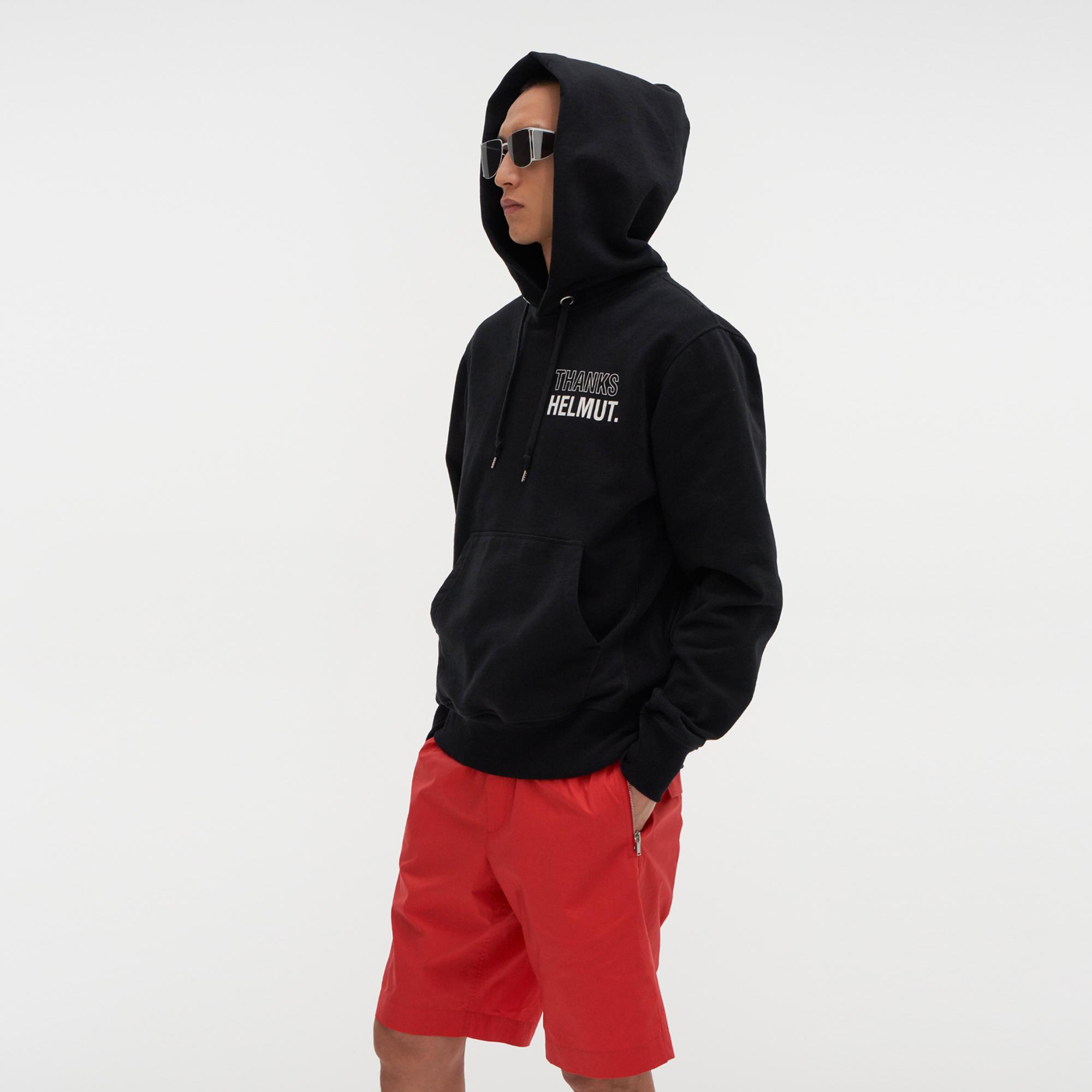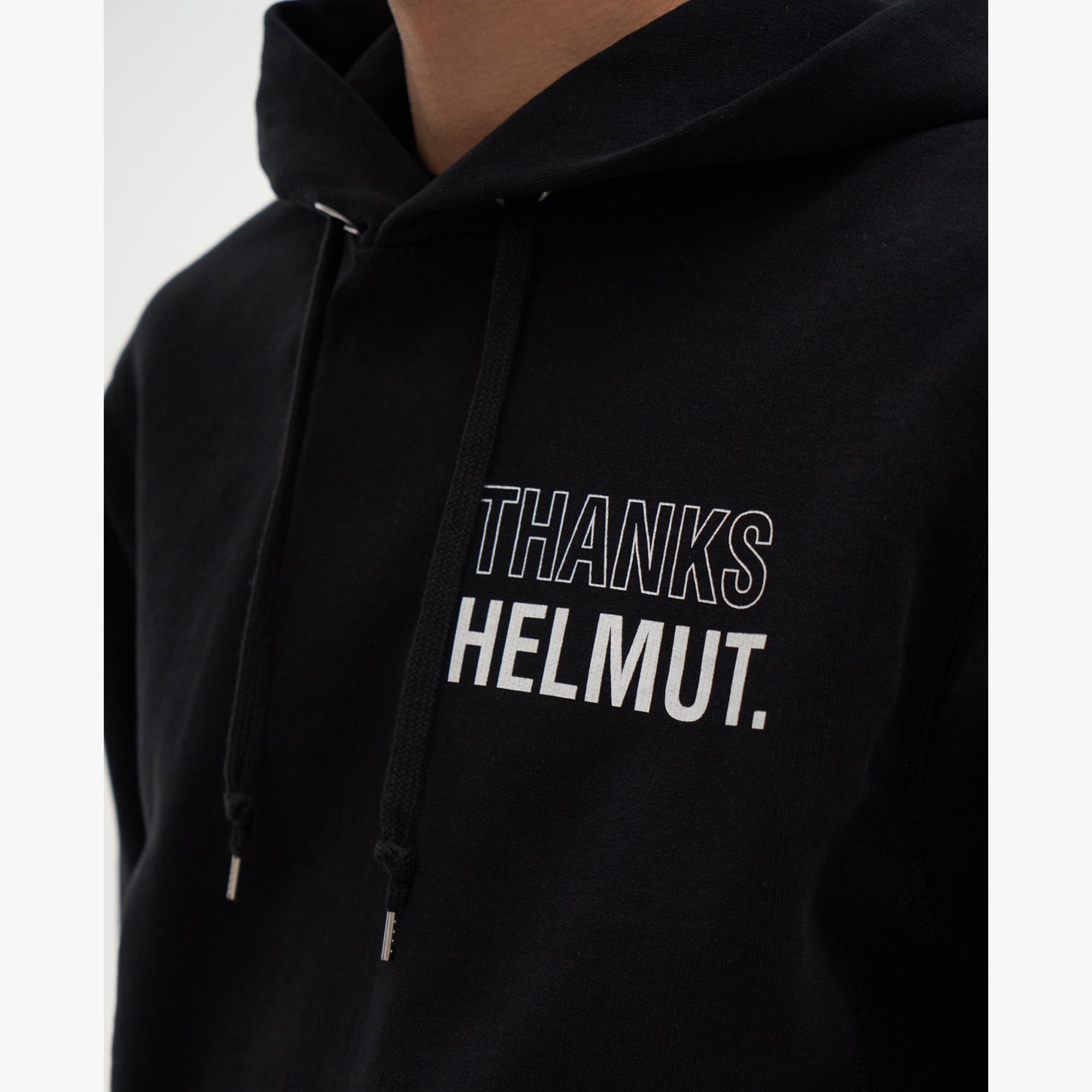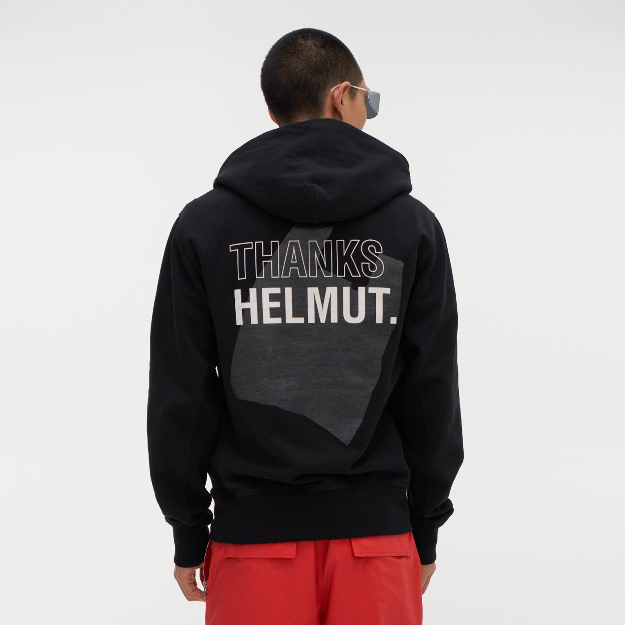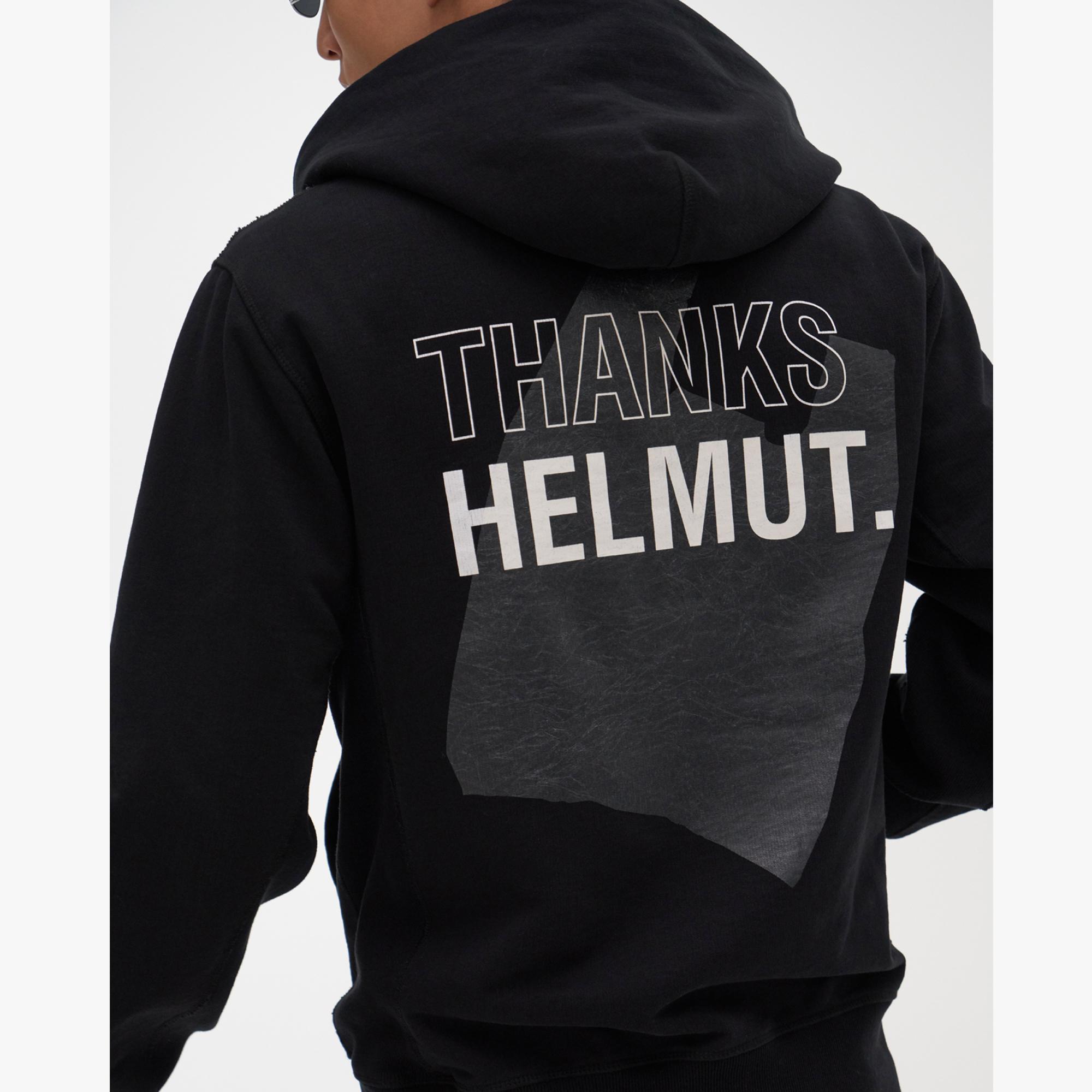 The Helmut Lang Thanks! Standard Hoodie is a classic hoodie sweatshirt with a front pocket and Thanks Helmut graphic printed on front and back