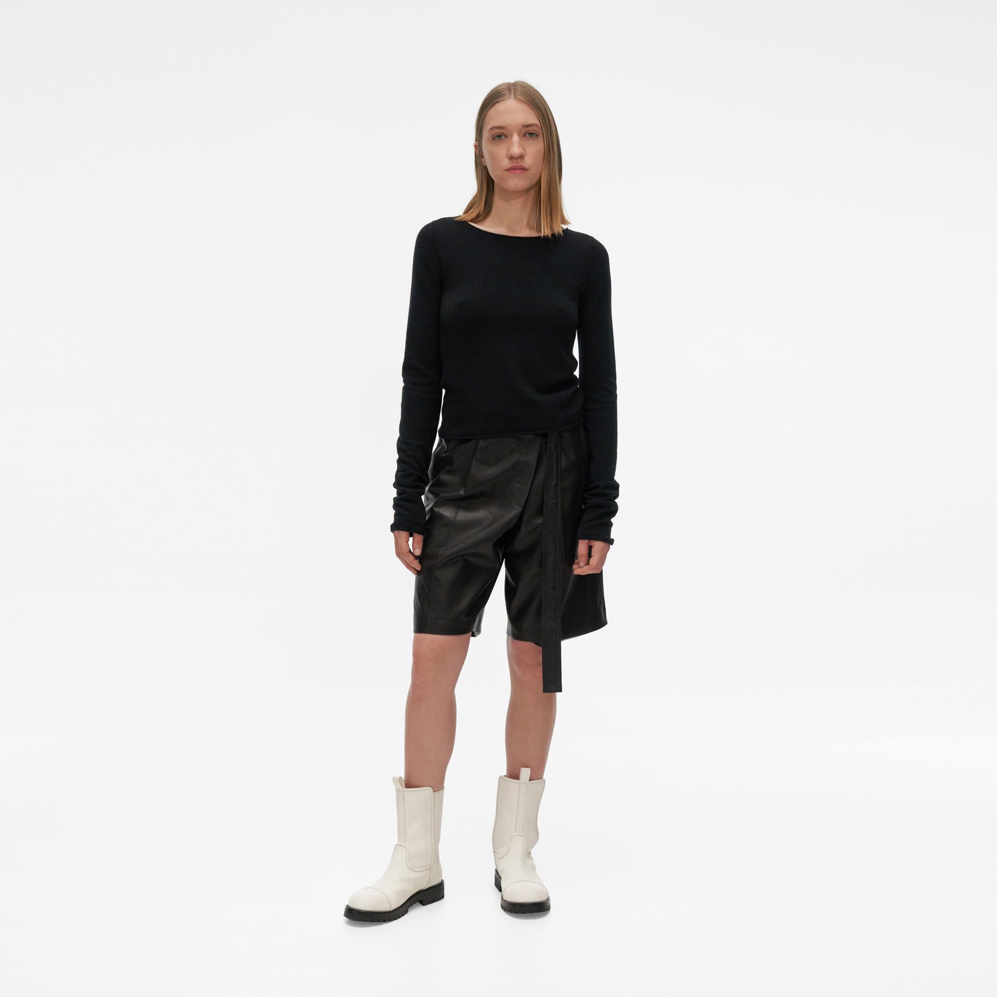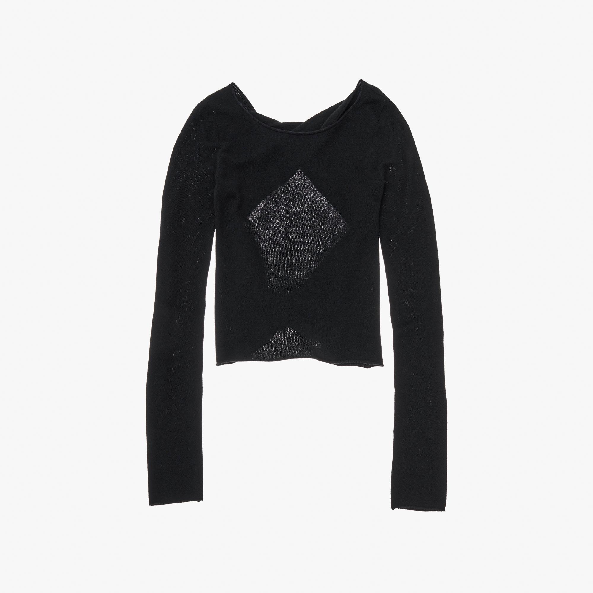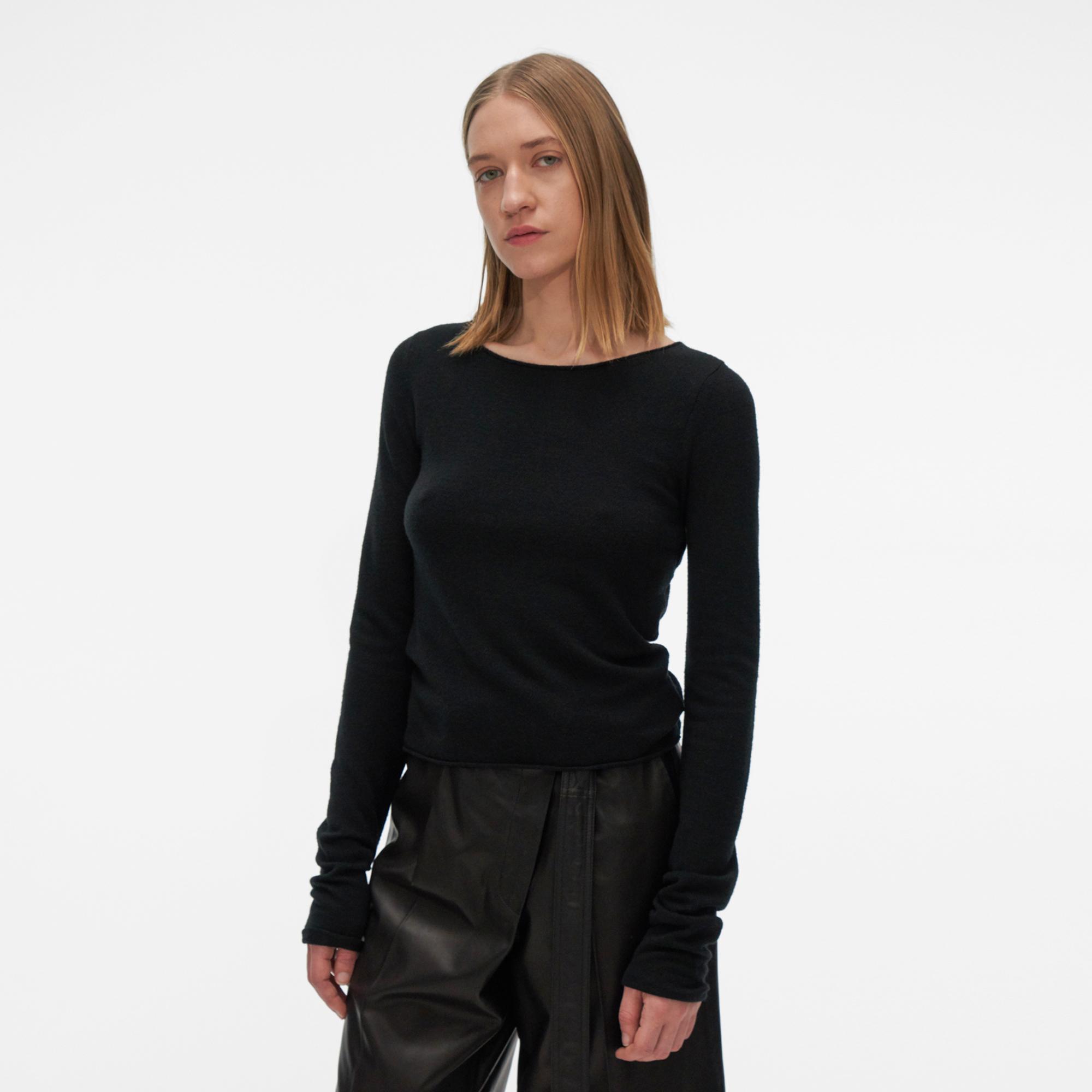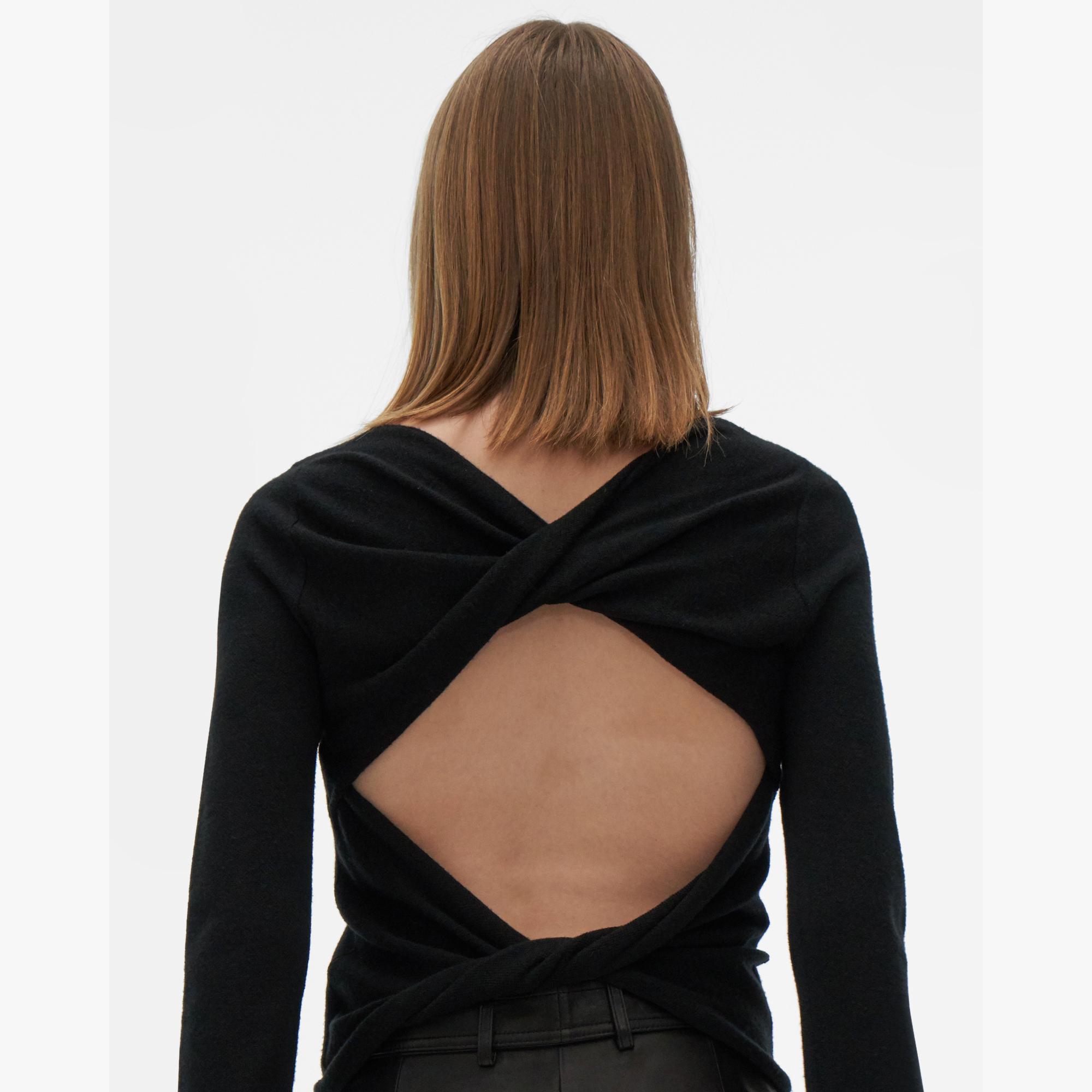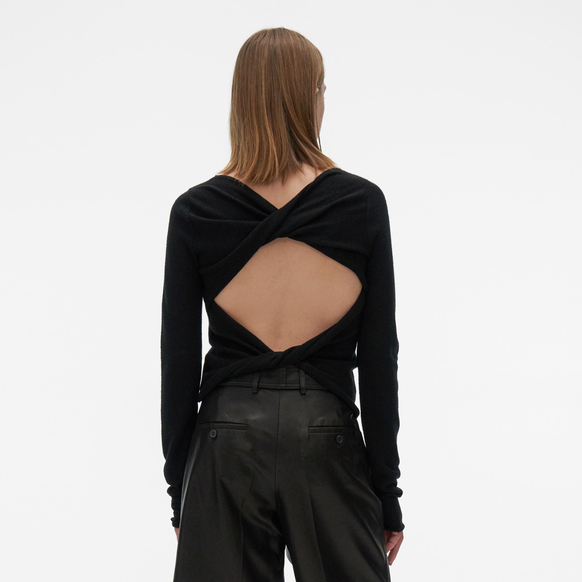 The Helmut Lang Twist Crewneck Sweater is a relaxed pullover with rolled trim and an open back with twist details