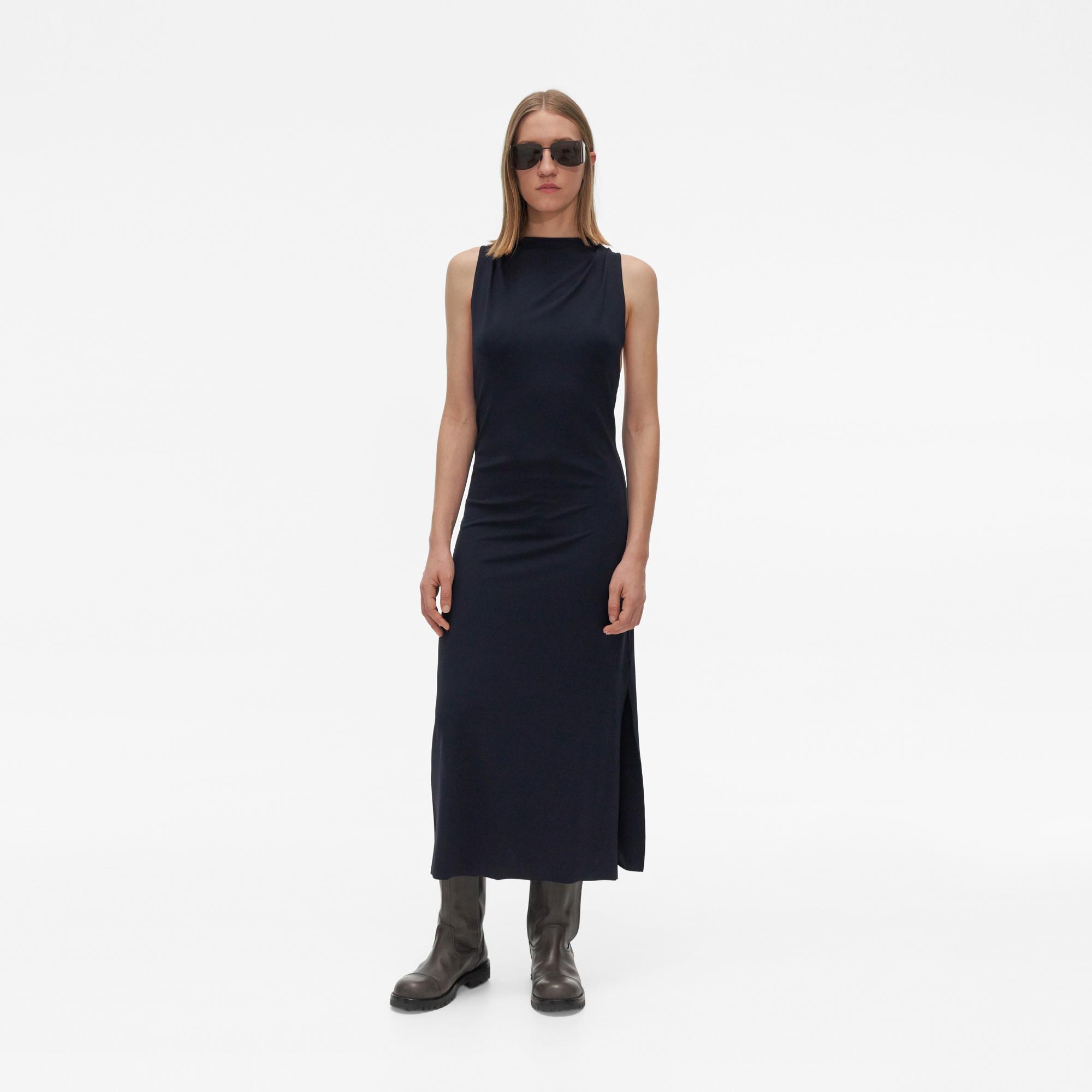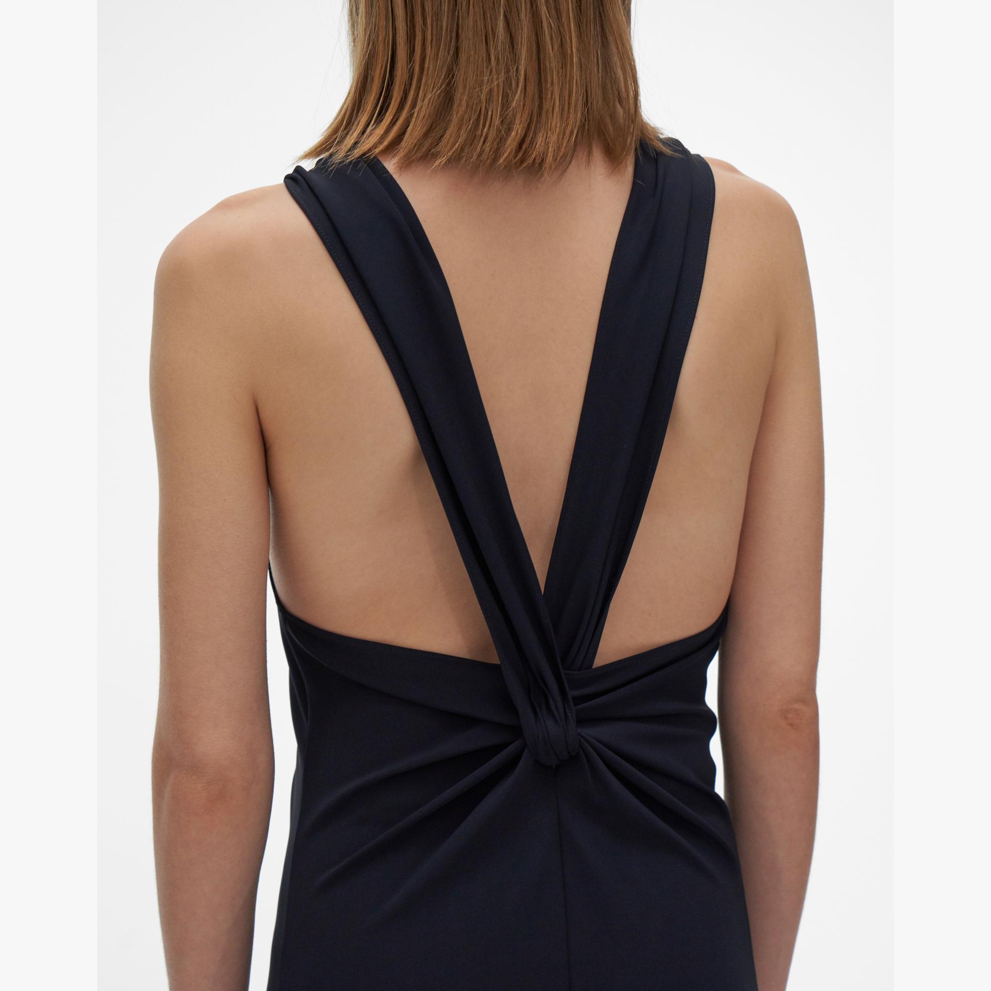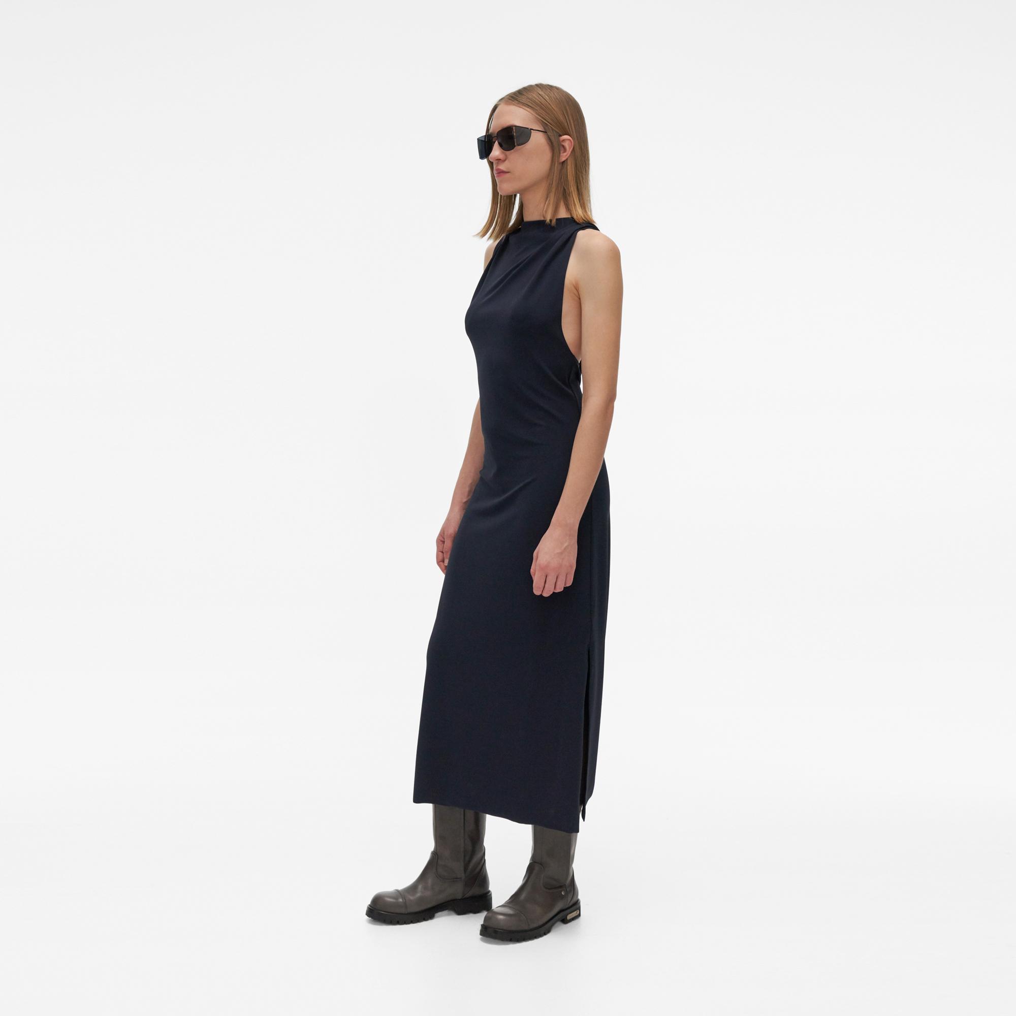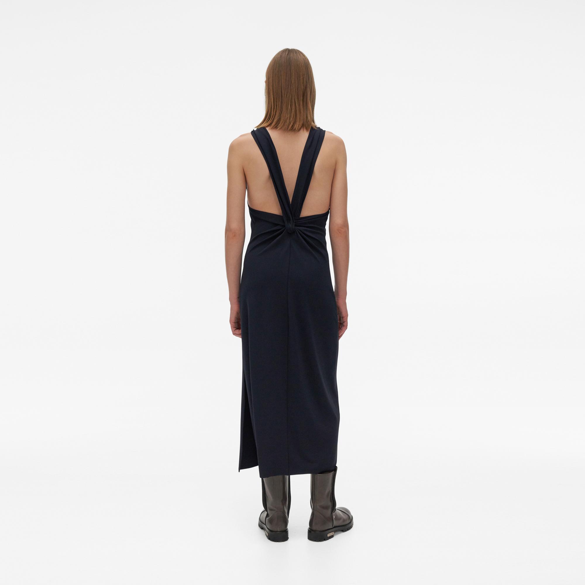 The Helmut Lang Back Twist Dress is a sleeveless midi dress made from smooth jersey and has an open back with twist knot detail