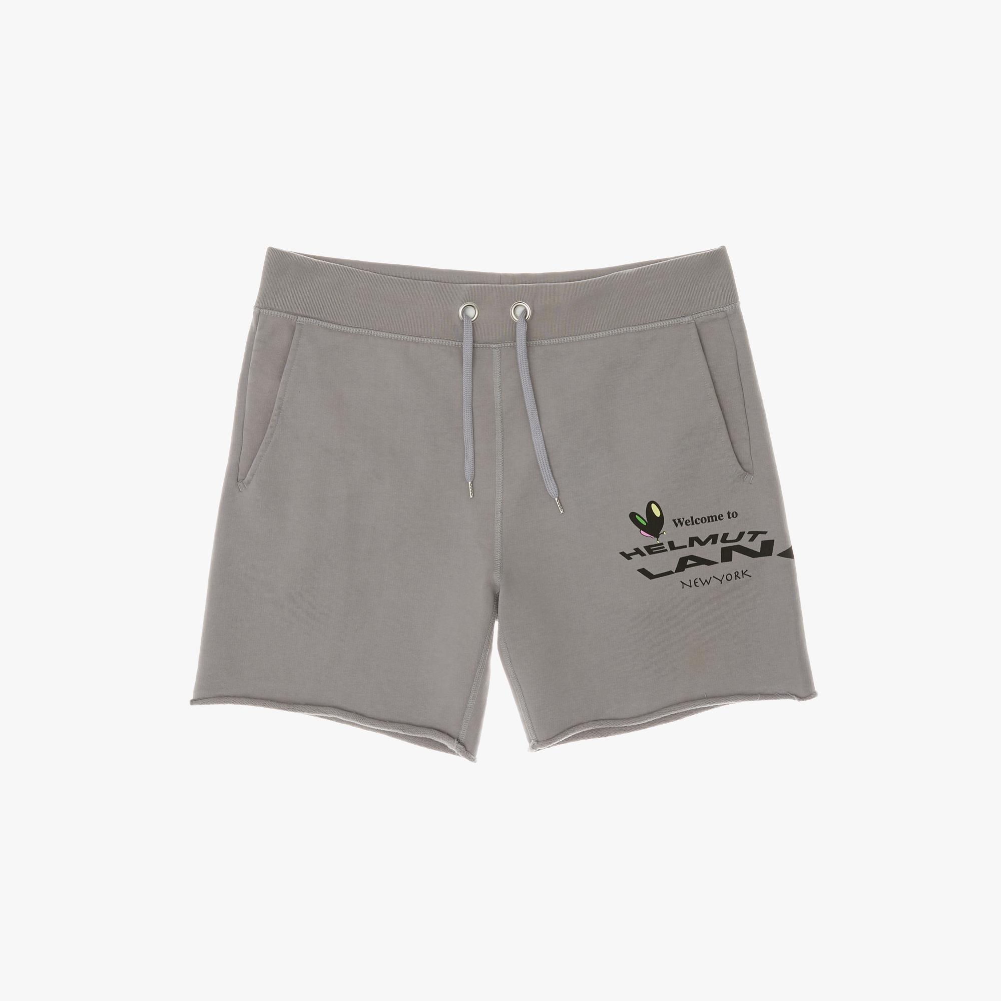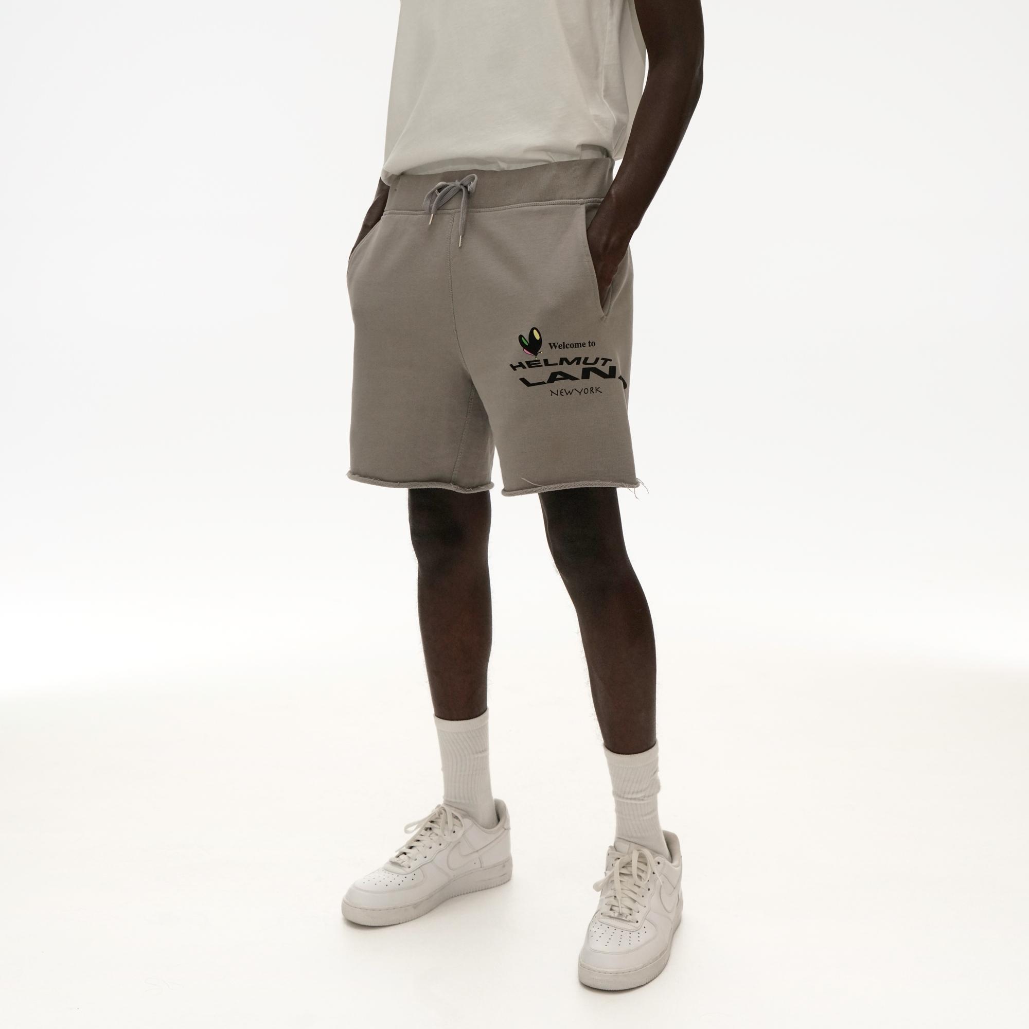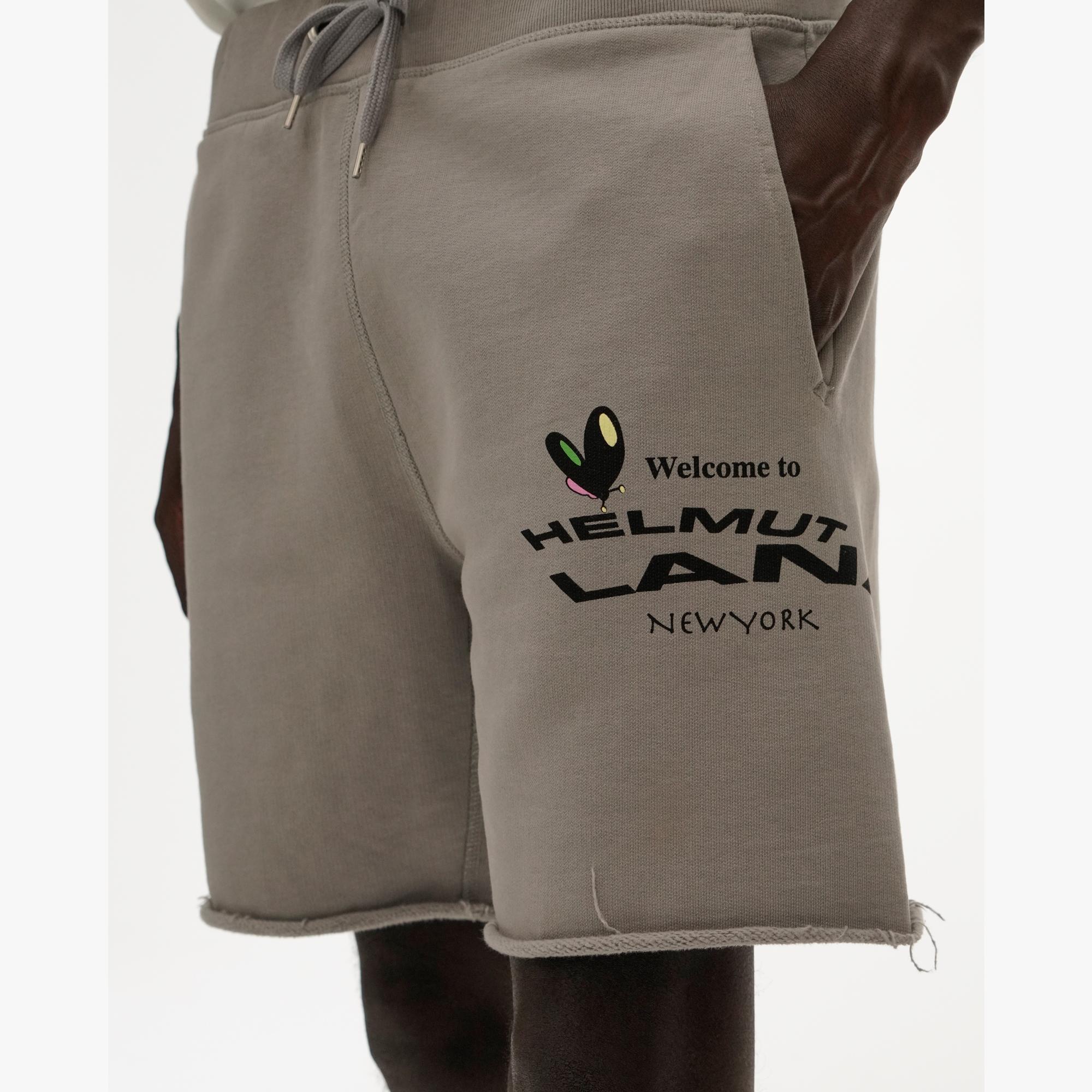 The Helmut Lang Helmut Land® Masc Map Sweatshorts feature an elastic drawstring waistband, slash pockets, and a 'Welcome to Helmut Land®' graphic printed on front