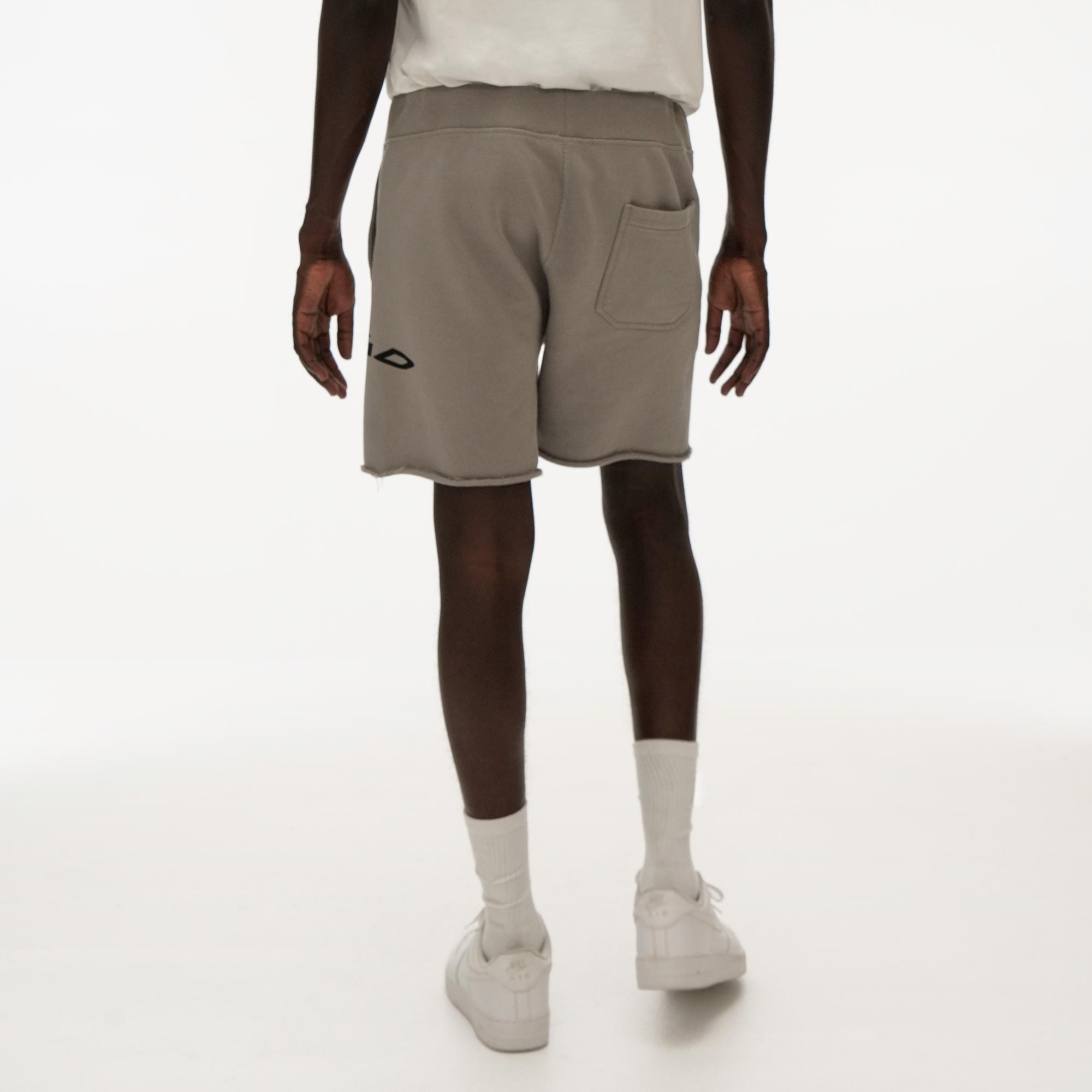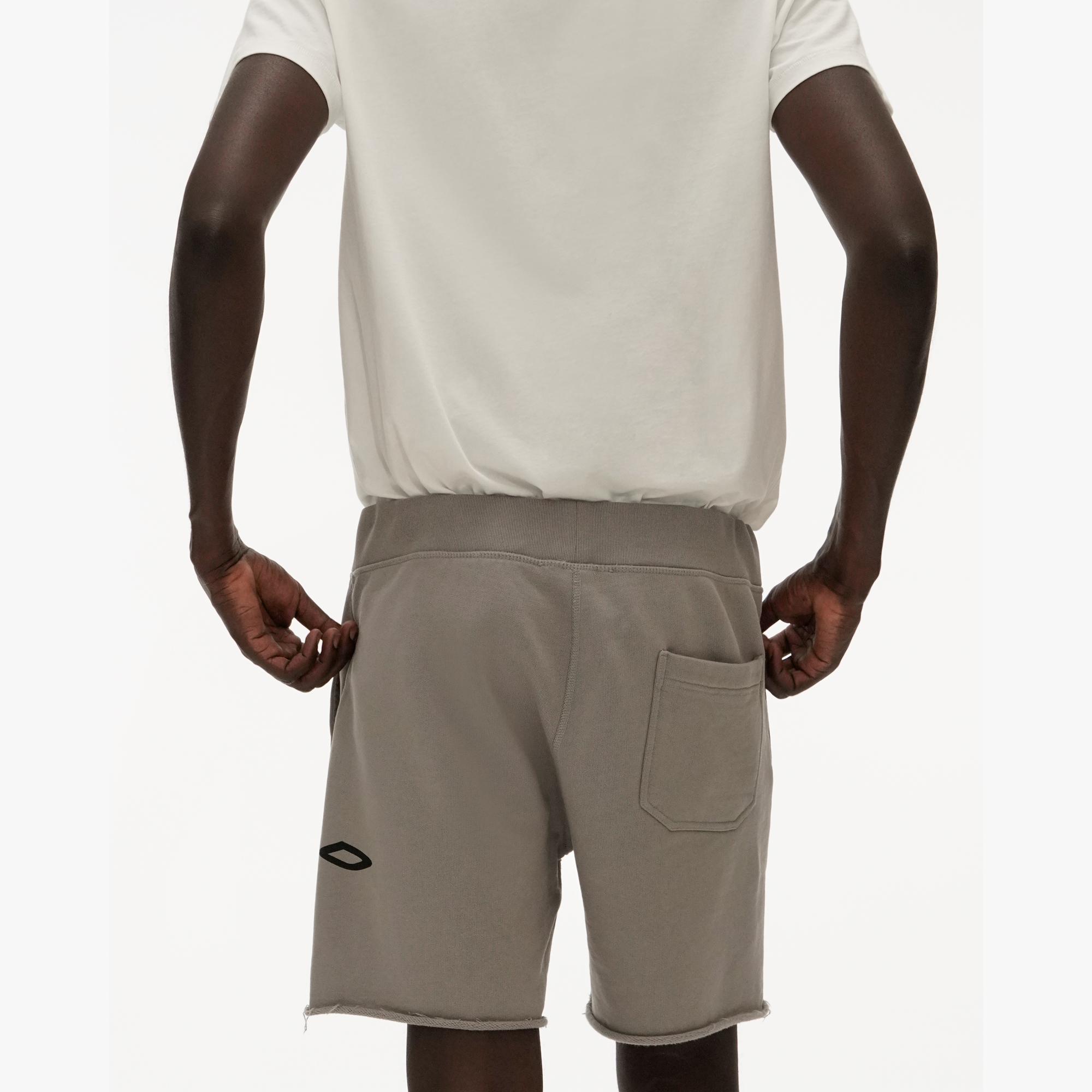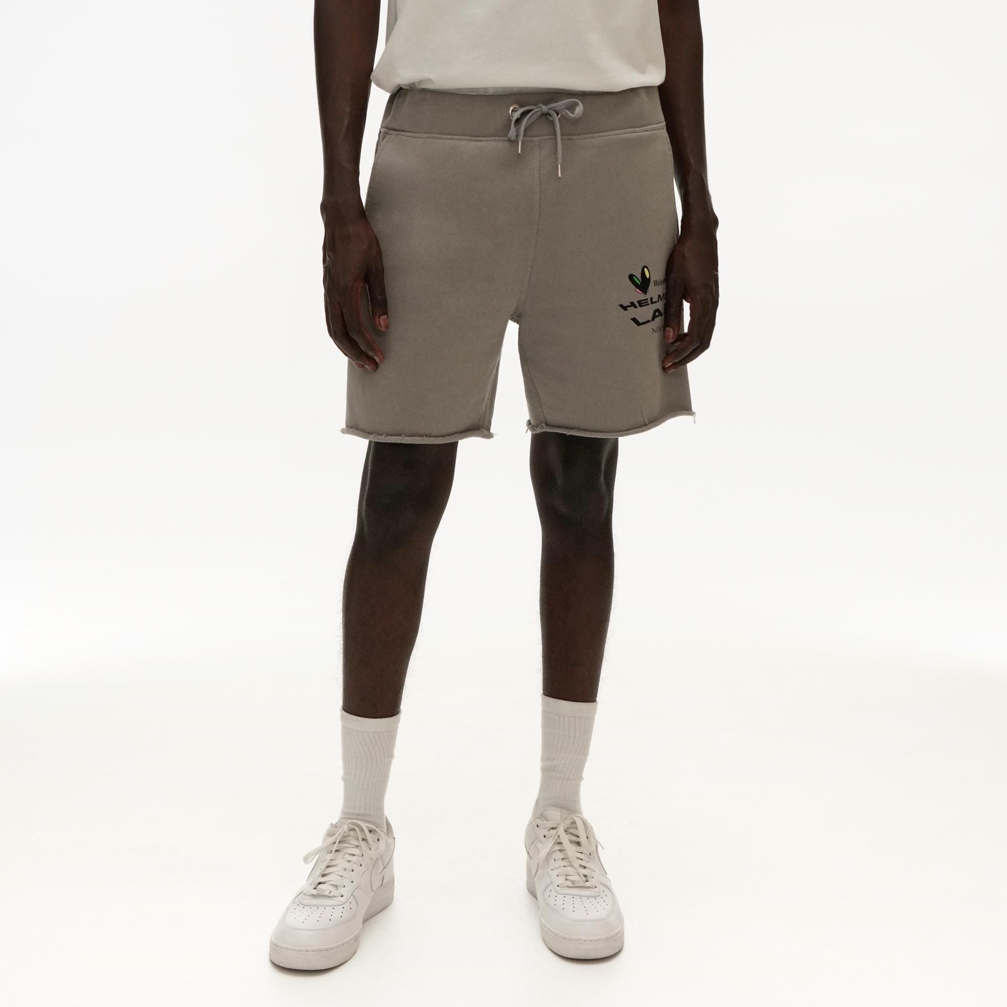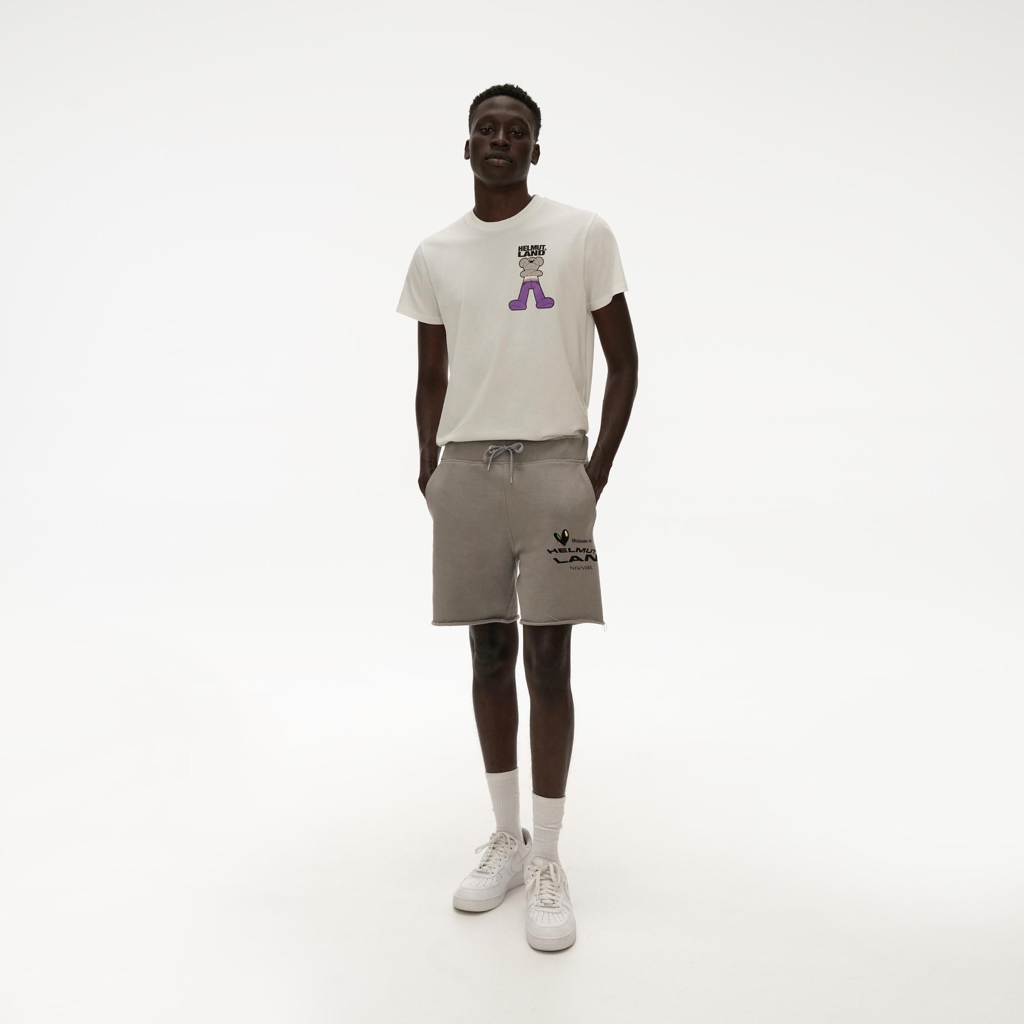 The Helmut Lang Helmut Land® Masc Map Sweatshorts feature an elastic drawstring waistband, slash pockets, and a 'Welcome to Helmut Land®' graphic printed on front