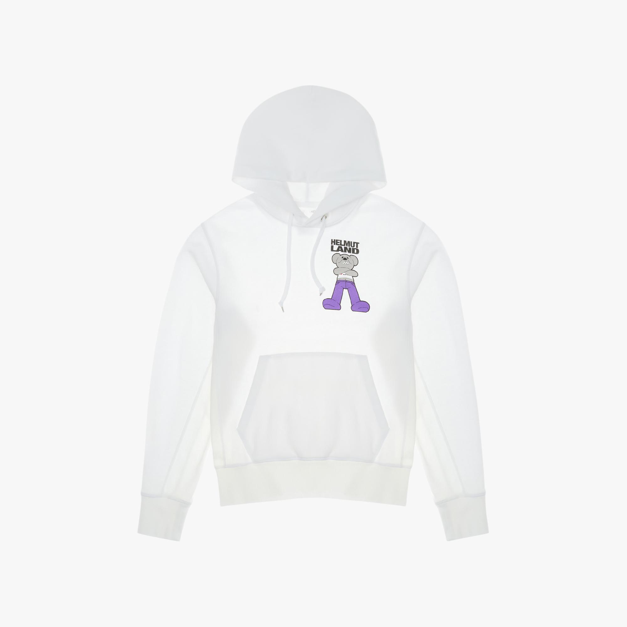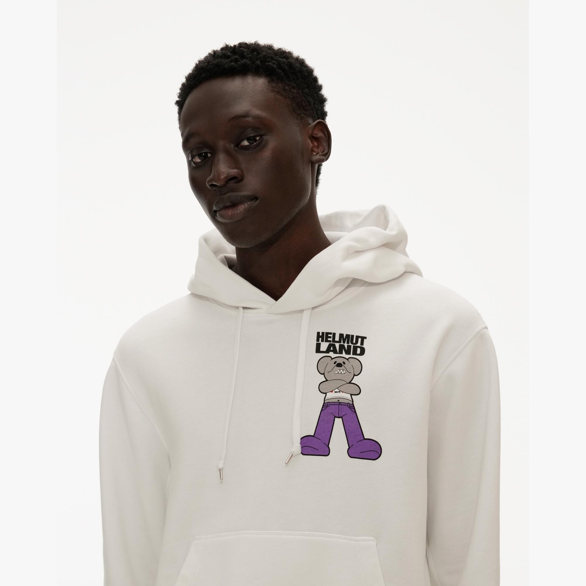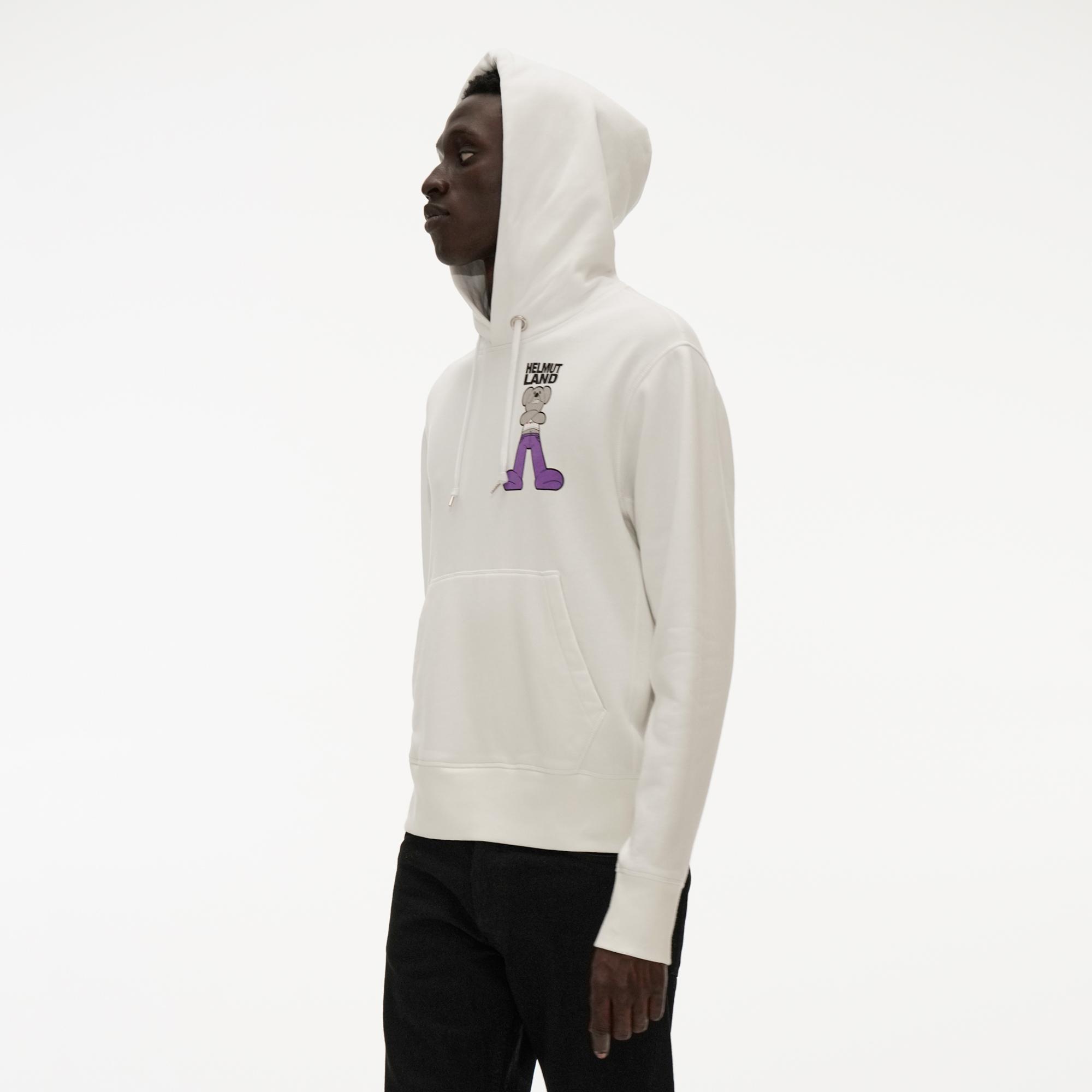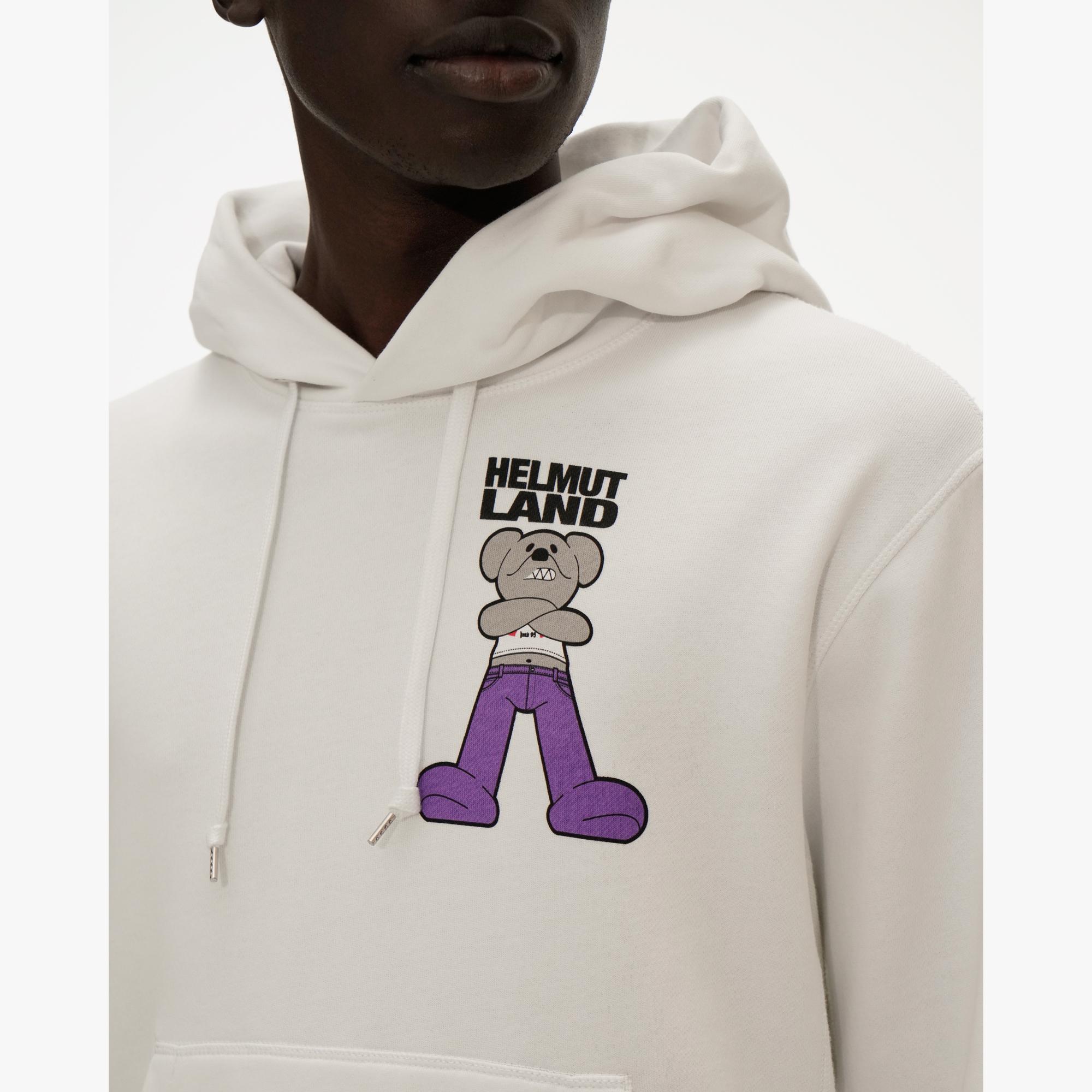 The Helmut Lang Helmut Land® Small Mascot Standard Hoodie is a classic hoodie sweatshirt with a front pocket and the HelmutLand® mascot printed on front