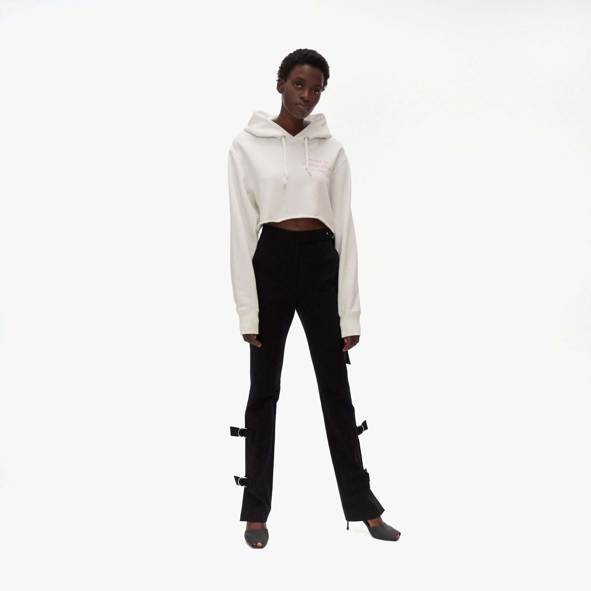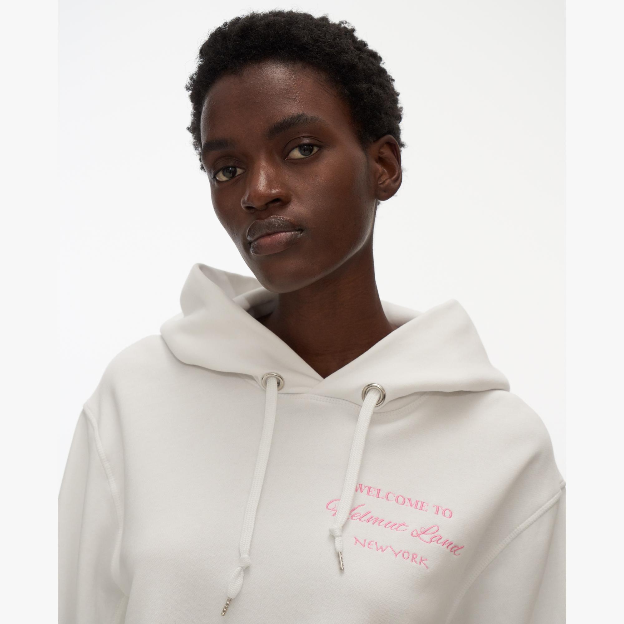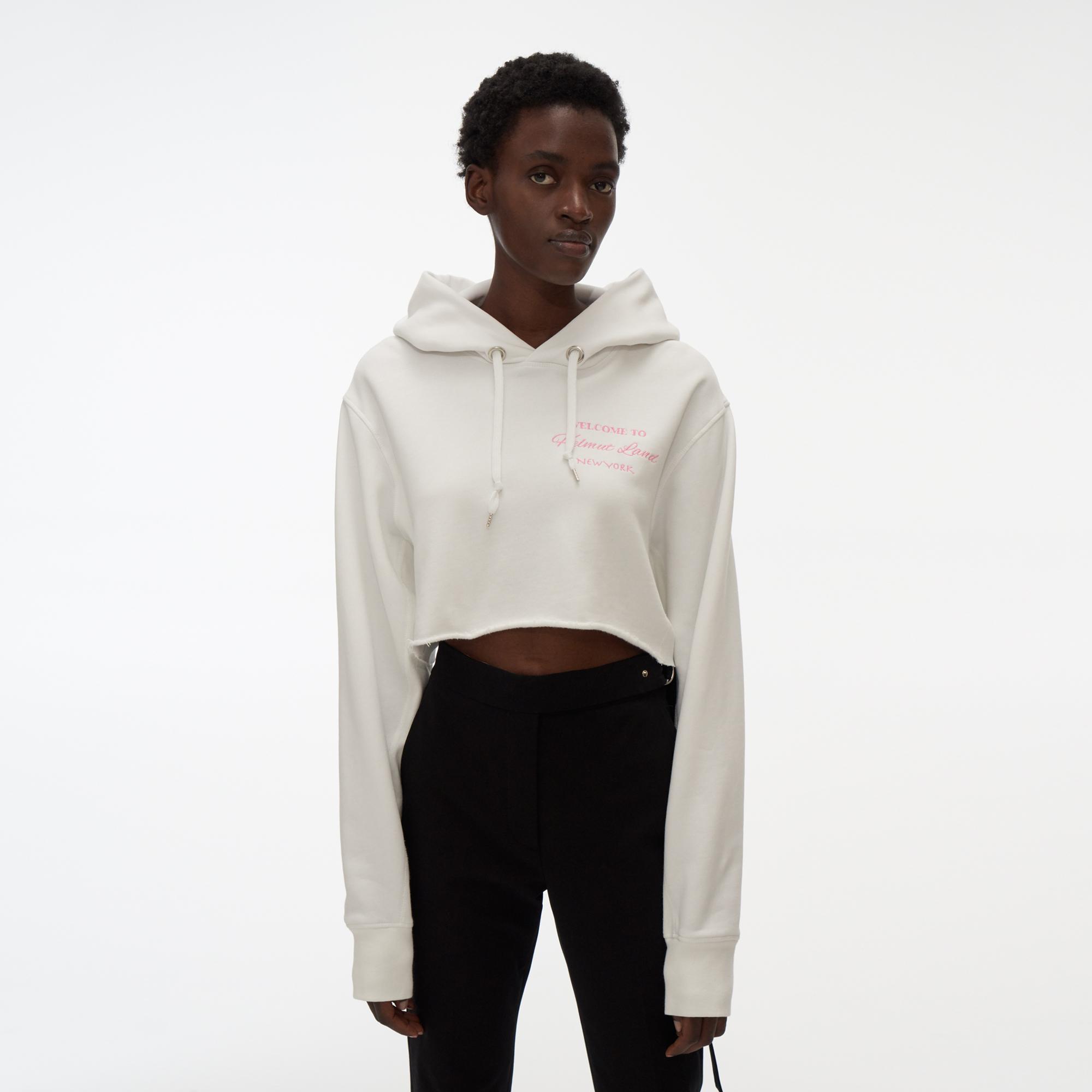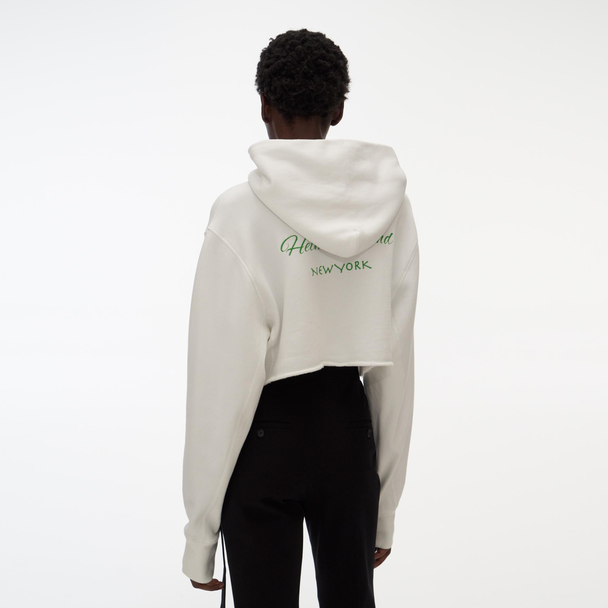 The Helmut Lang Crop Hoodie is a long-sleeve sweatshirt with a graphic printed on the front, drawstring hood, and cropped hem