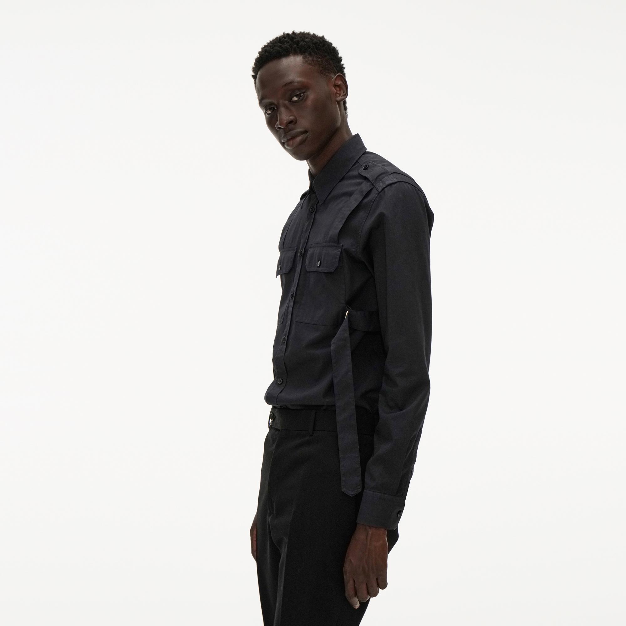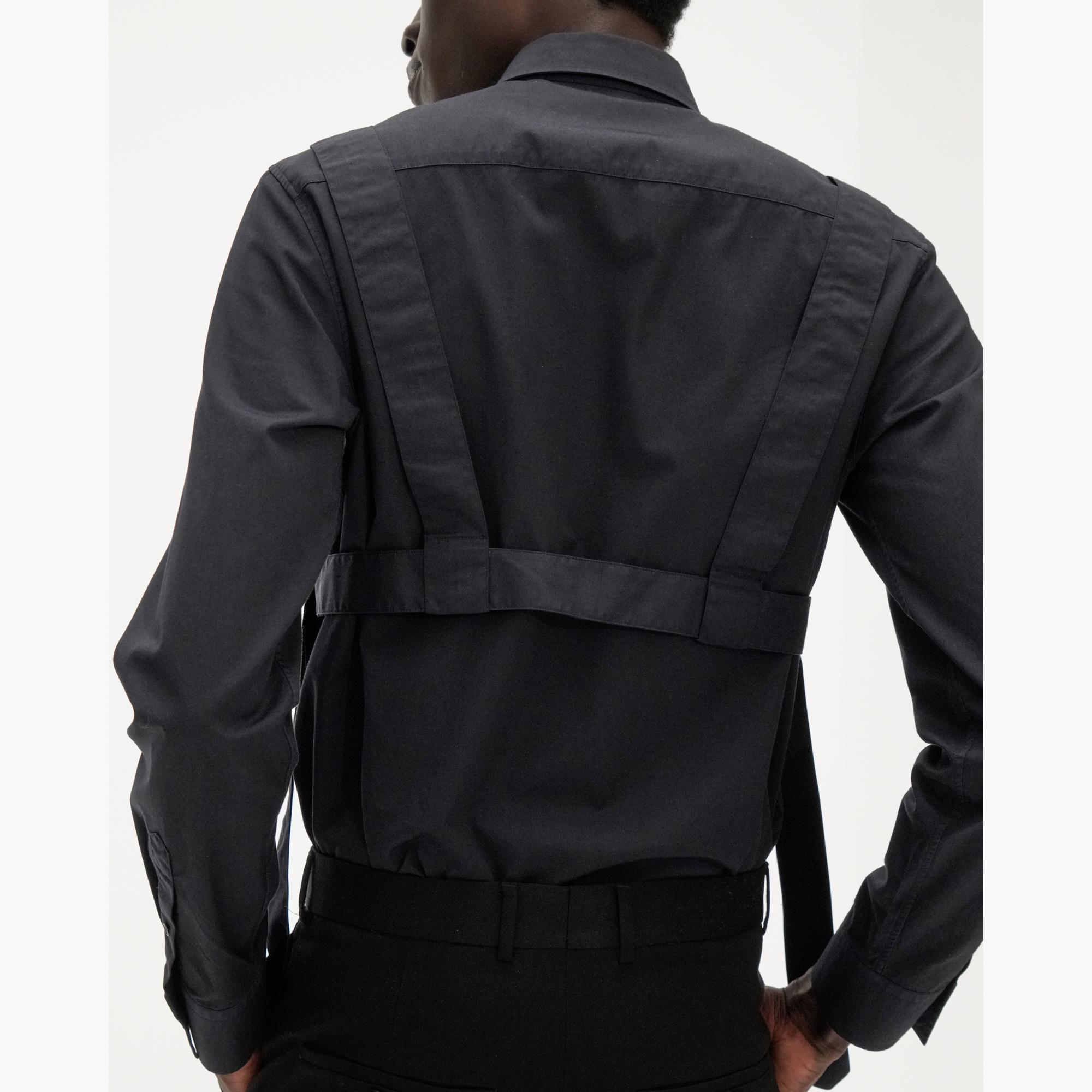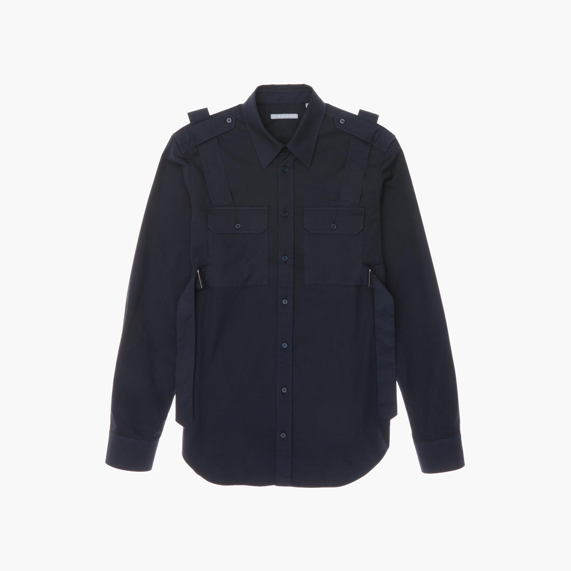 The Helmut Lang Parachute Shirt is a cotton twill long-sleeve shirt with a point collar, button-front, and strap detailing