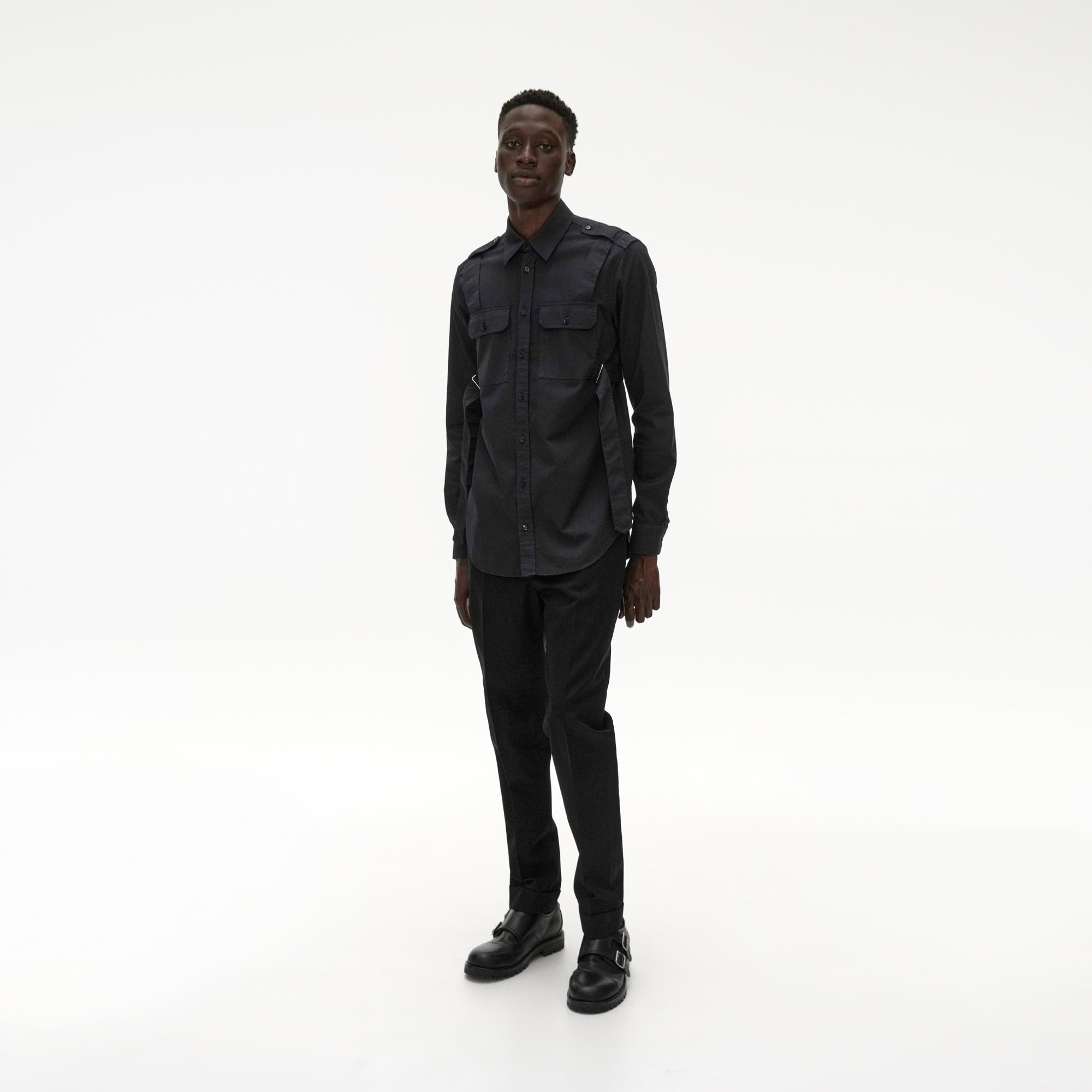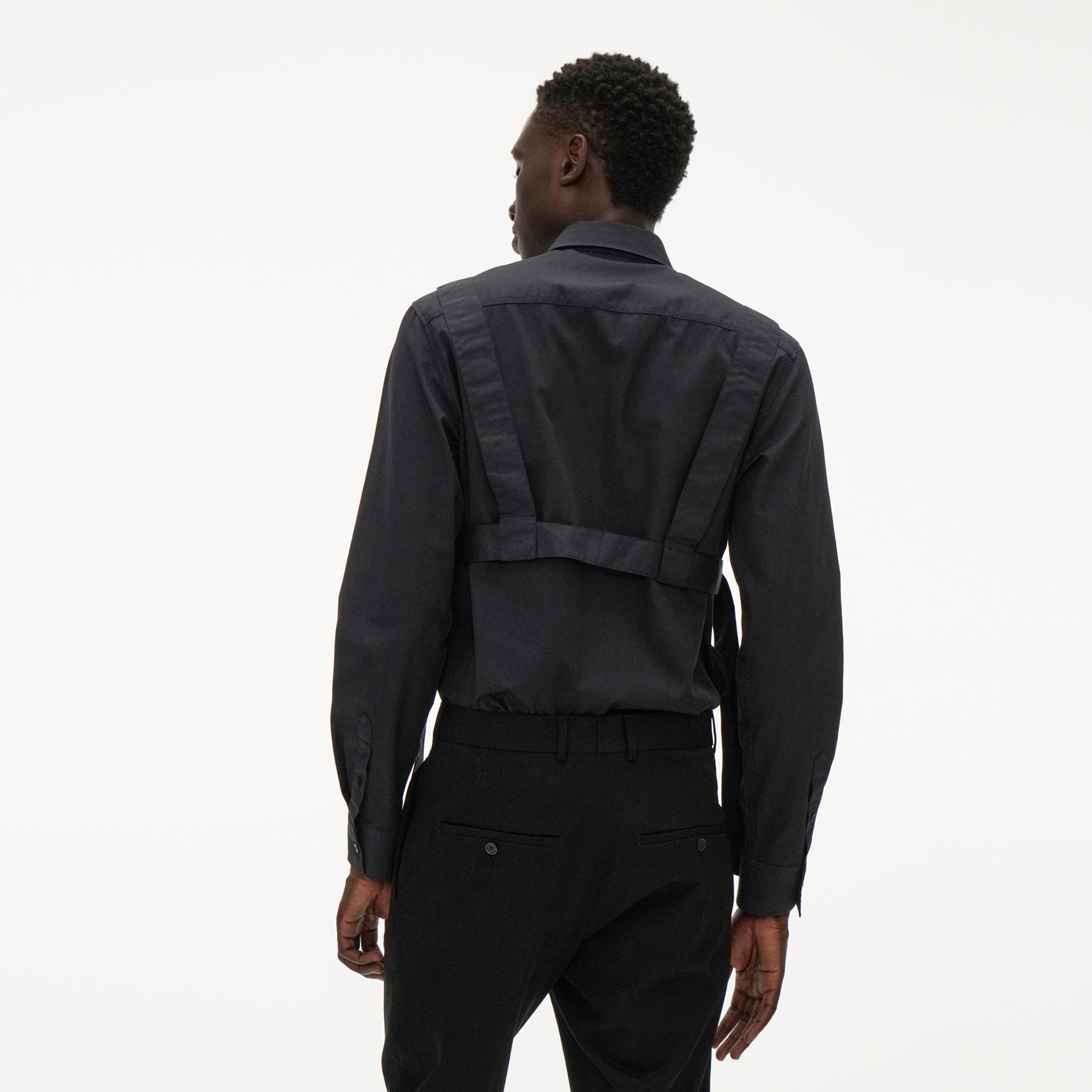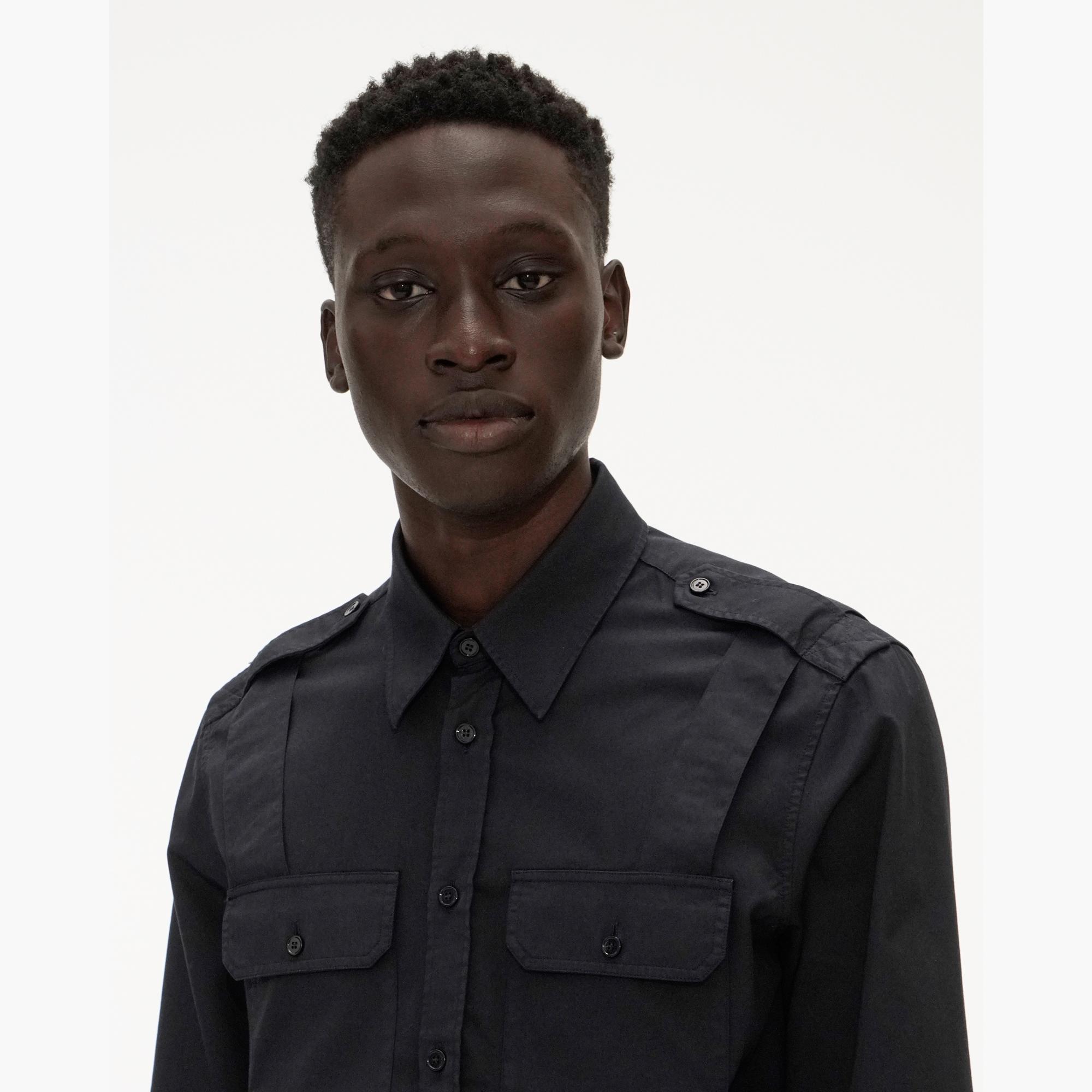 The Helmut Lang Parachute Shirt is a cotton twill long-sleeve shirt with a point collar, button-front, and strap detailing