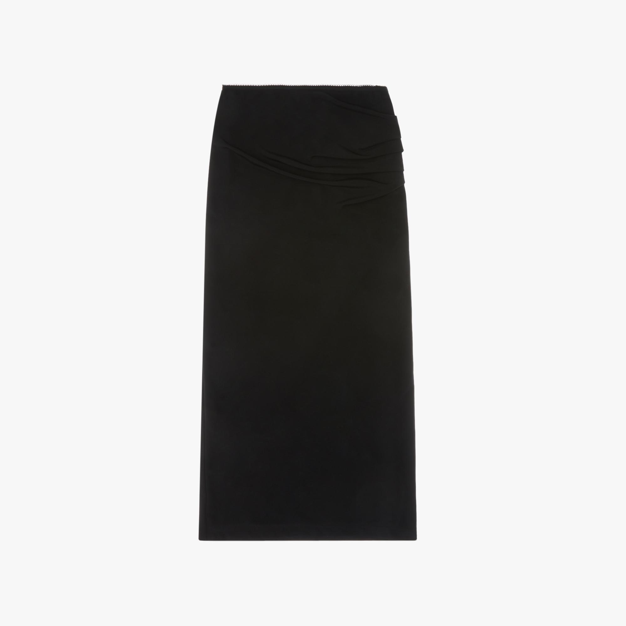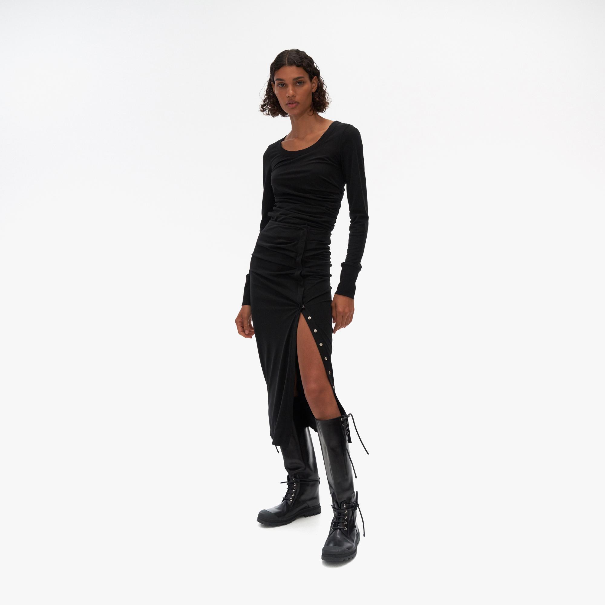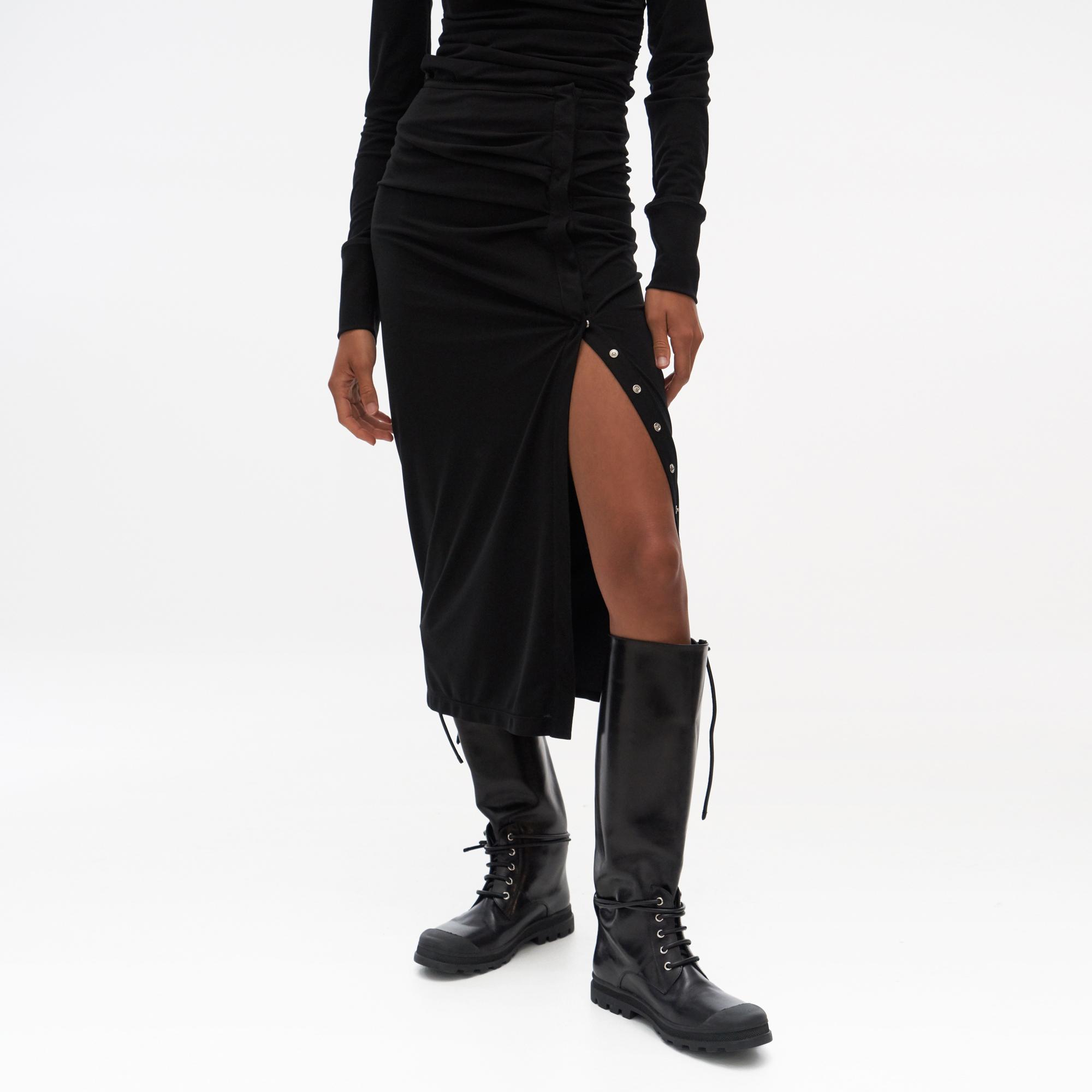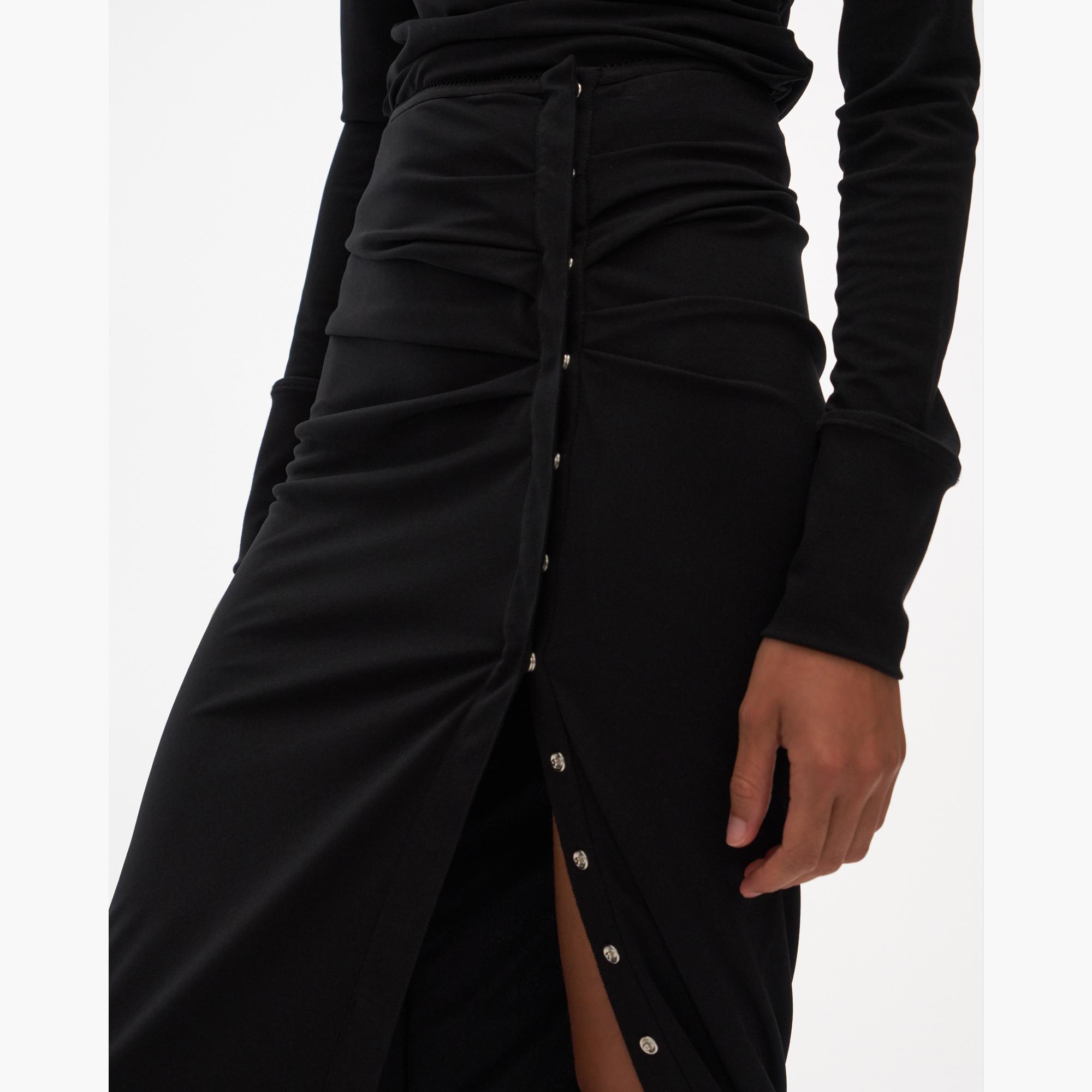 The Helmut Lang Twisted Skirt is a lightweight midi-length skirt with twist details and snap buttons