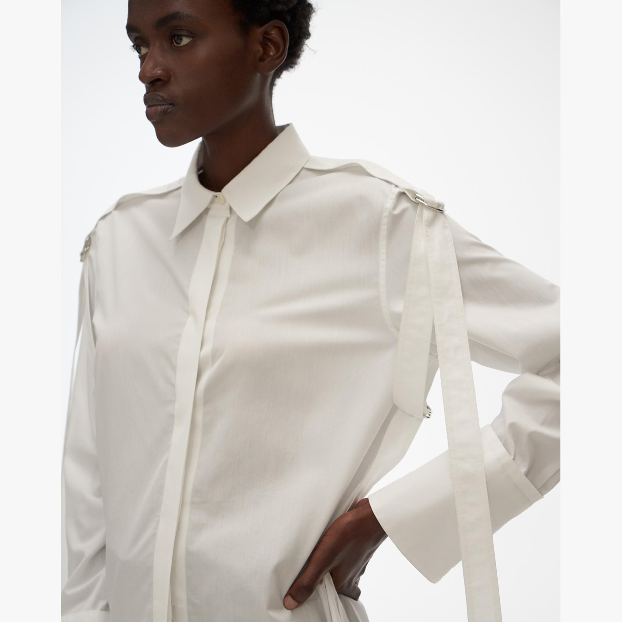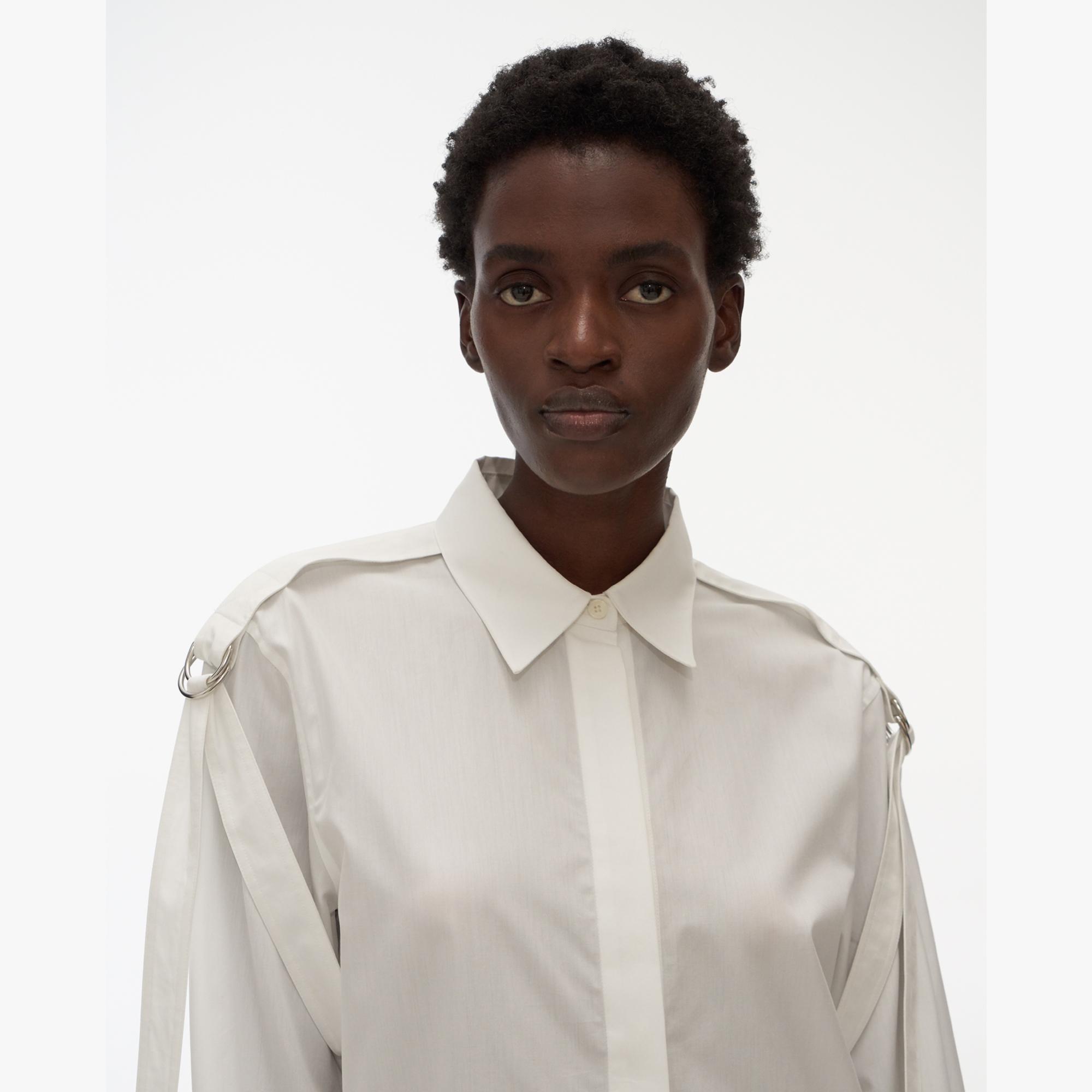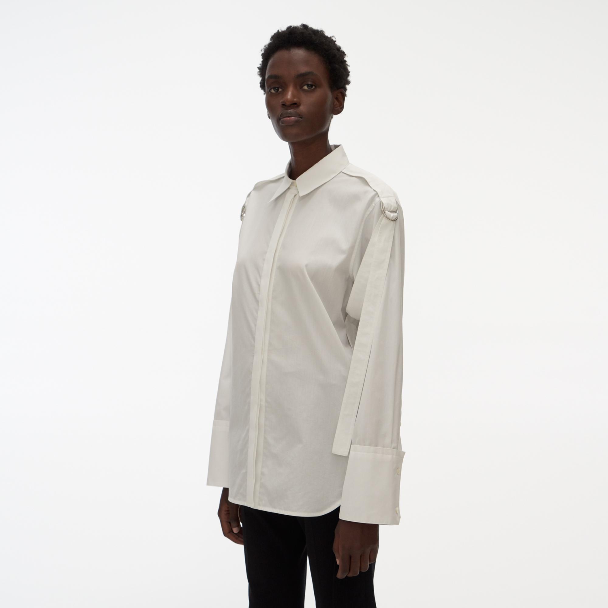 The Helmut Lang Strap Shirt is a slightly oversized cotton shirt with a point collar, strap details, and D-ring closures