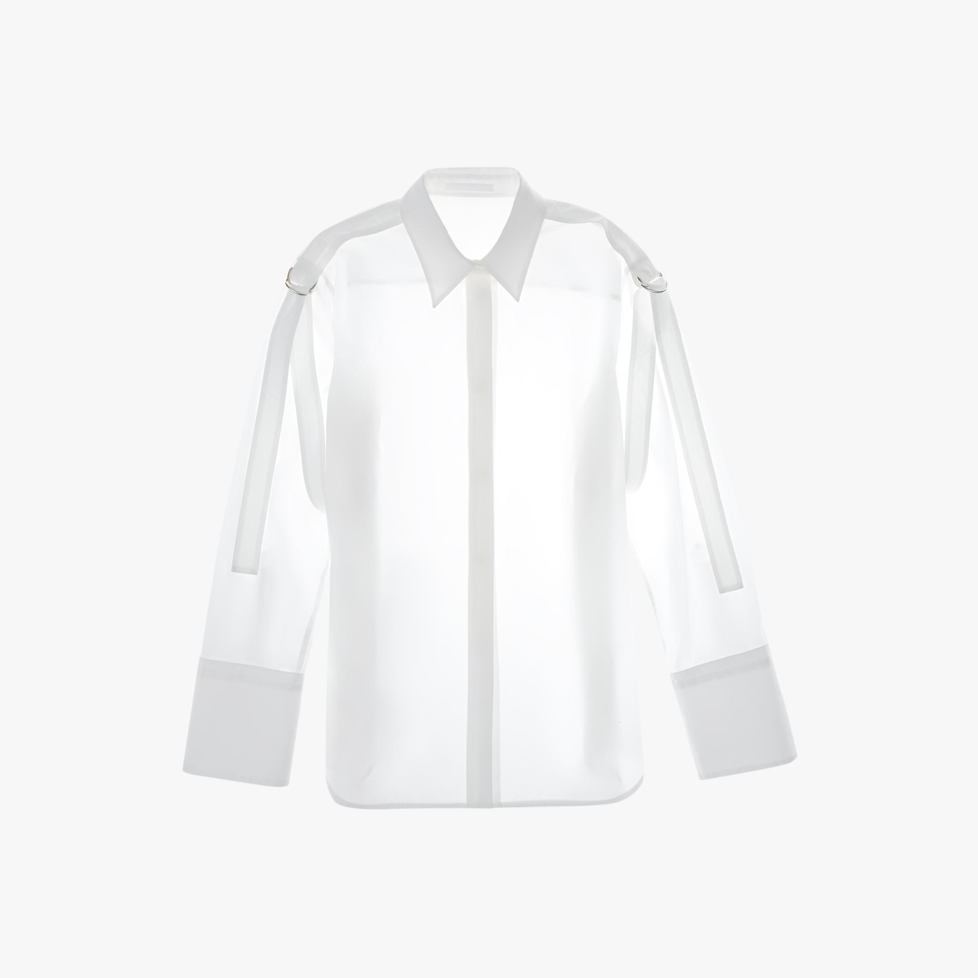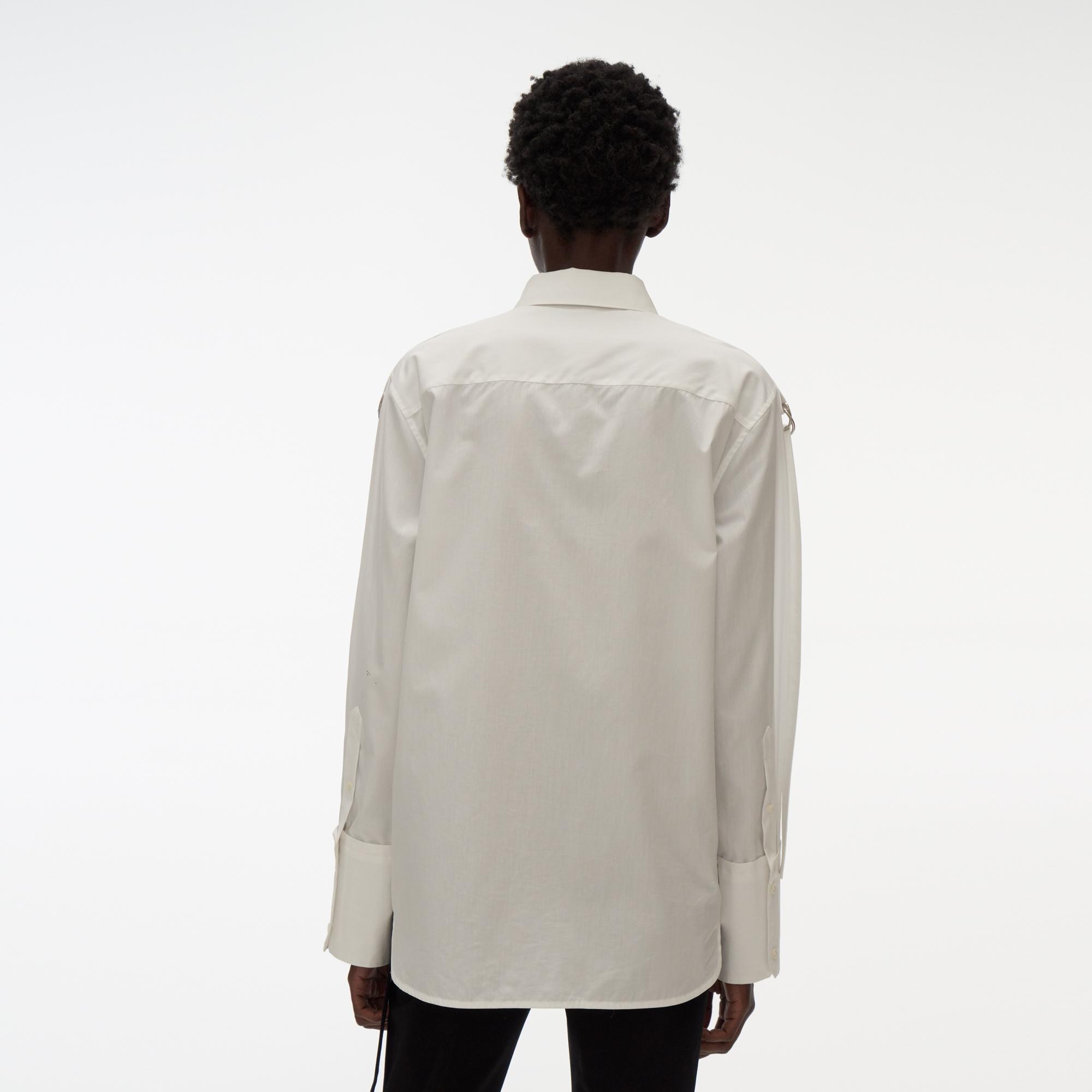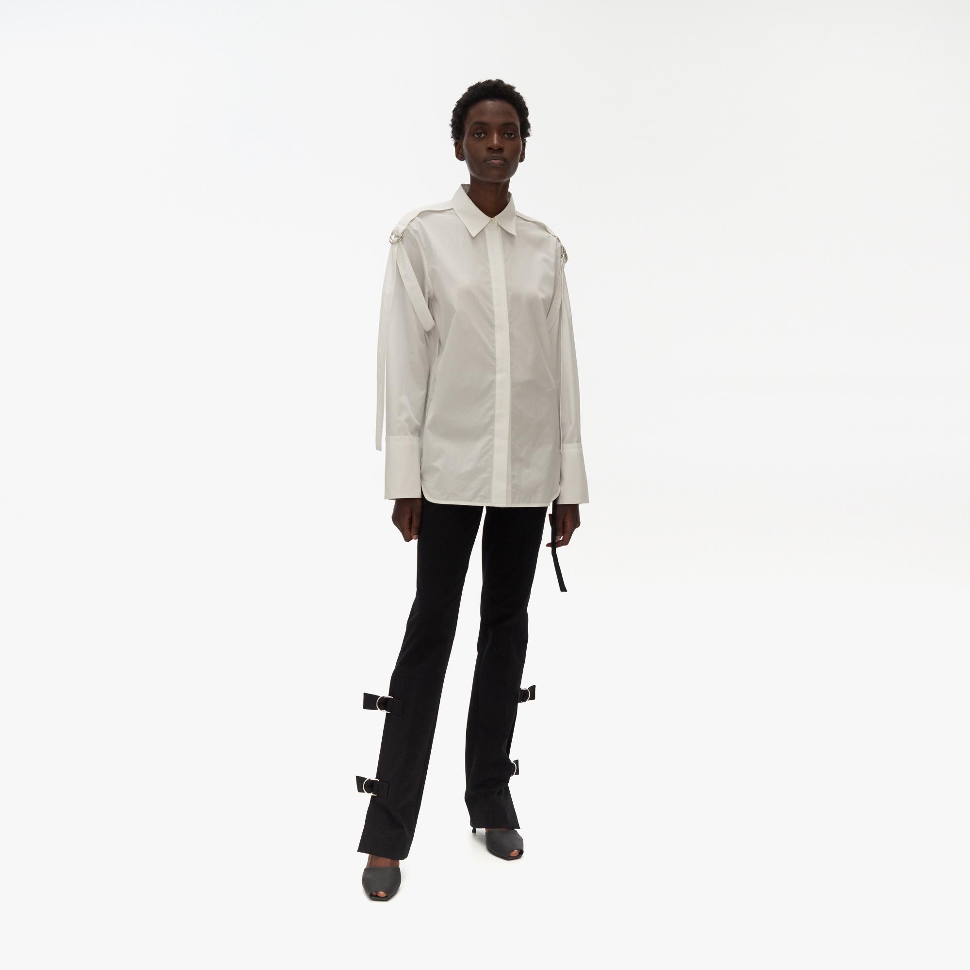 The Helmut Lang Strap Shirt is a slightly oversized cotton shirt with a point collar, strap details, and D-ring closures