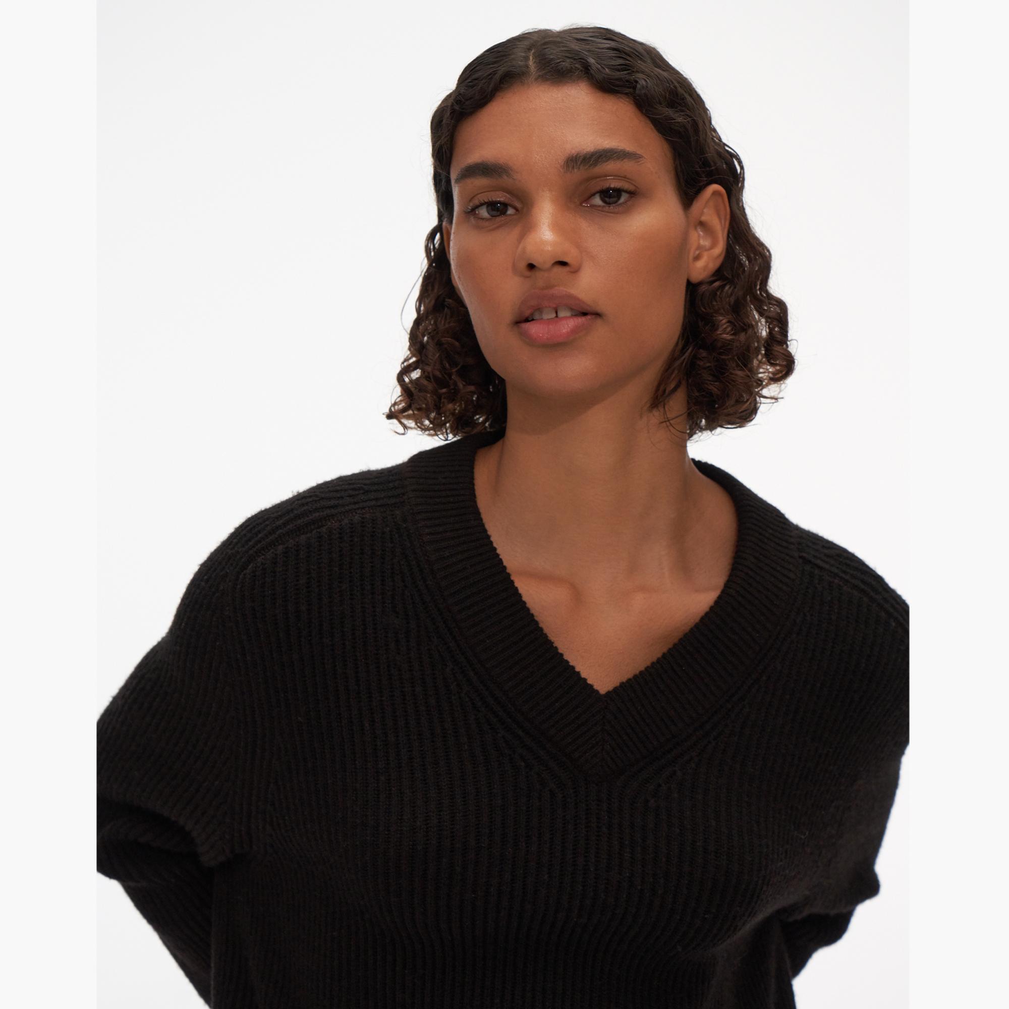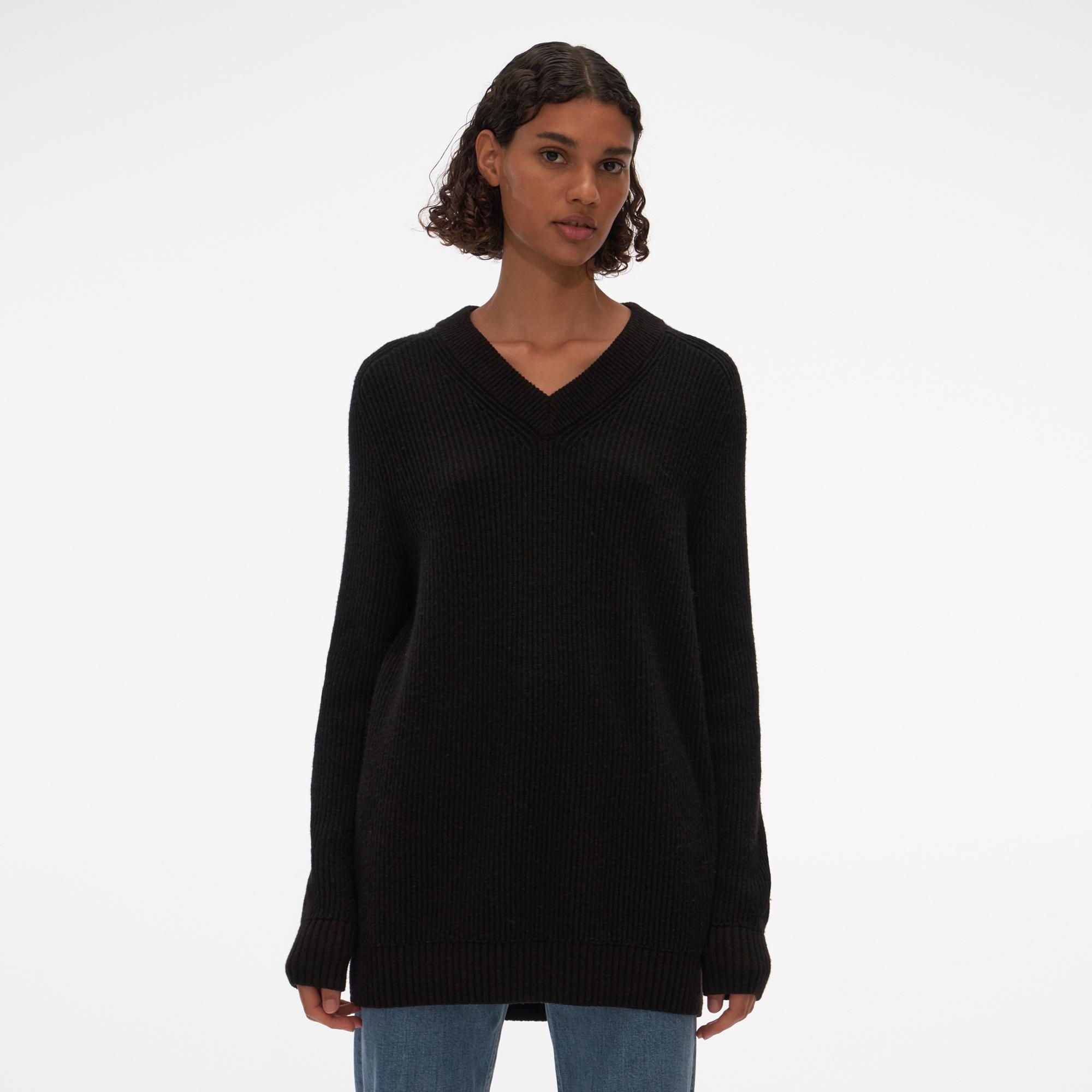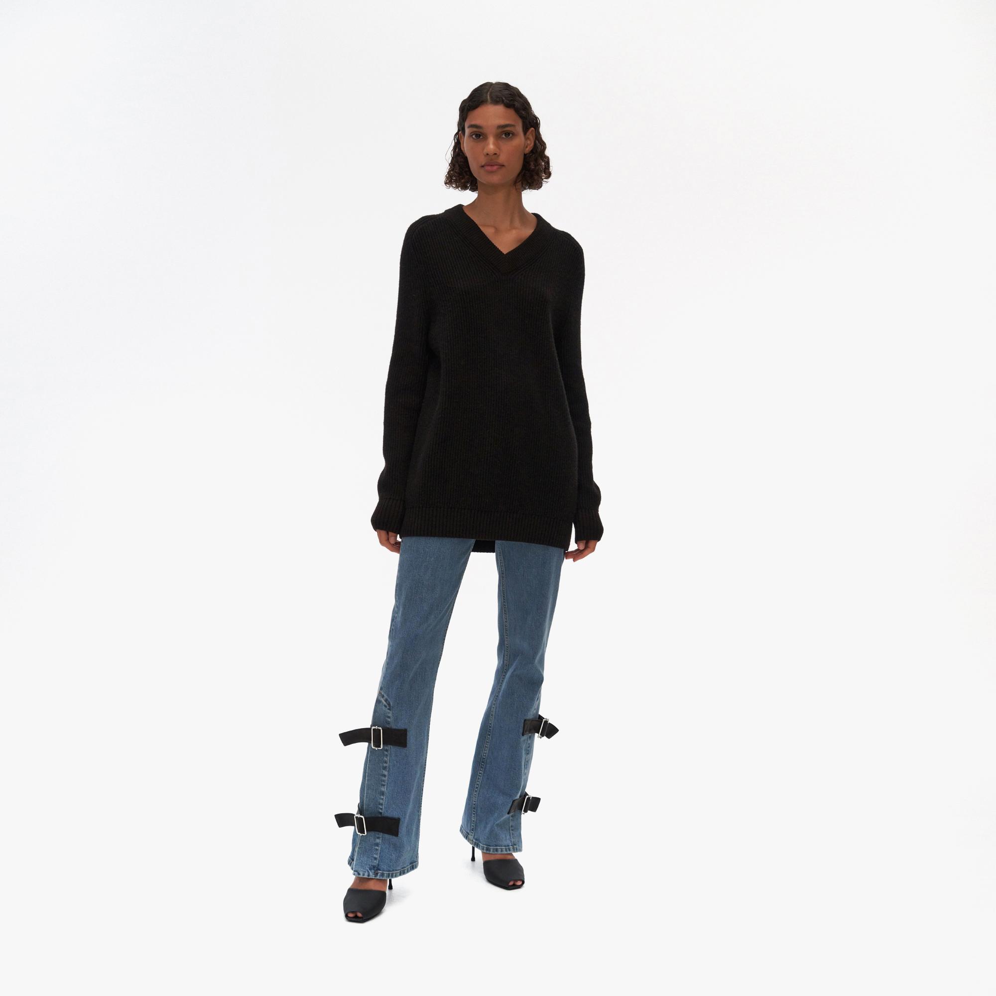 The Helmut Lang Cutout V-Neck Sweater is a wool-cashmere blend knit with an oversized fit and ribbed trim