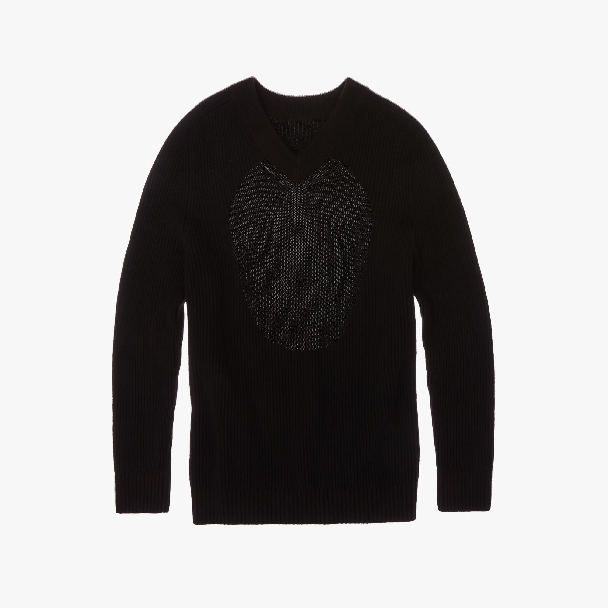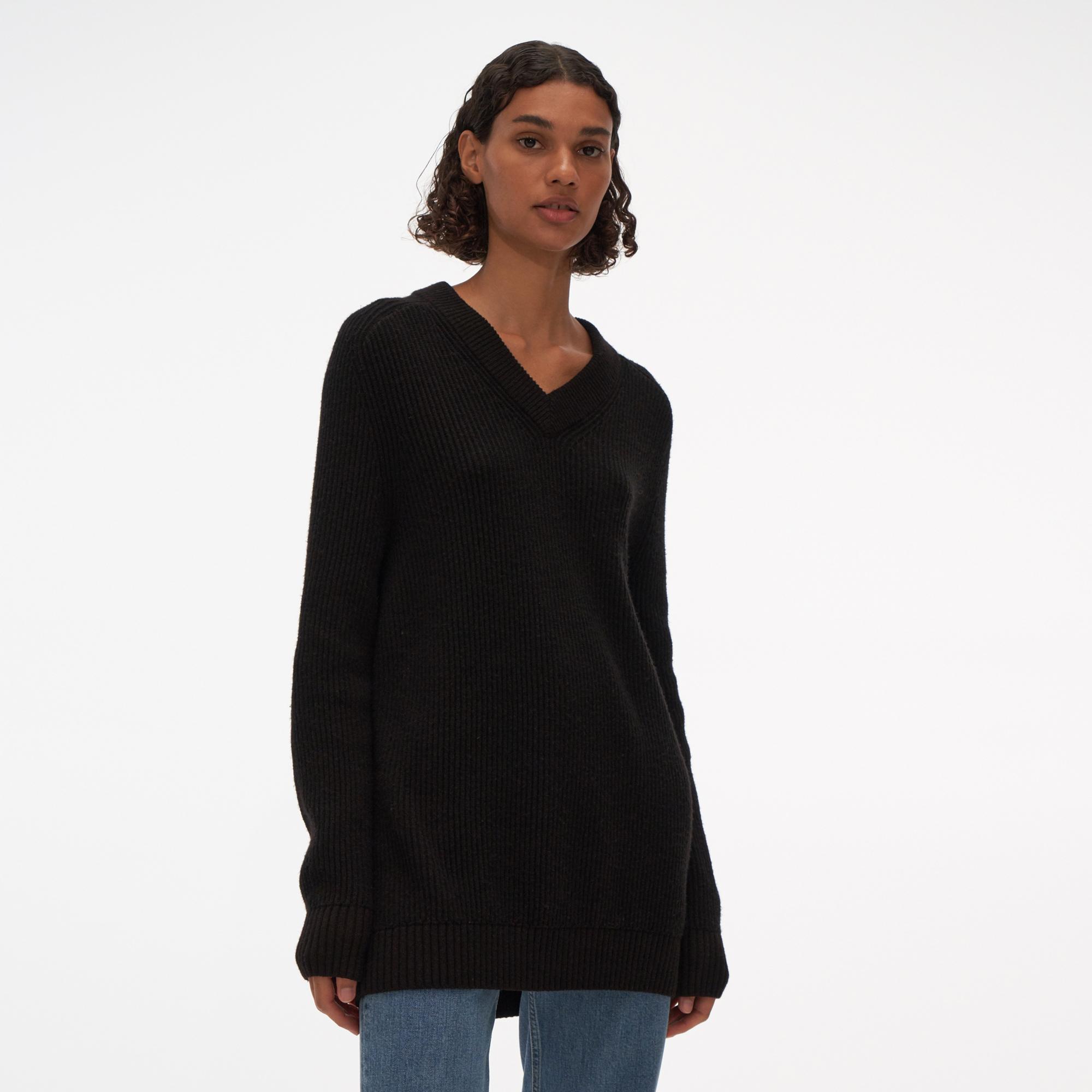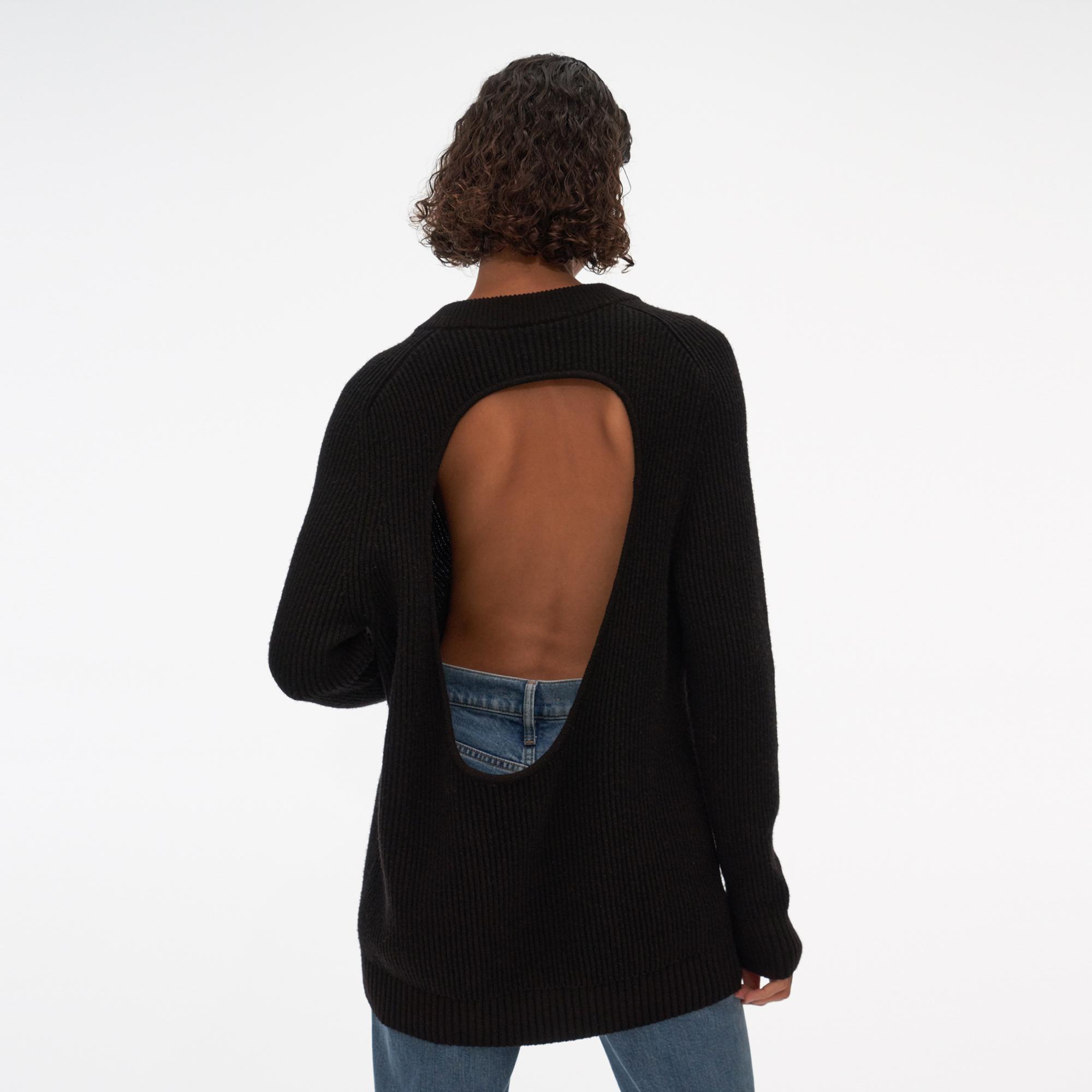 The Helmut Lang Cutout V-Neck Sweater is a wool-cashmere blend knit with an oversized fit and ribbed trim