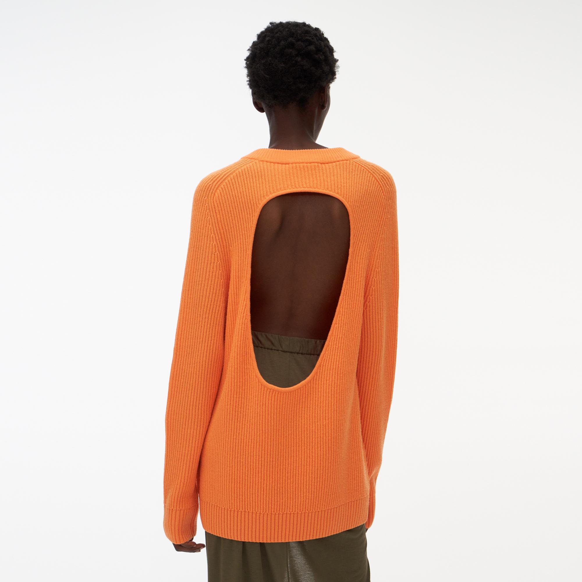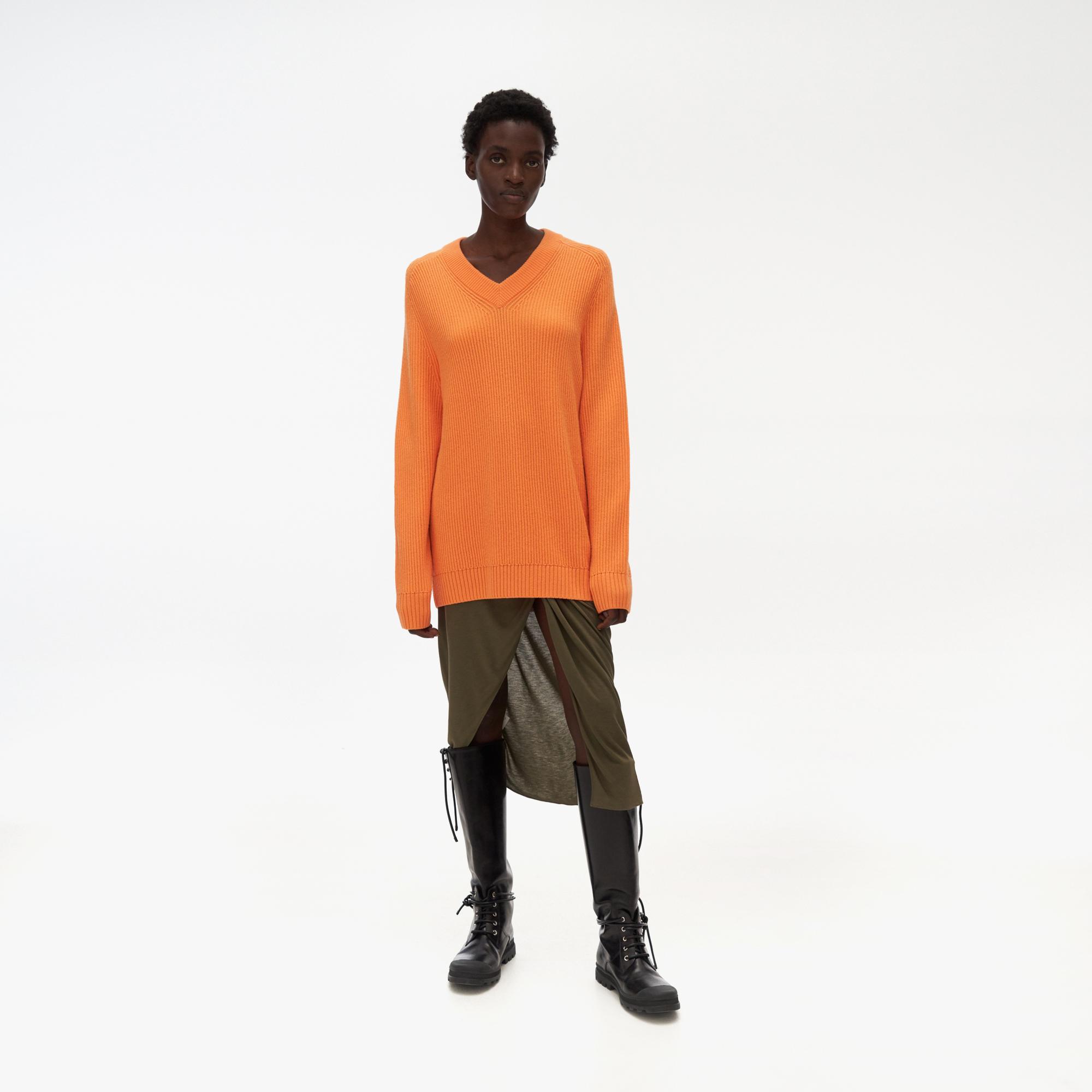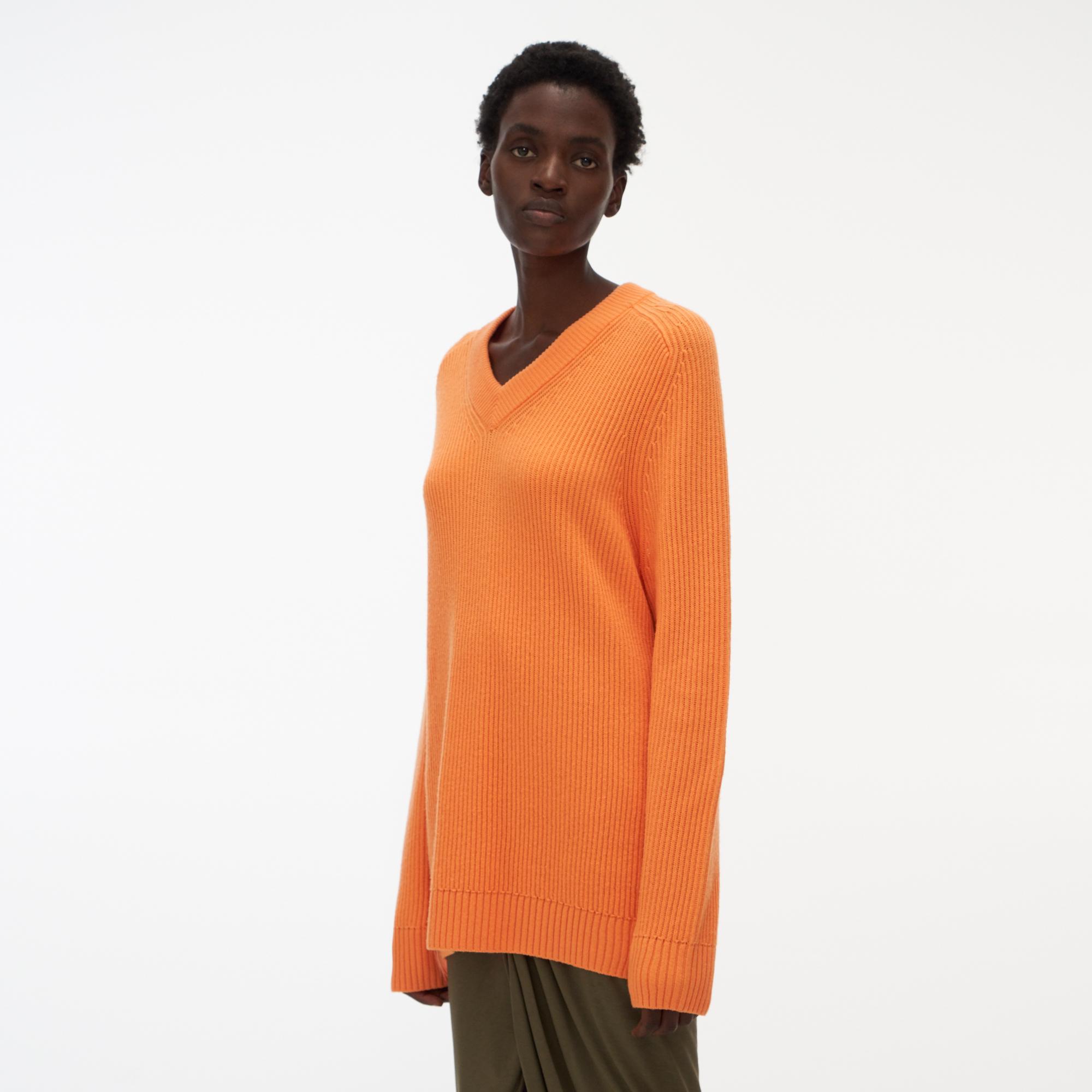 The Helmut Lang Cutout V-Neck Sweater is a wool-cashmere blend knit with an oversized fit and ribbed trim